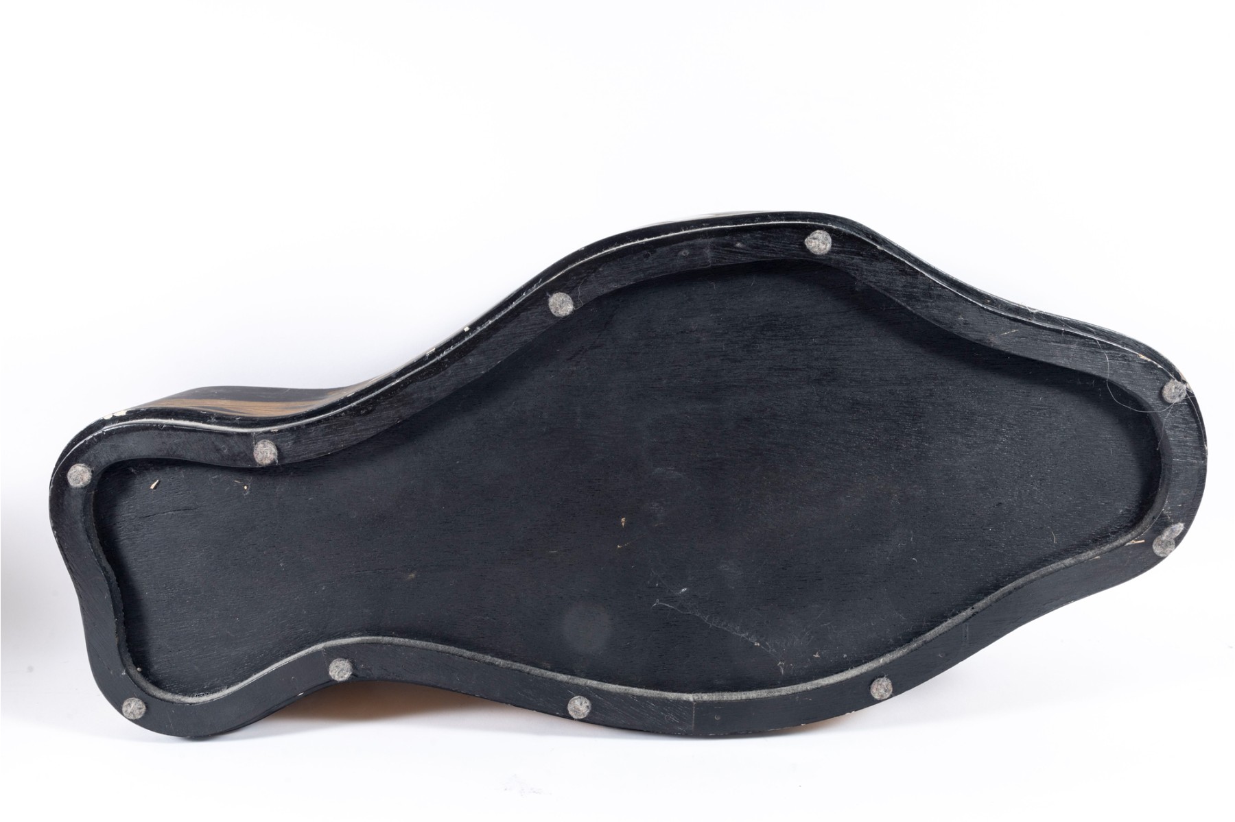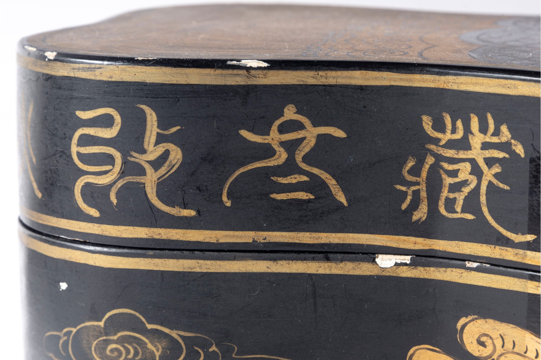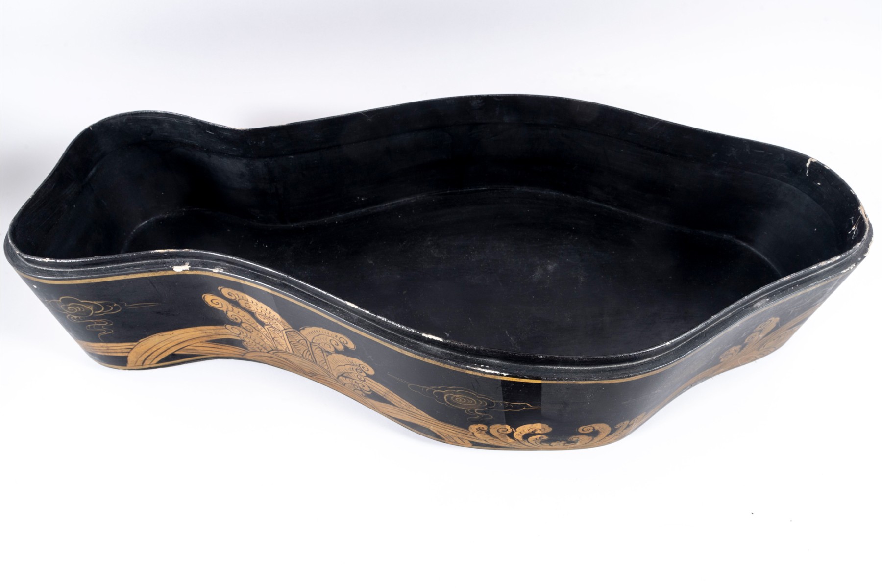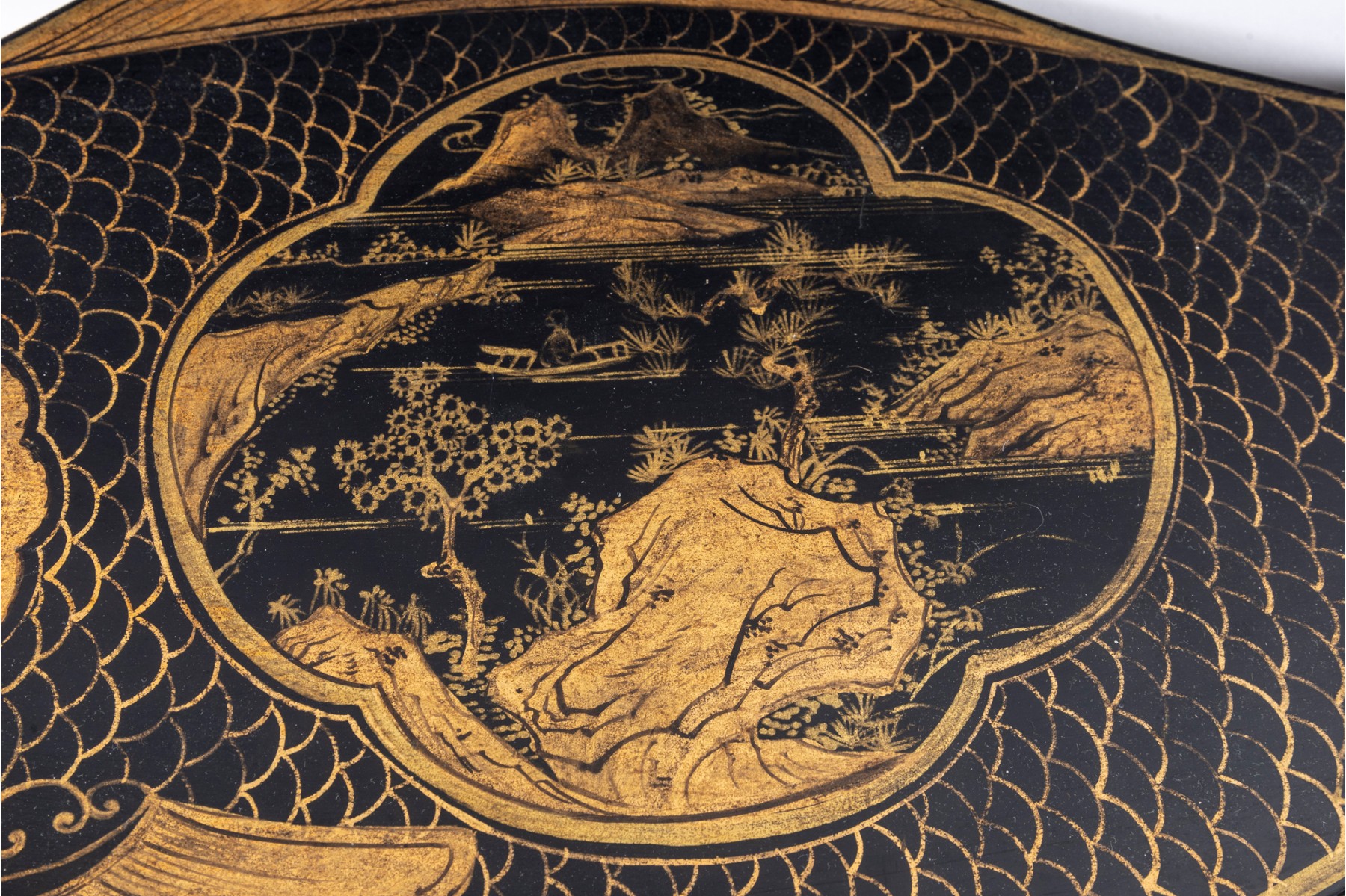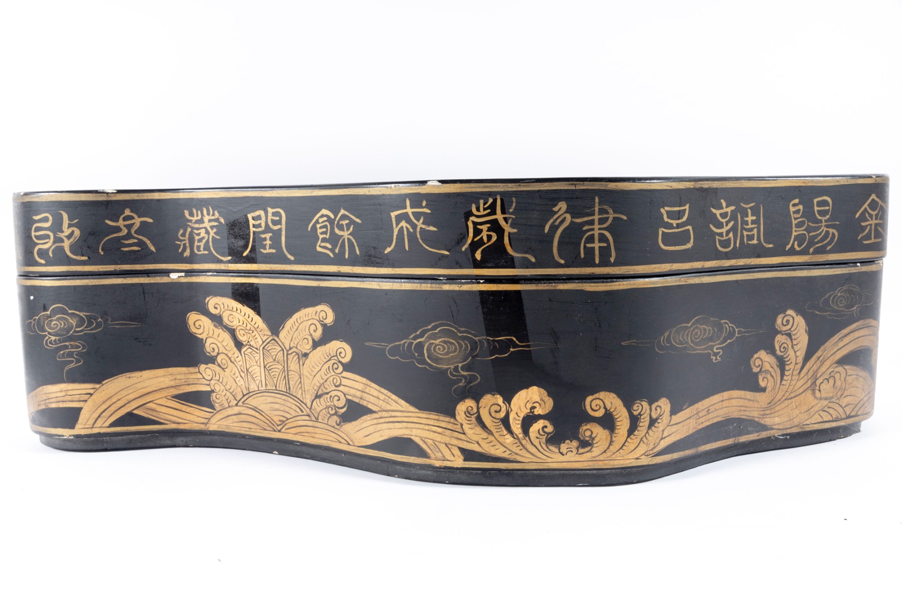 A large, vintage Chinese black-lacquer fish-shaped box with landscape scenes strewn throughout with stencil trim.