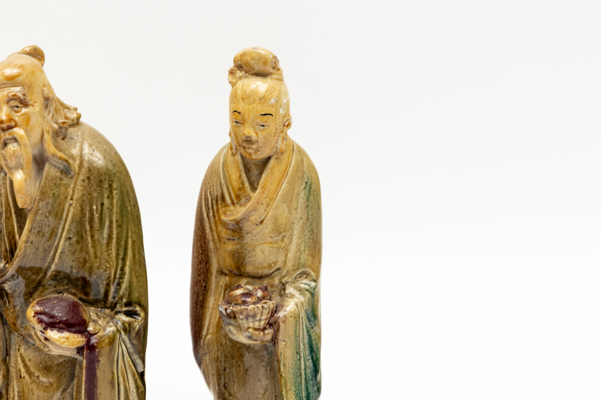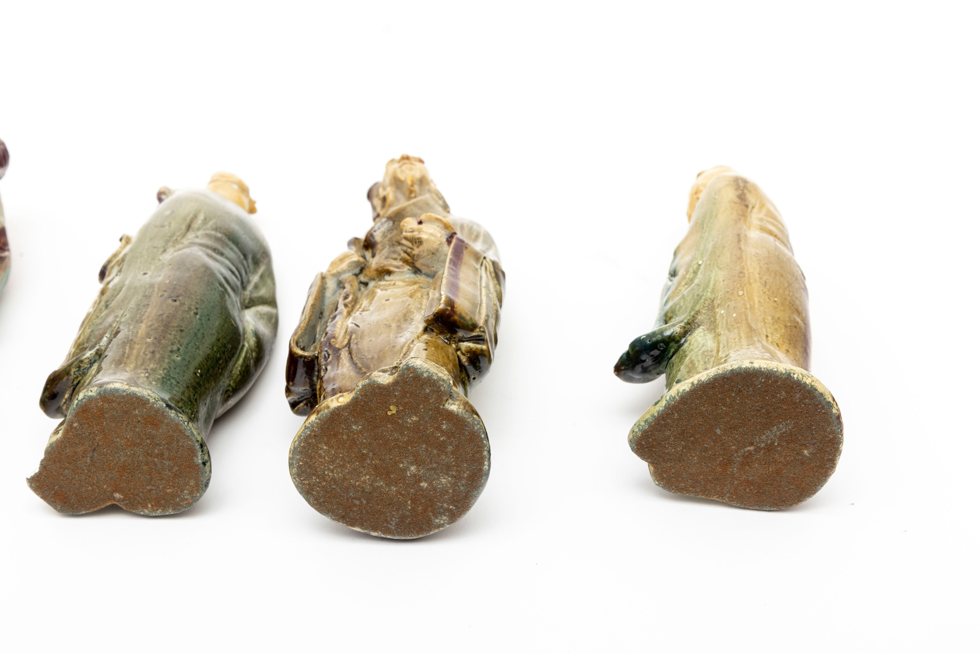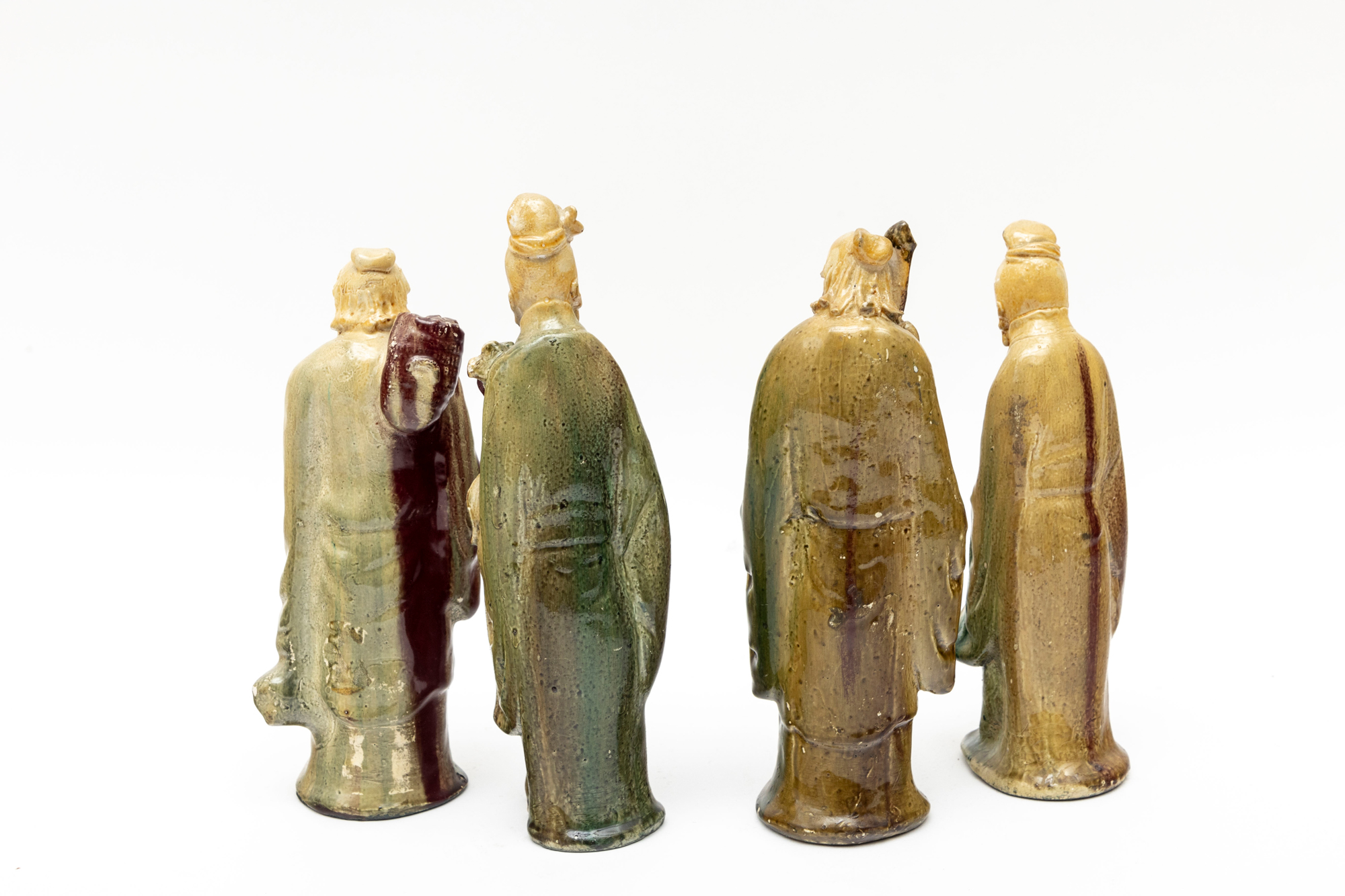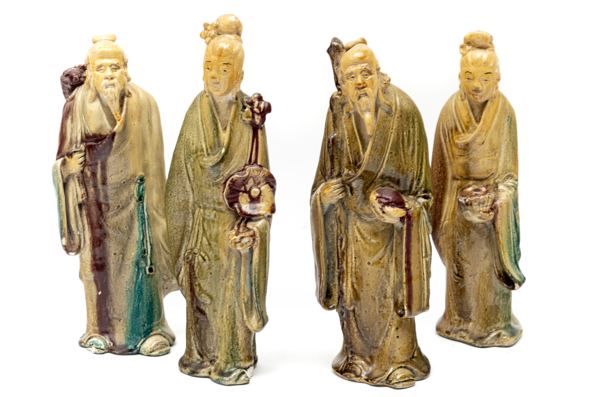 A set of four vintage ceramic "Mudmen" figurines sporting a two-tone green/cream glaze. Chinese mudmen, also known as mudware, are brightly glazed figurines wise men or sages popularized in the early 19th century and are often posed with various objects and keepsakes.