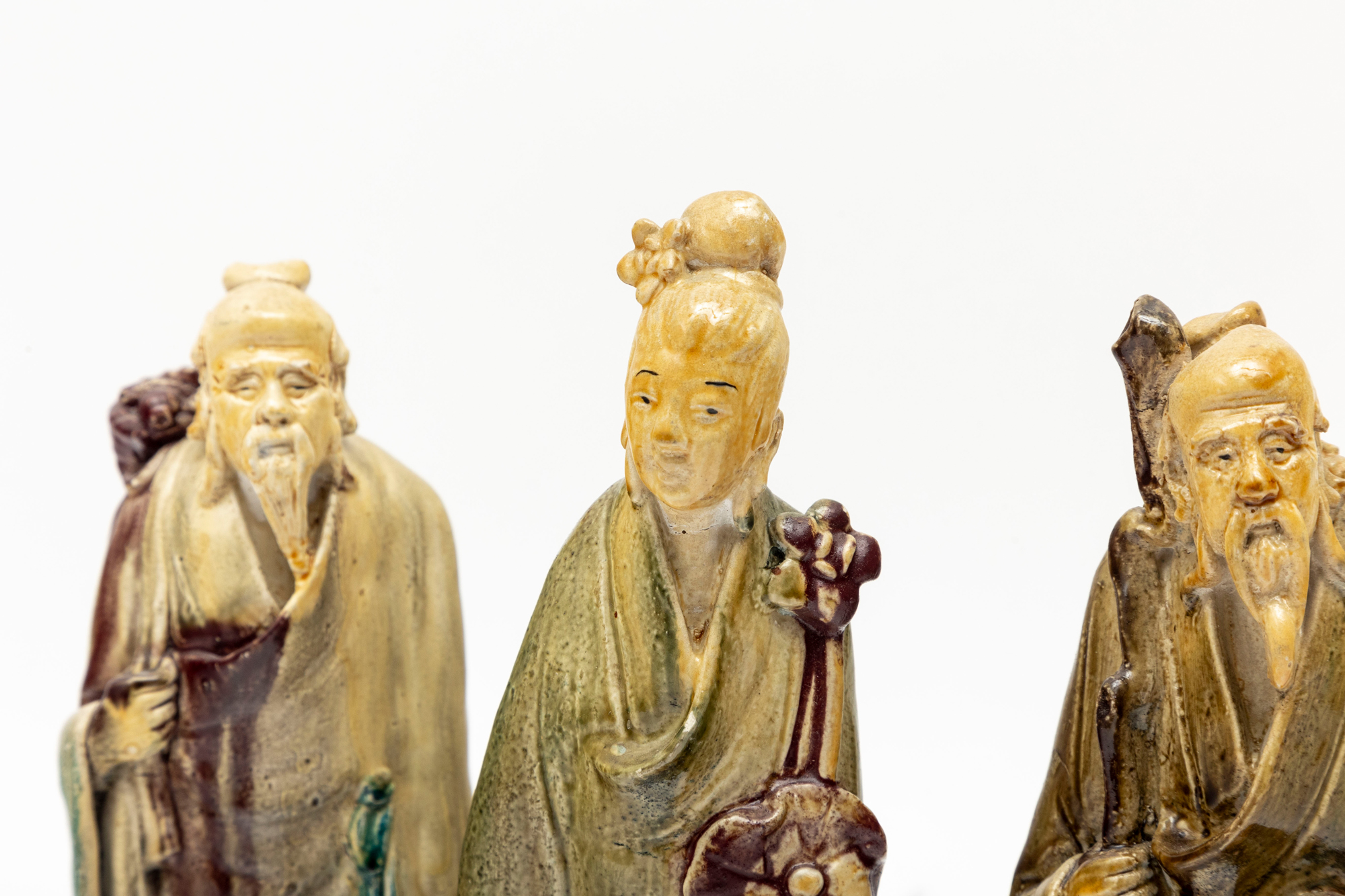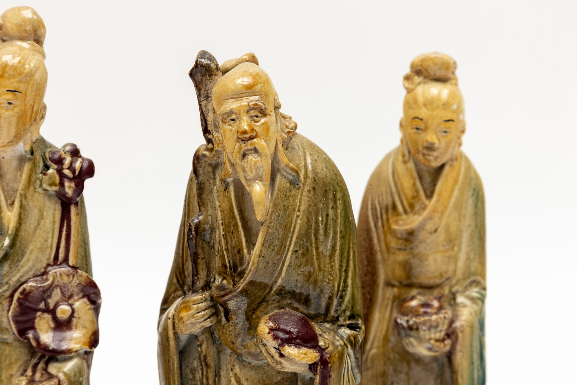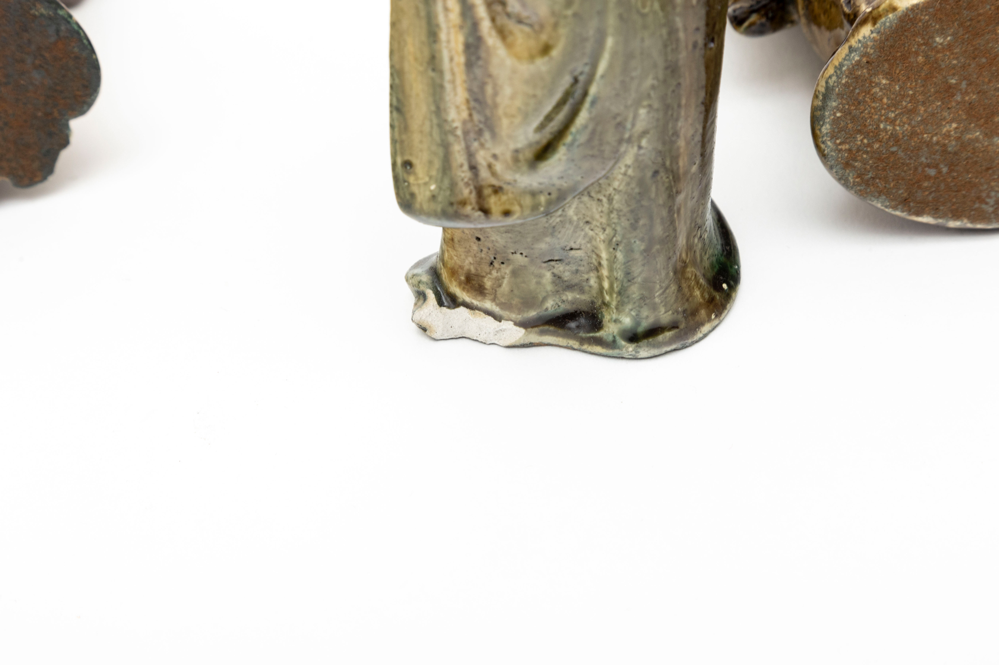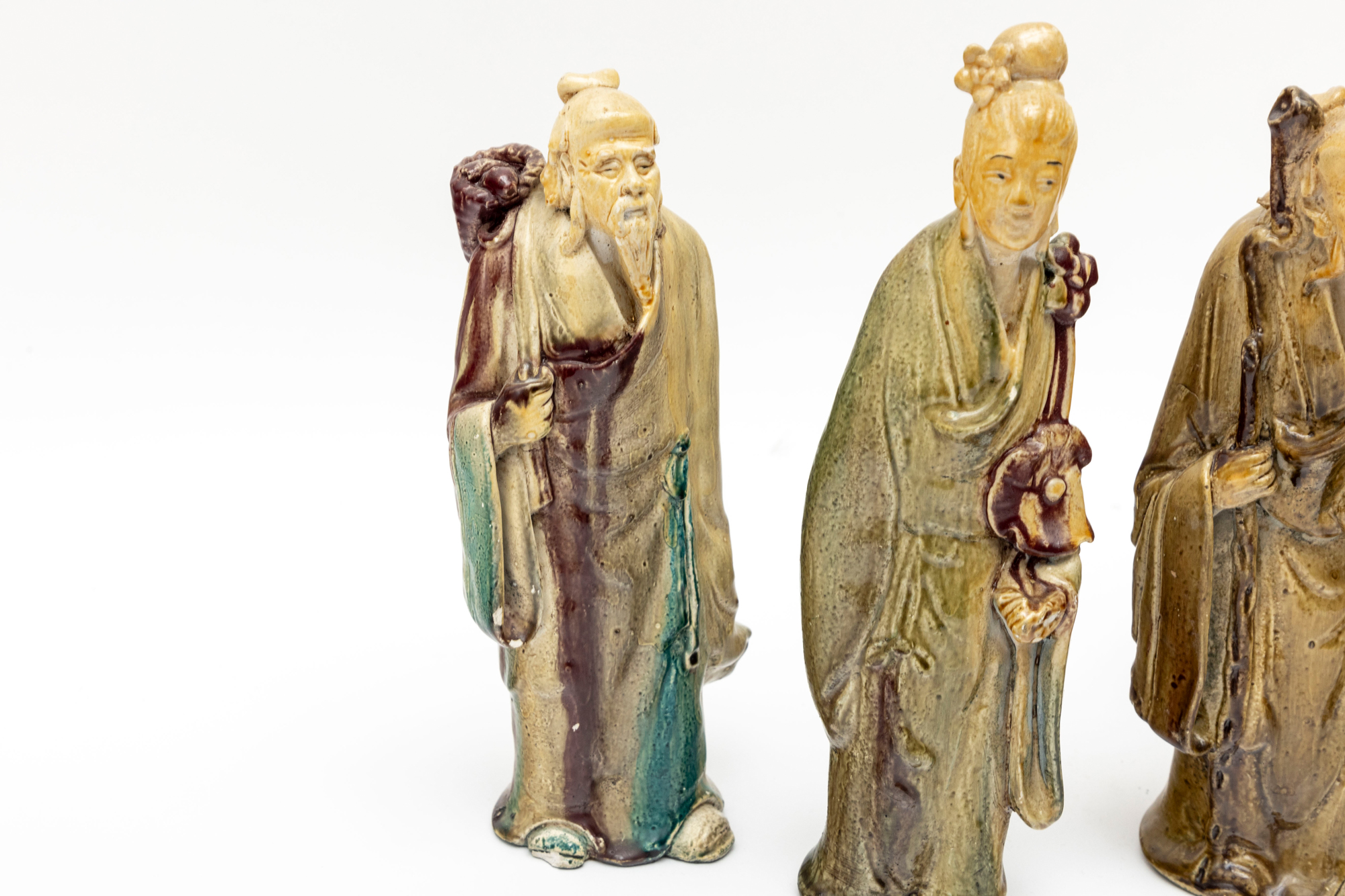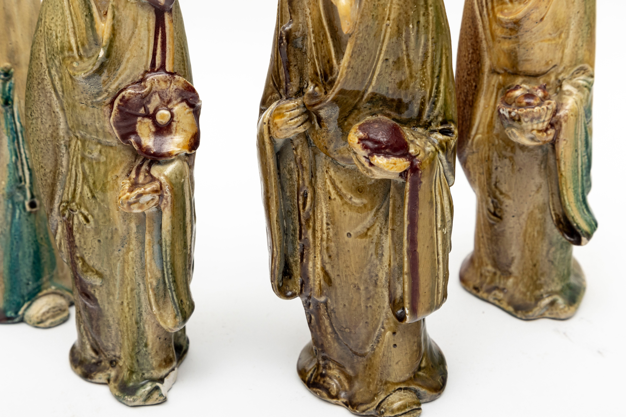 A set of four vintage ceramic "Mudmen" figurines sporting a two-tone green/cream glaze. Chinese mudmen, also known as mudware, are brightly glazed figurines wise men or sages popularized in the early 19th century and are often posed with various objects and keepsakes.