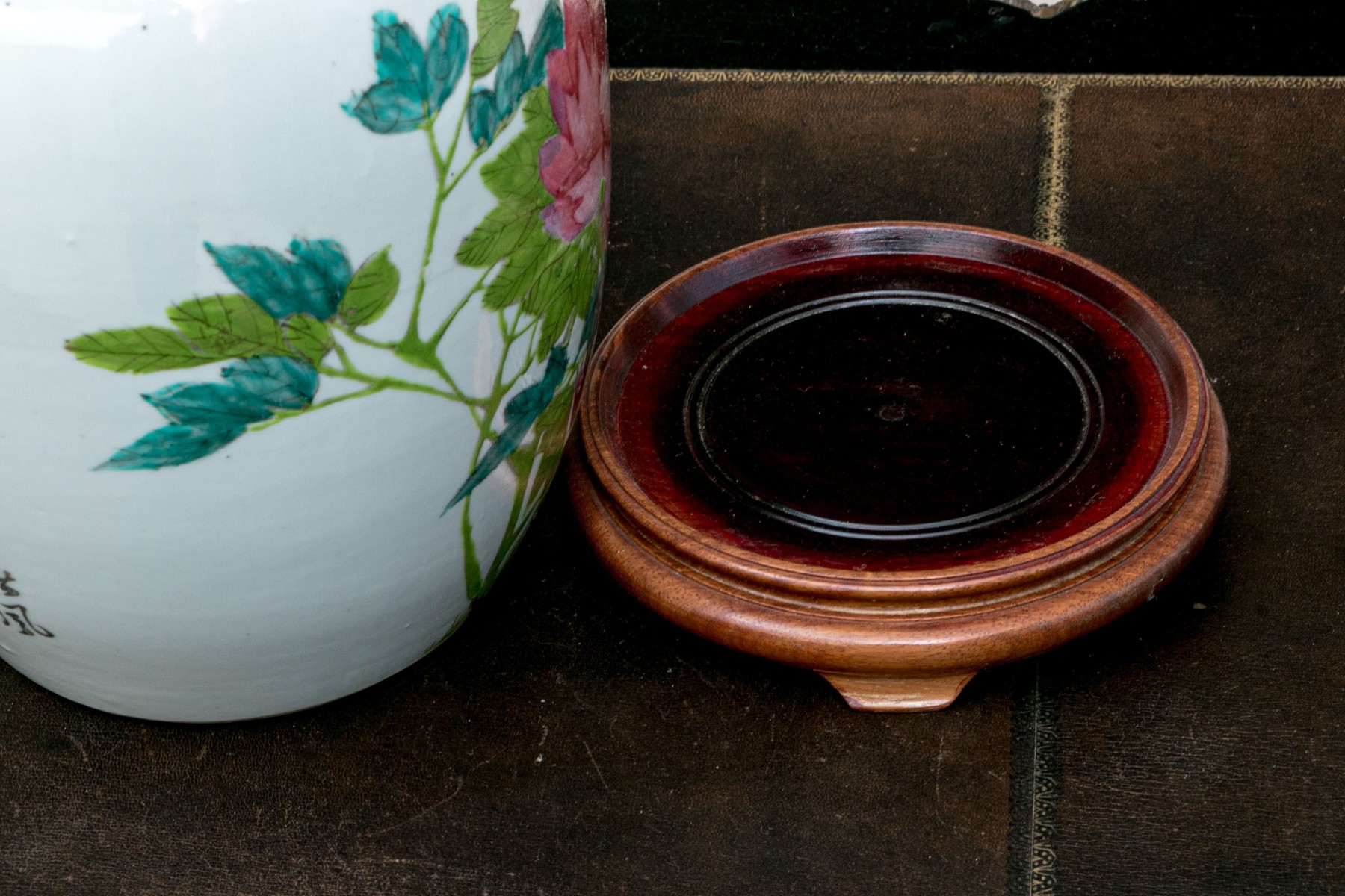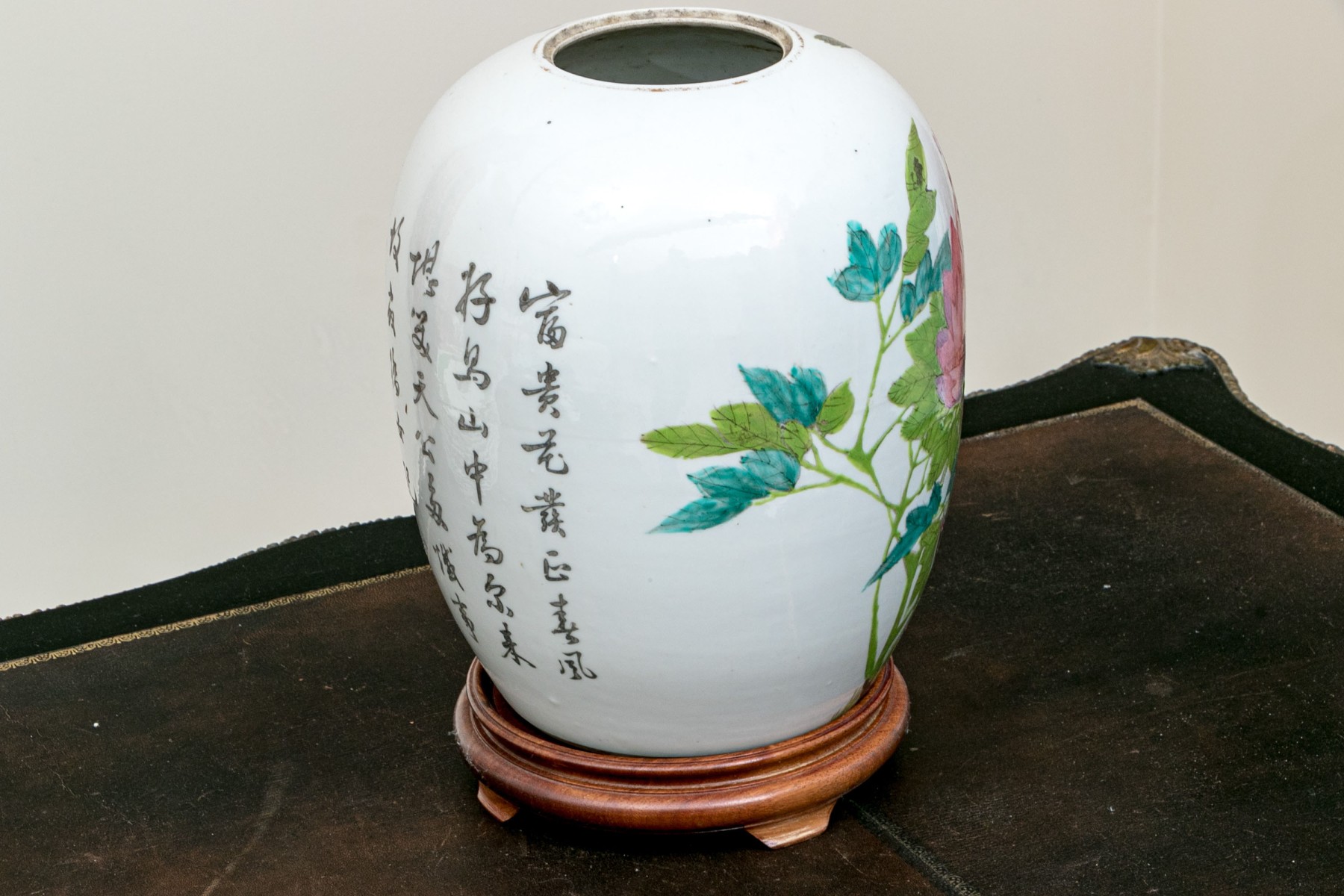 The vase or jar is decorated with a vividly painted peony in bloom with green leaves about to one side with black calligraphy to the opposite all on white ground.