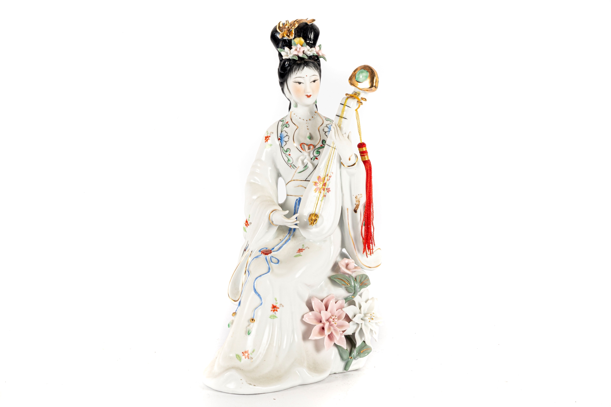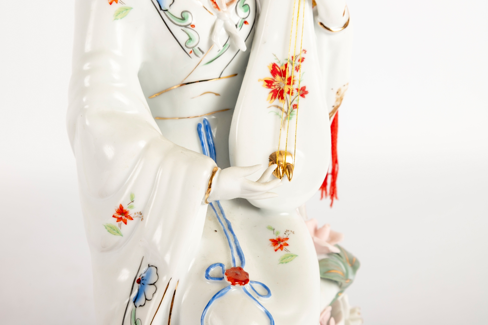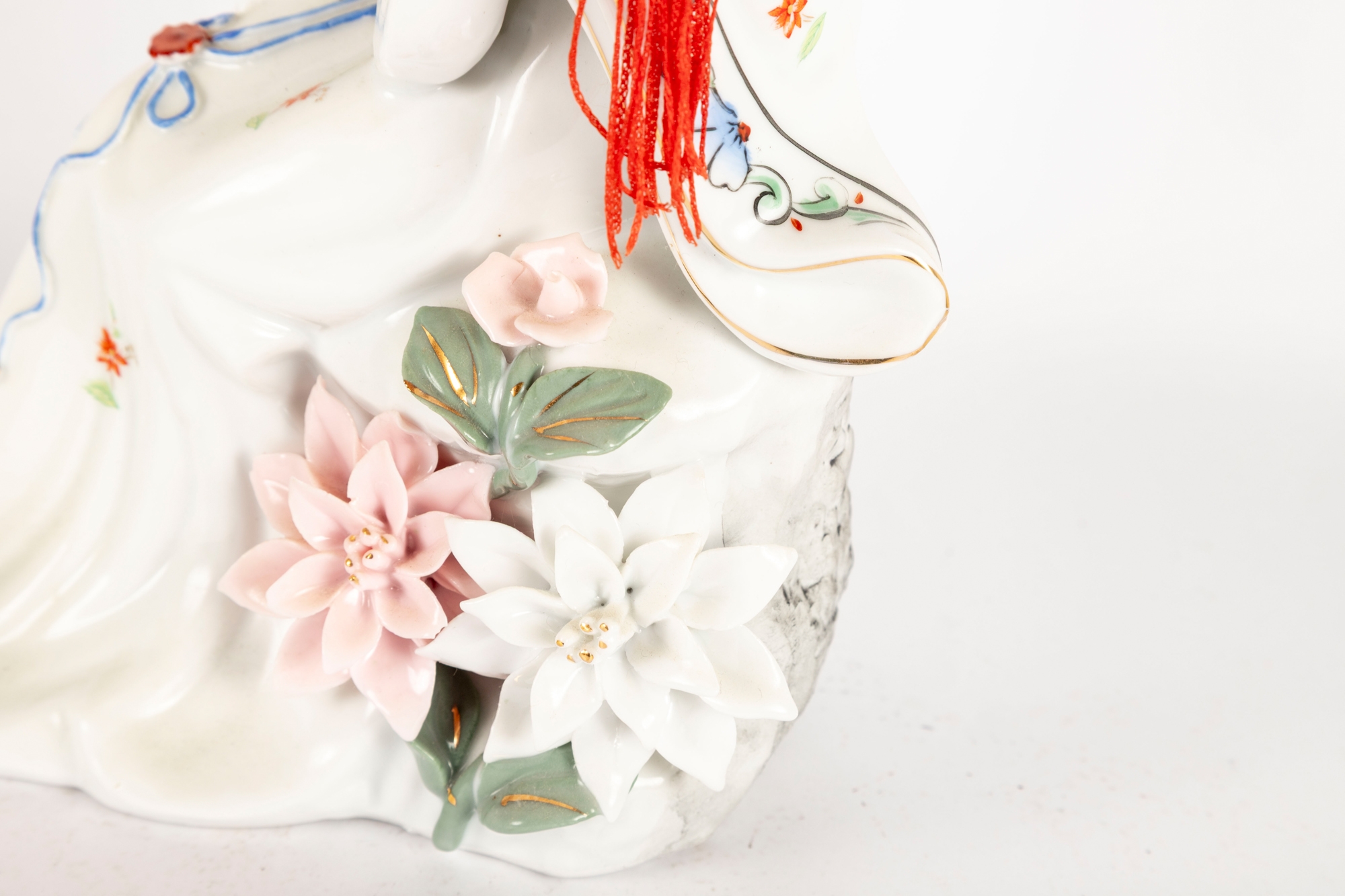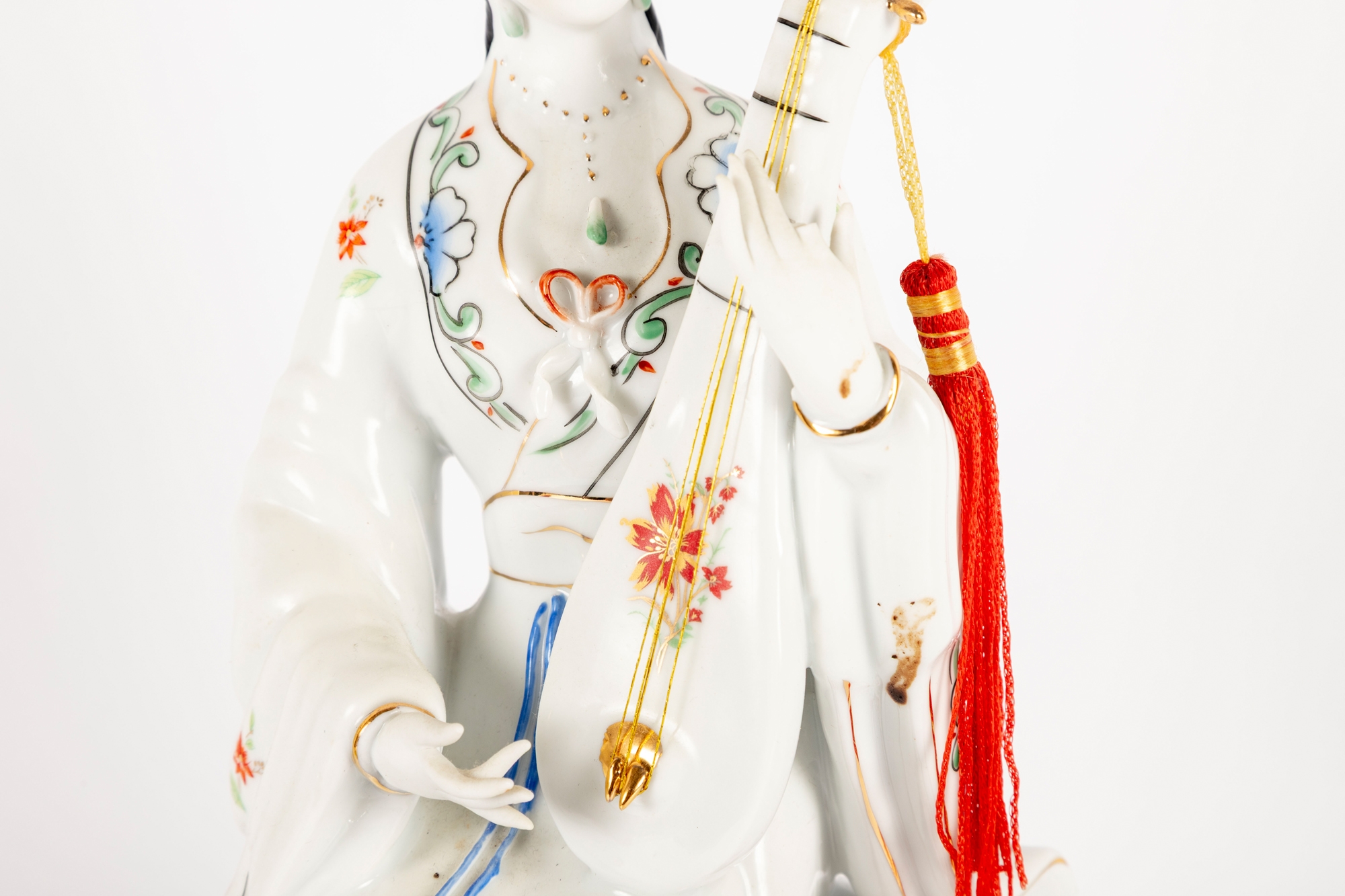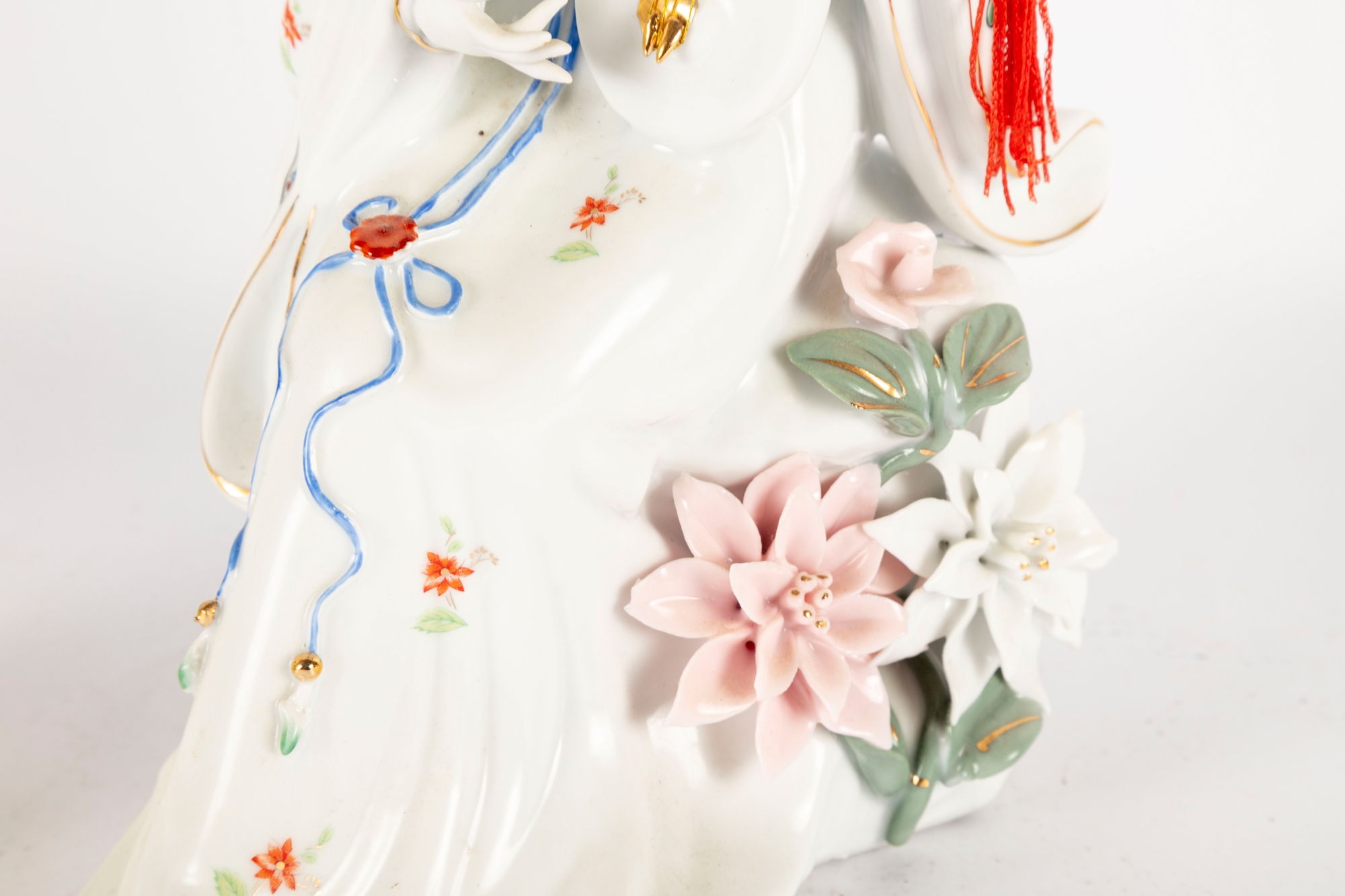 Elegant hand-painted porcelain figure of Guanyin, the Buddhist goddess of mercy, depicted seated gracefully and holding a pipa (Chinese lute). She wears a flowing white robe adorned with delicate floral motifs and gilt accents, complemented by a serene expression and detailed facial features. Her elaborate coiffure is adorned with pastel blossoms and a golden ornament. A red tassel embellishes the instrument, and pastel lotus flowers bloom at her feet.