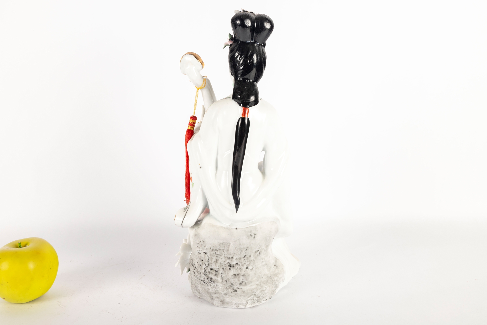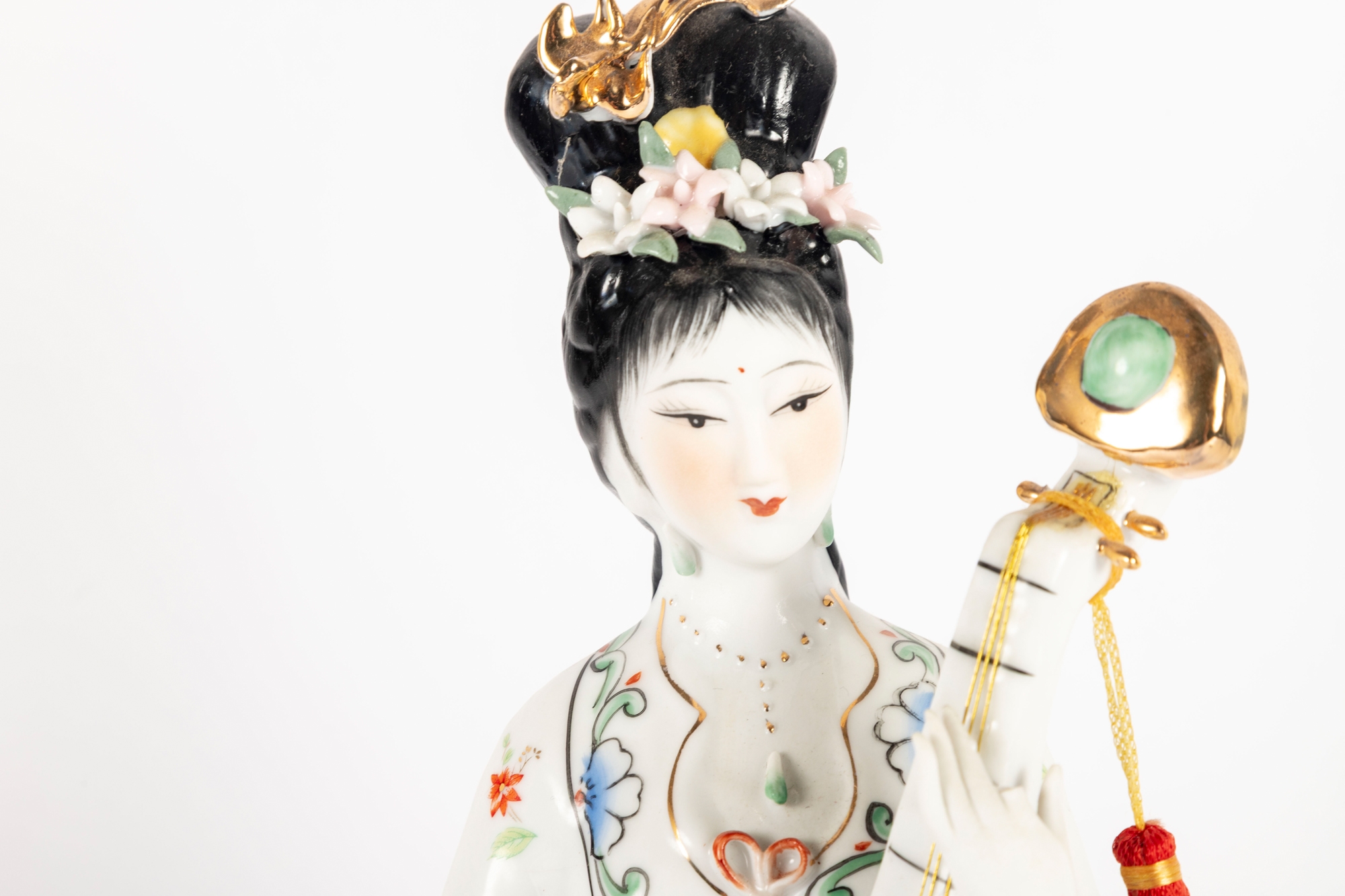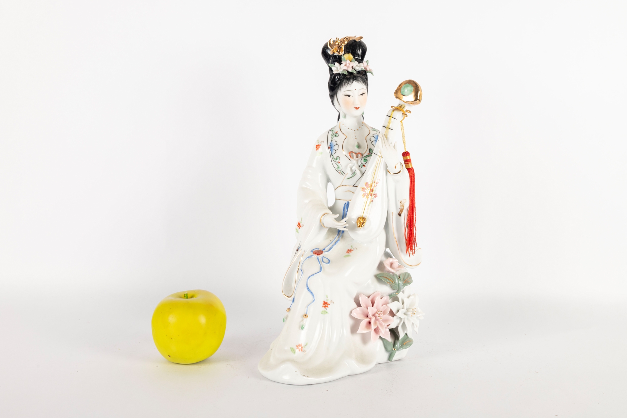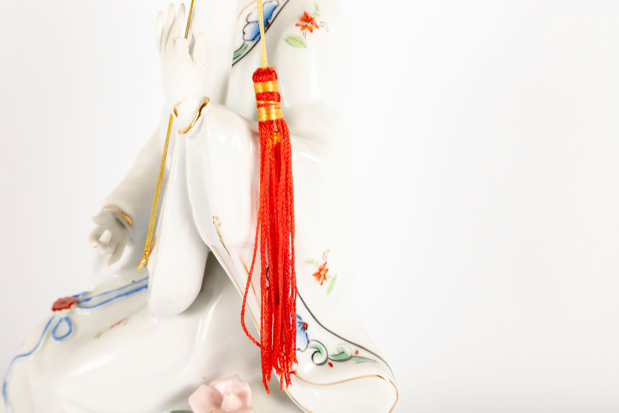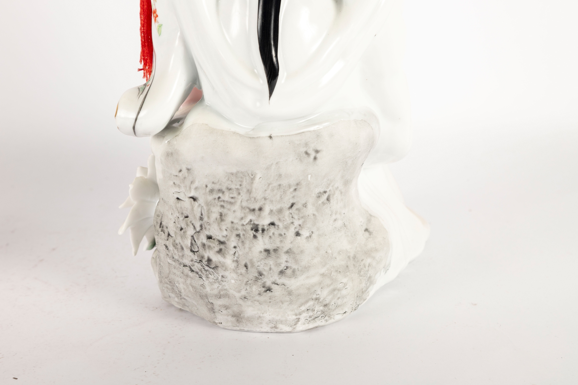 Elegant hand-painted porcelain figure of Guanyin, the Buddhist goddess of mercy, depicted seated gracefully and holding a pipa (Chinese lute). She wears a flowing white robe adorned with delicate floral motifs and gilt accents, complemented by a serene expression and detailed facial features. Her elaborate coiffure is adorned with pastel blossoms and a golden ornament. A red tassel embellishes the instrument, and pastel lotus flowers bloom at her feet.
