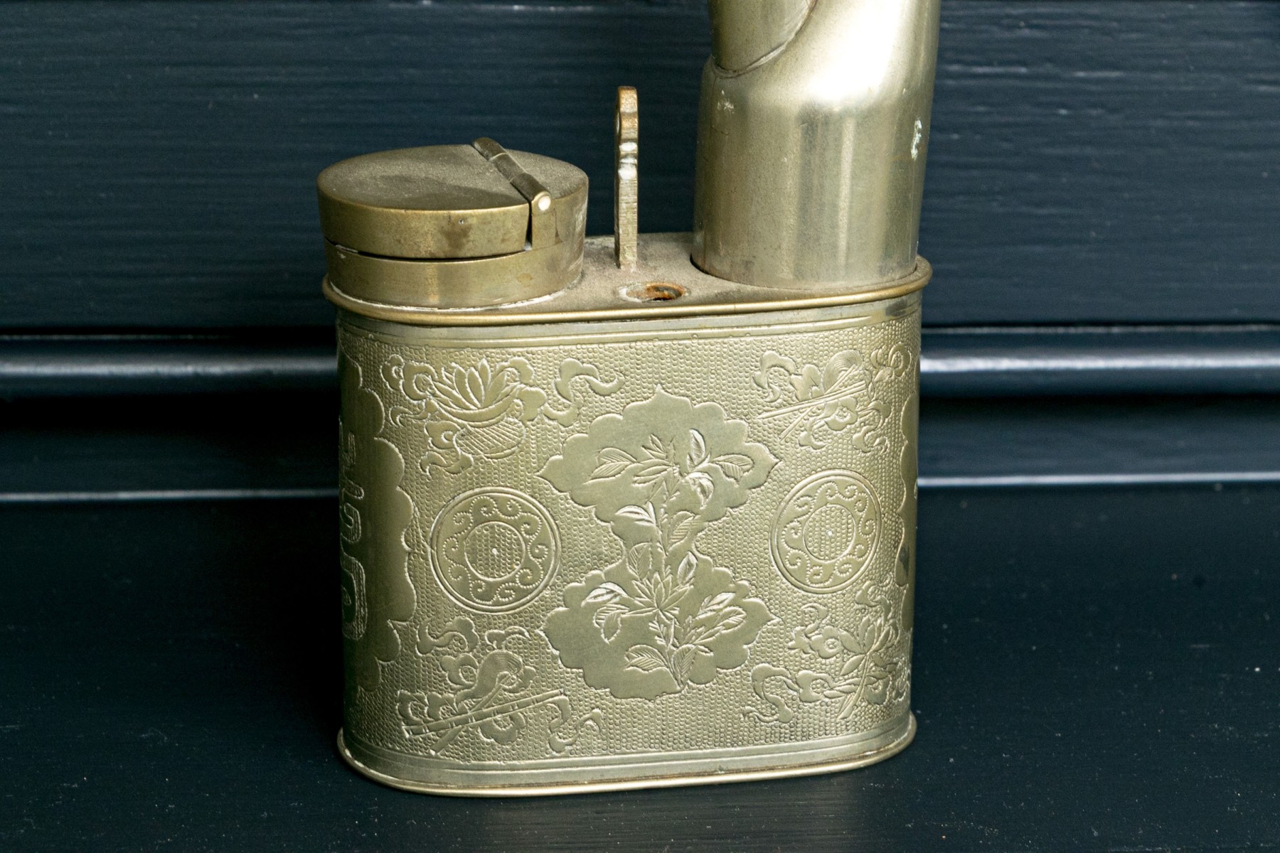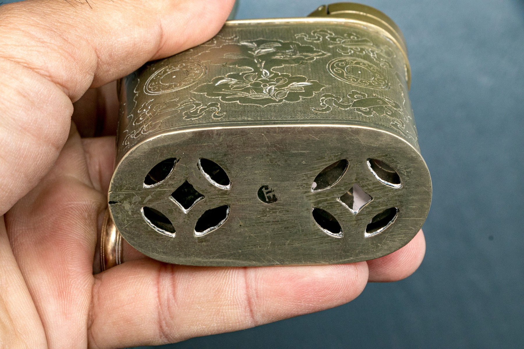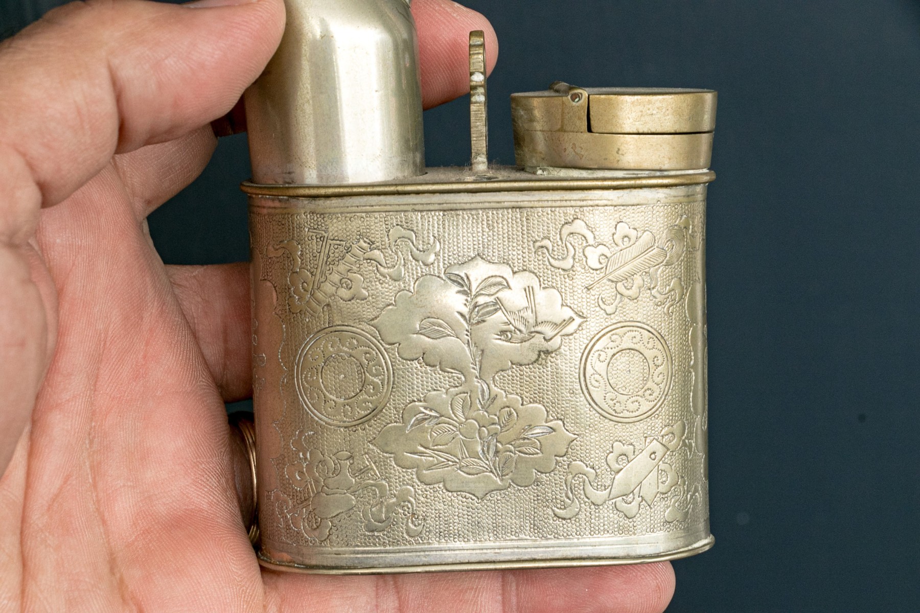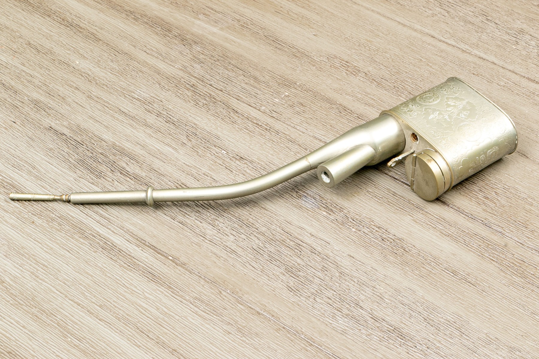 A beautifully crafted vintage Chinese opium pipe made from white brass, featuring intricate etchings of flowers and birds along the body.