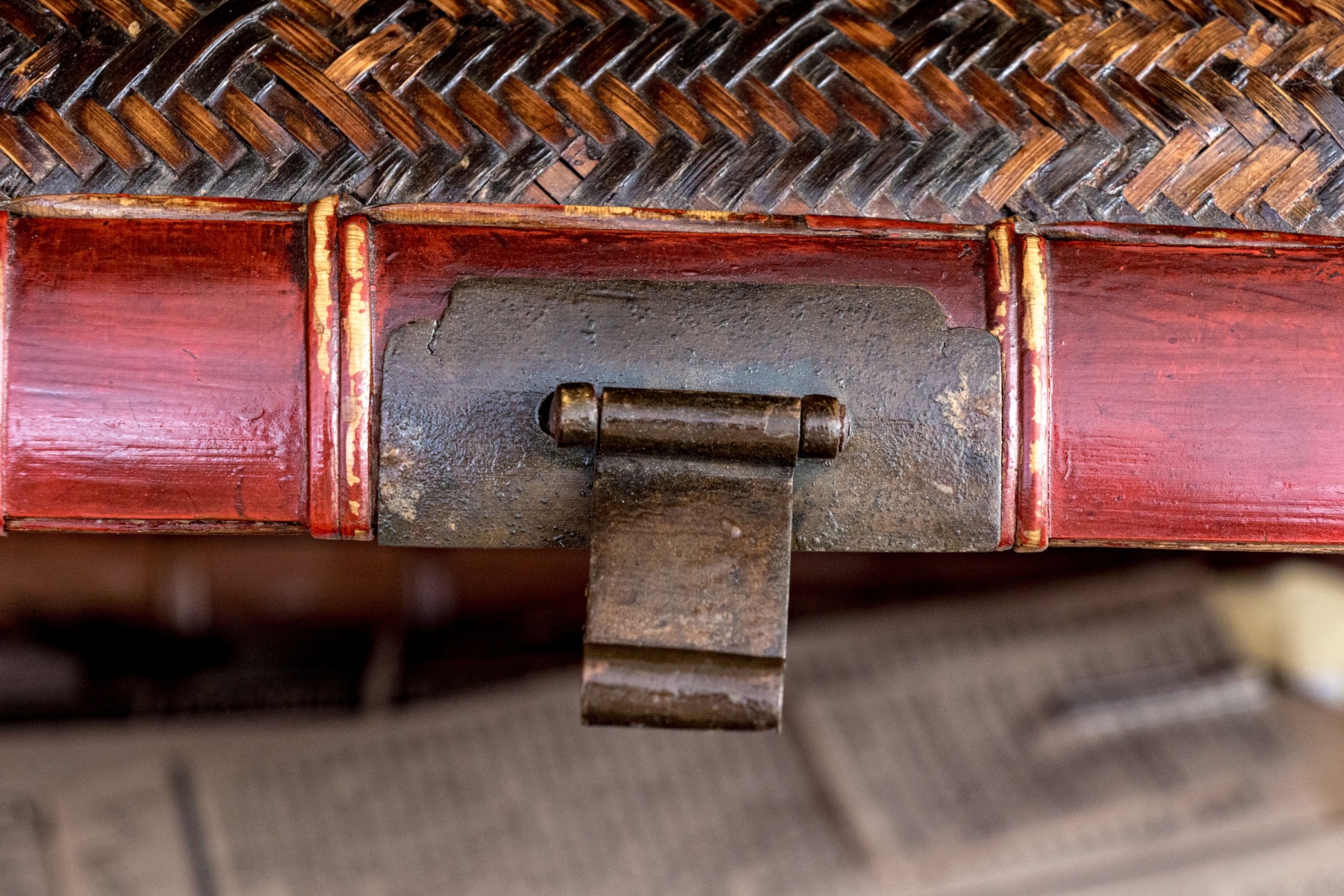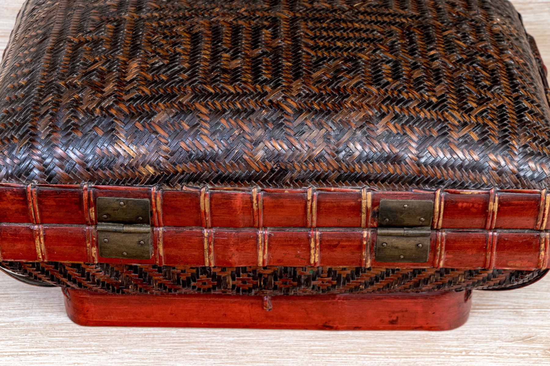 The box is raised on its rectangular lacquered foot with gilt embellished laquer surrounding the woven panels and has a brass close clasp and hinged lid.