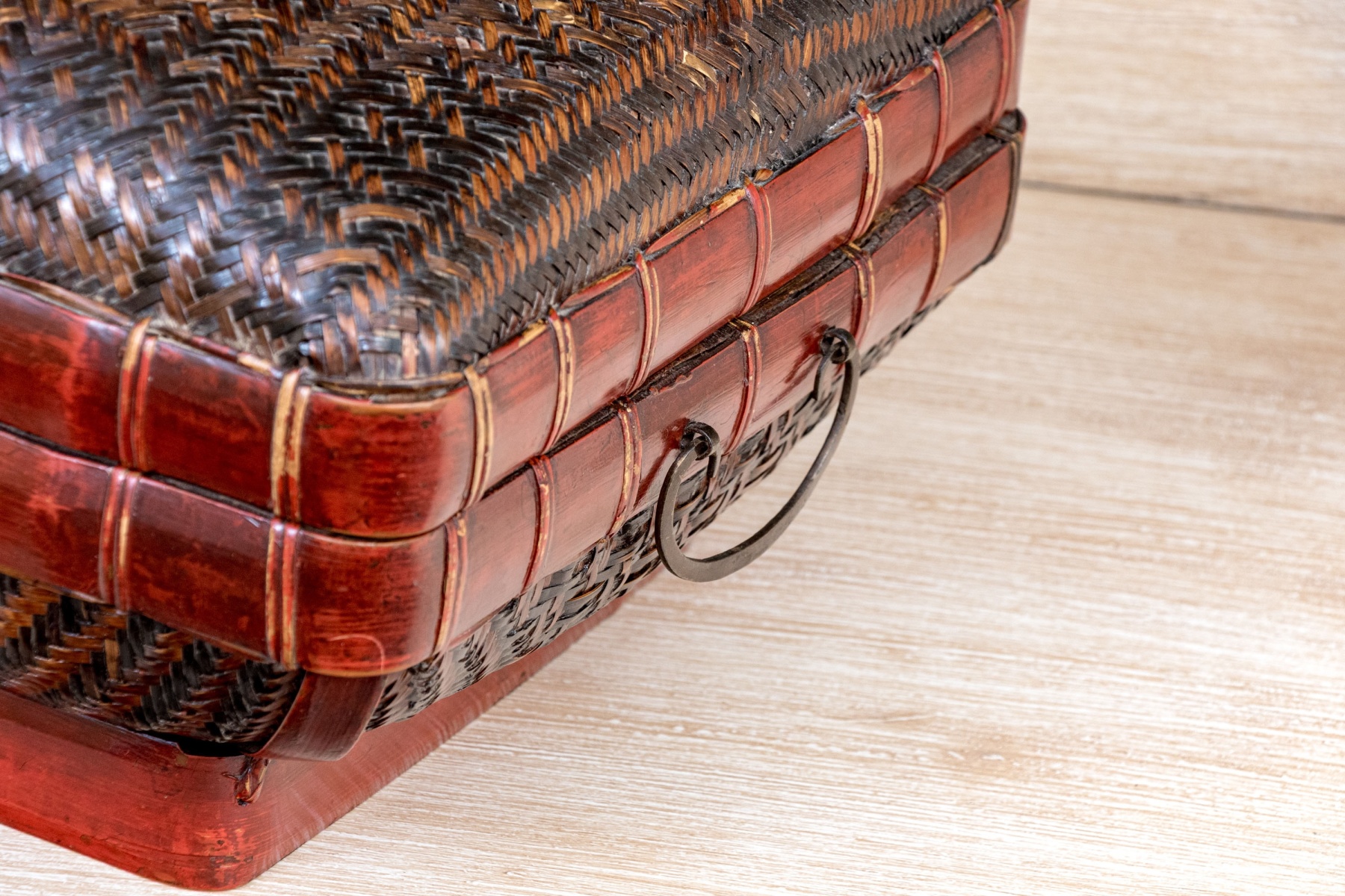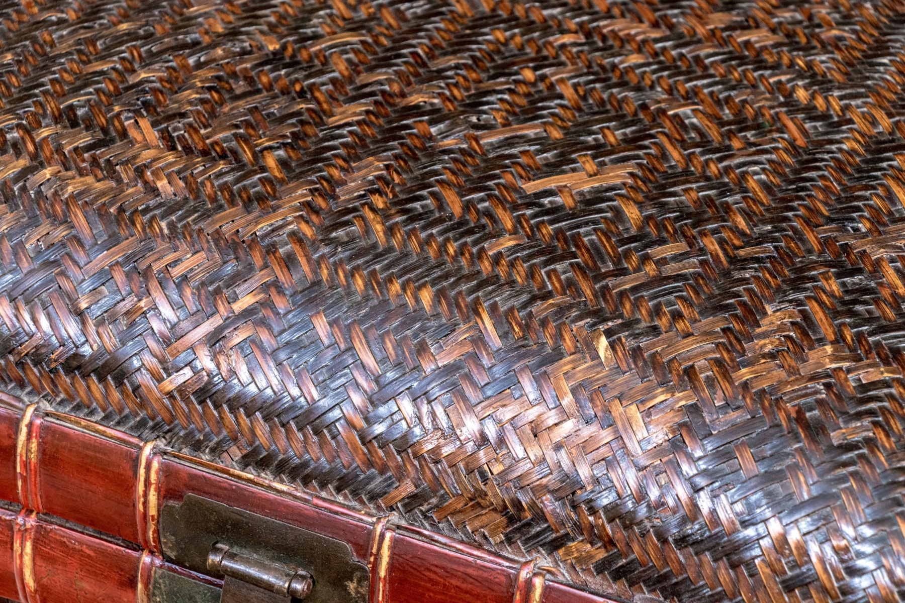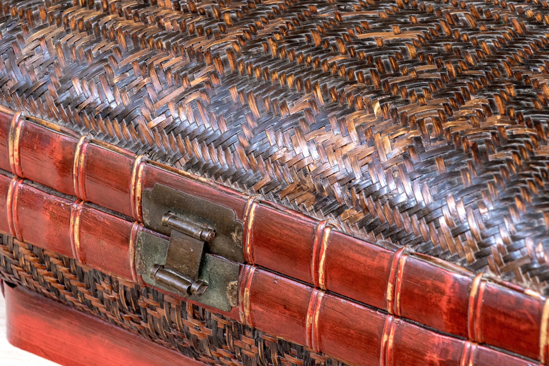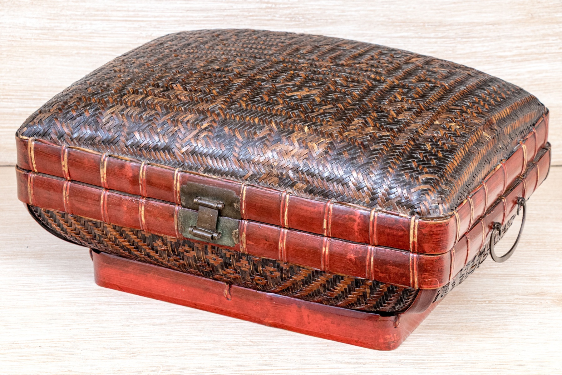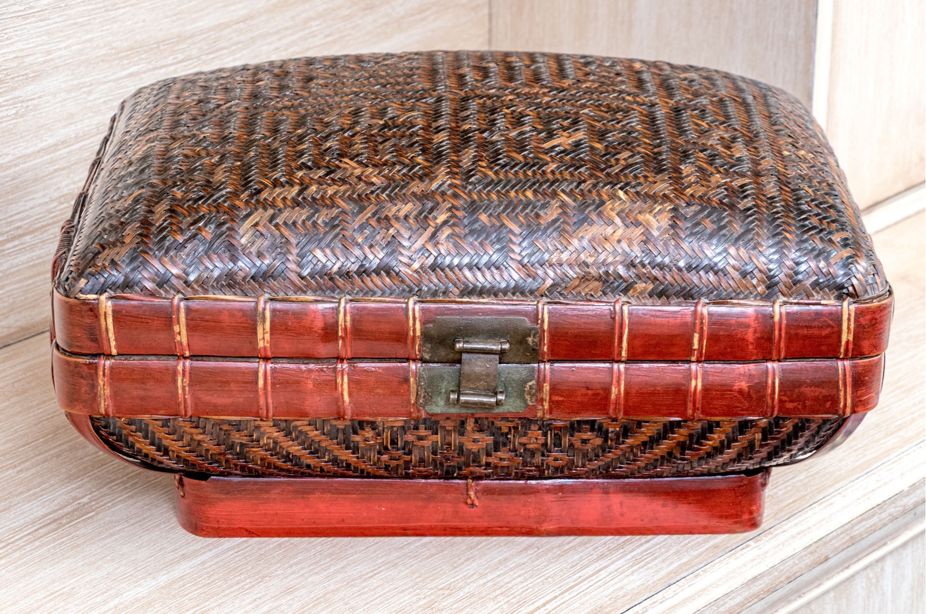The vintage Chinese woven rattan and lacquered pillow form lidded bamboo pillow form box. Traditionally used for storage of personal wares, the fabulous decoration with the woven rattan panels with wonderful geometric aesthetics, bordered by lacquered frame lends visually appealing aesthetic to the storage box.