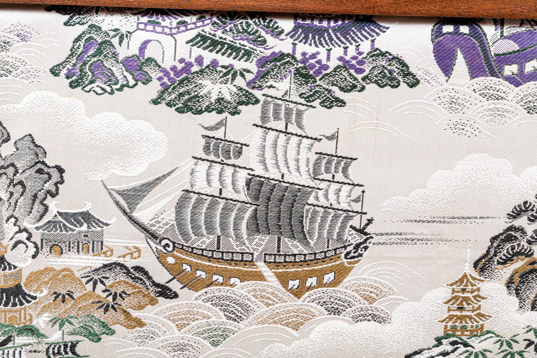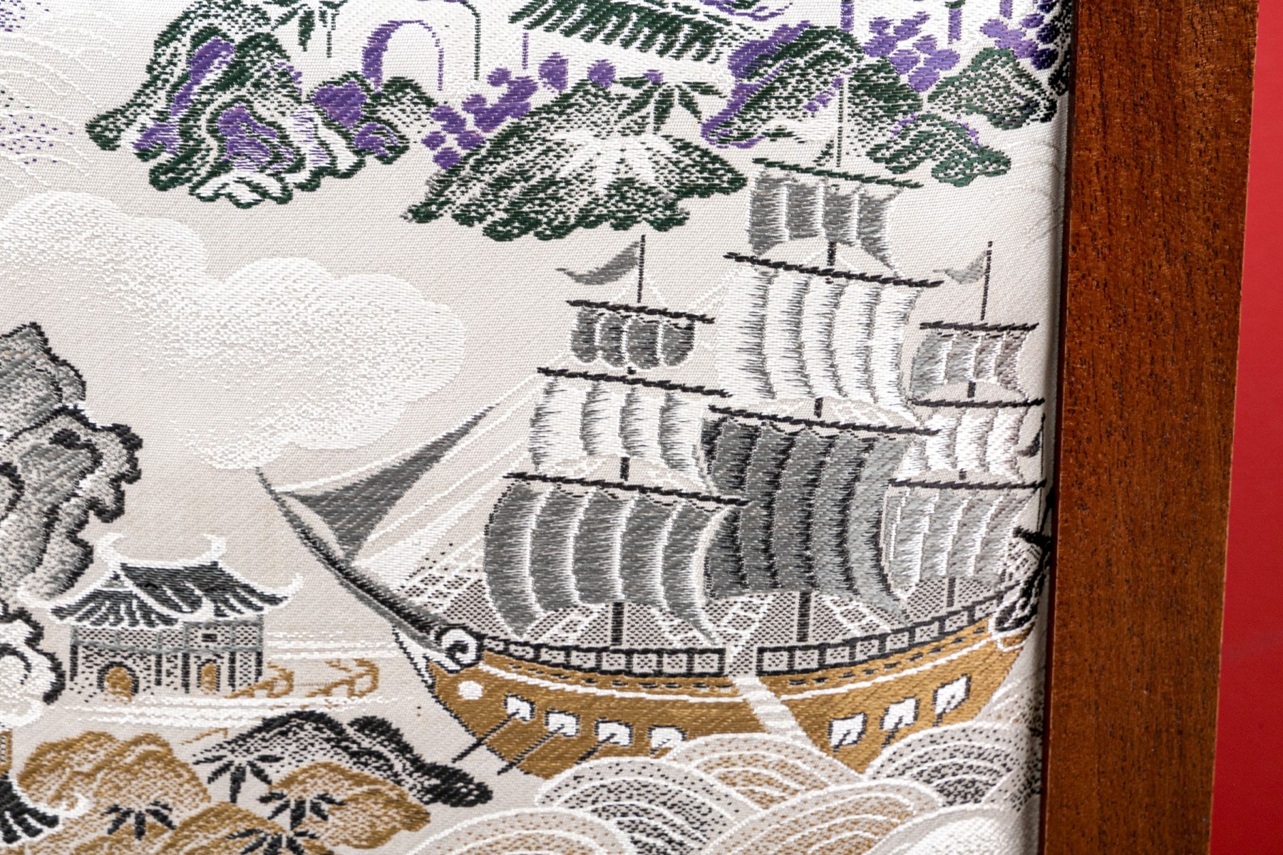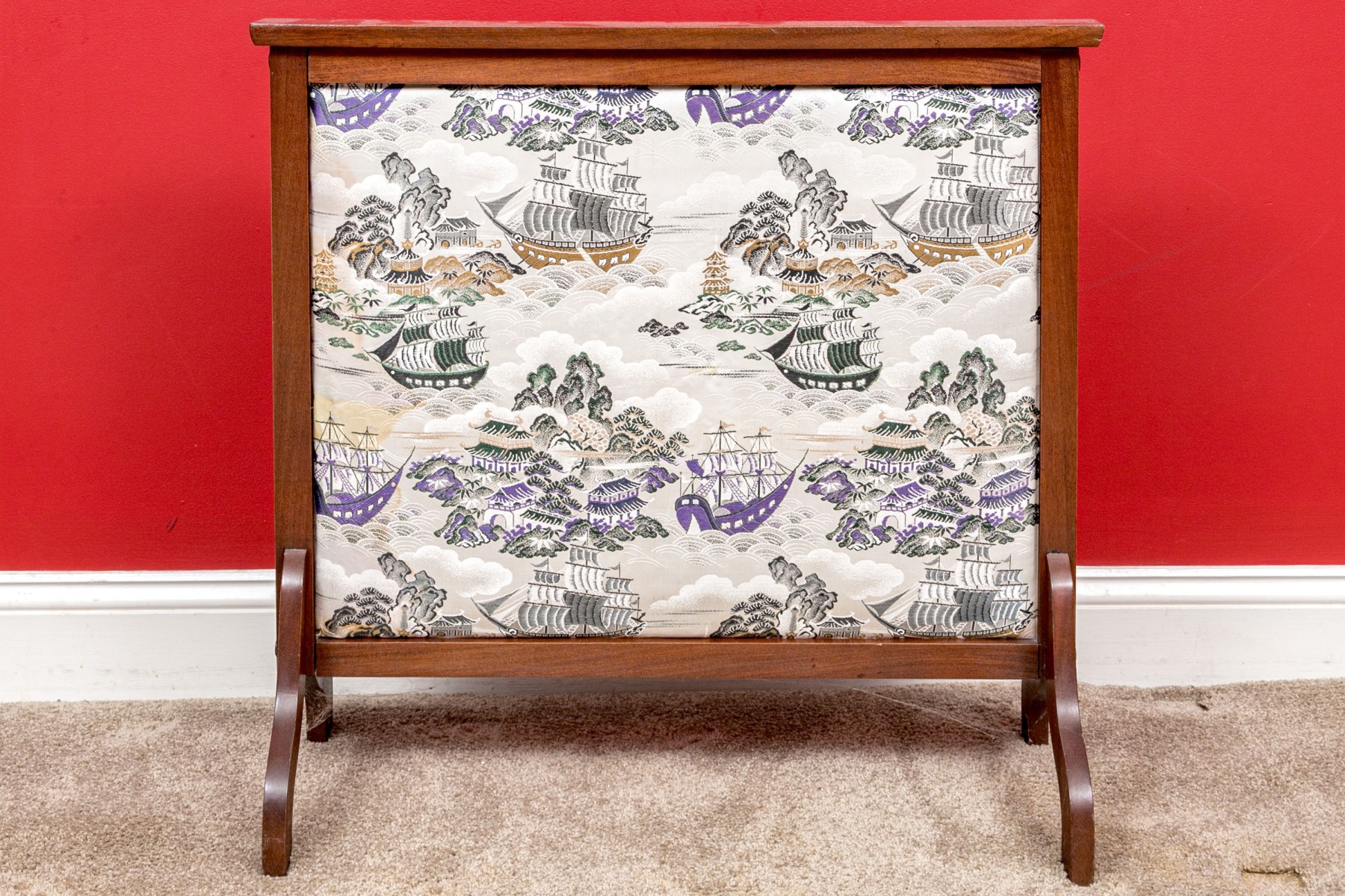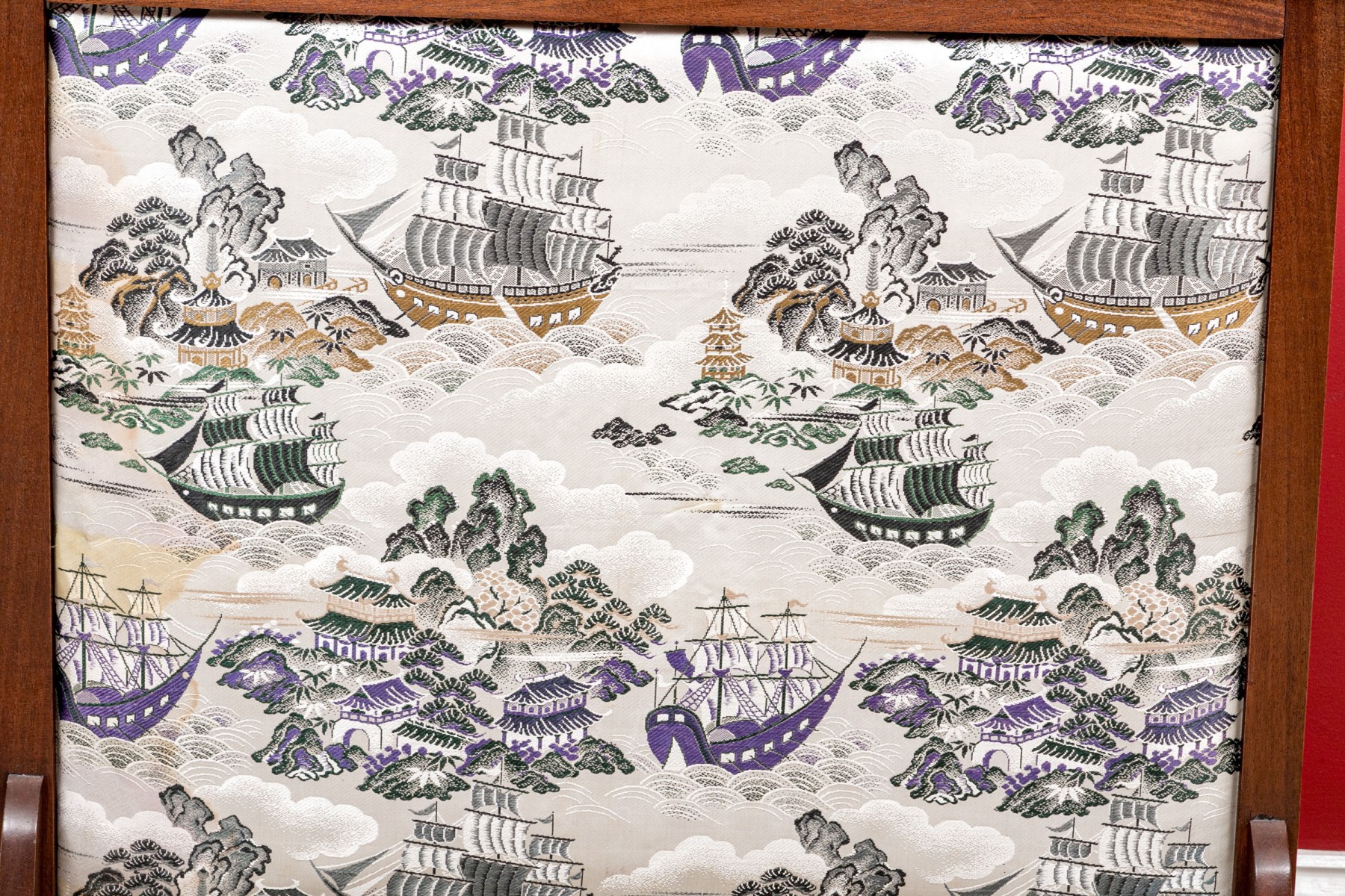 Fantastic wooden frame with supported ends, the vintage upholstered panel depicts a tumultuous nautical scene likely after one originating in theme from 18th century Canton.