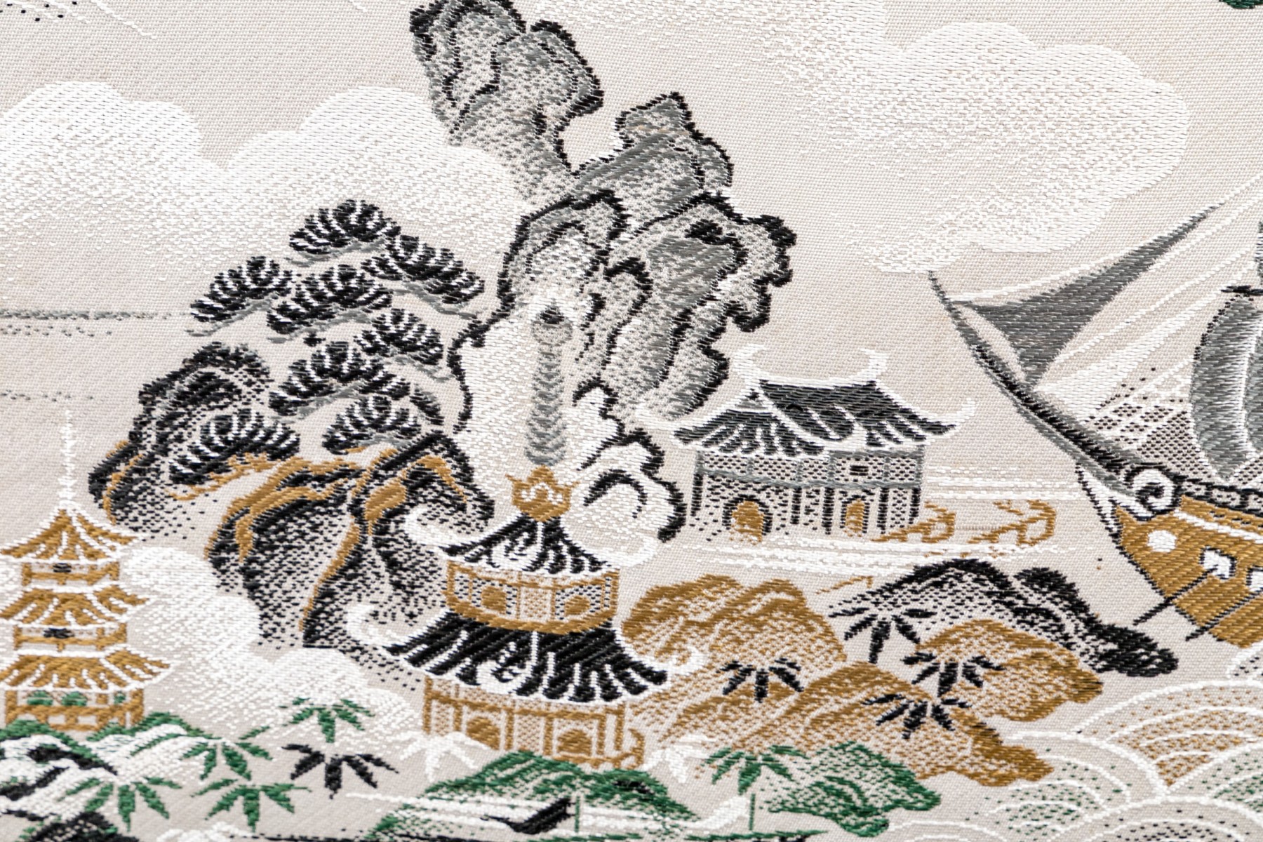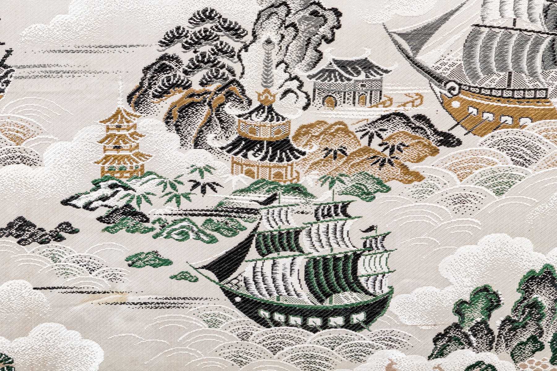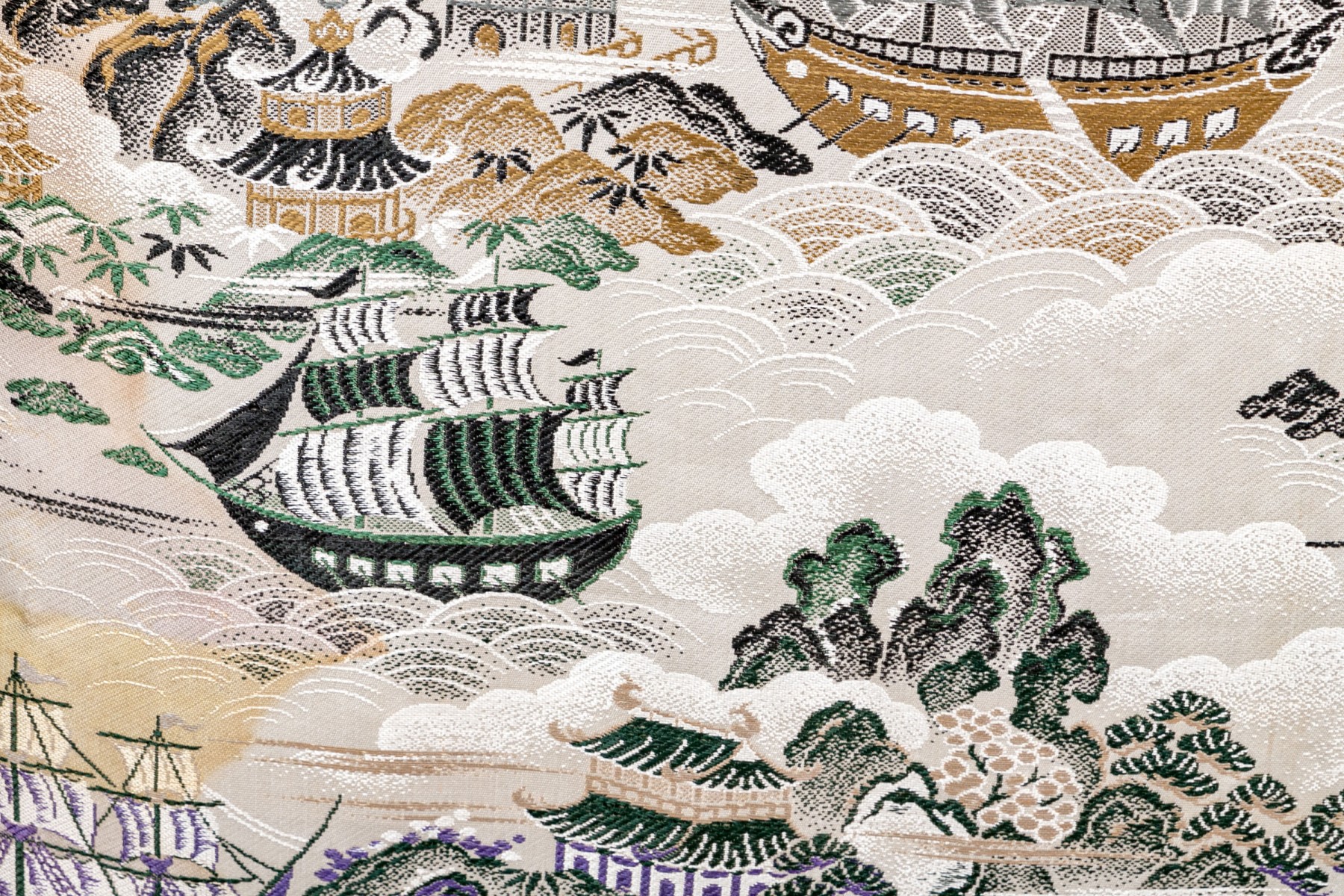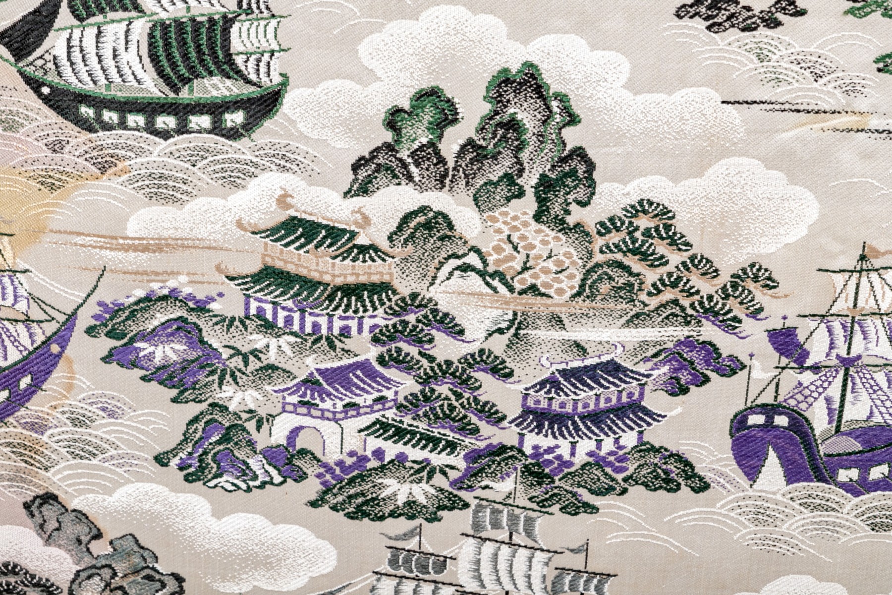 Fantastic wooden frame with supported ends, the vintage upholstered panel depicts a tumultuous nautical scene likely after one originating in theme from 18th century Canton.