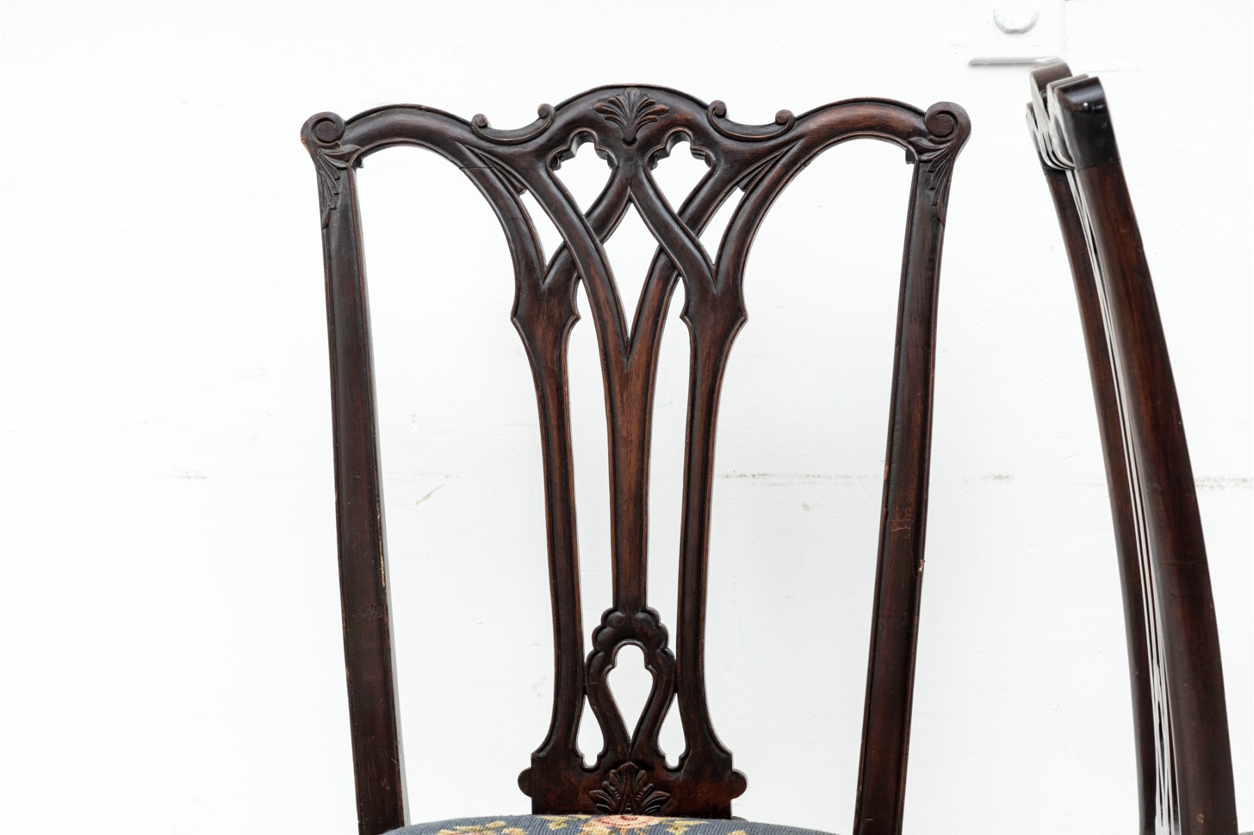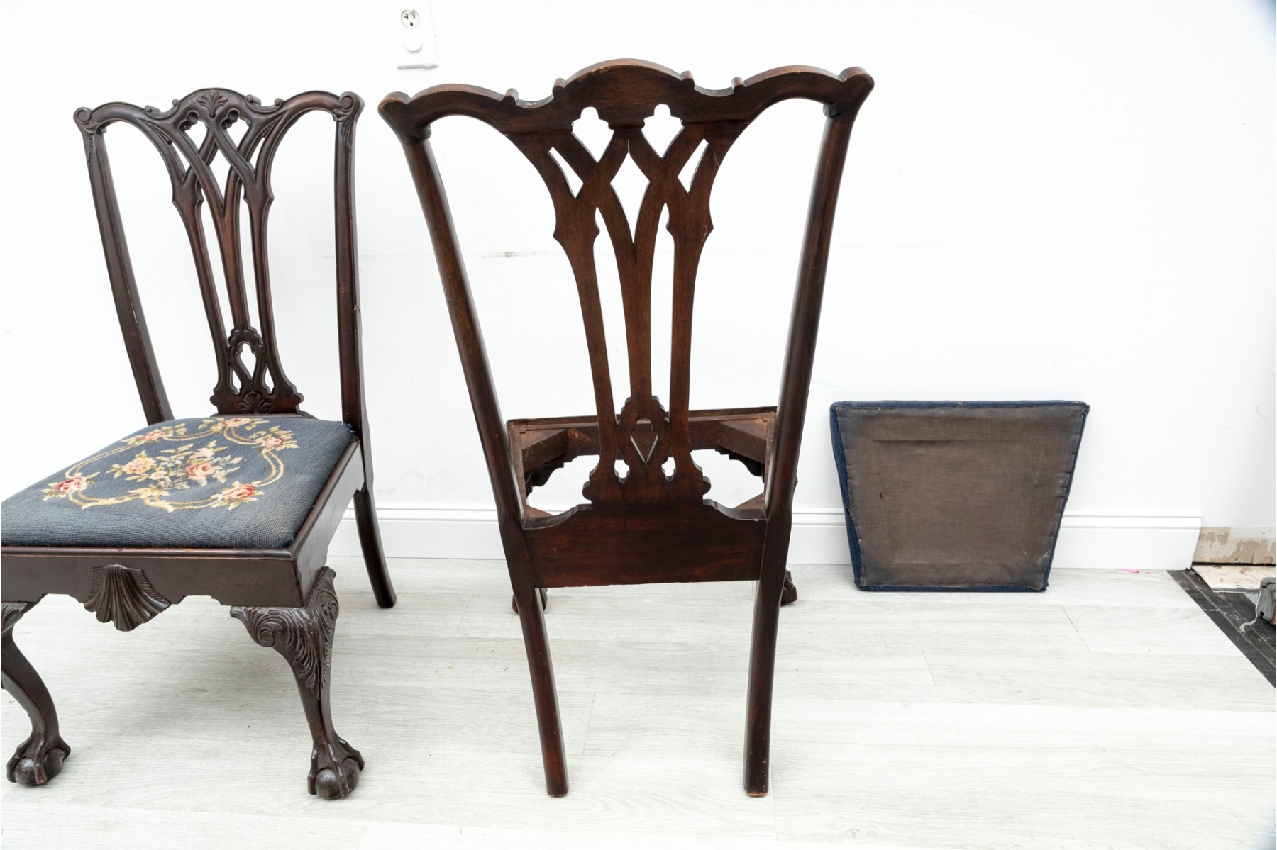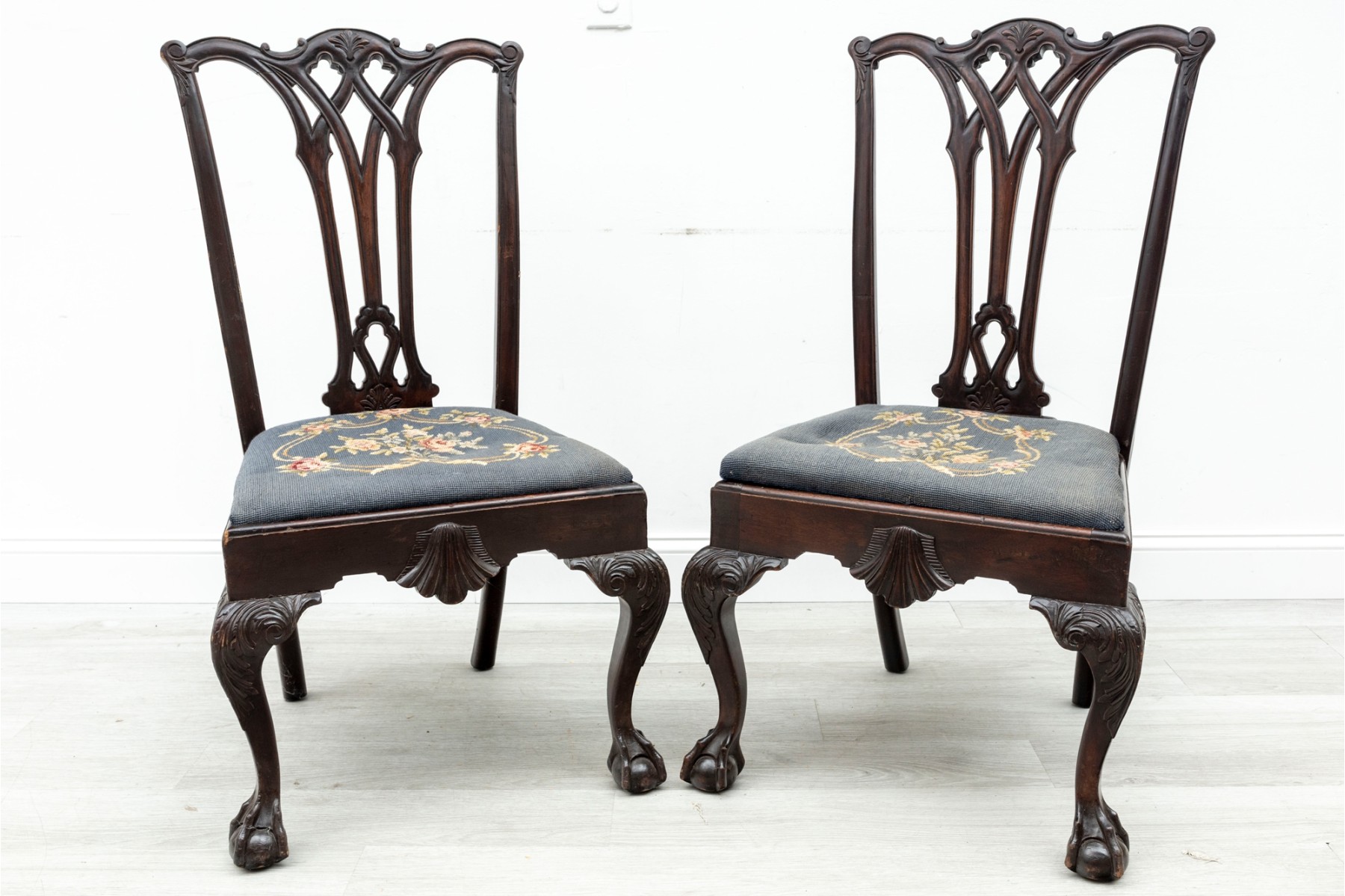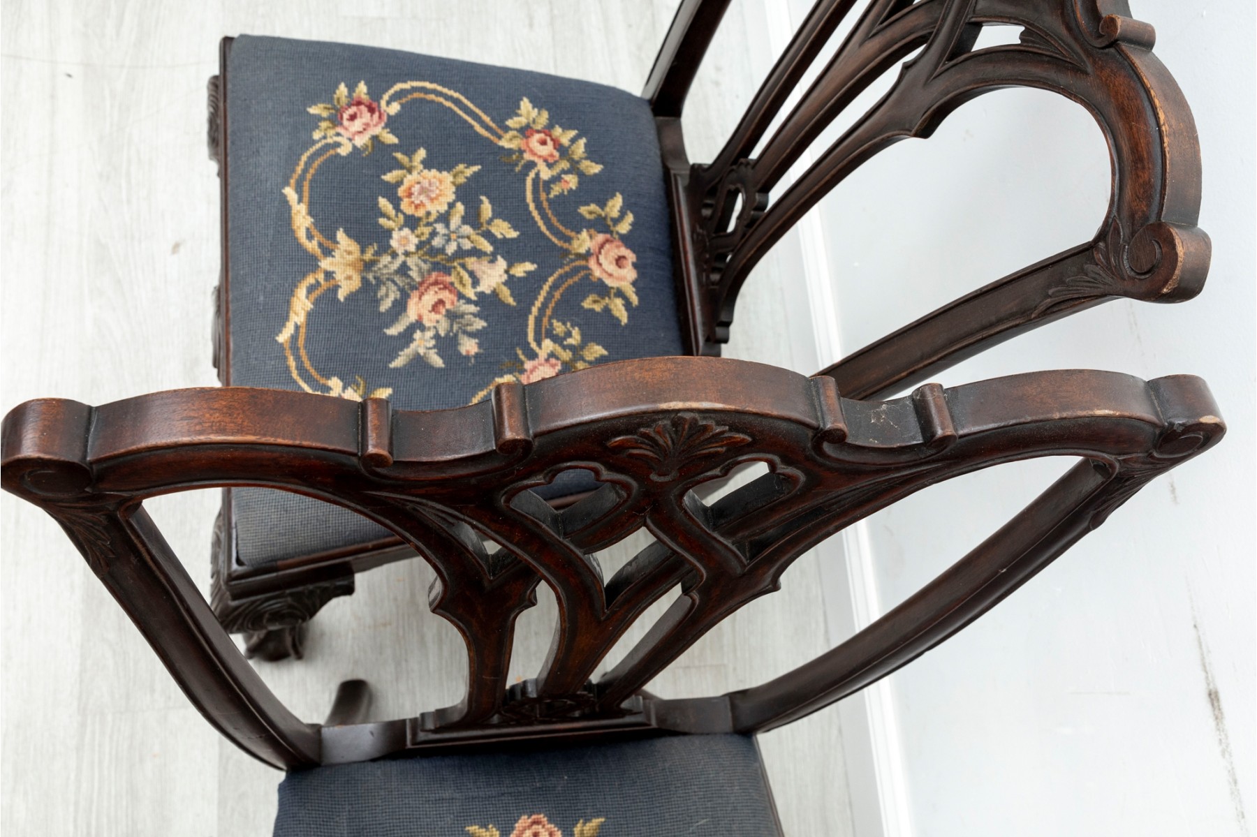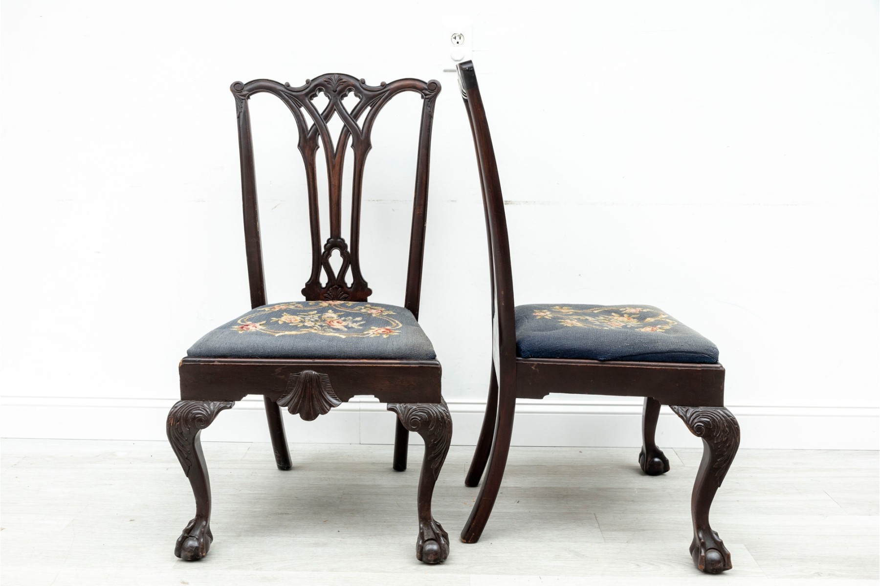 This pair of vintage solid wood Chippendale chairs showcases exquisite craftsmanship and classic design. Each chair is elegantly carved with traditional Chippendale details, featuring graceful curves and intricate back splats. The legs terminate in iconic ball and claw feet, adding a touch of bold sophistication.
