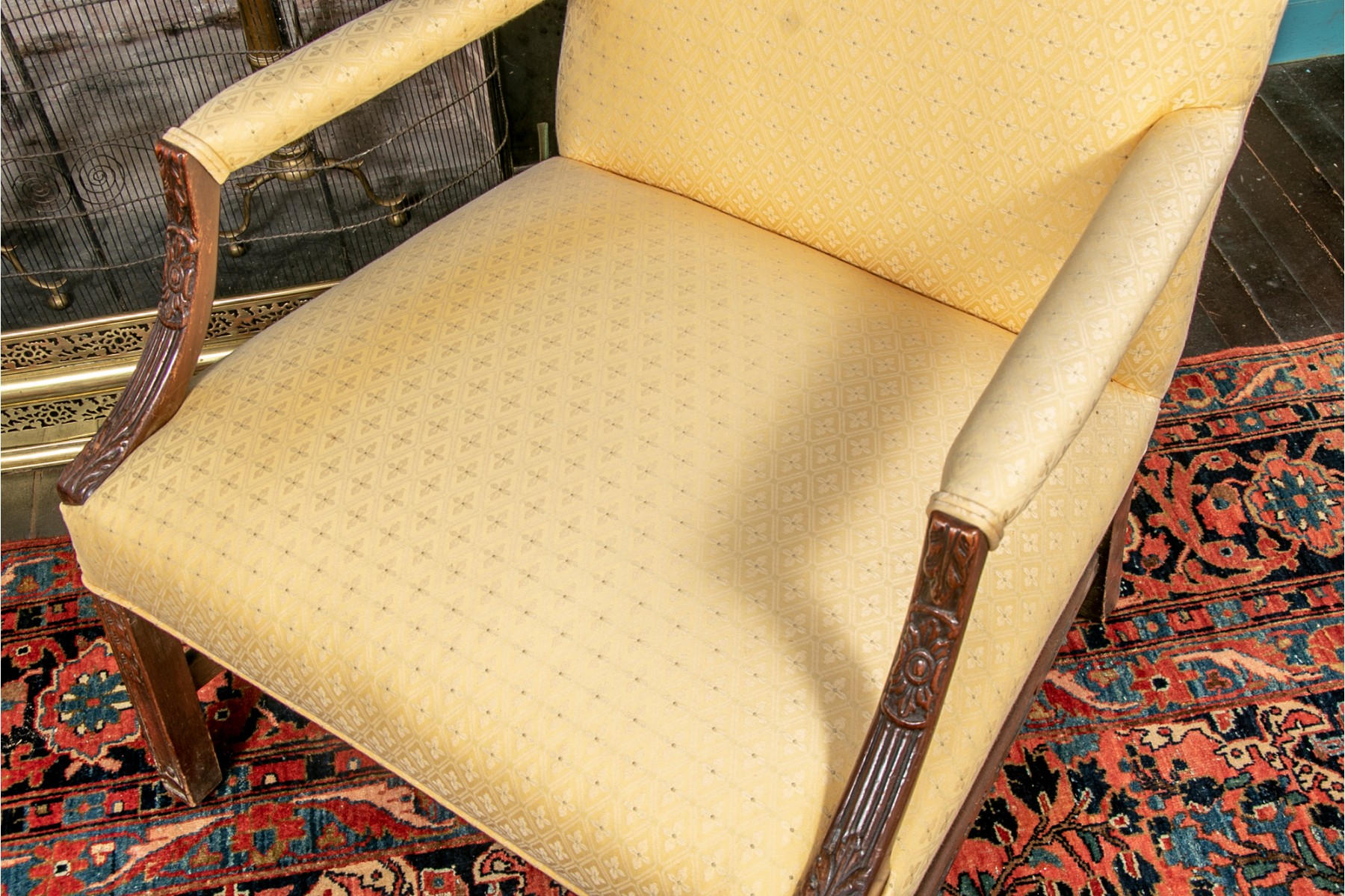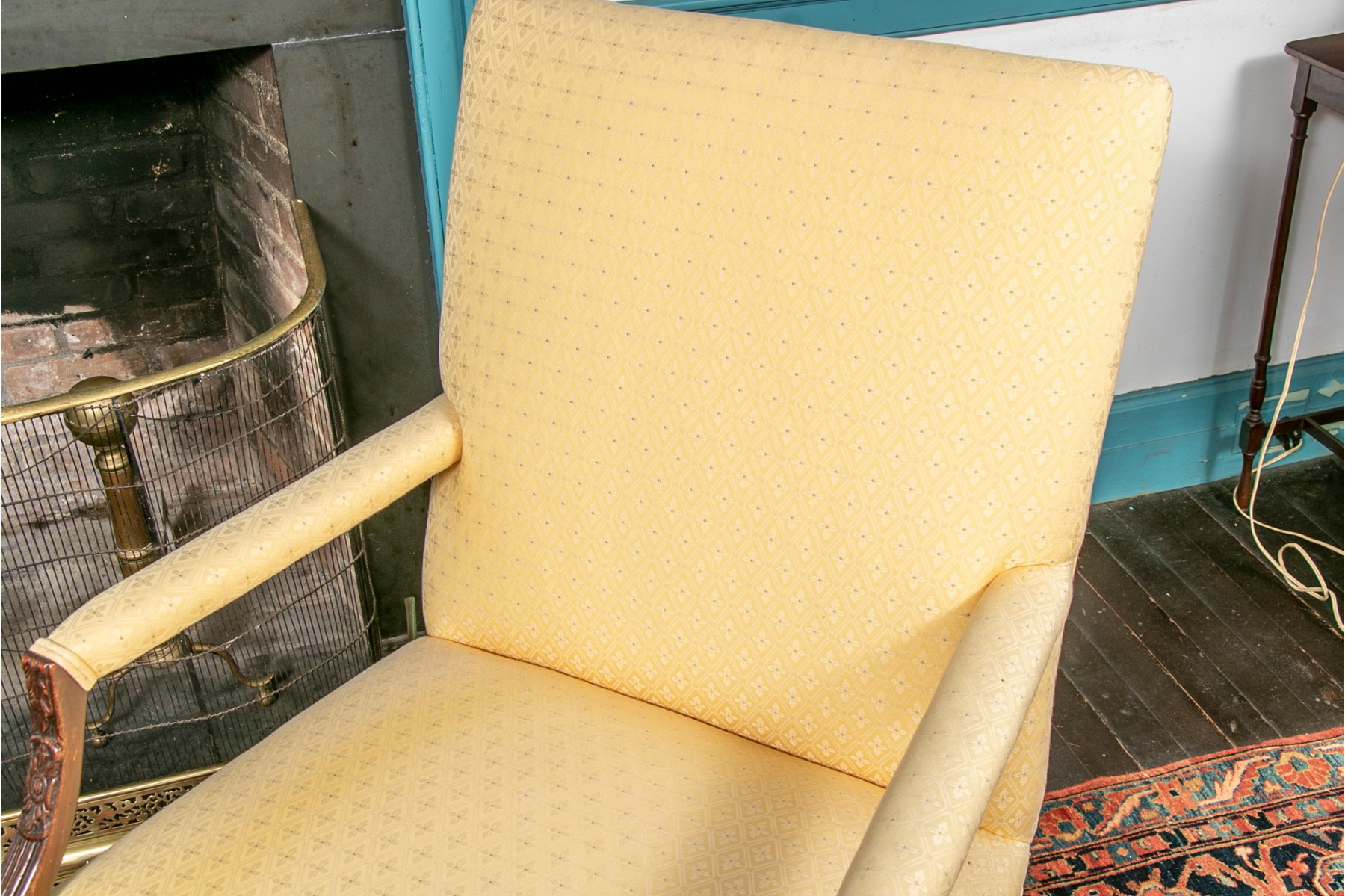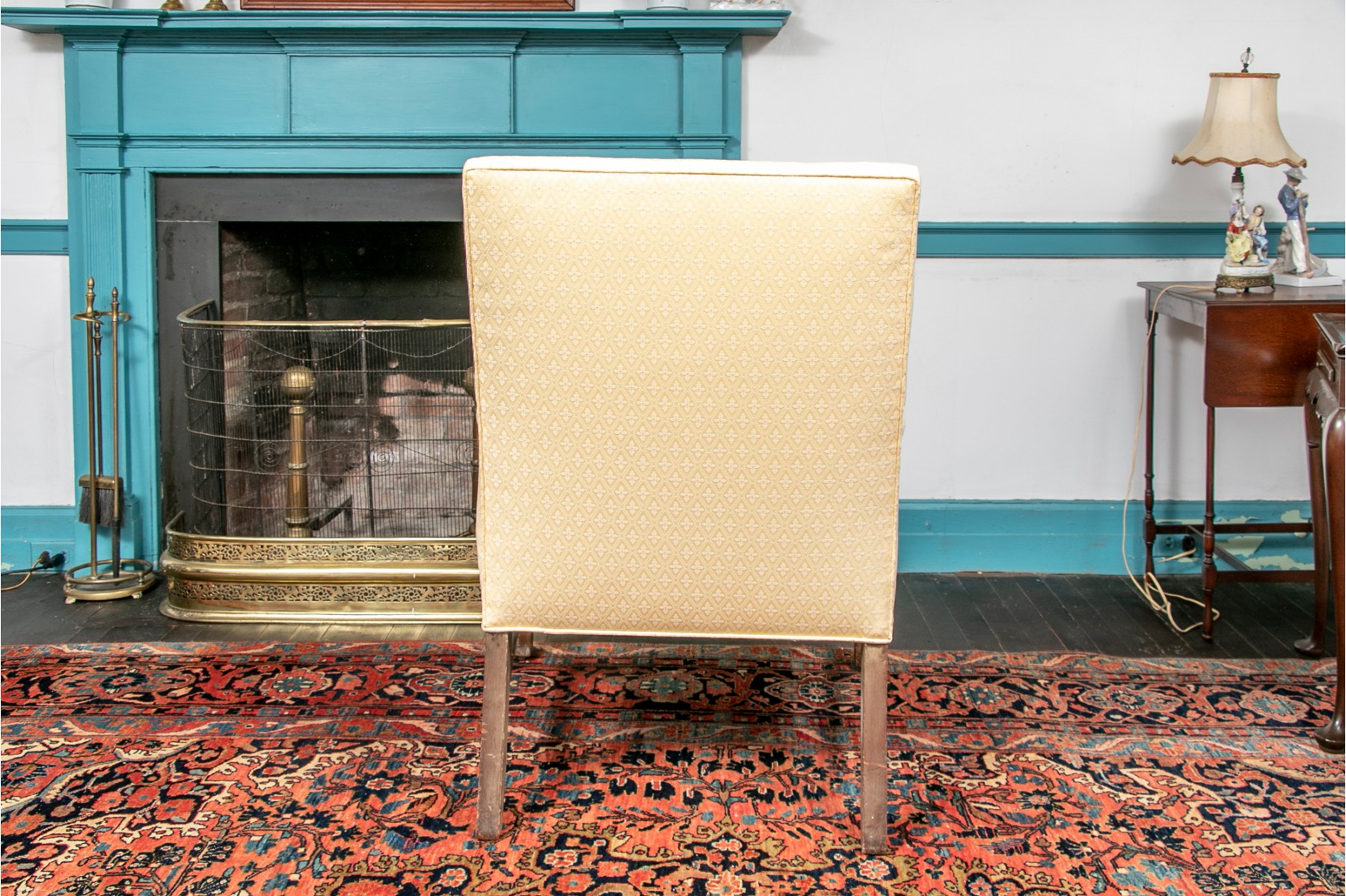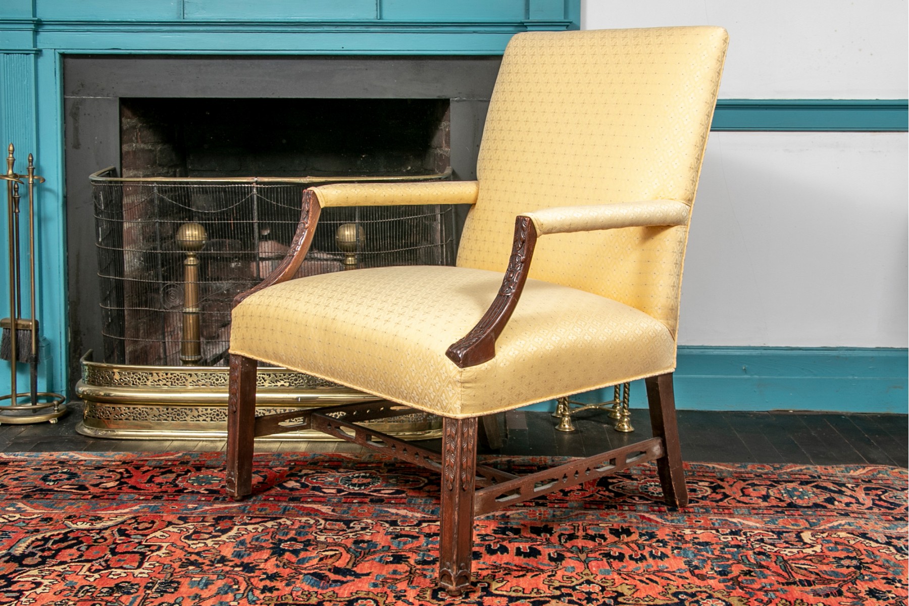 Vintage Chippendale style lounge chair with manchettes, square back, pierced H-form stretcher, carved frame. Covered in a tone-on-tone fabric.