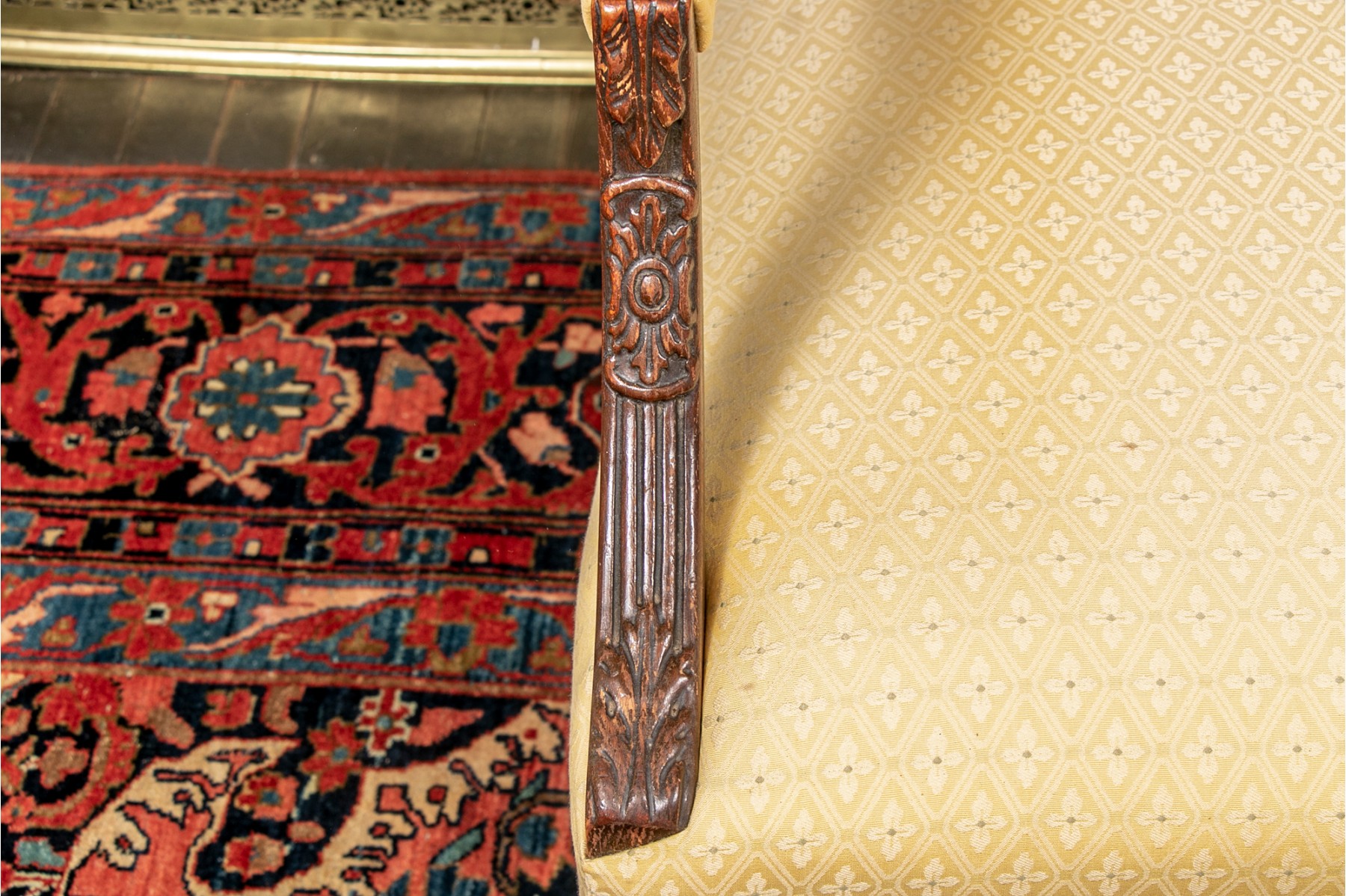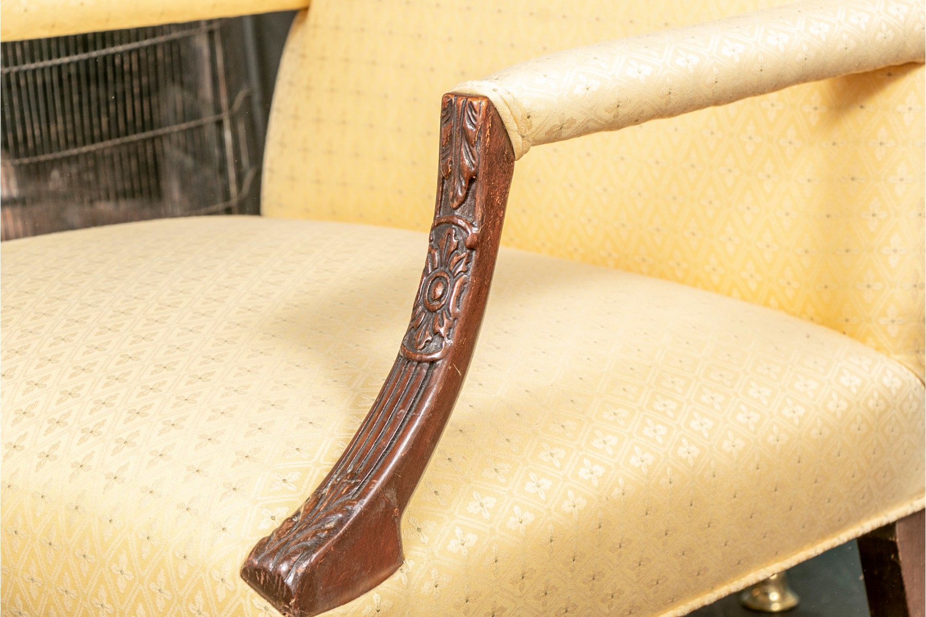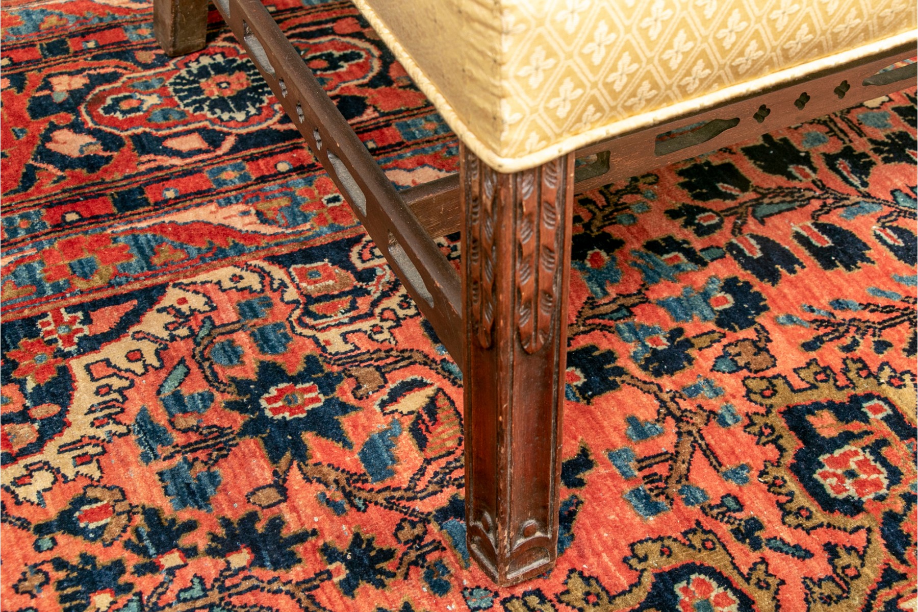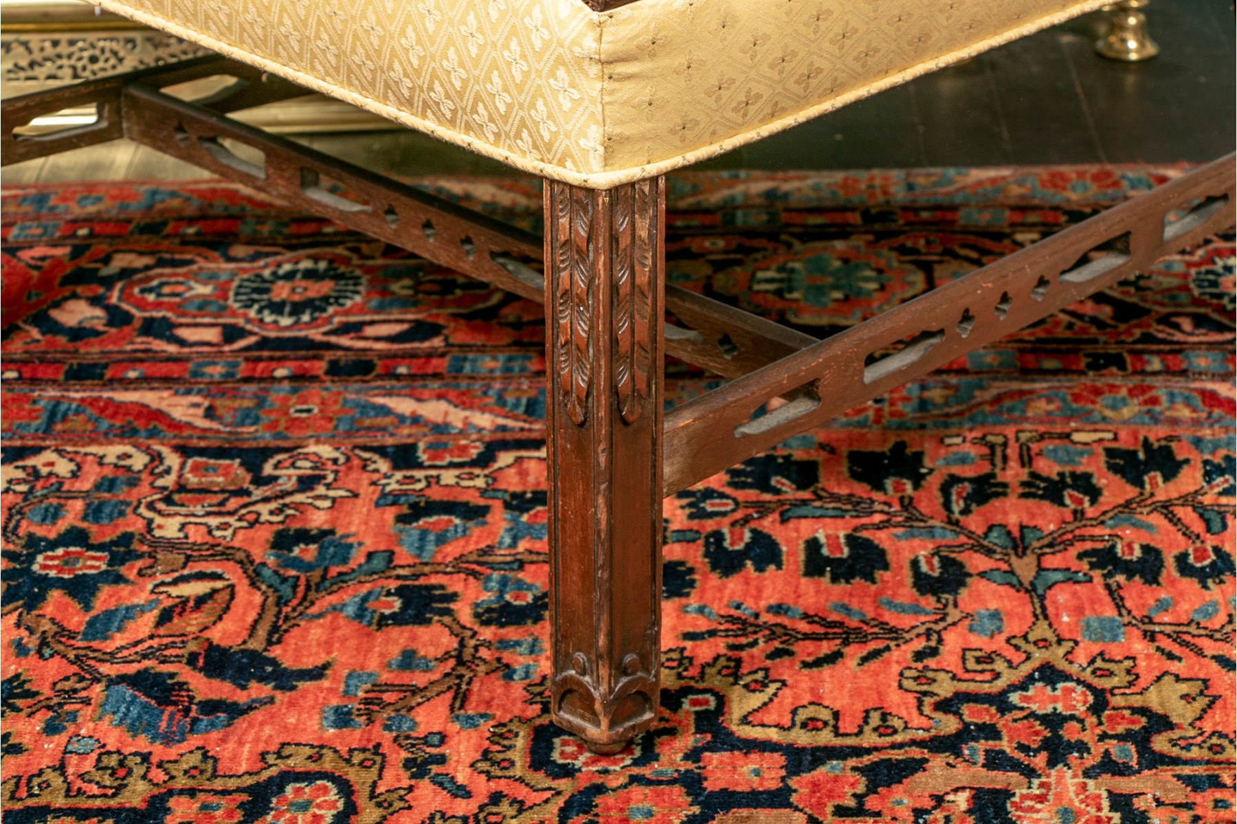 Vintage Chippendale style lounge chair with manchettes, square back, pierced H-form stretcher, carved frame. Covered in a tone-on-tone fabric.