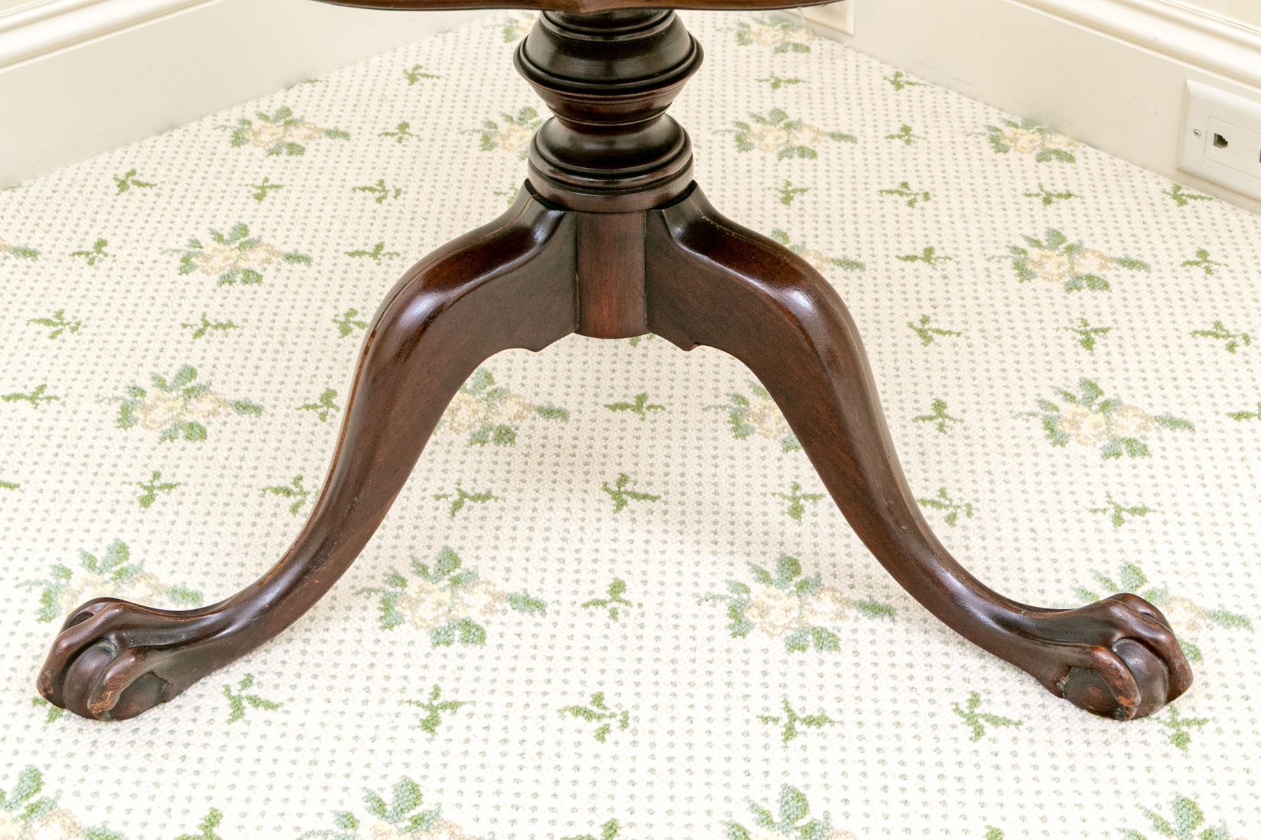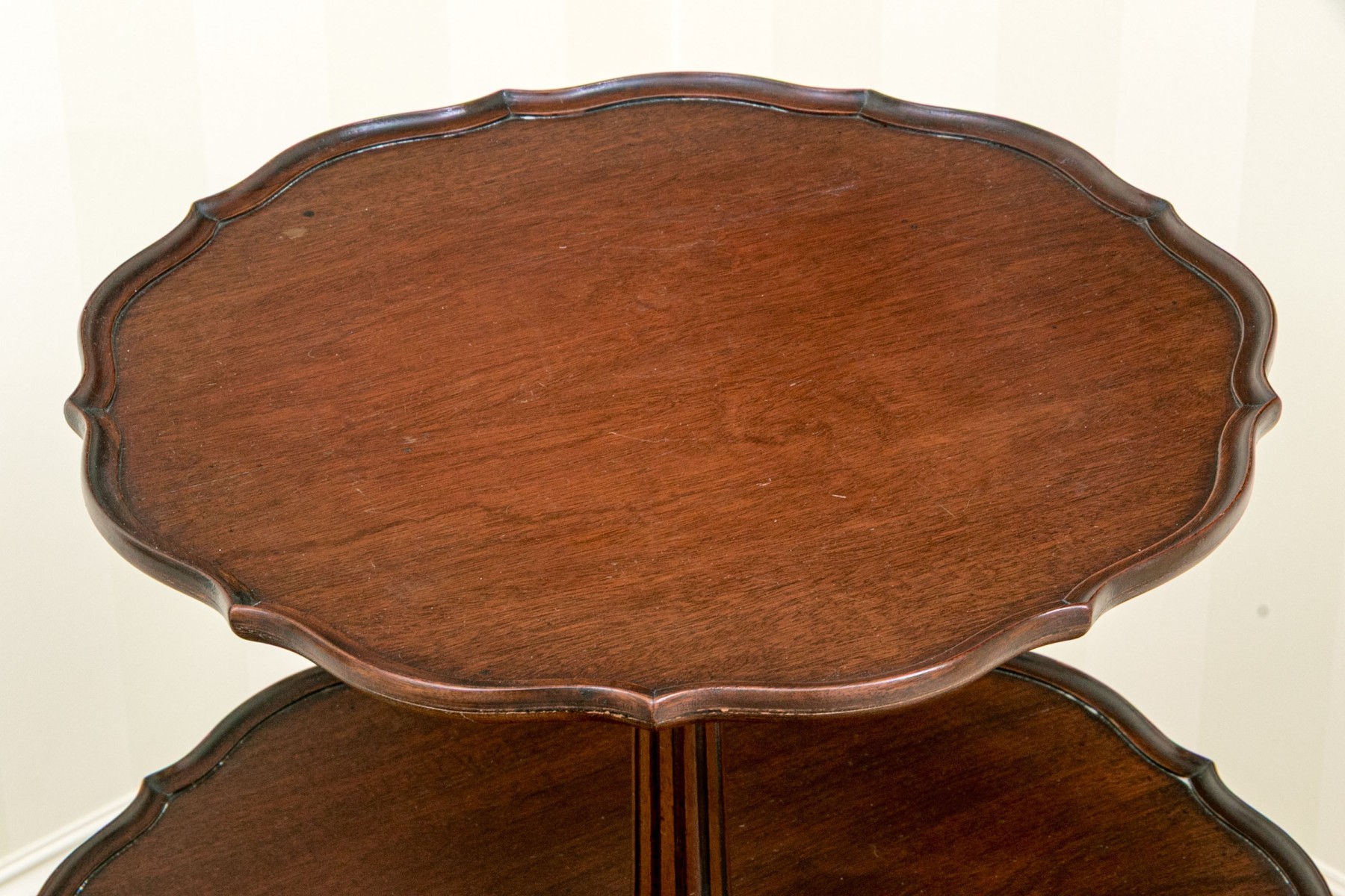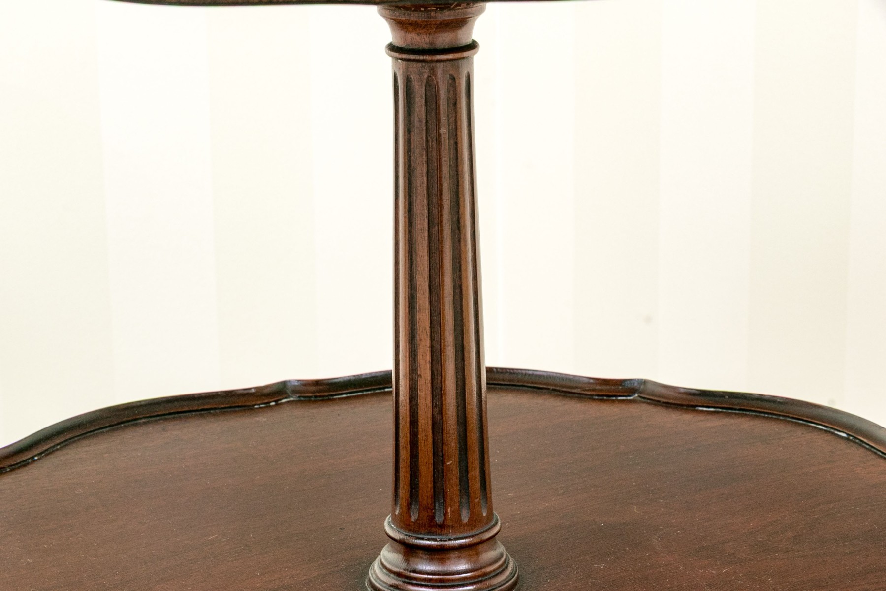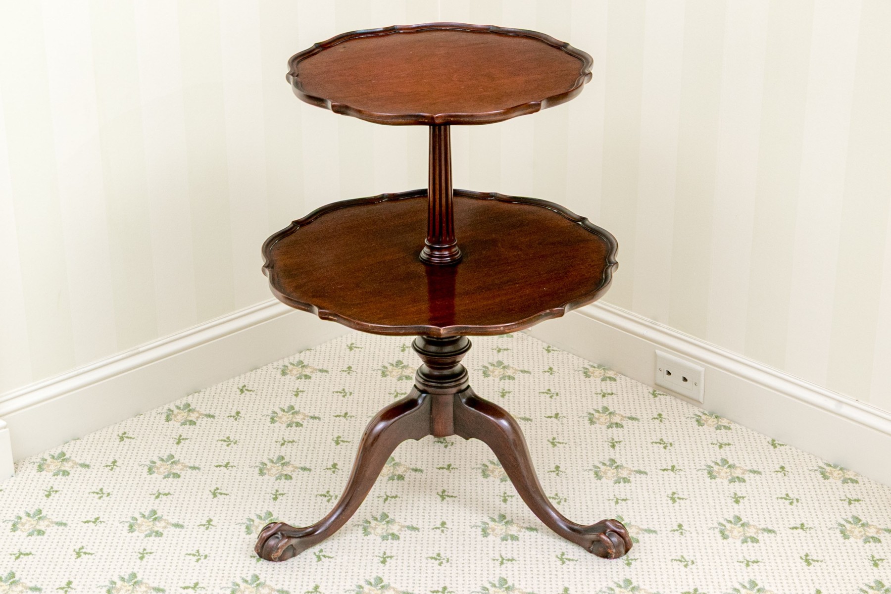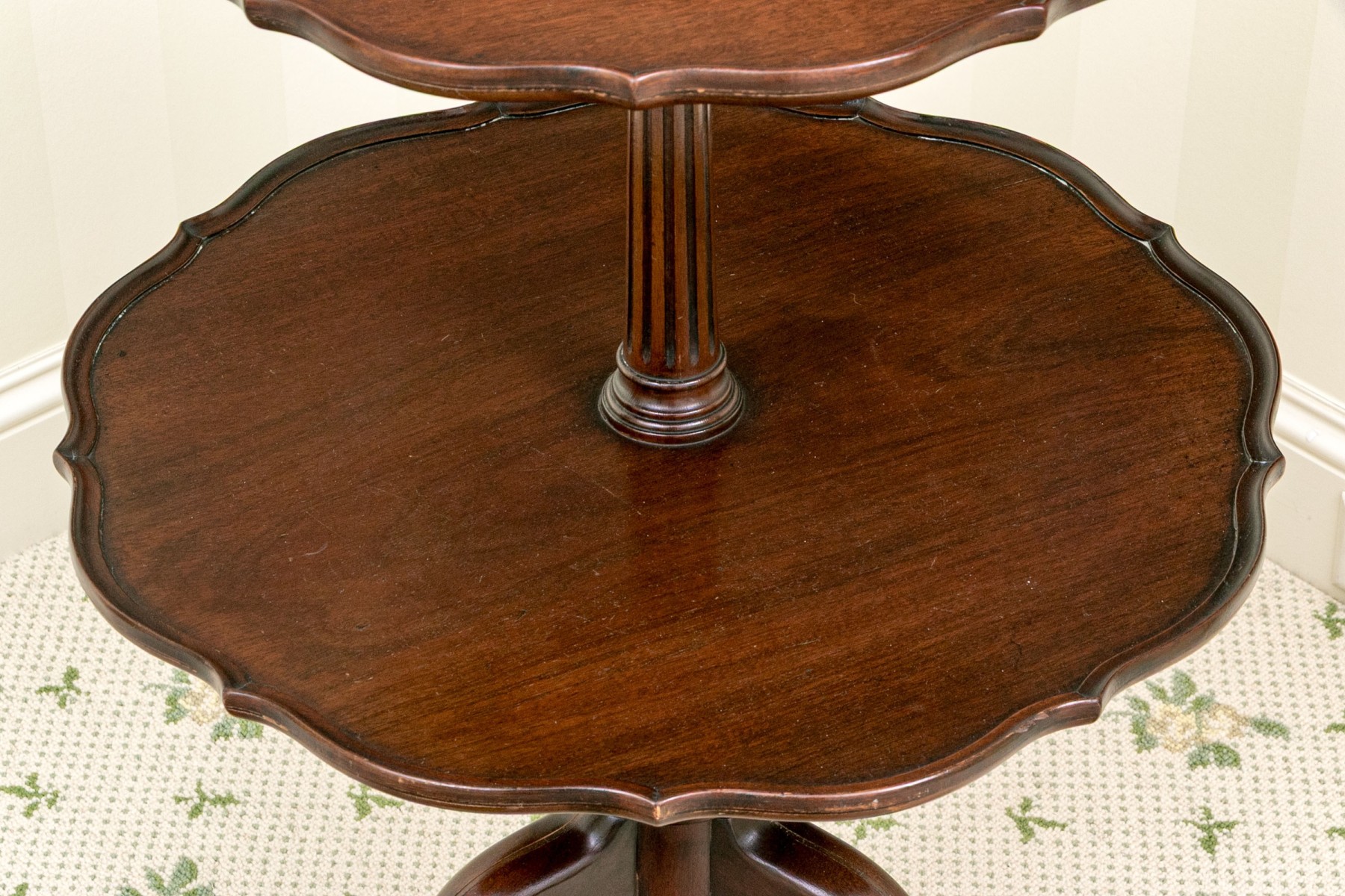 A charming vintage dumbwaiter in elegant Chippendale style, well crafted in rich, warm brown mahogany with two graduating circular tiers finished with shaped pie crust trims. Raised on a tapered and fluted column and detailed with classic cabriole legs terminating with ball and claw feet.