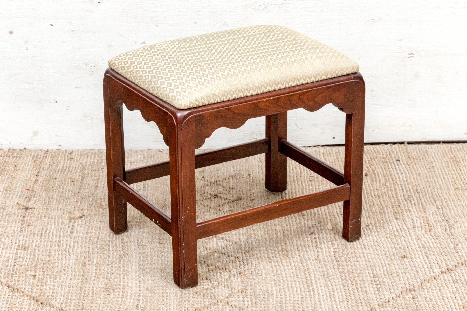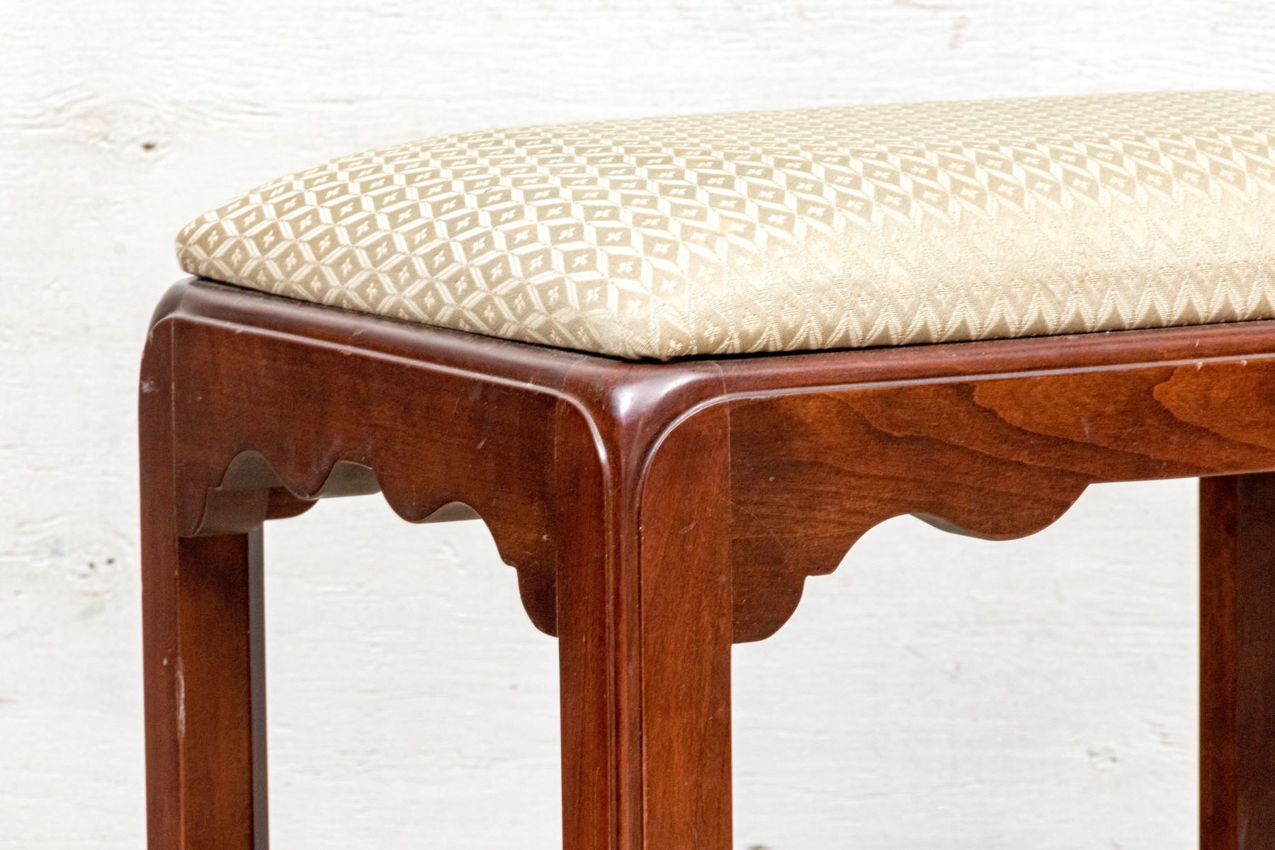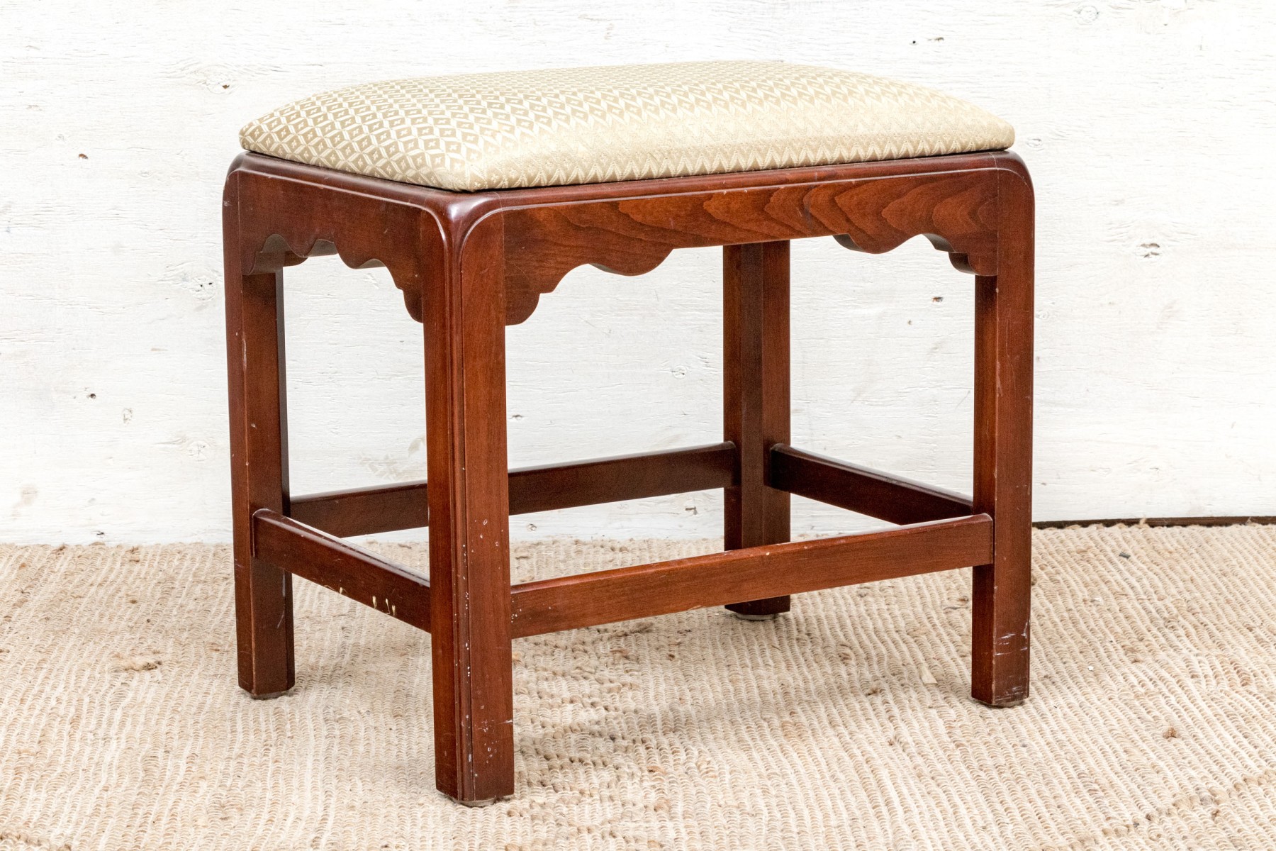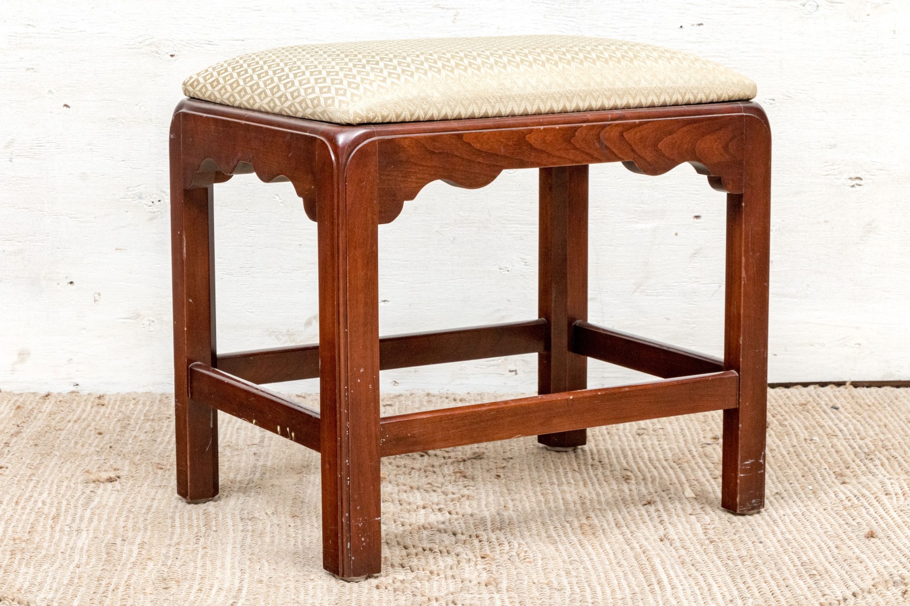 Fantastically carved and finished frame with scalloped base trim. With an upholstered seat cushion.