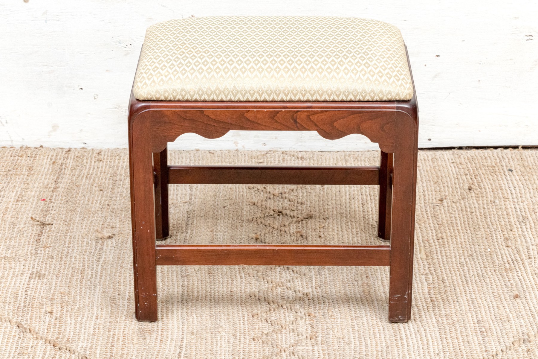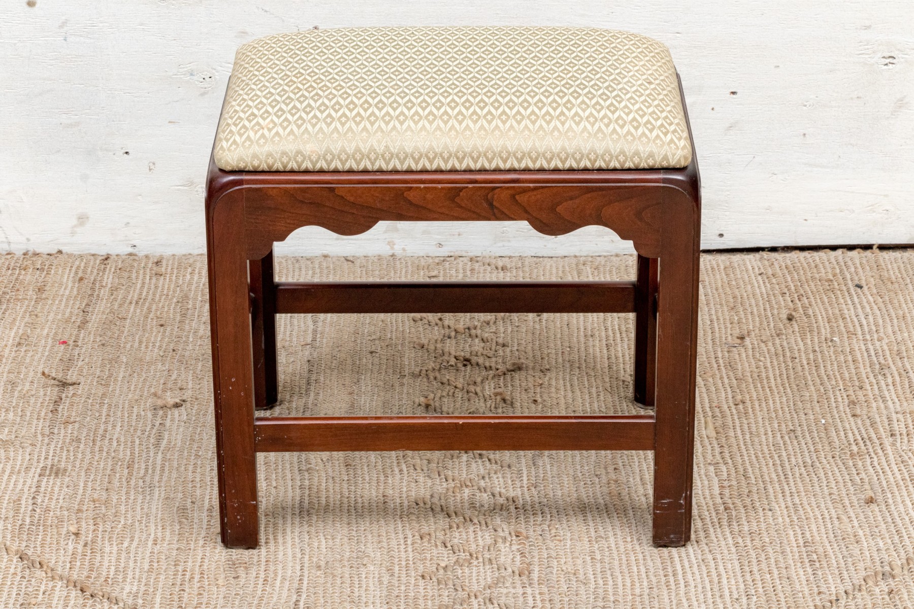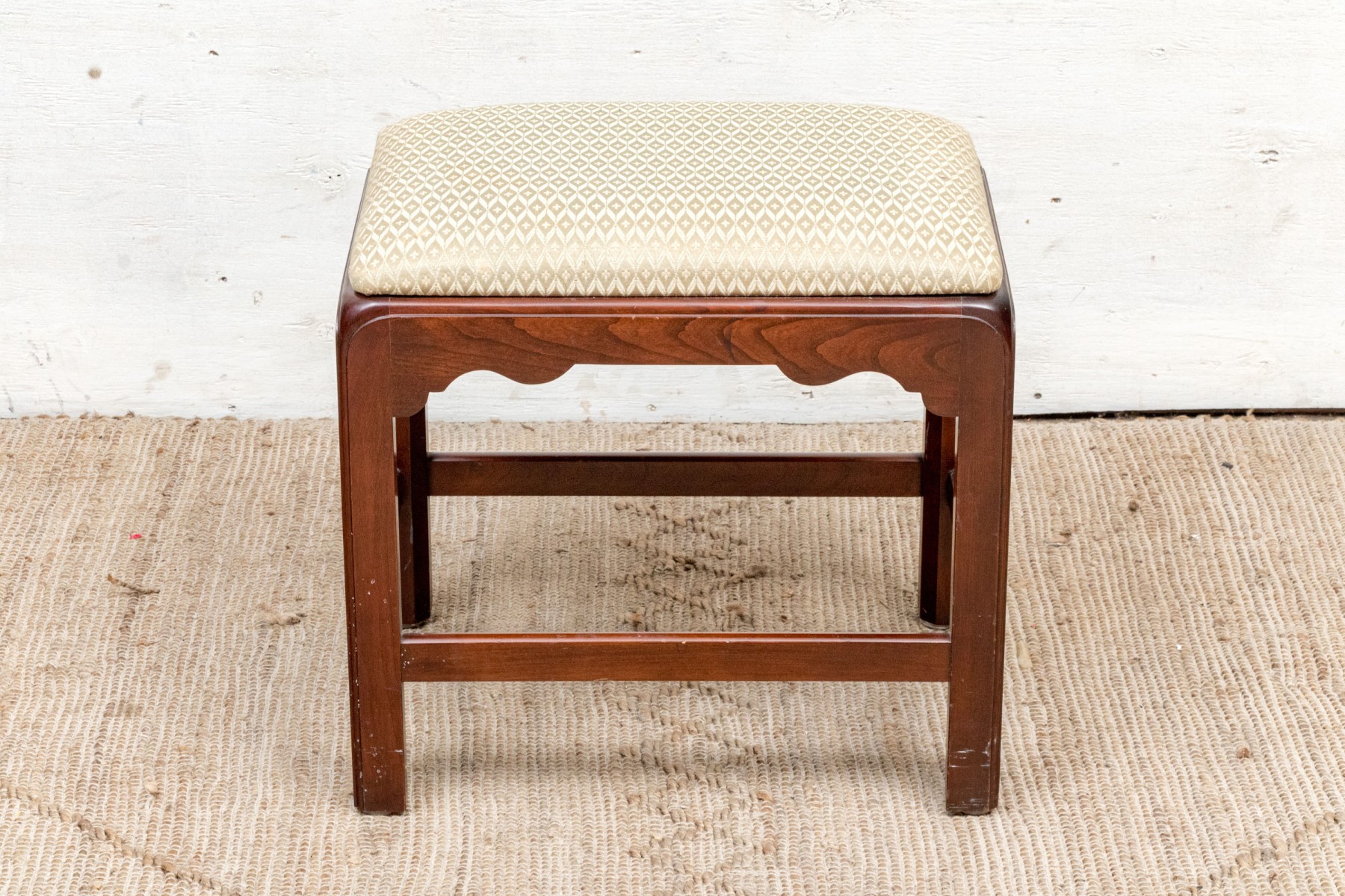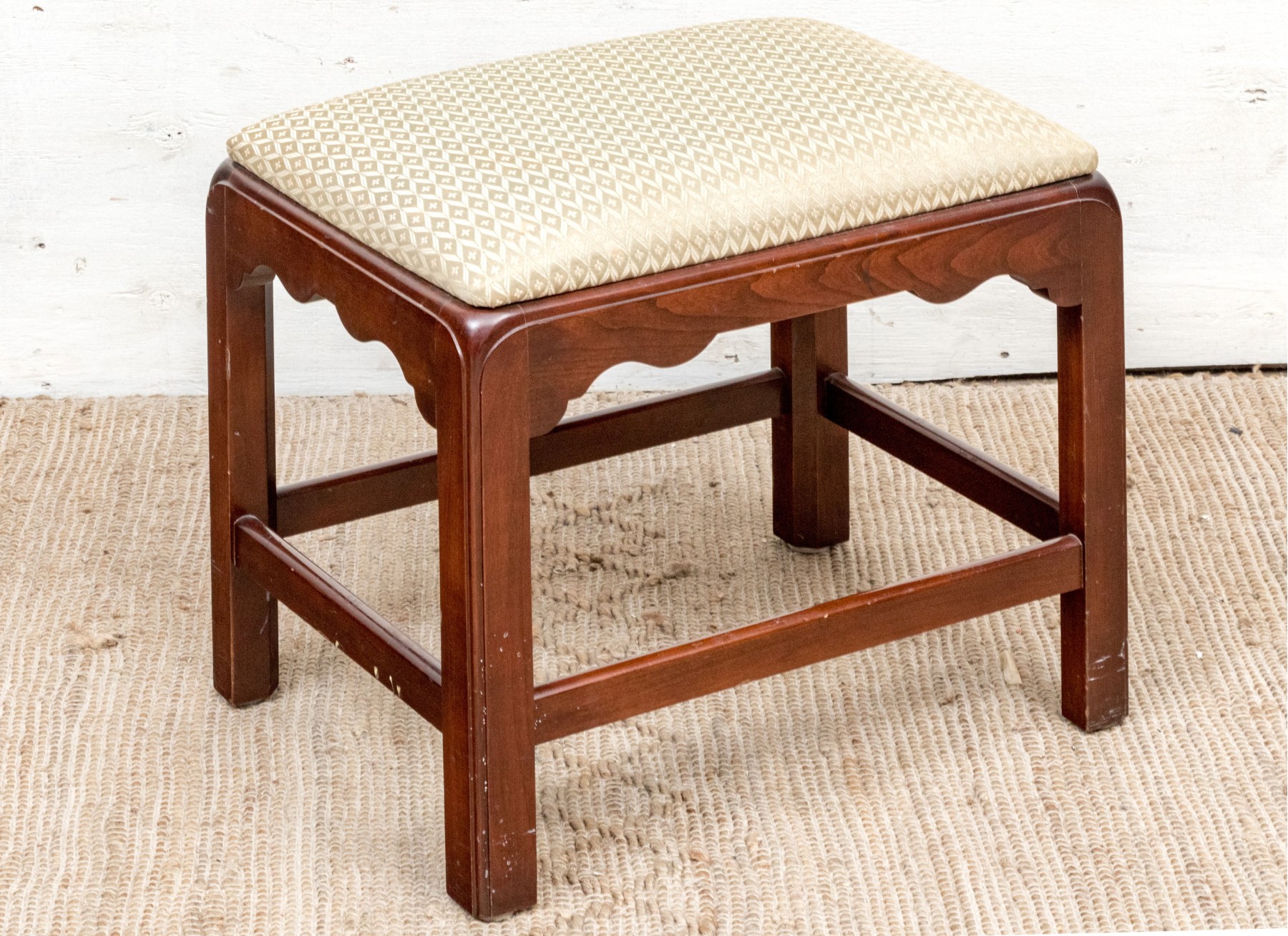 Fantastically carved and finished frame with scalloped base trim. With an upholstered seat cushion.