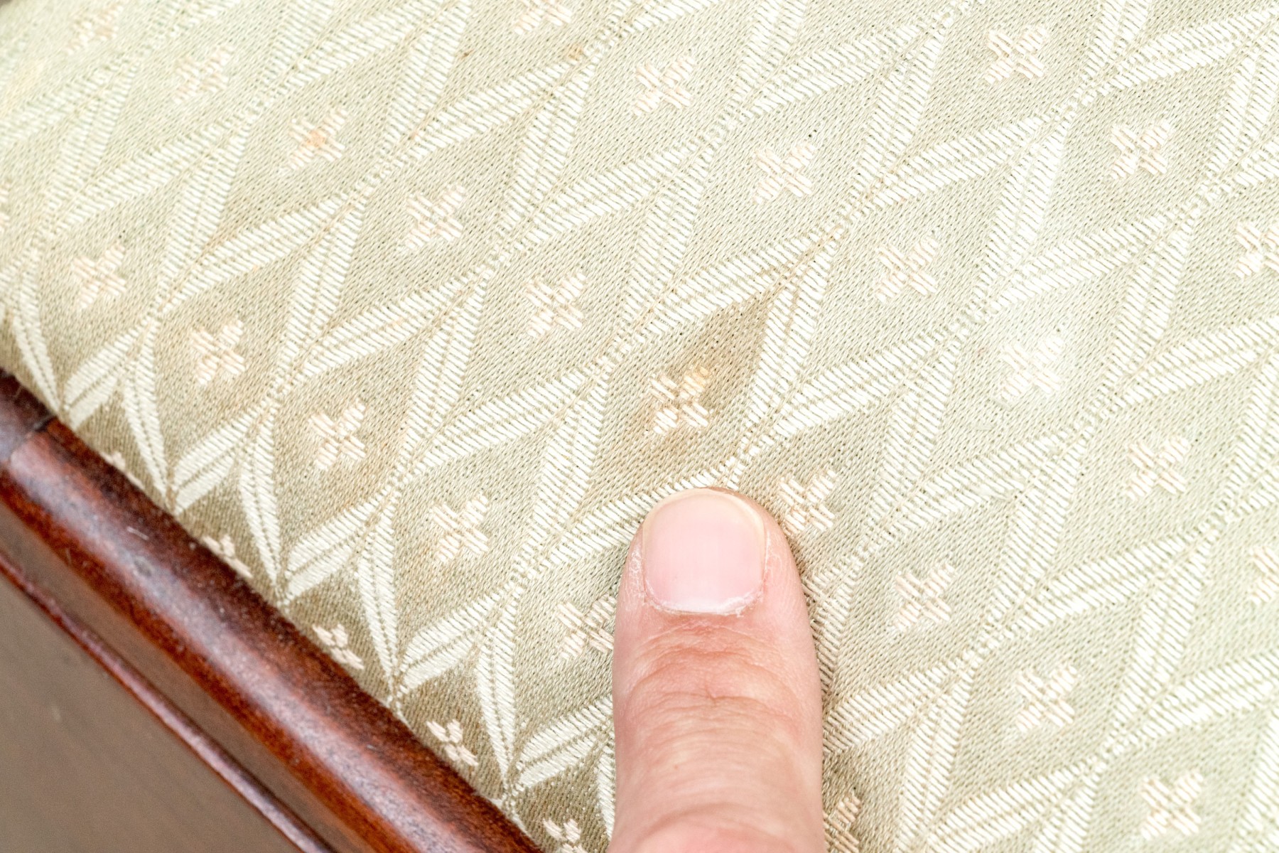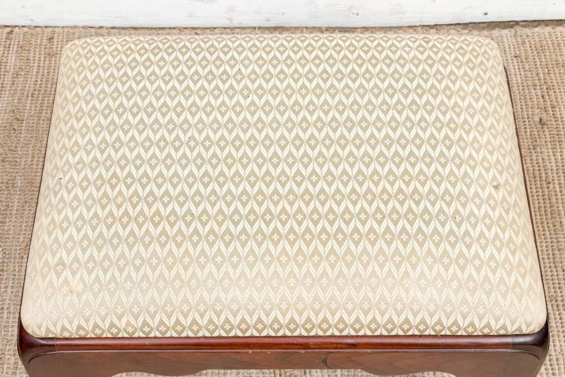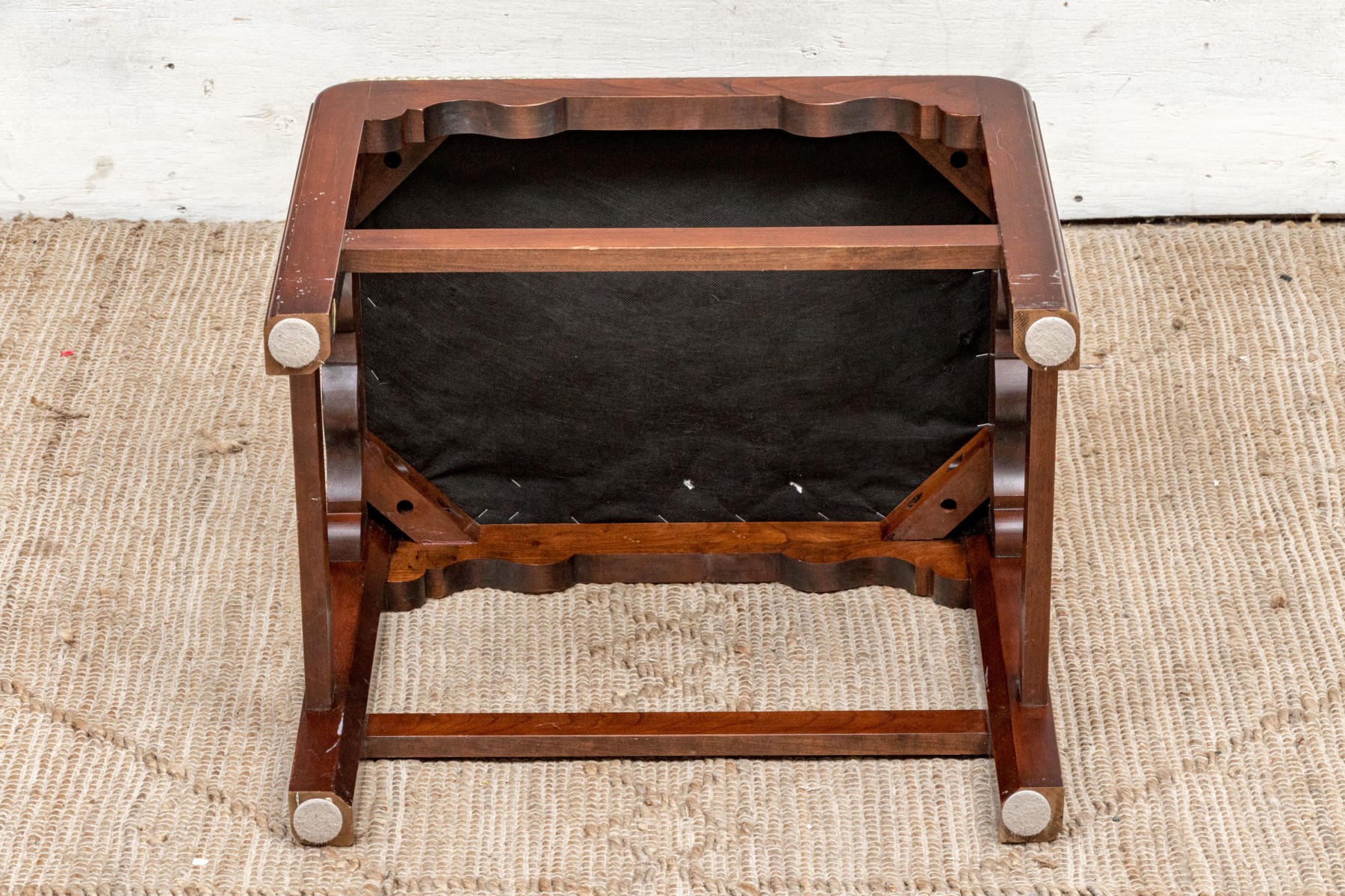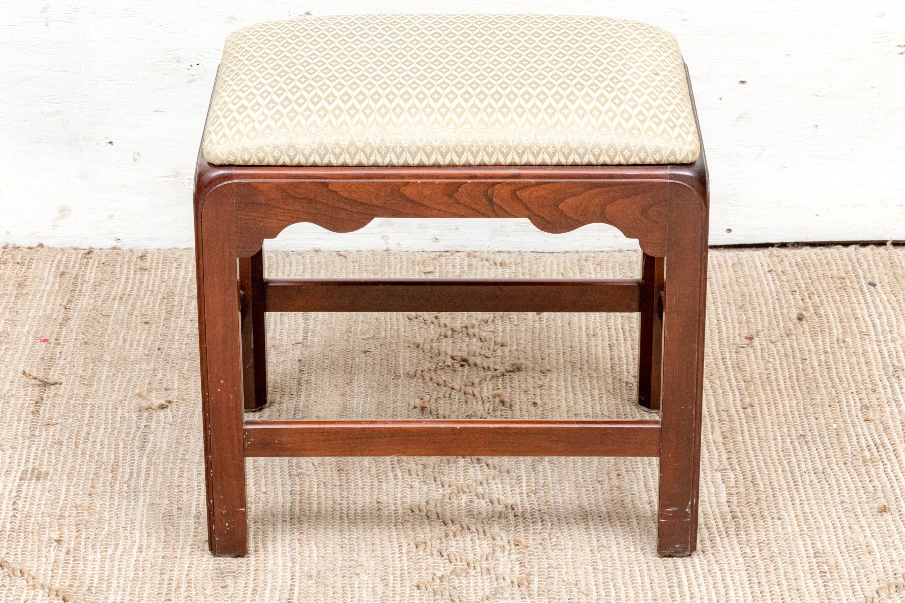 Fantastically carved and finished frame with scalloped base trim. With an upholstered seat cushion.