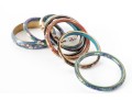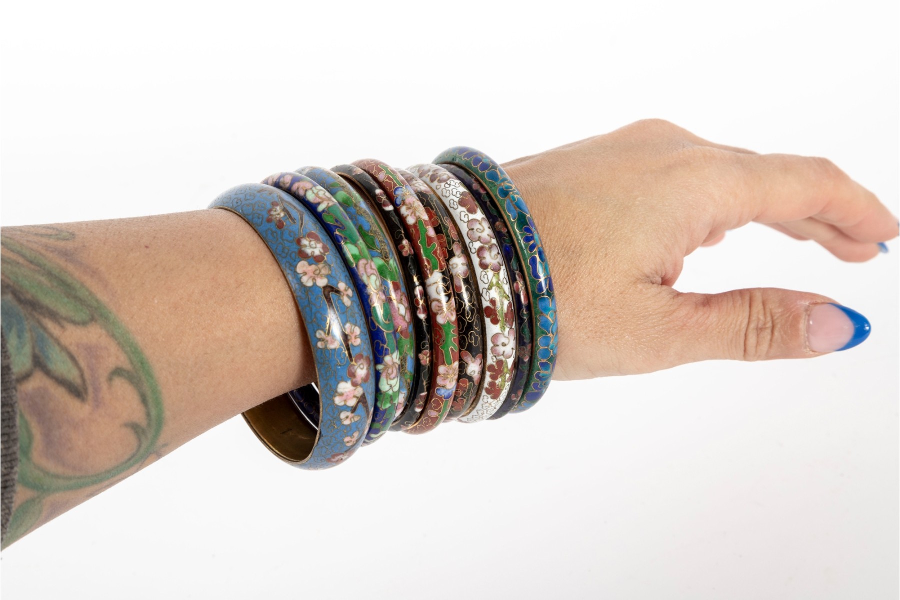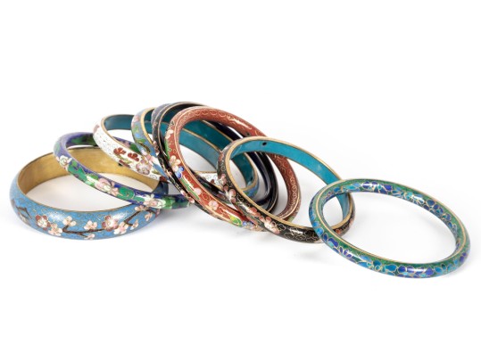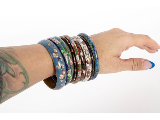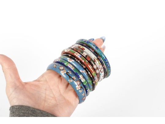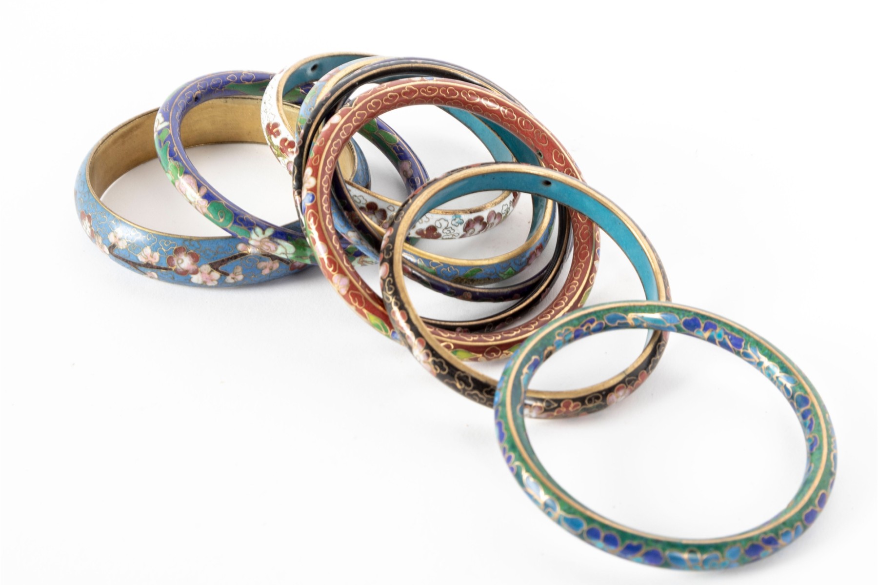 Nine unique Chinese cloisonne on brass bangles, each featuring intricate designs and varied enamel colors for mixing and matching.