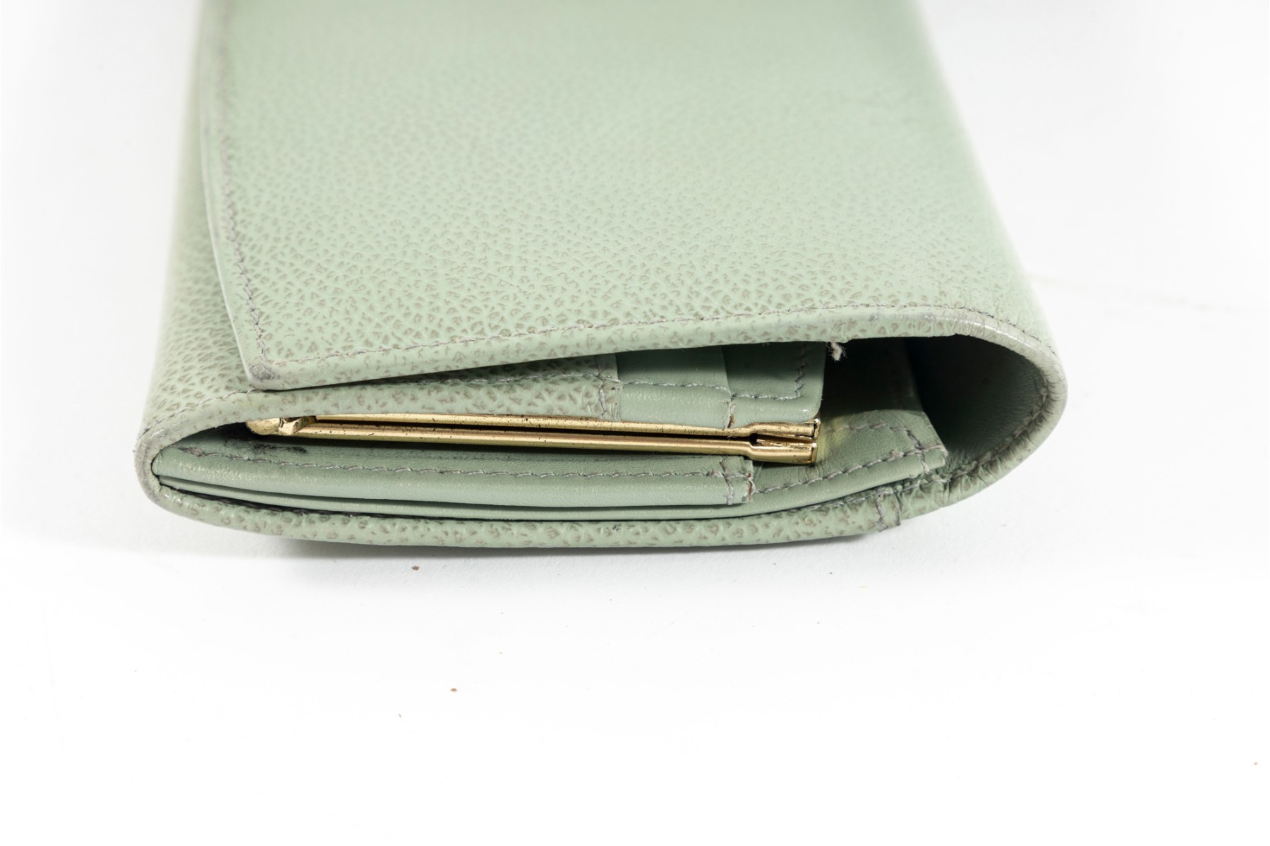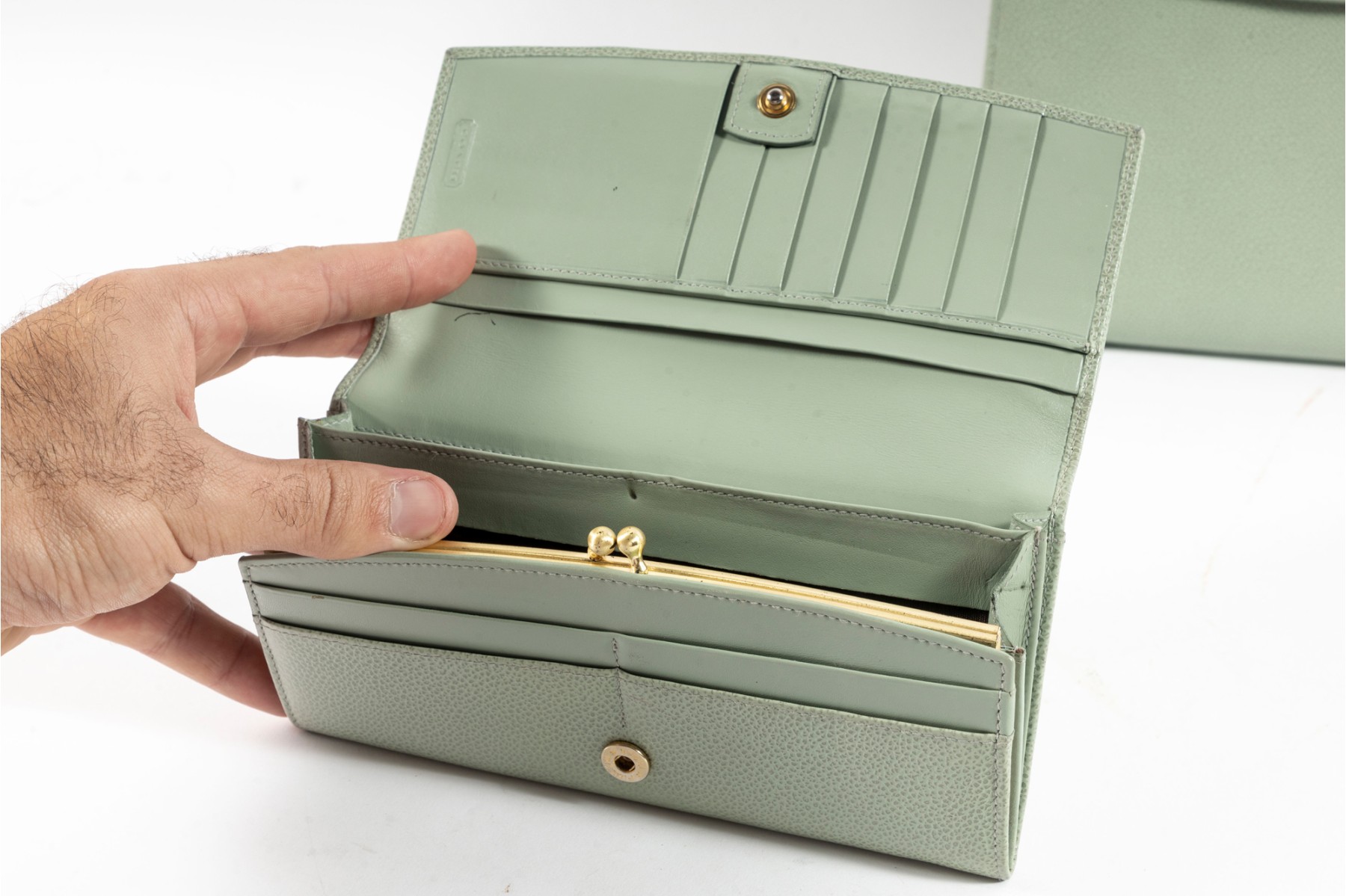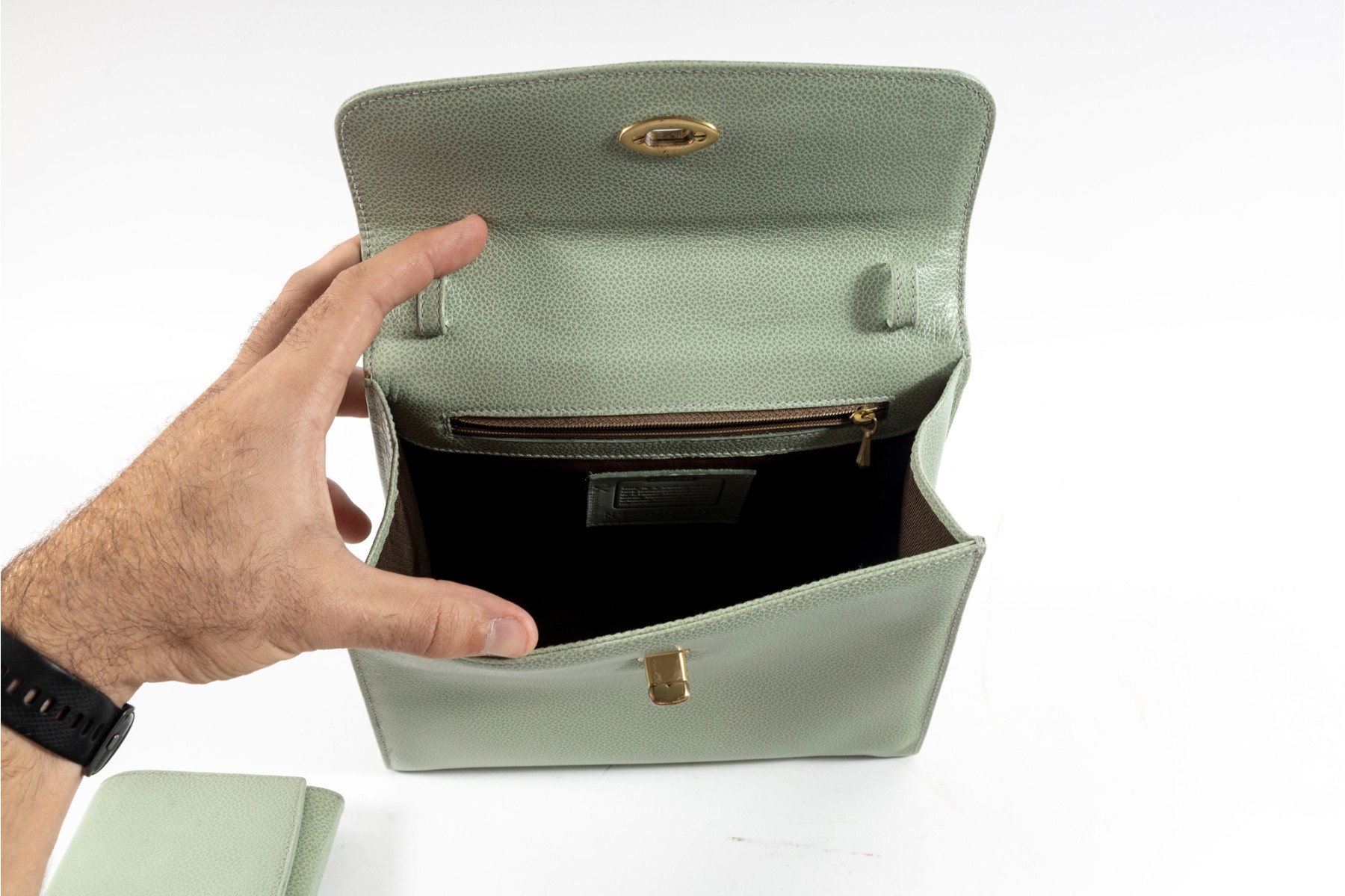 This vintage Coach Madison Biltmore bag & wallet combo sports the rare celadon coloration over genuine caviar leather with spacious interior compartments for everyday travel and events. Made in Italy. Includes original adjustable bag shoulder strap.