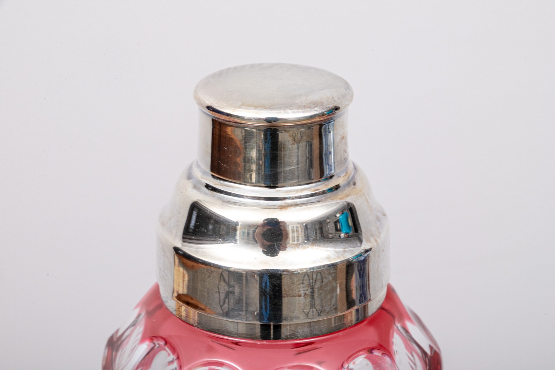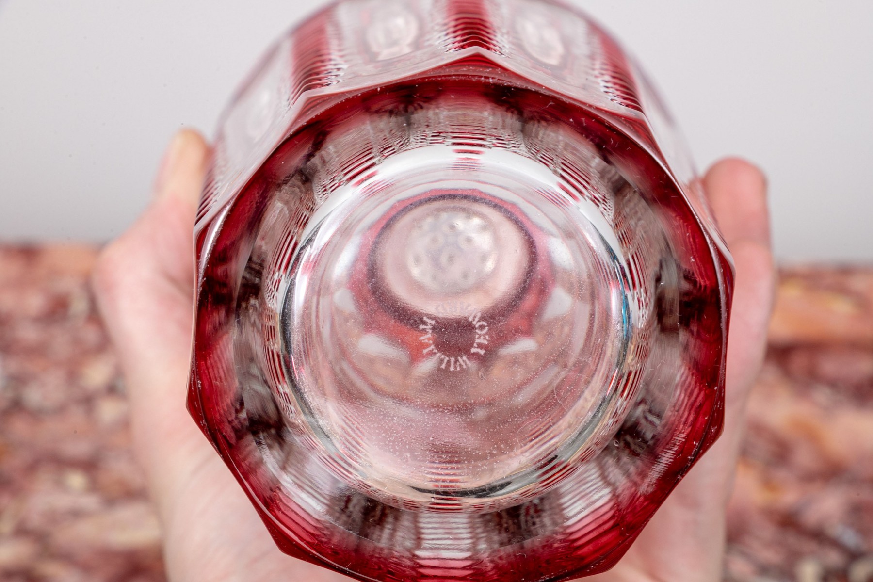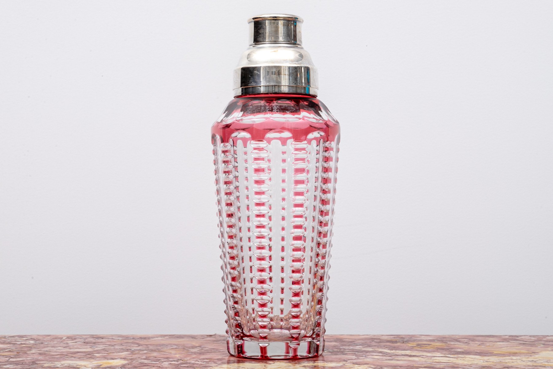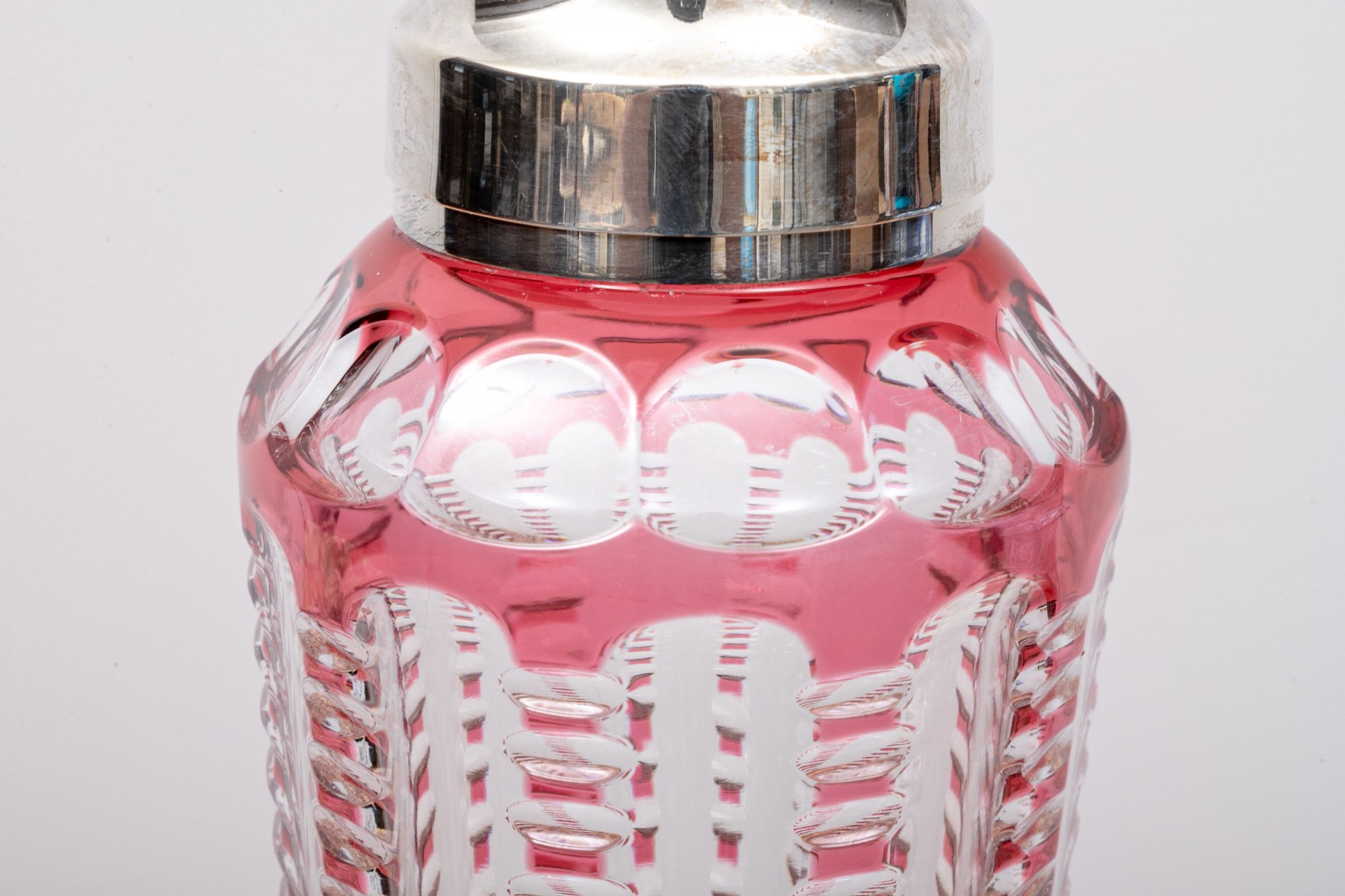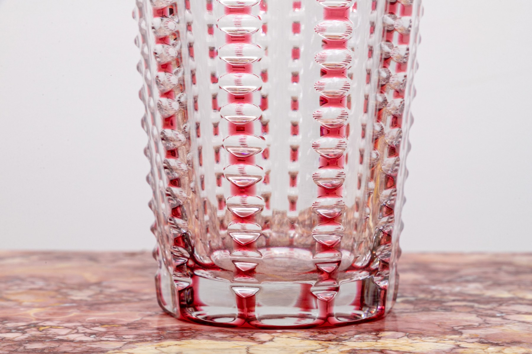 Pink on clear with a thumb print shoulder and faceted sides with ribbed bands.