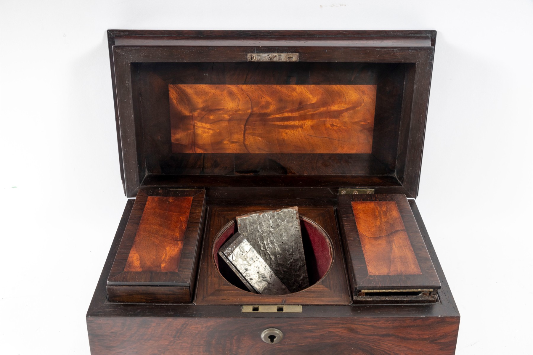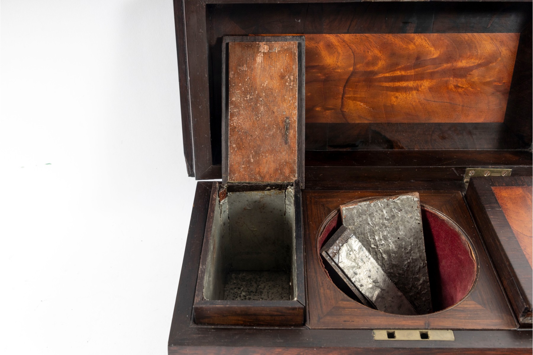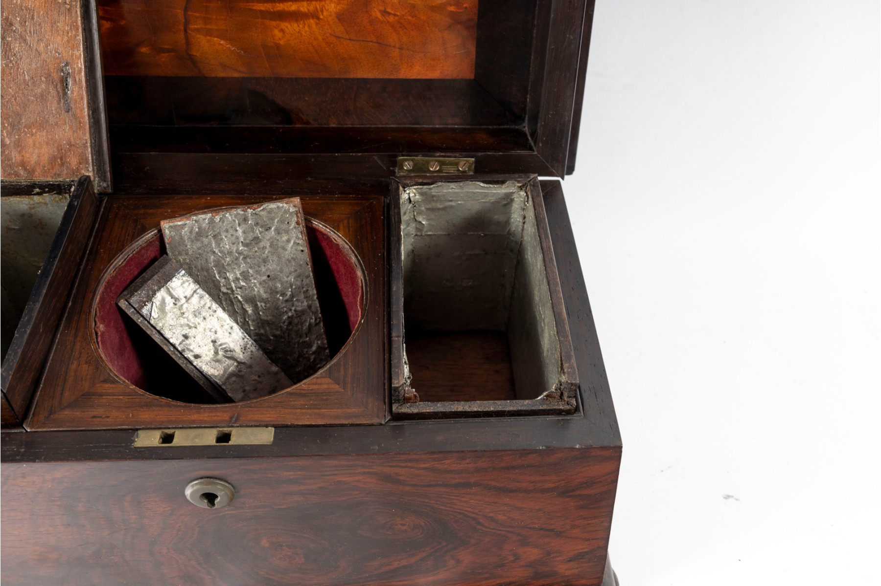 Checking to veneeers. Large losses to interior wood trim and tea dividers. A single foot is detached but provided inside along with other loose trim pieces. Overall consistent with age, see photos for details.