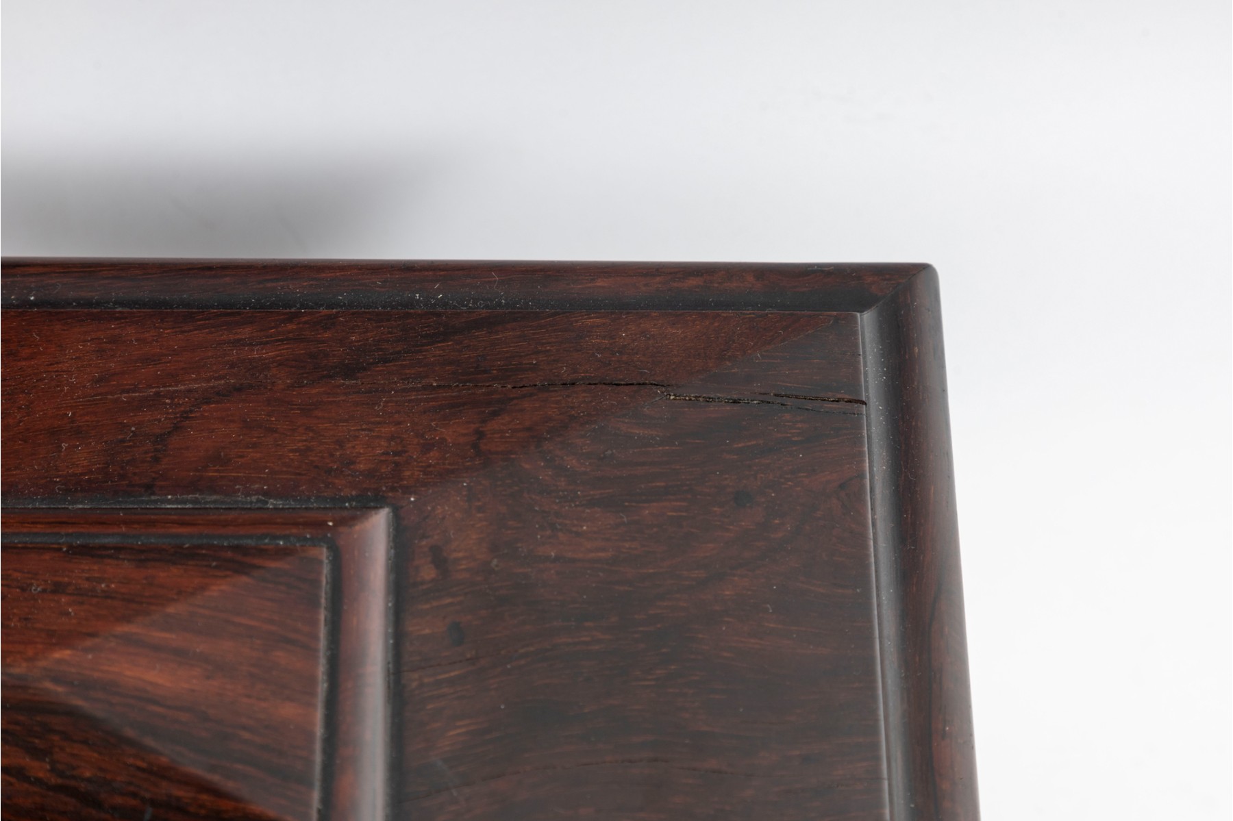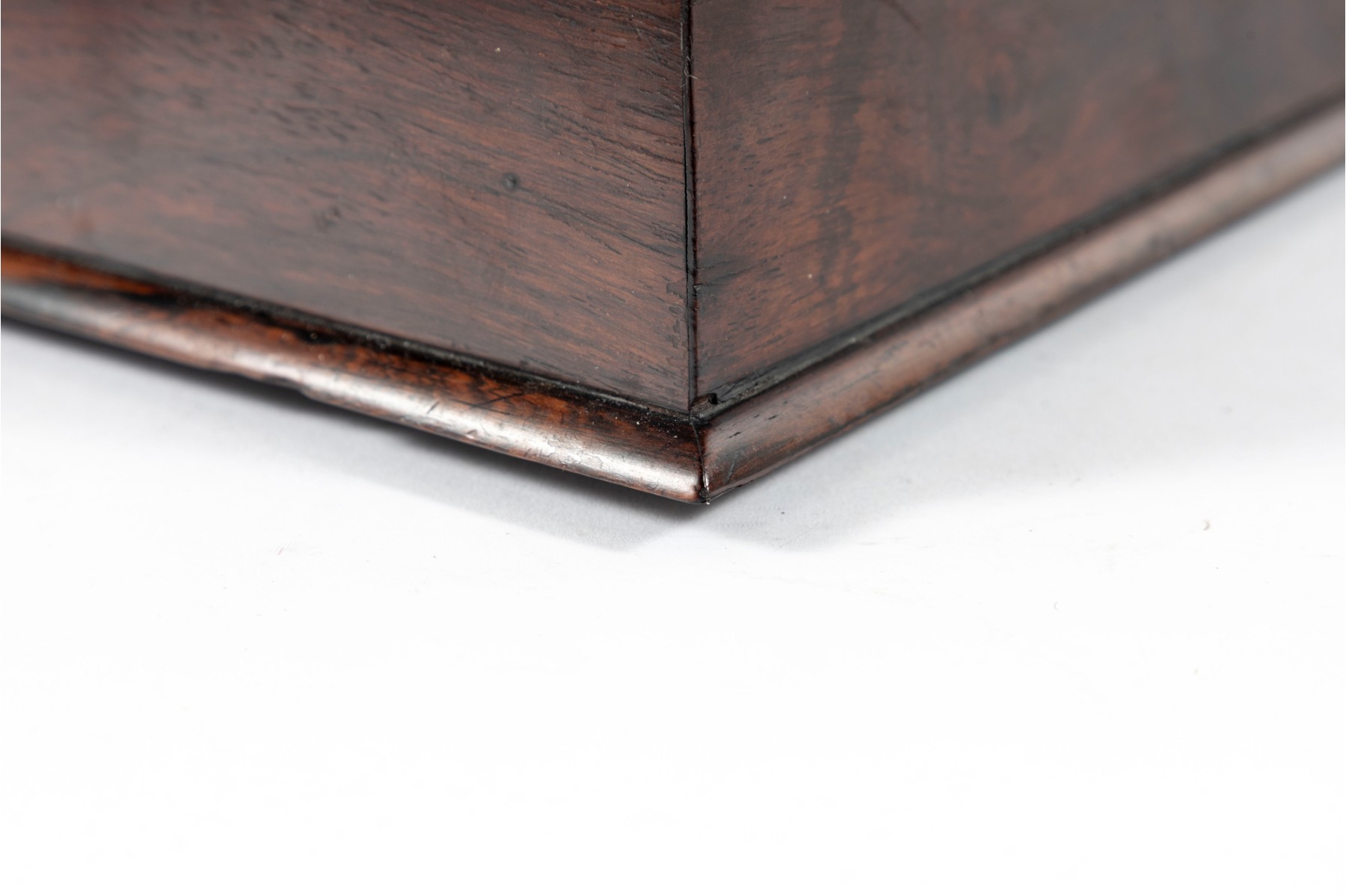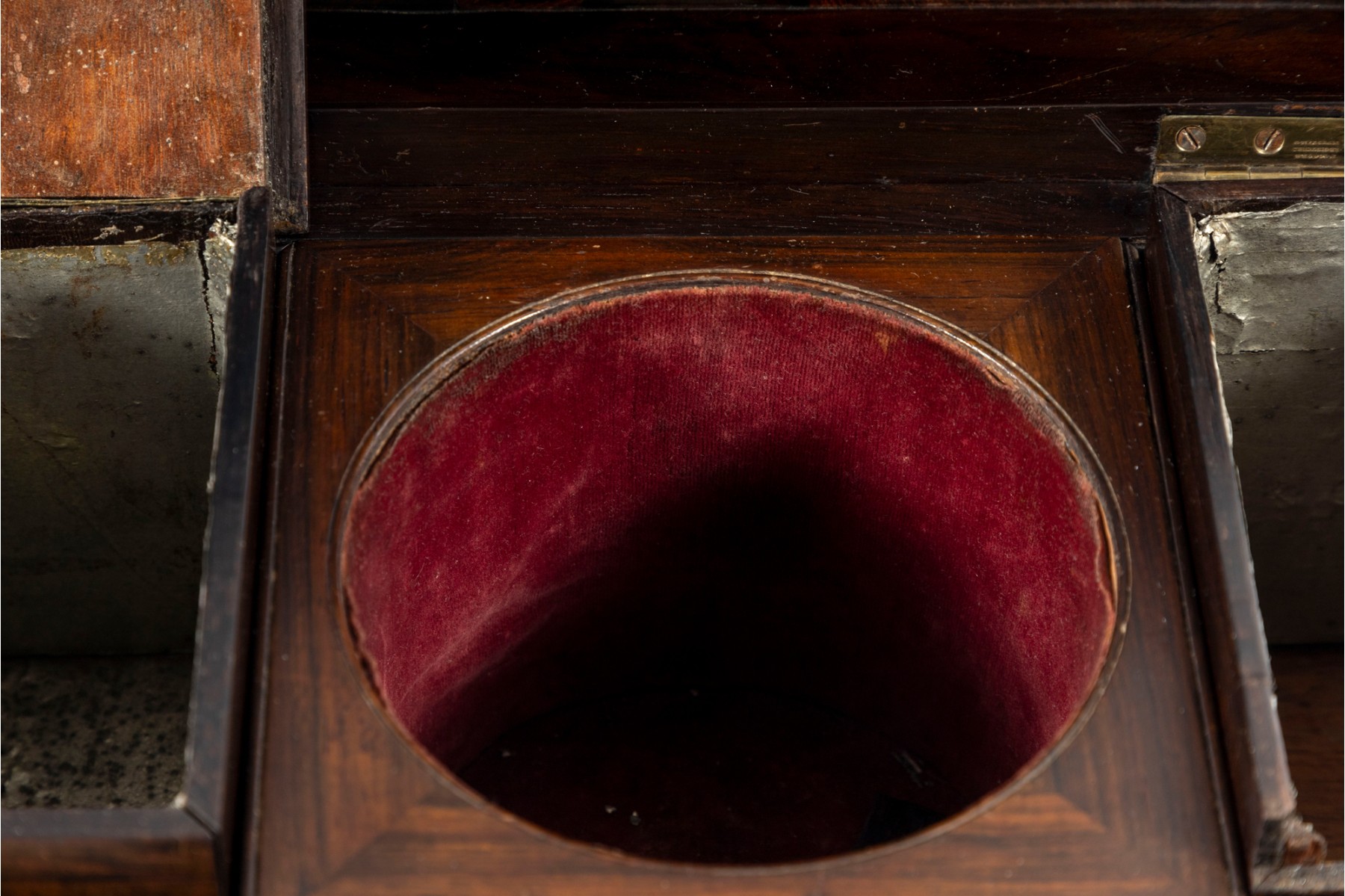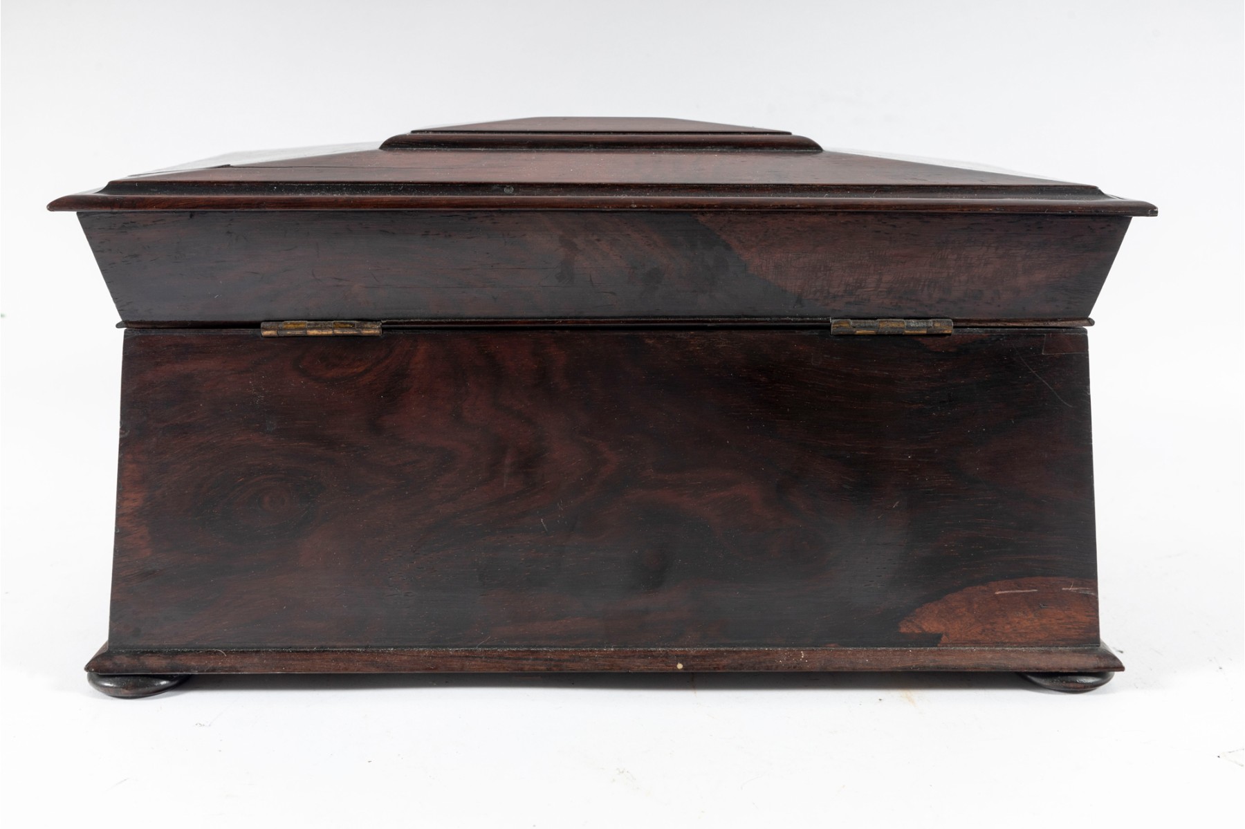 Checking to veneeers. Large losses to interior wood trim and tea dividers. A single foot is detached but provided inside along with other loose trim pieces. Overall consistent with age, see photos for details.