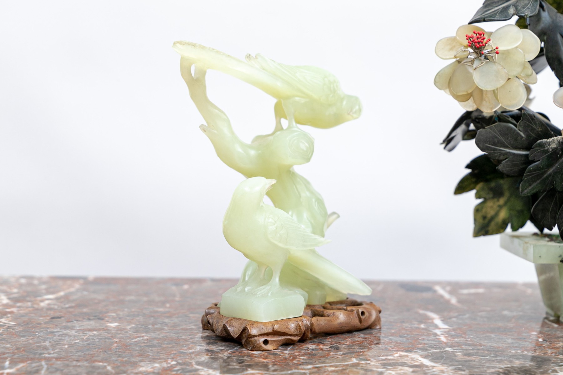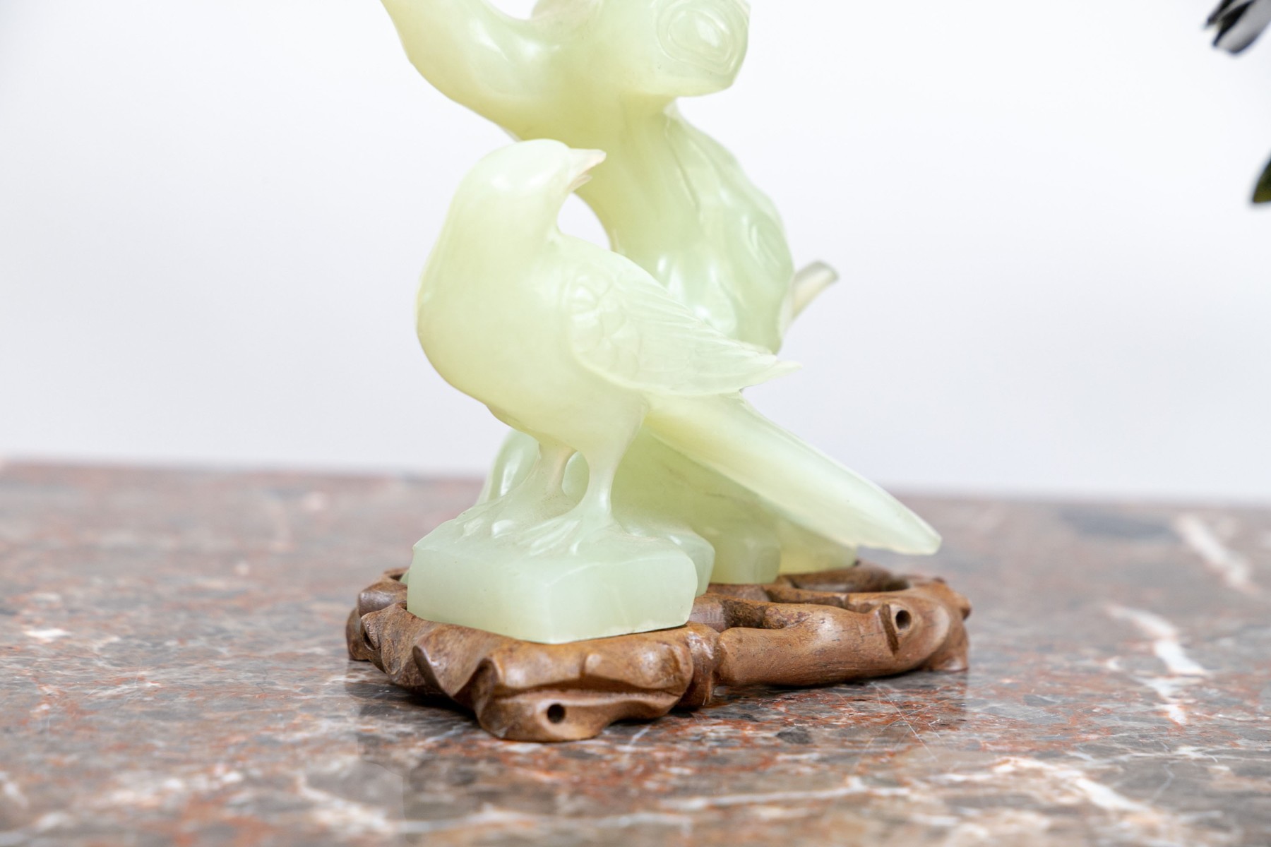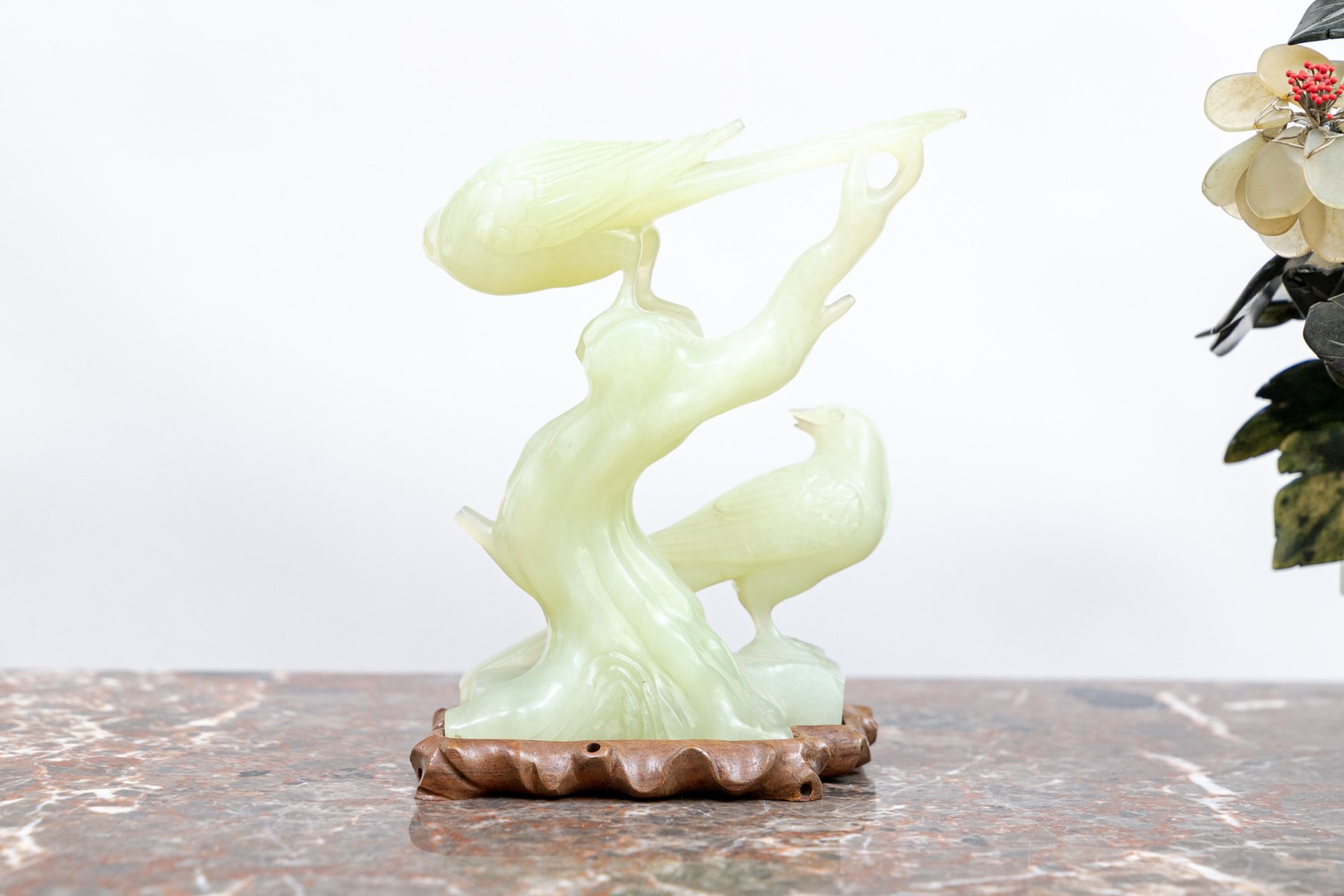 - 1 Chinese carved stone sculpture with two birds, one perched in a tree. Standing on wood stand.