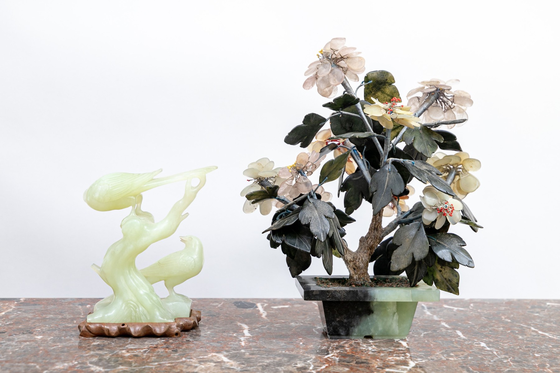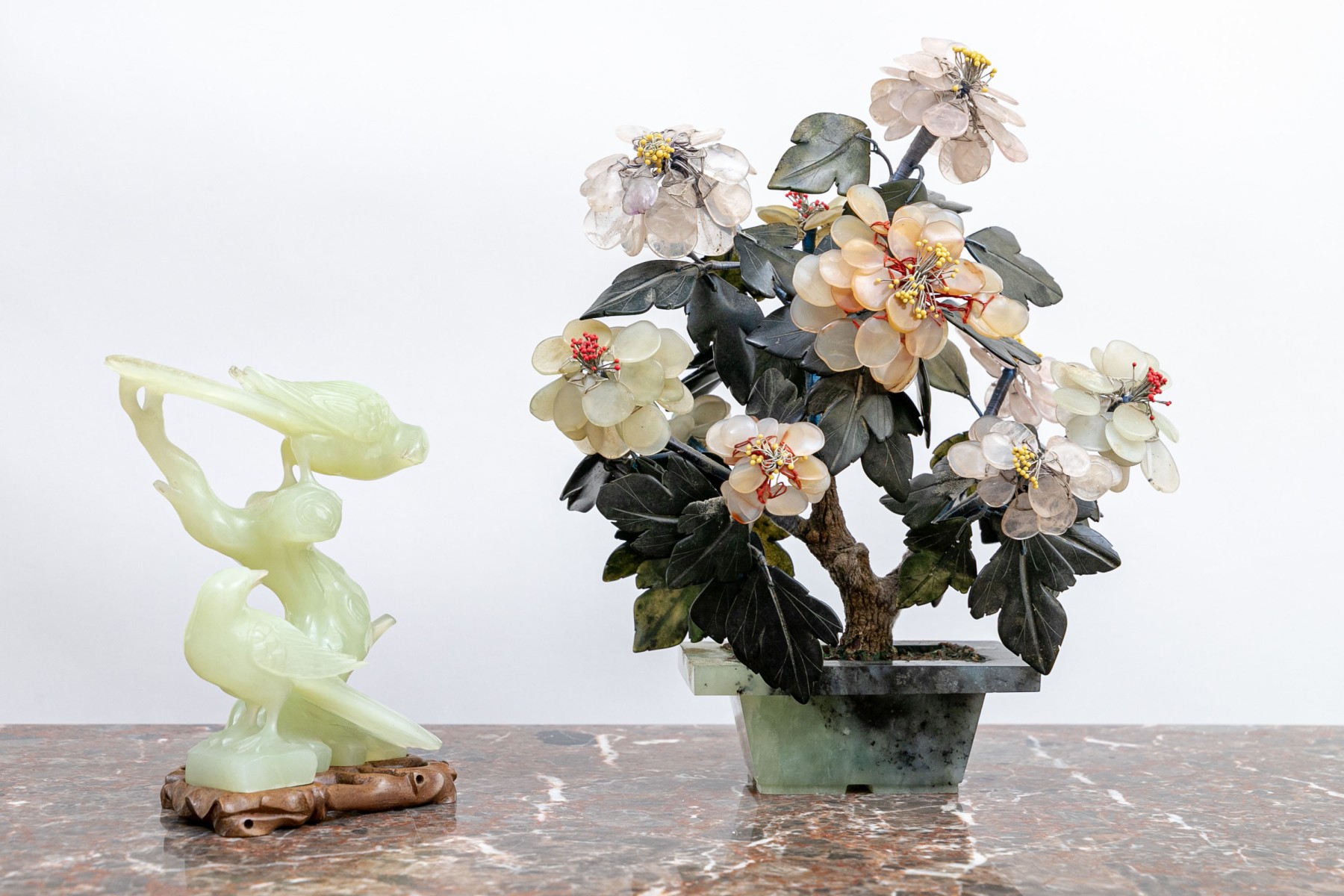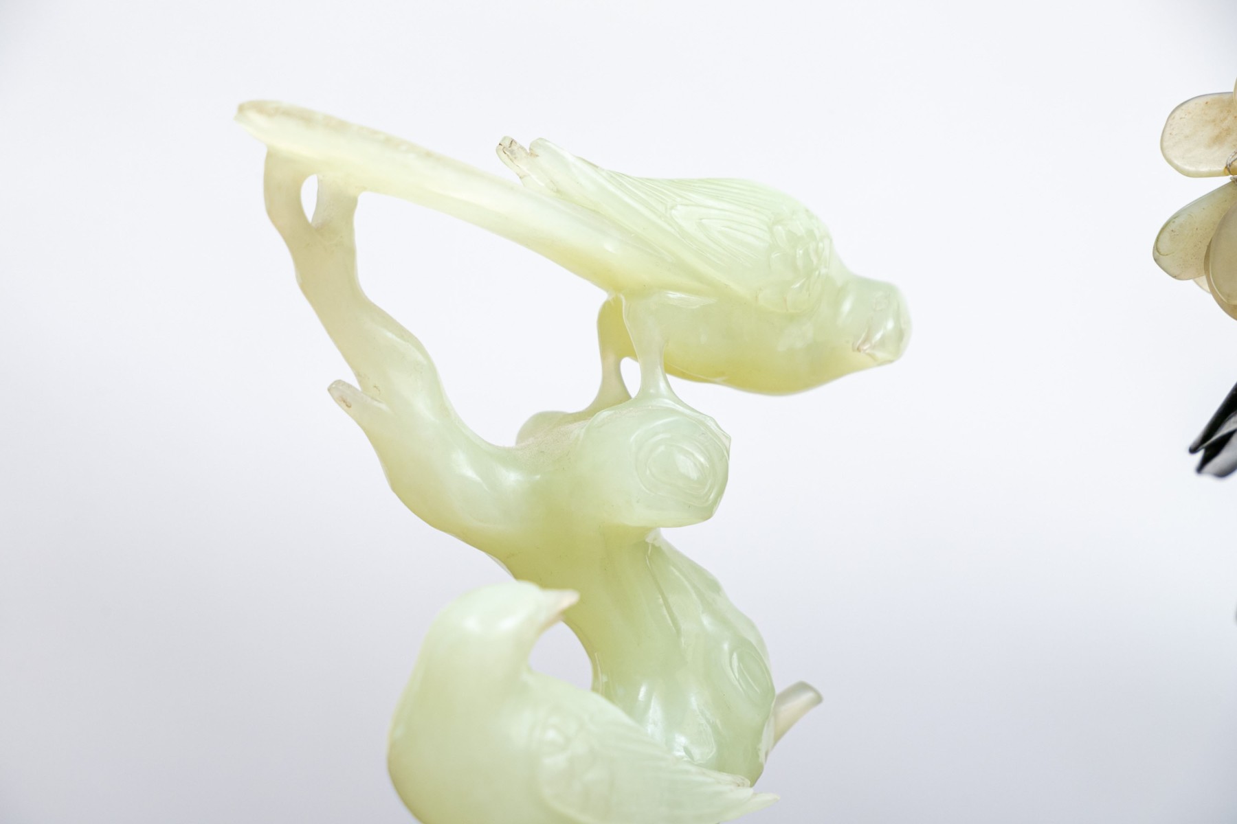 - 1 Chinese carved stone sculpture with two birds, one perched in a tree. Standing on wood stand.