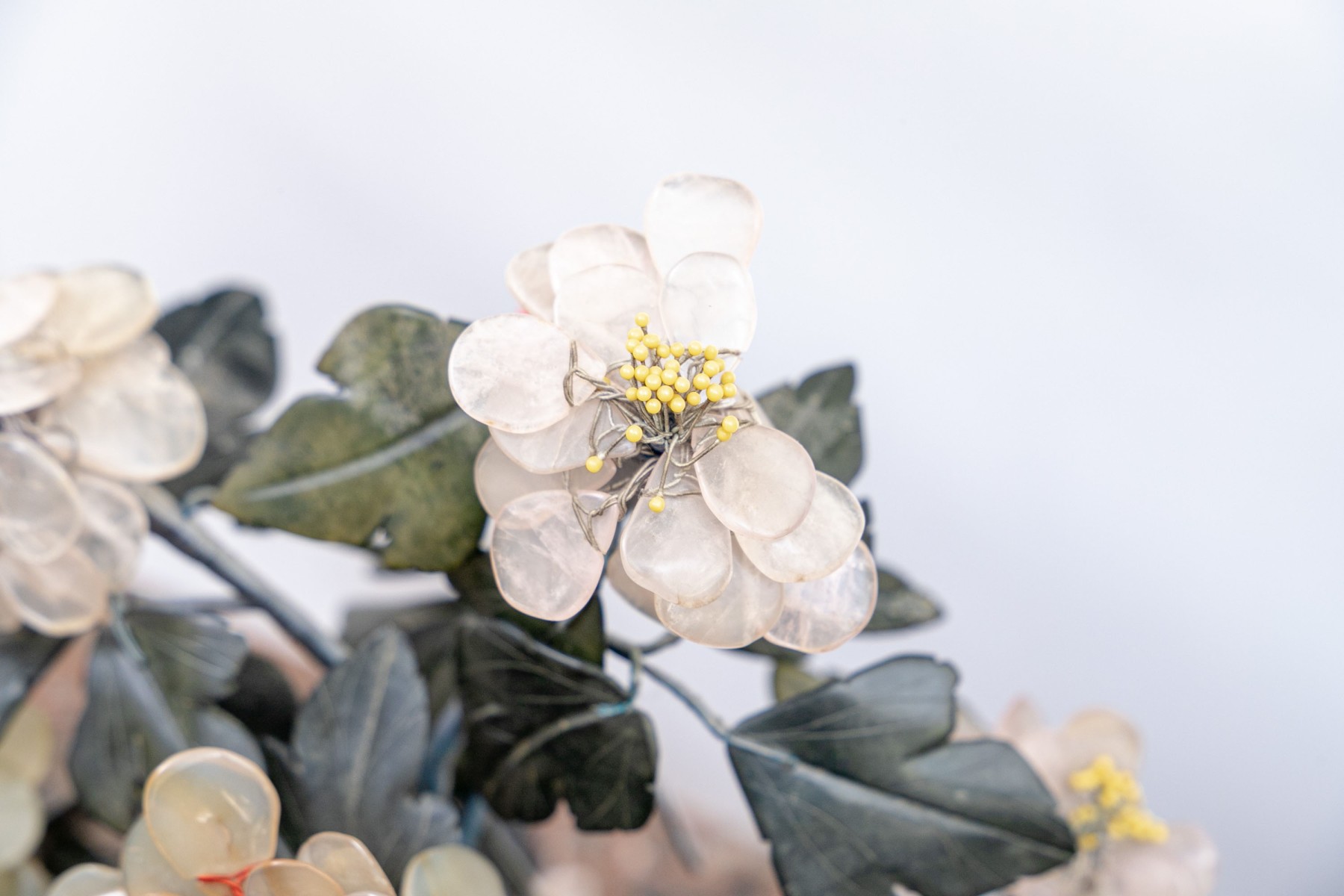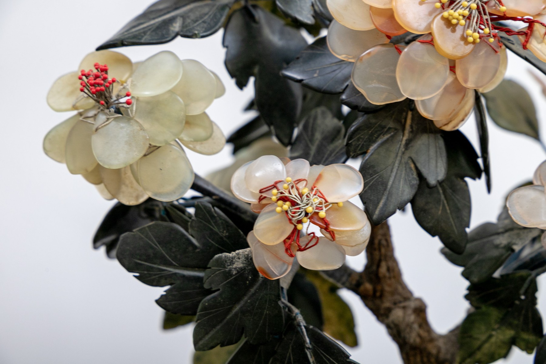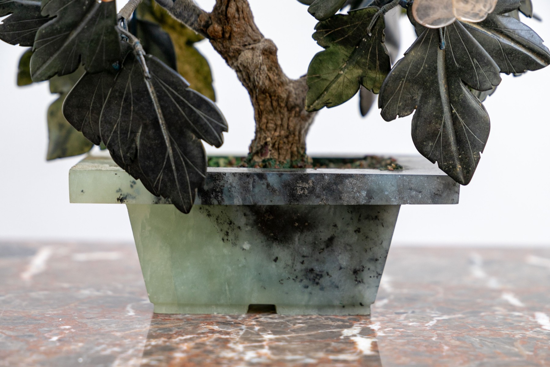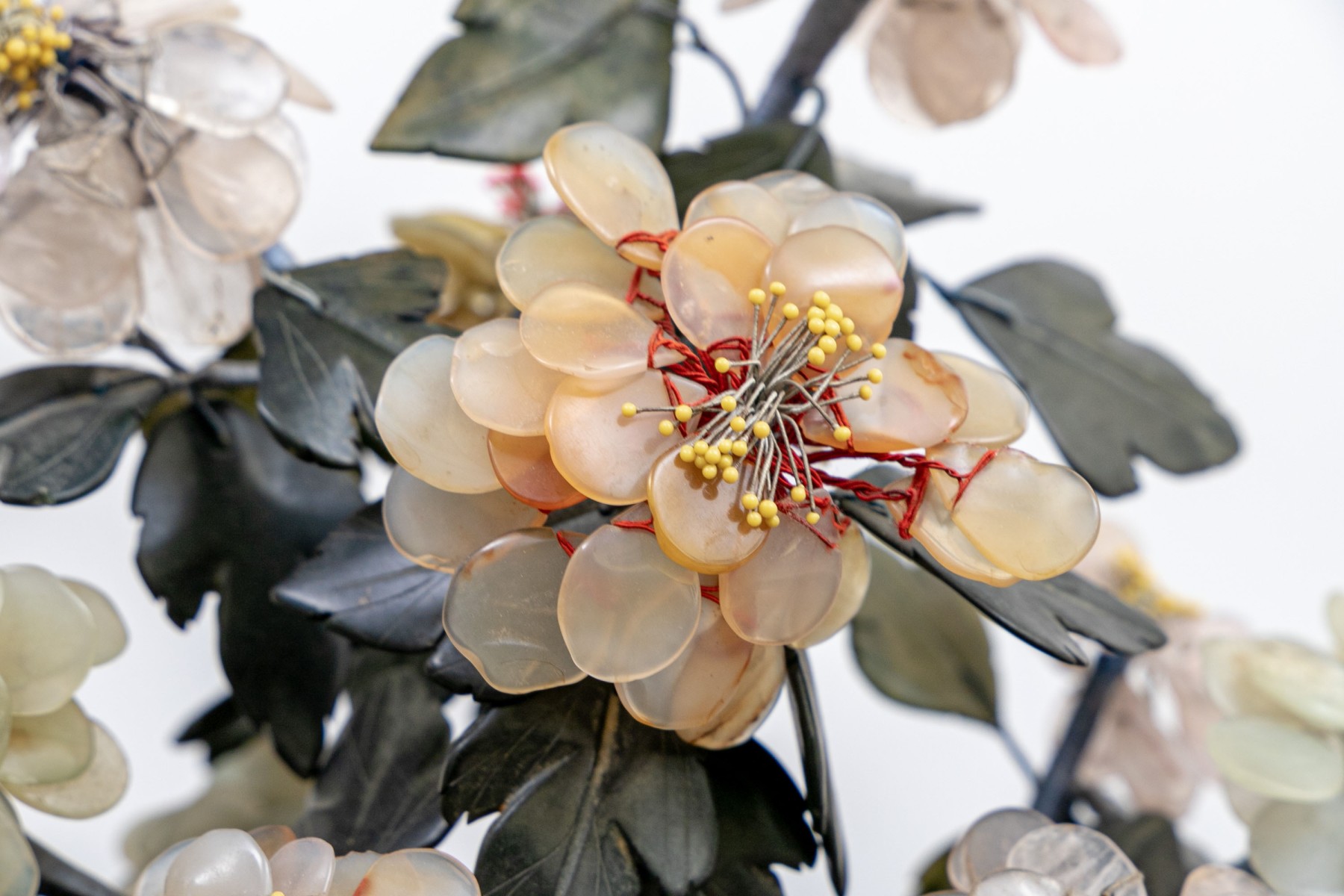 - 1 Chinese mixed media, carved and inlaid hardstone plant in carved stone planter.
