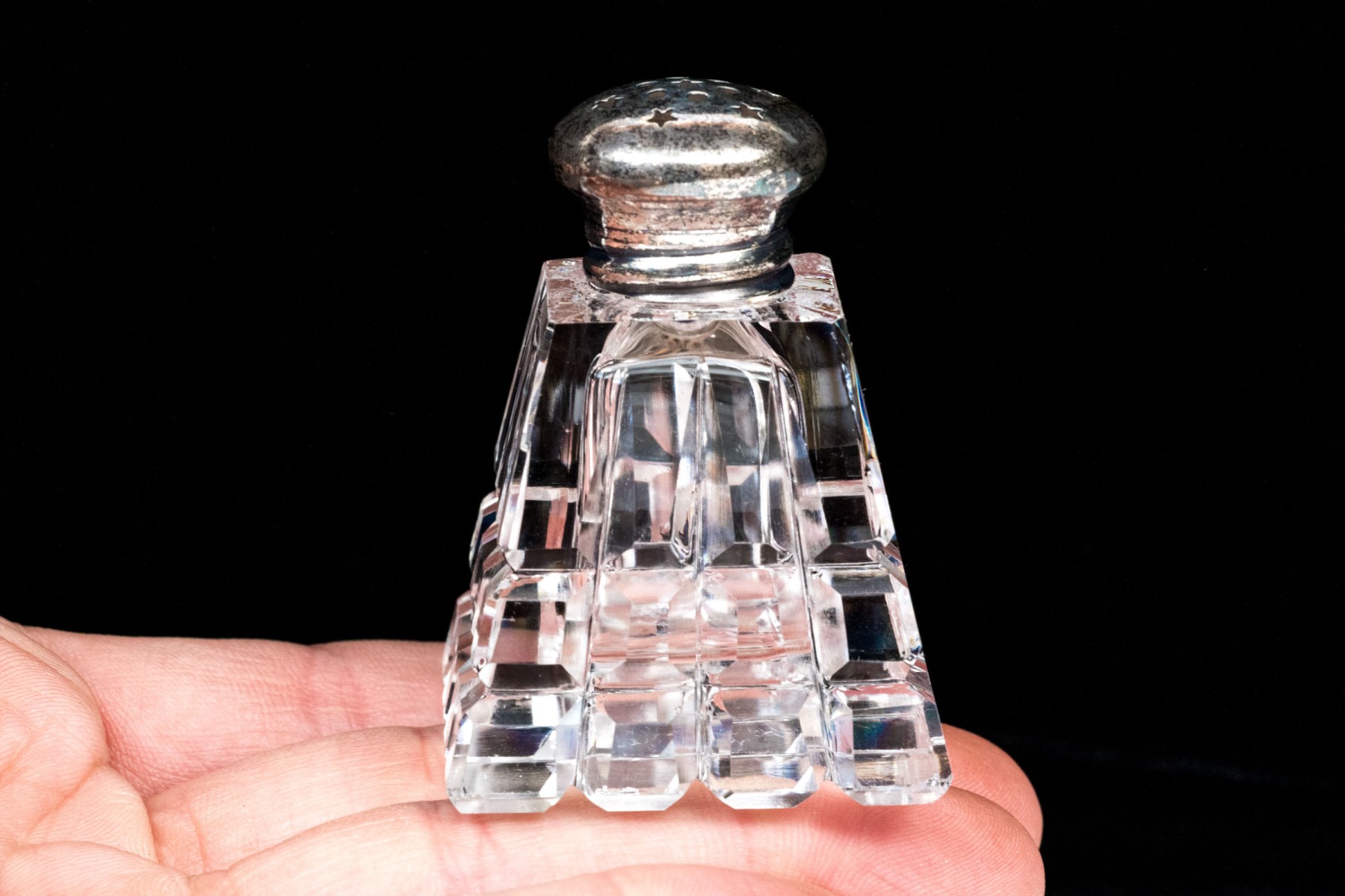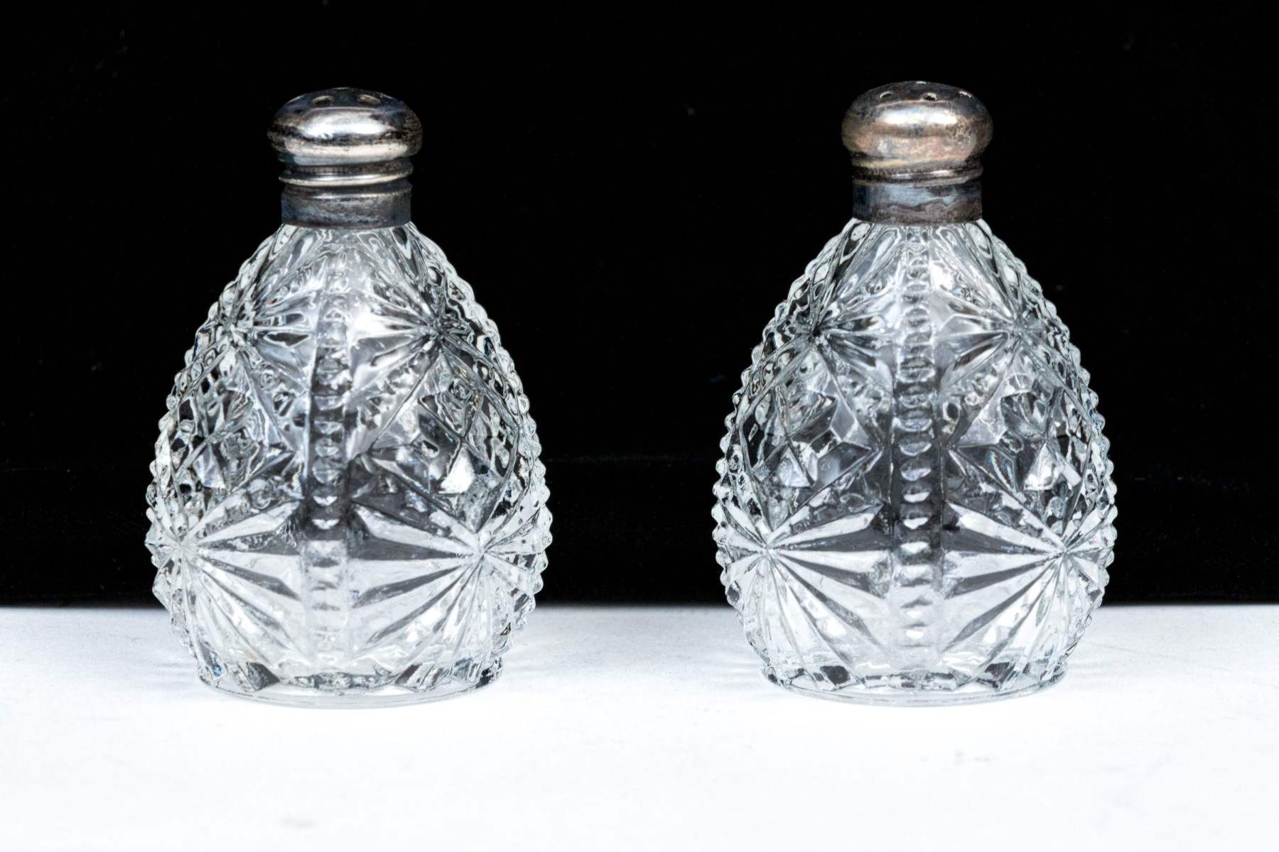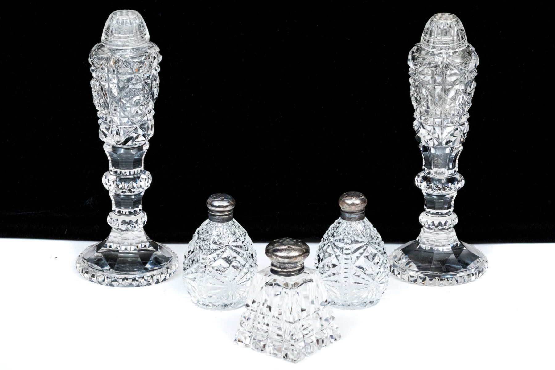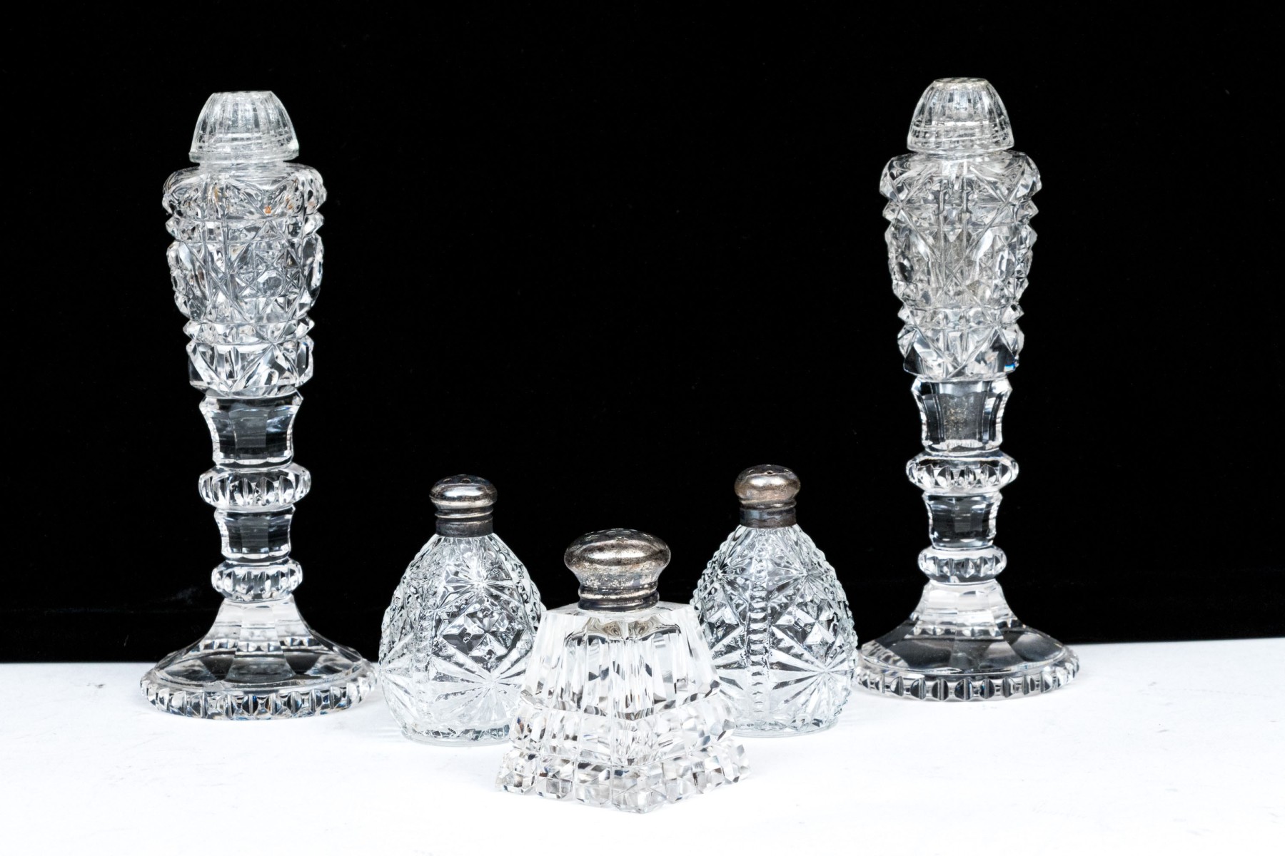 Comprised of a taller pair of stemmed casters, with a pair of shorter casters with silvered tops and another square tapered caster with silvered top.
