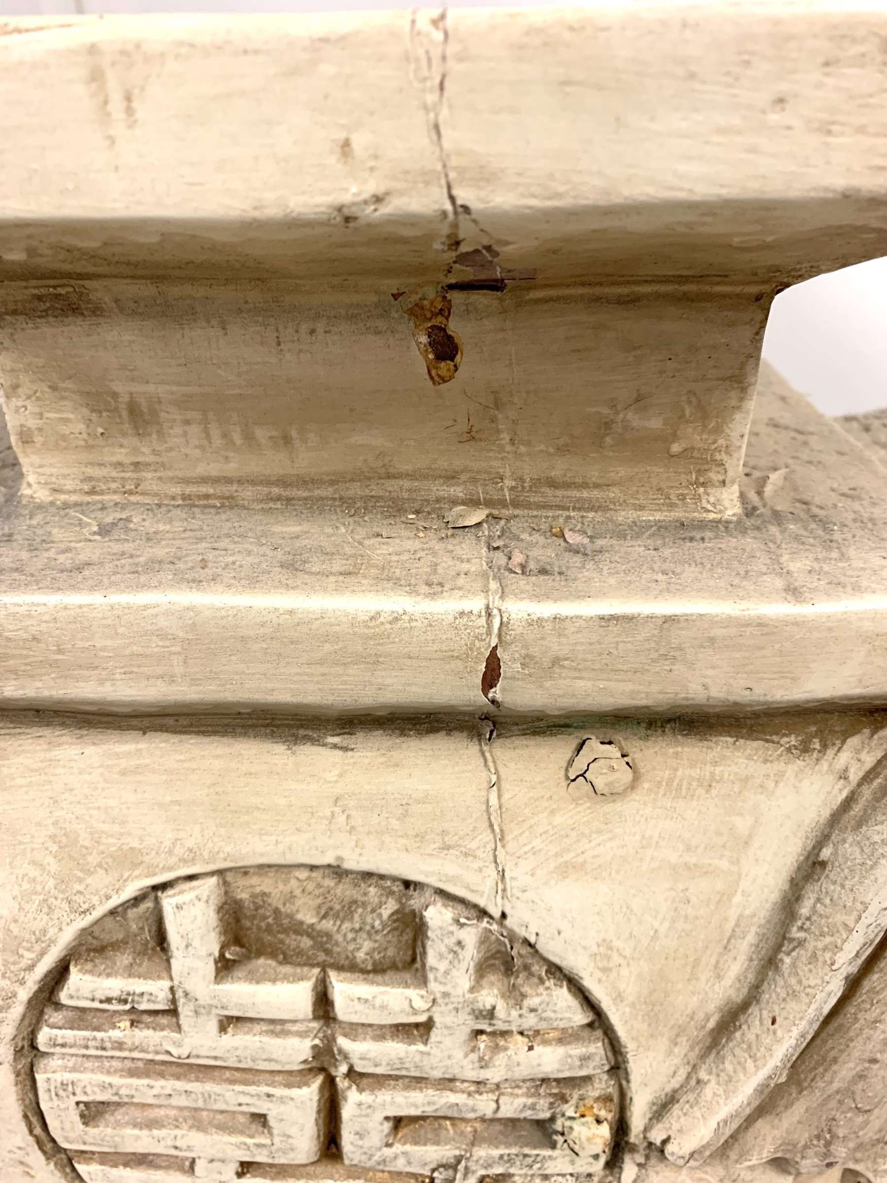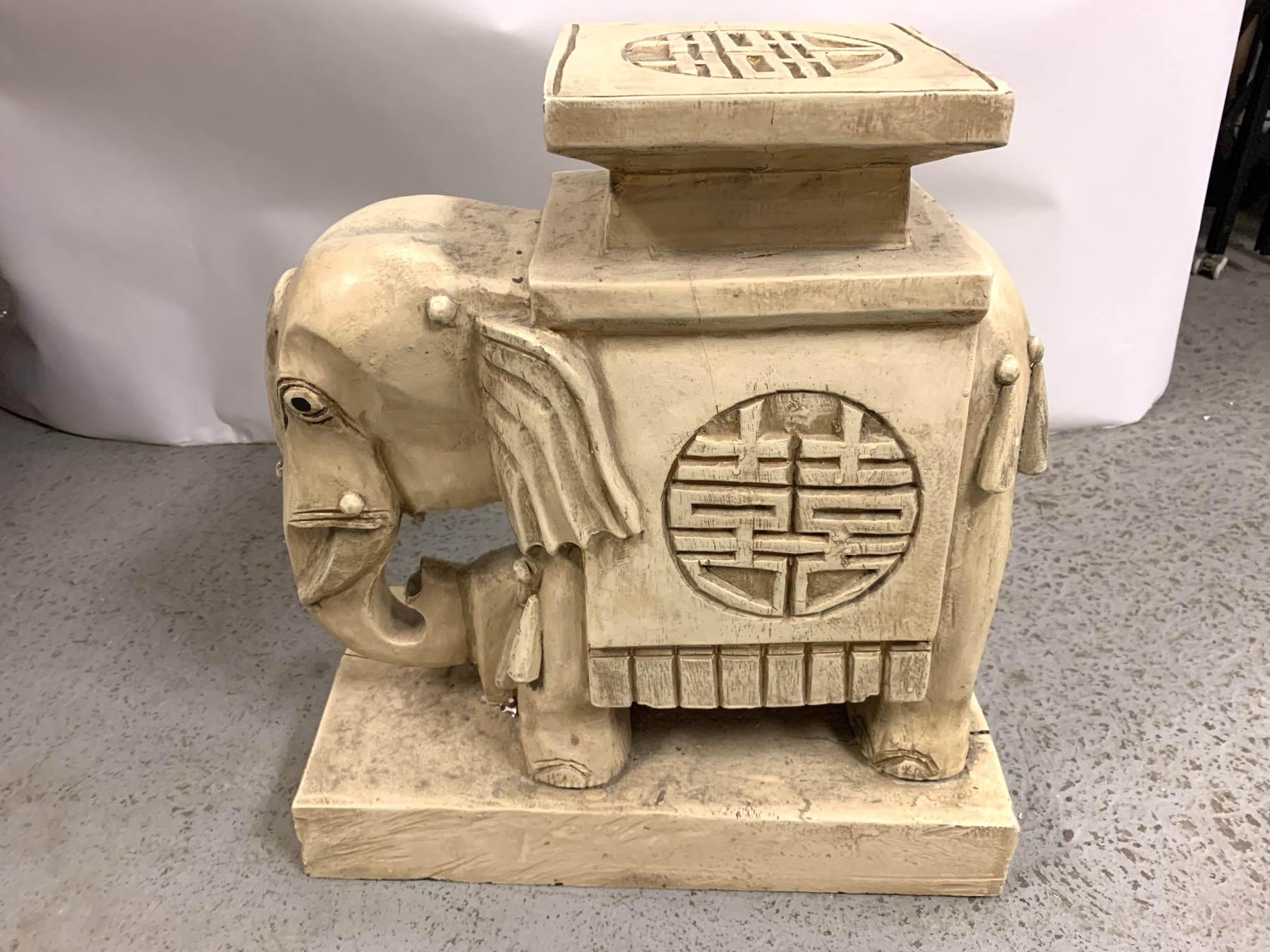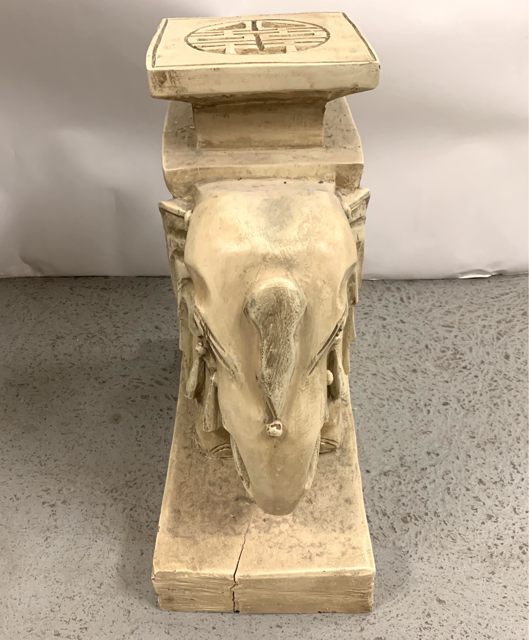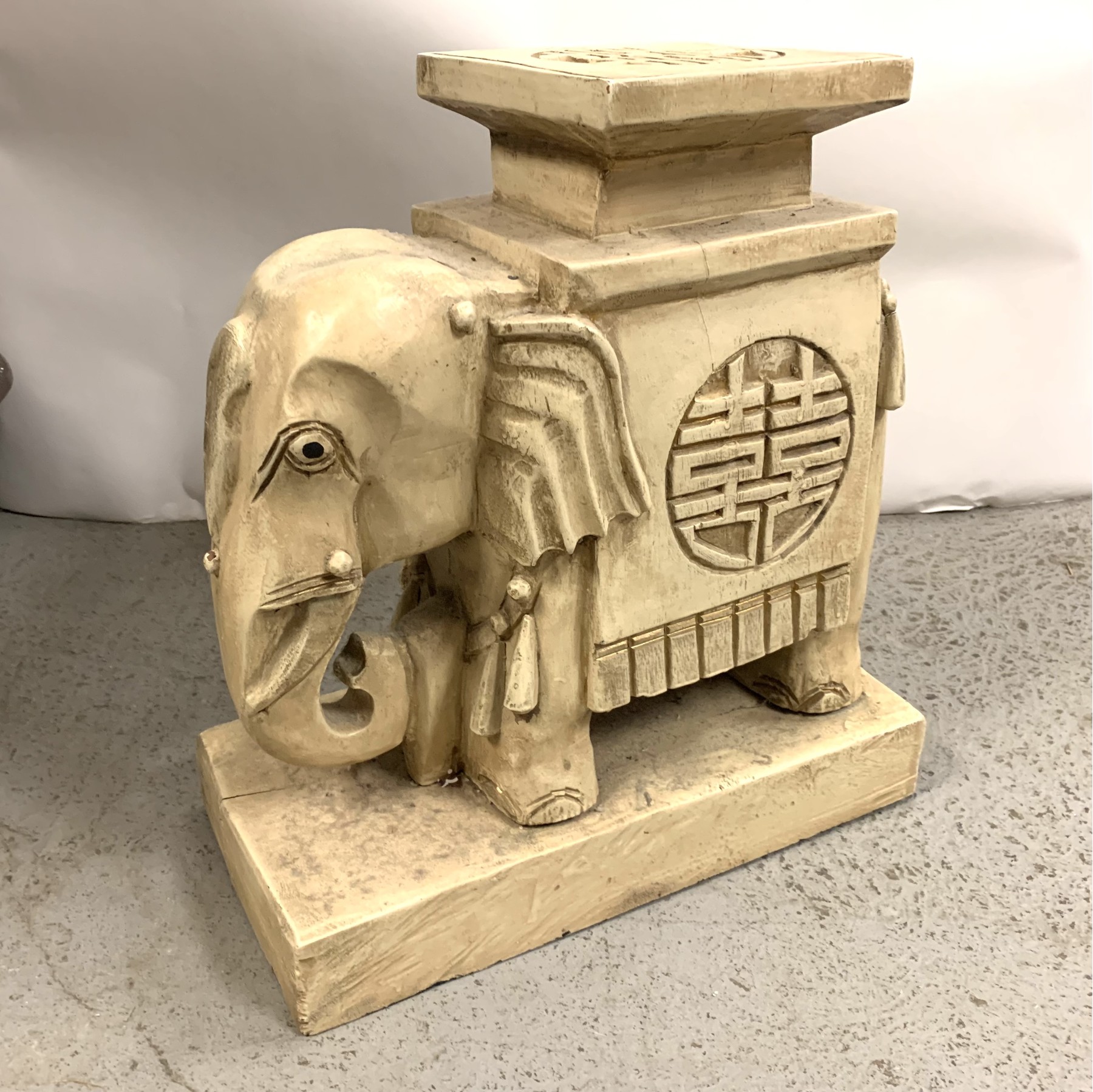 Vintage composition elephant seat with with good luck incised decoration on sides and top and raised on a plinth base.
