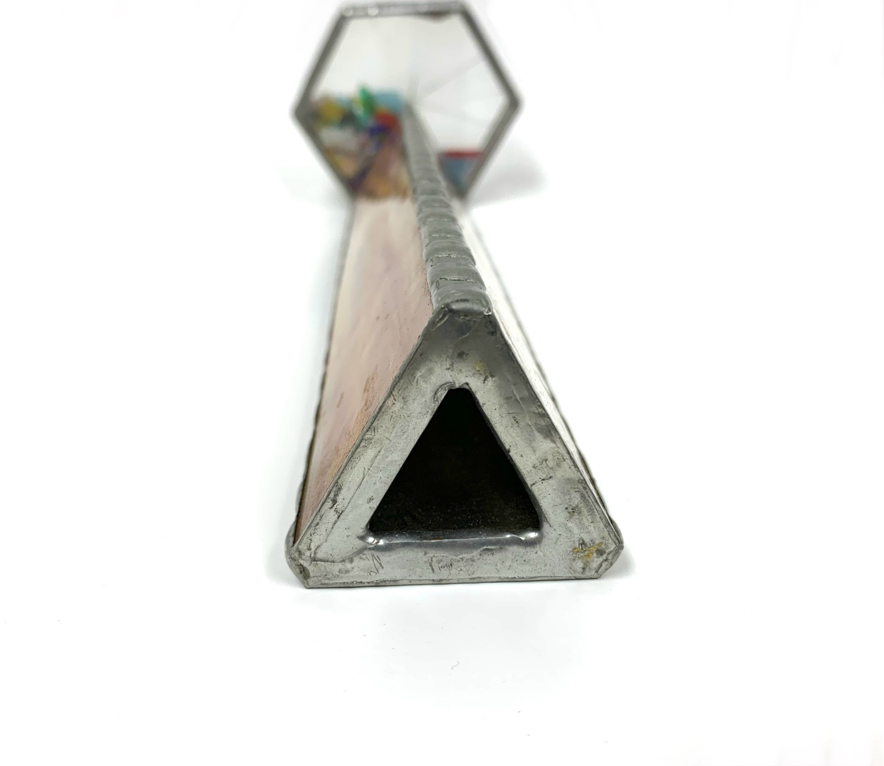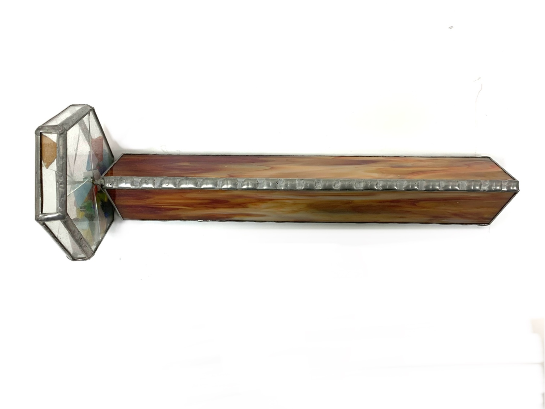 A wonderful old Kaleidoscope with fine craftsmanship having a triangular body formed from panels of Cream and deep Amber Stained Glass held by hand-fashioned metal casing. . The revolving glass octagonal cased head containing bits of multicolored glass in Reds, Blues, Yellows and Greens. Turning the head and gazing through the body one sees Classic Kaleidoscope prismatic reflections resembling precious stones.
