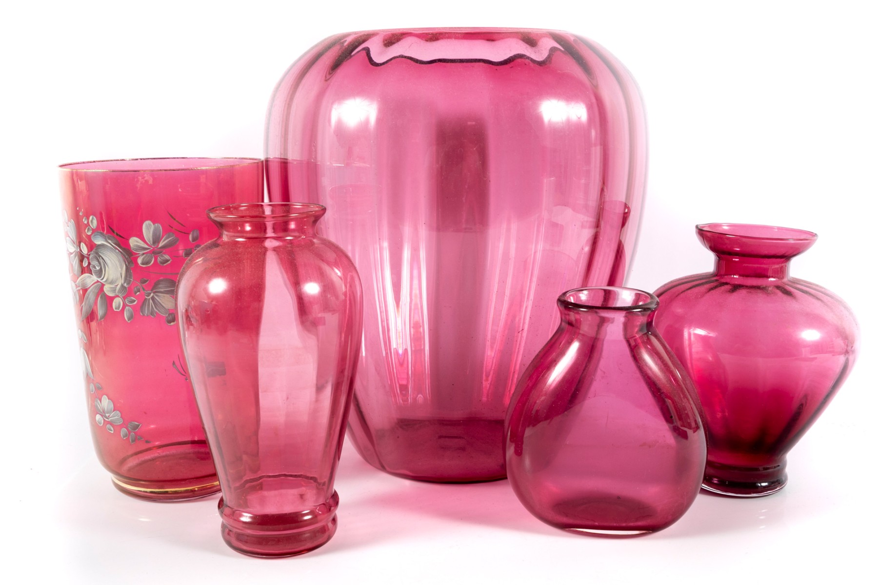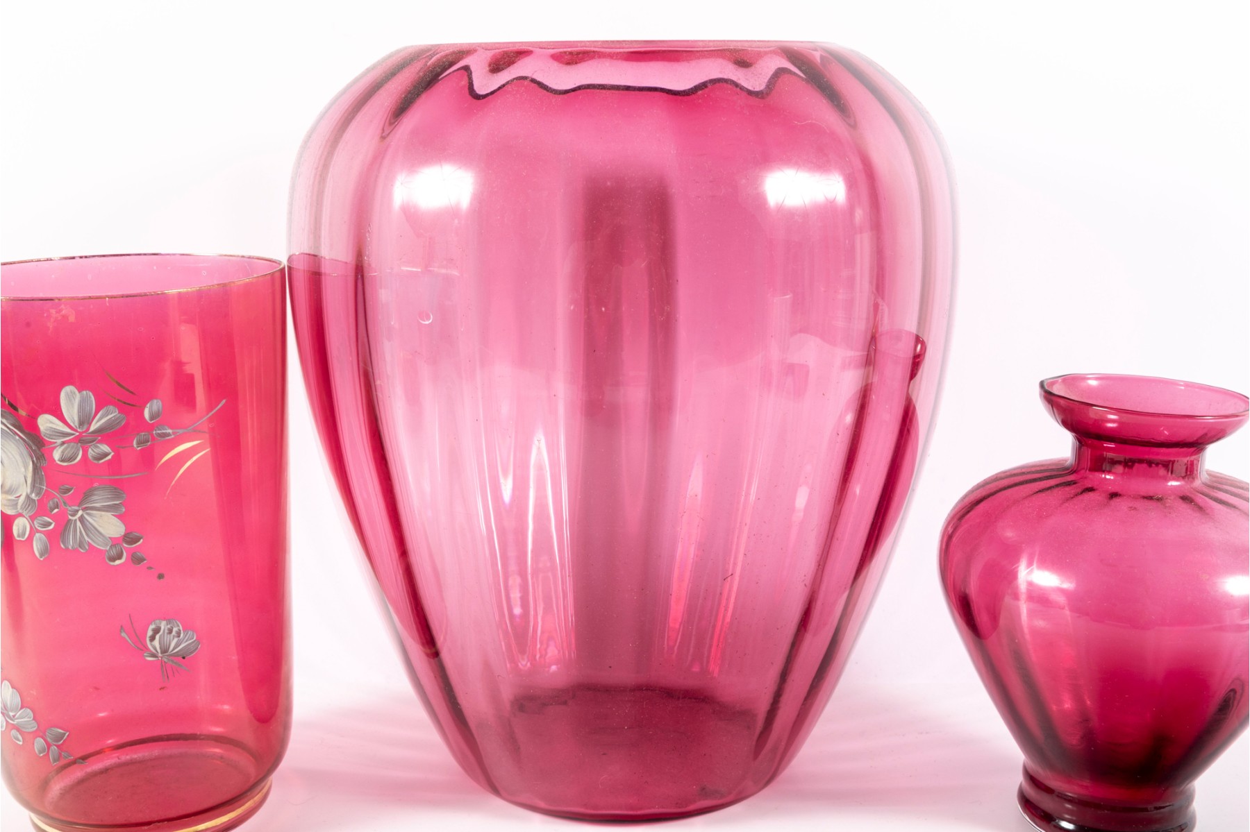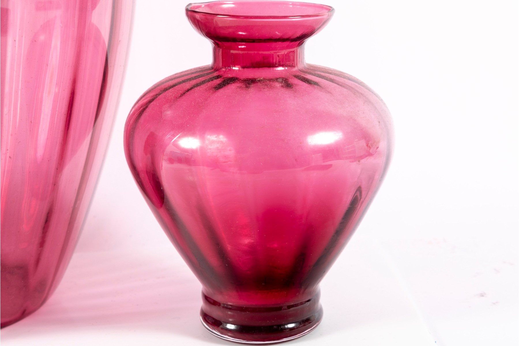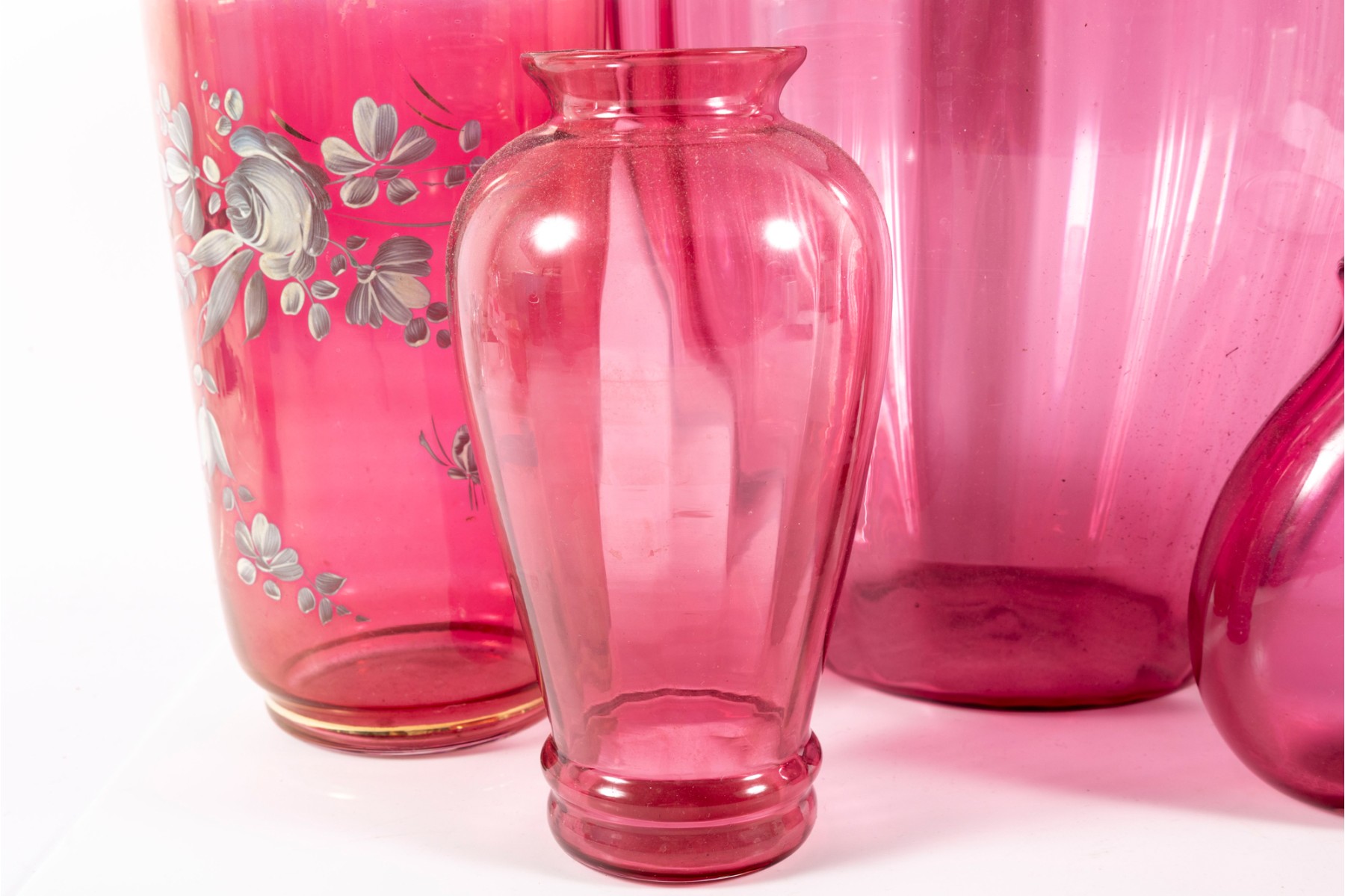 A wonderful collection of vintage cranberry depression glass vases. Features one large vase with a ribbed texture, and another cylindrical vase painted with white and gray floral sprays.