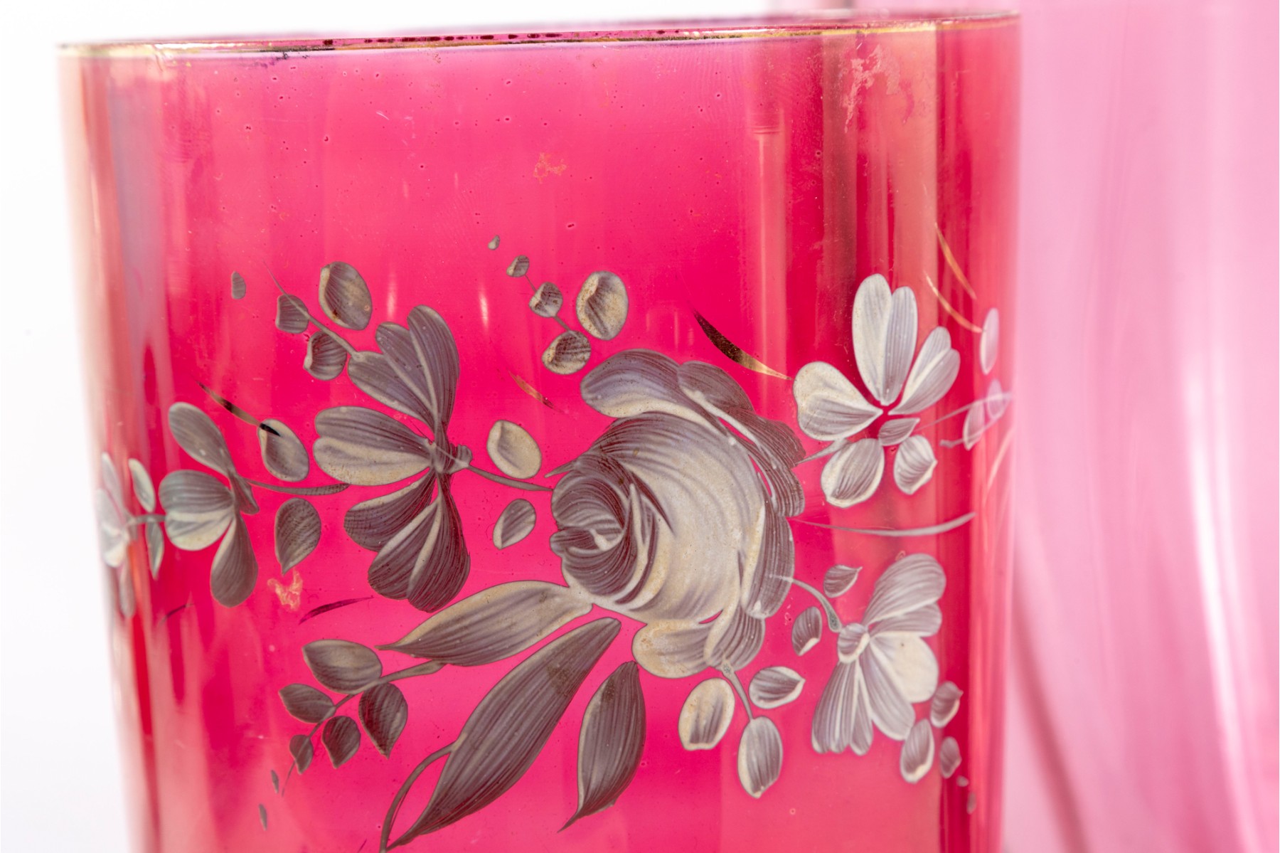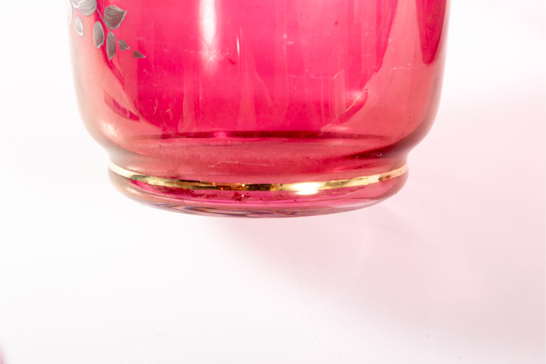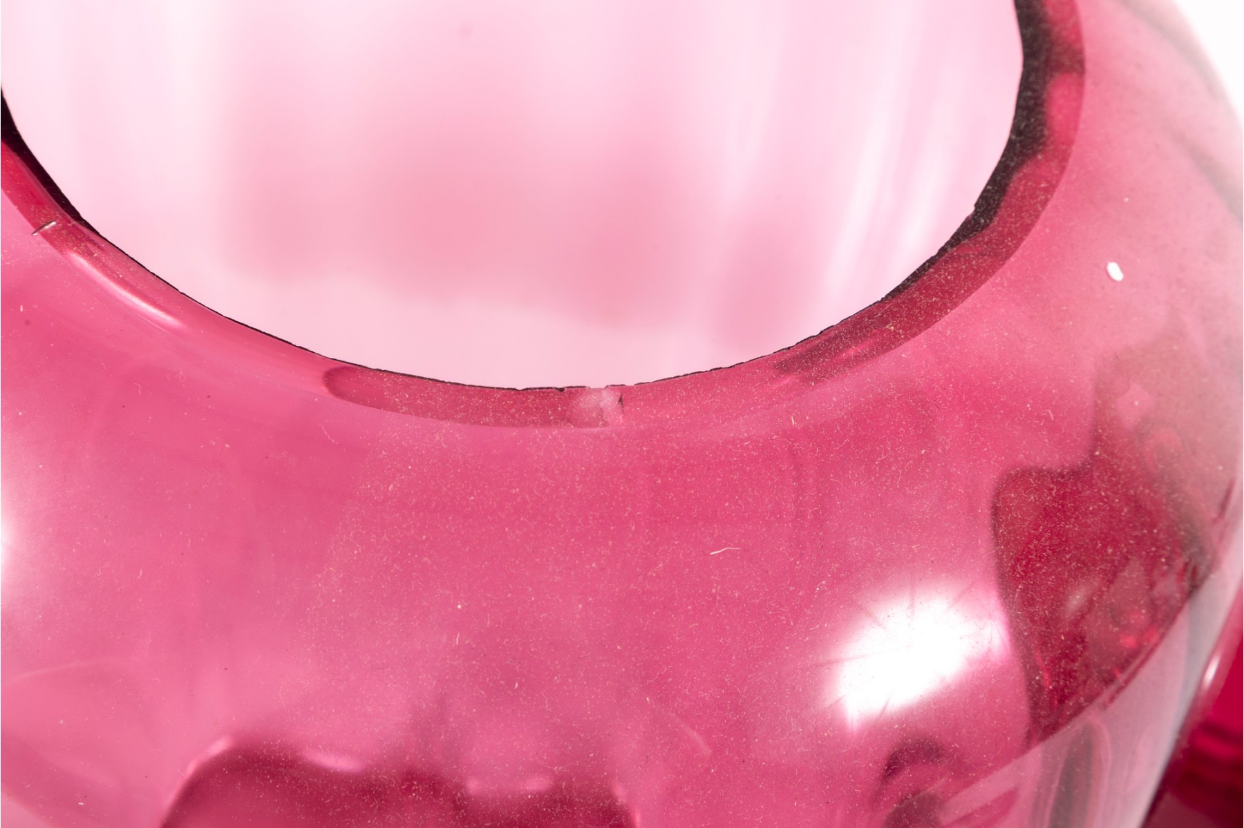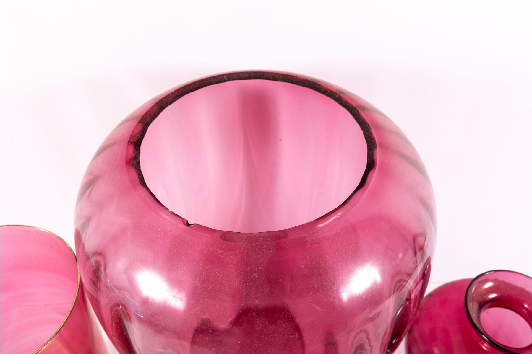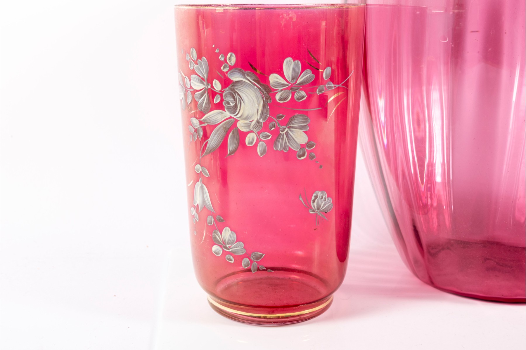 A wonderful collection of vintage cranberry depression glass vases. Features one large vase with a ribbed texture, and another cylindrical vase painted with white and gray floral sprays.