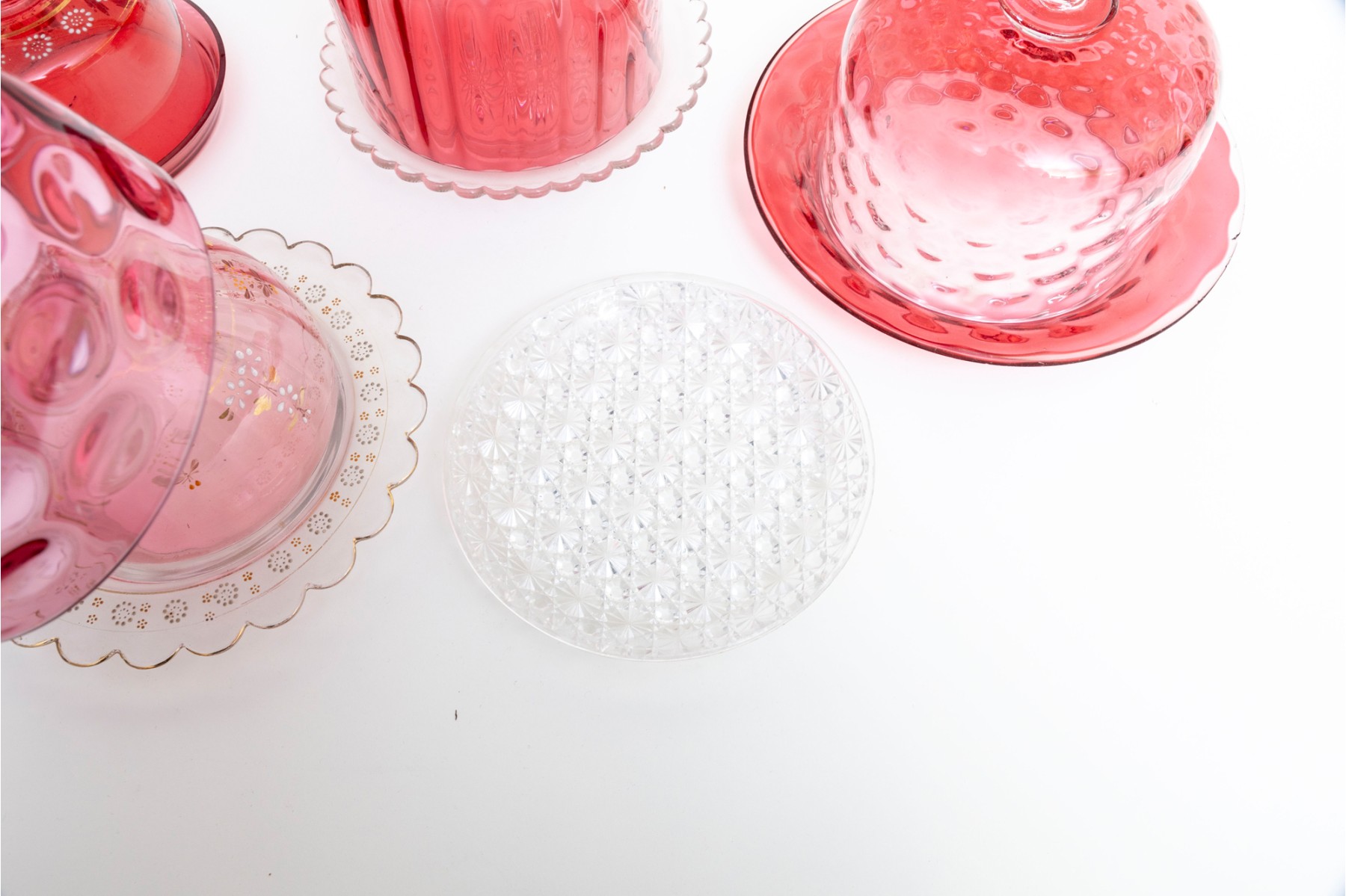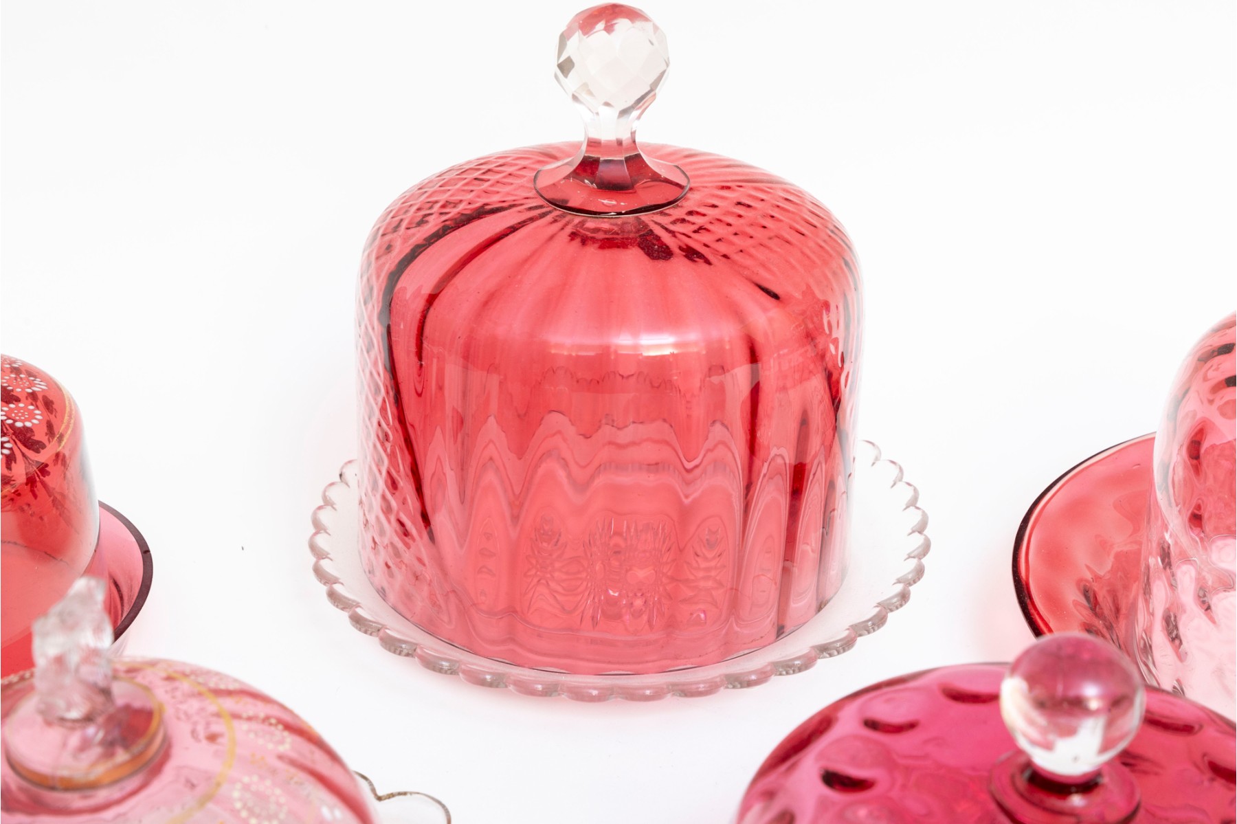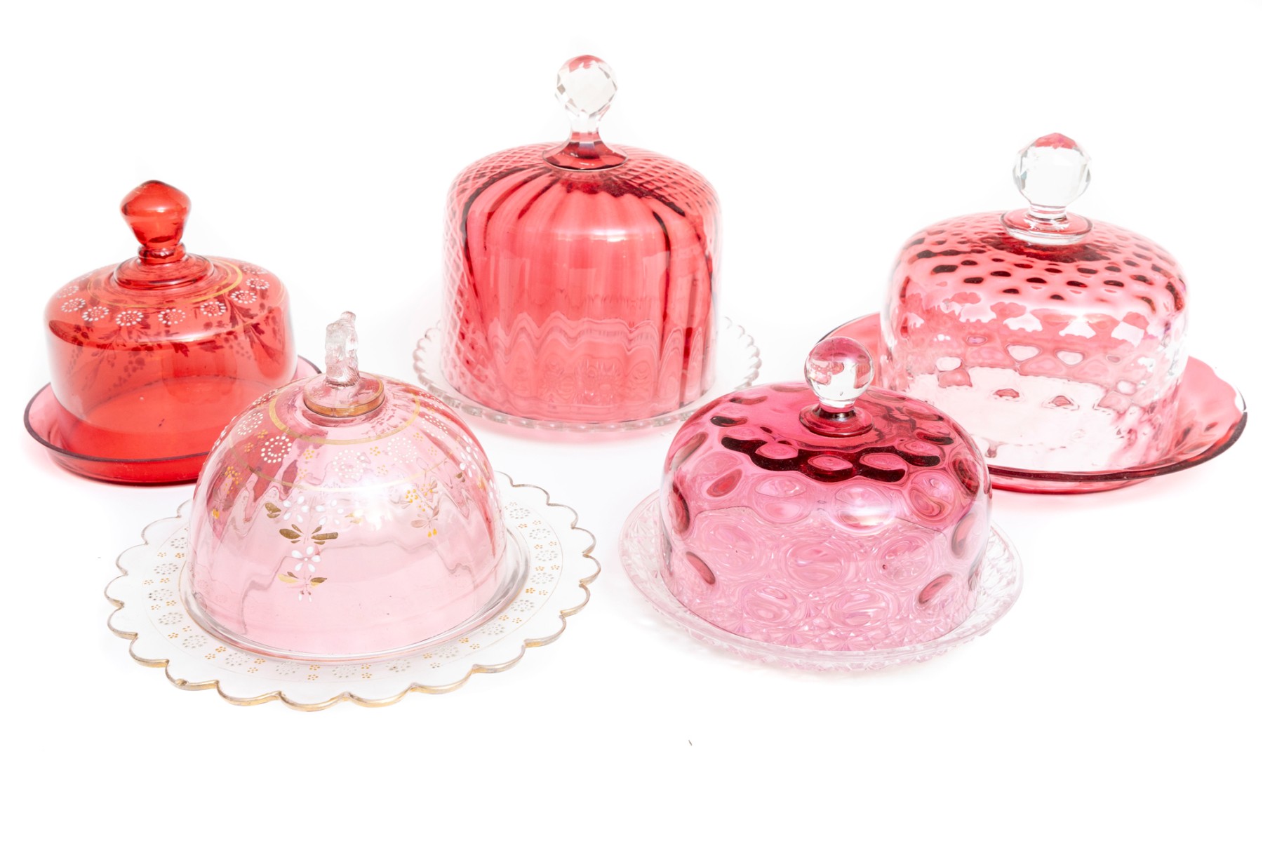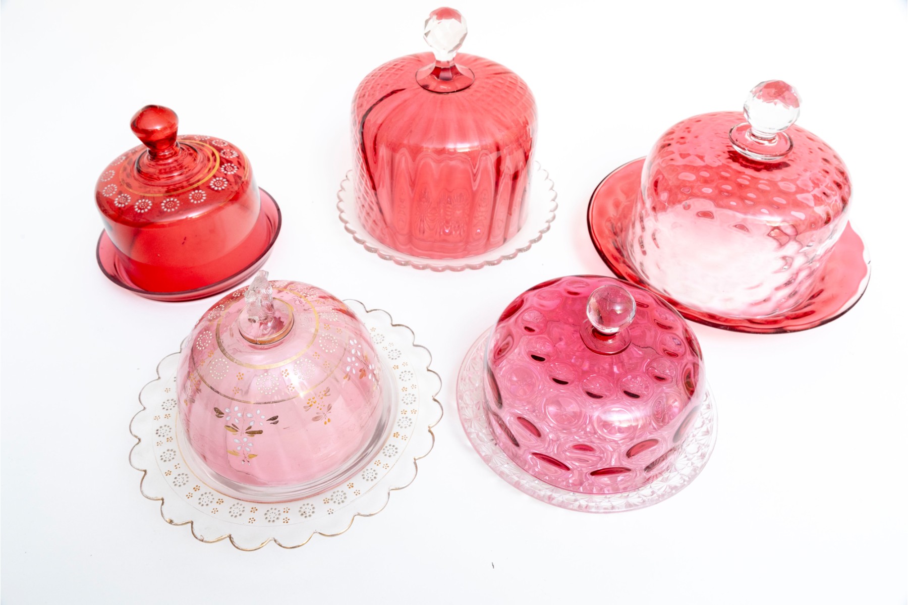 A fabulous collection of five vintage cranberry and clear glass cloches with saucers in a variety of designs including coin, quilt, and daisy and button.