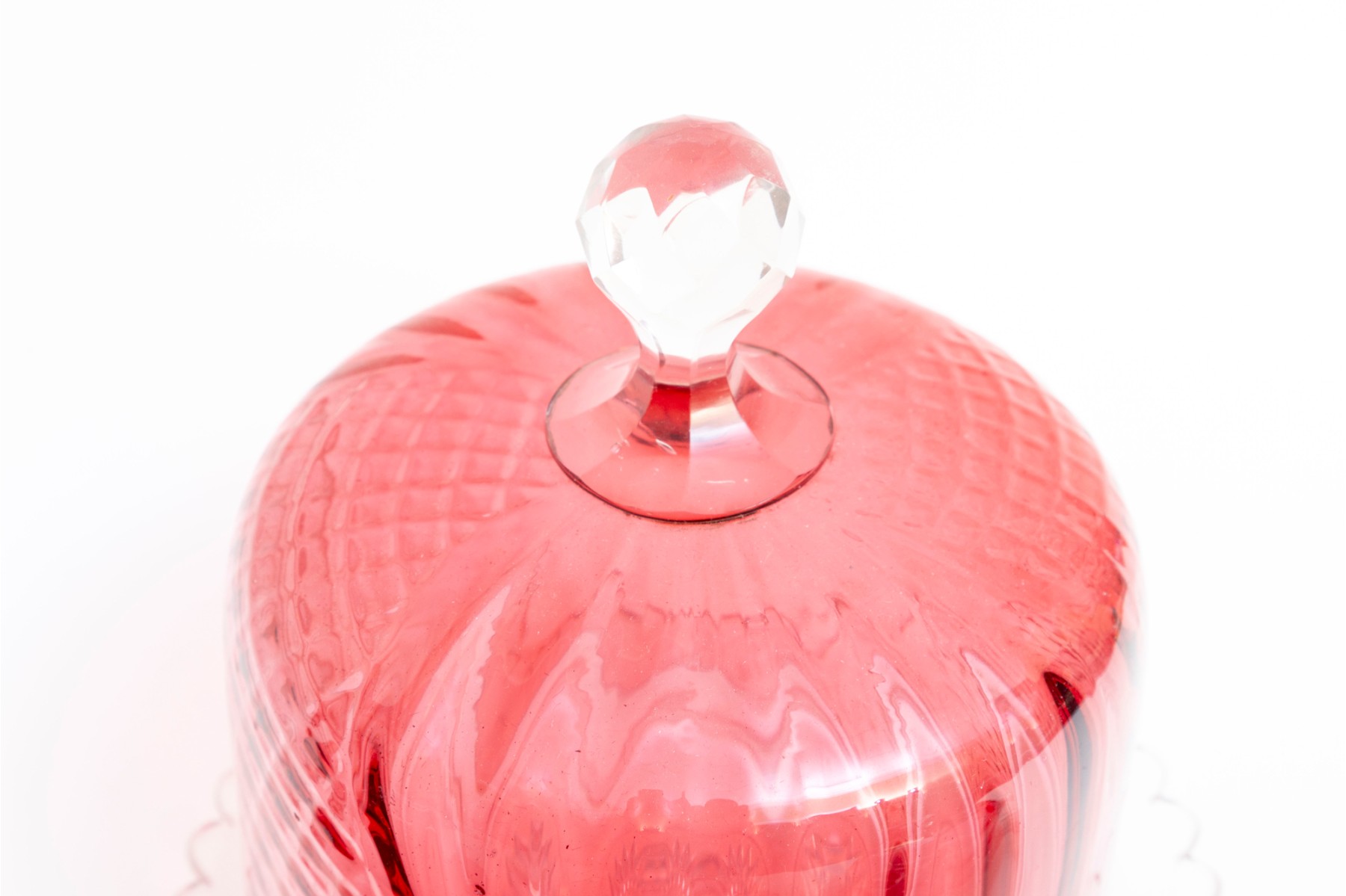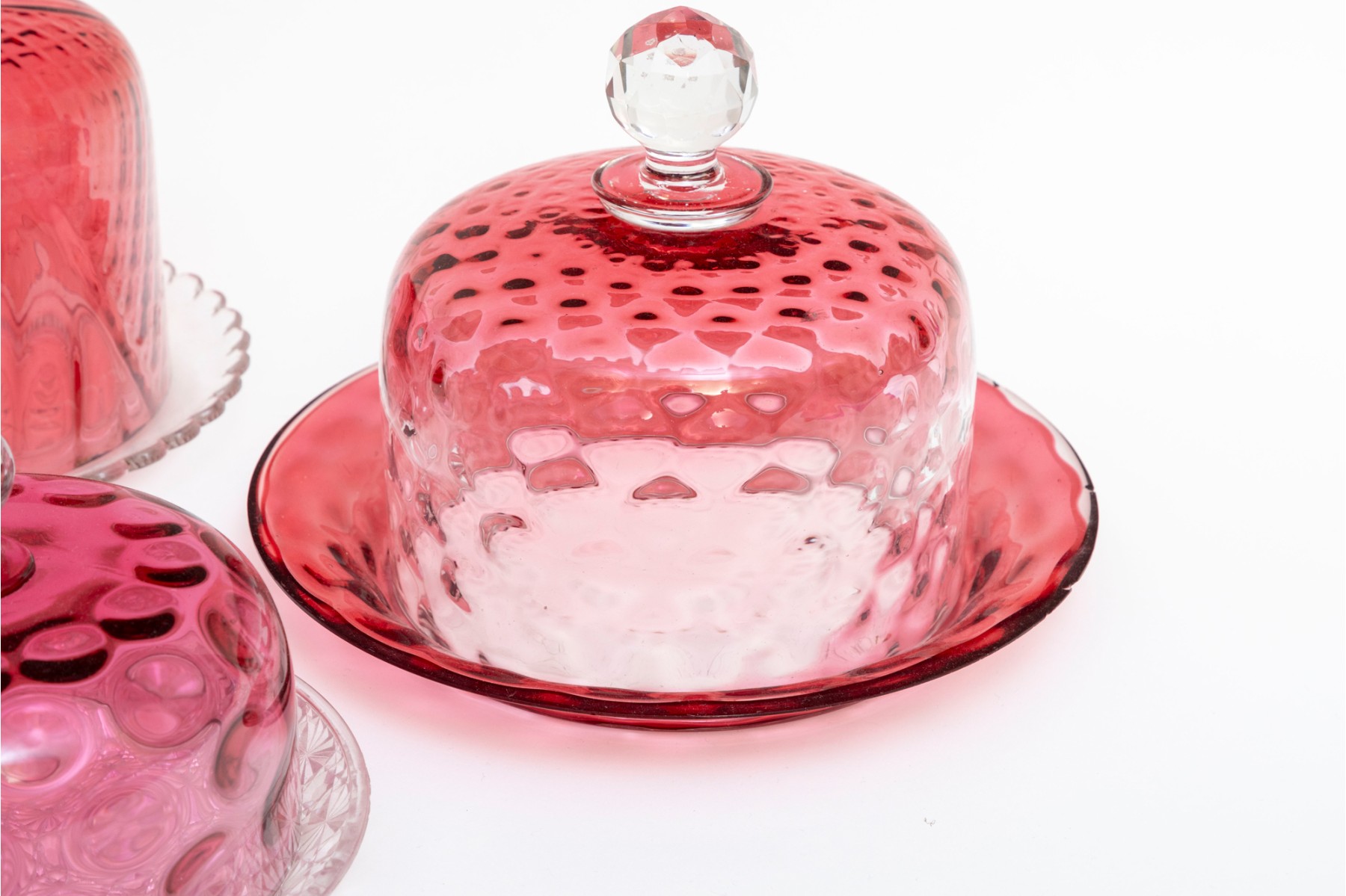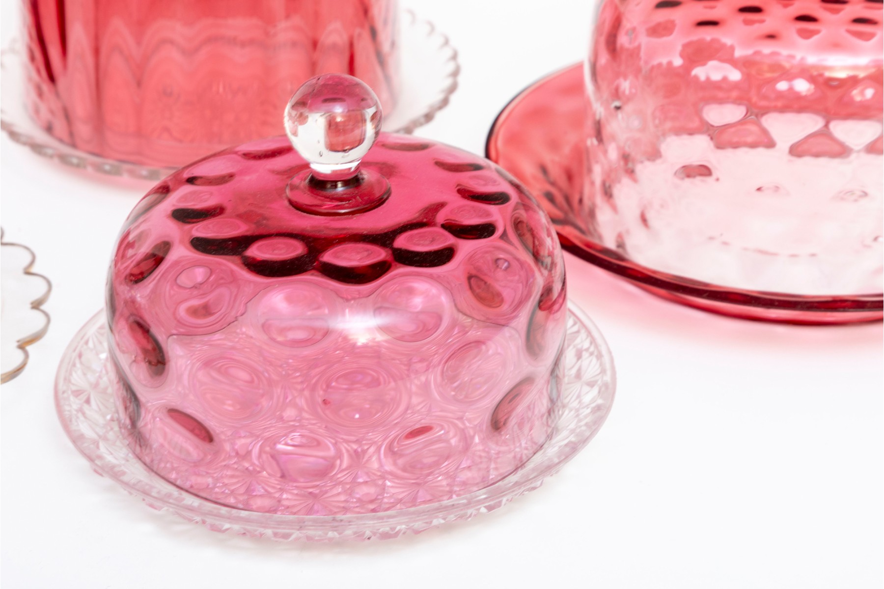 A fabulous collection of five vintage cranberry and clear glass cloches with saucers in a variety of designs including coin, quilt, and daisy and button.