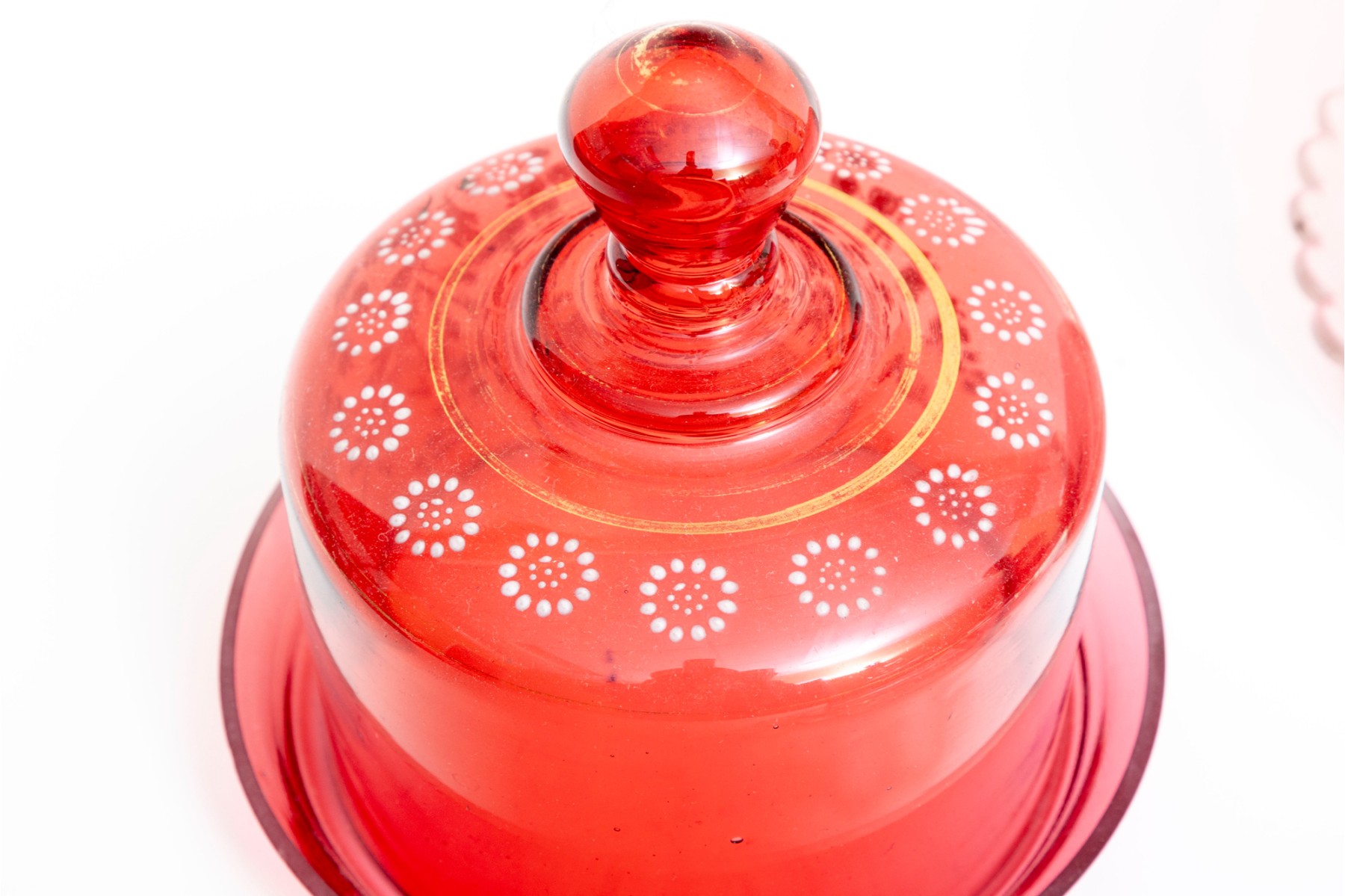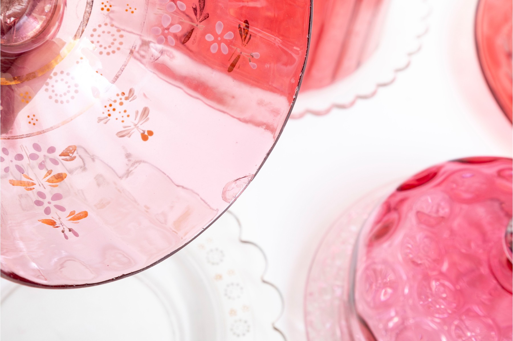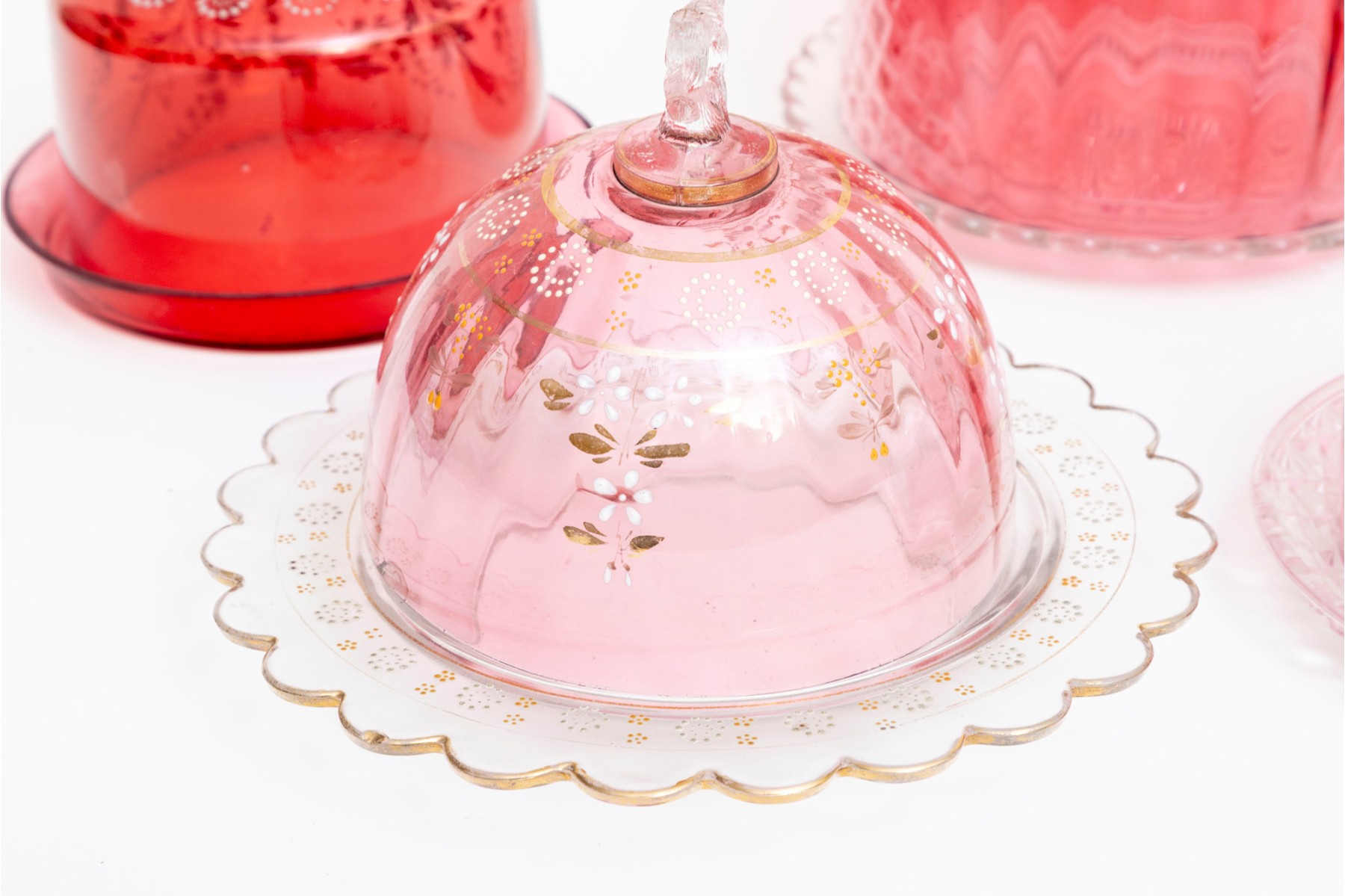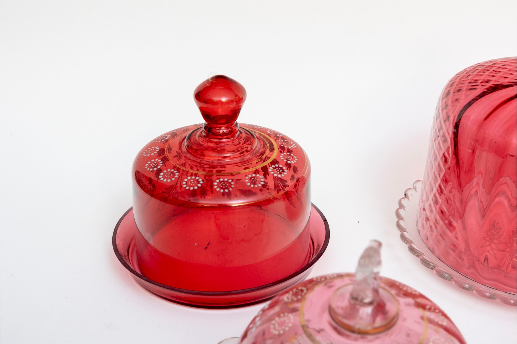 A fabulous collection of five vintage cranberry and clear glass cloches with saucers in a variety of designs including coin, quilt, and daisy and button.