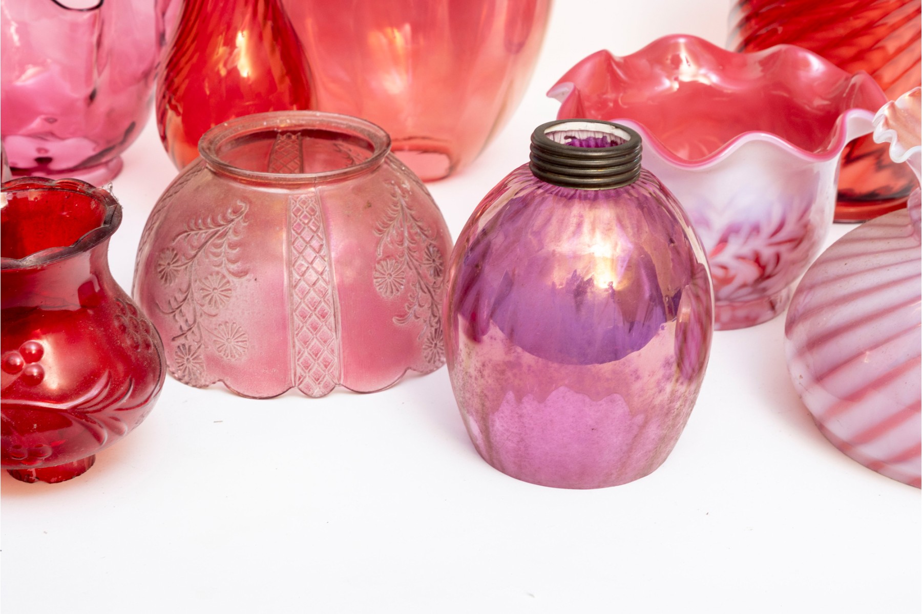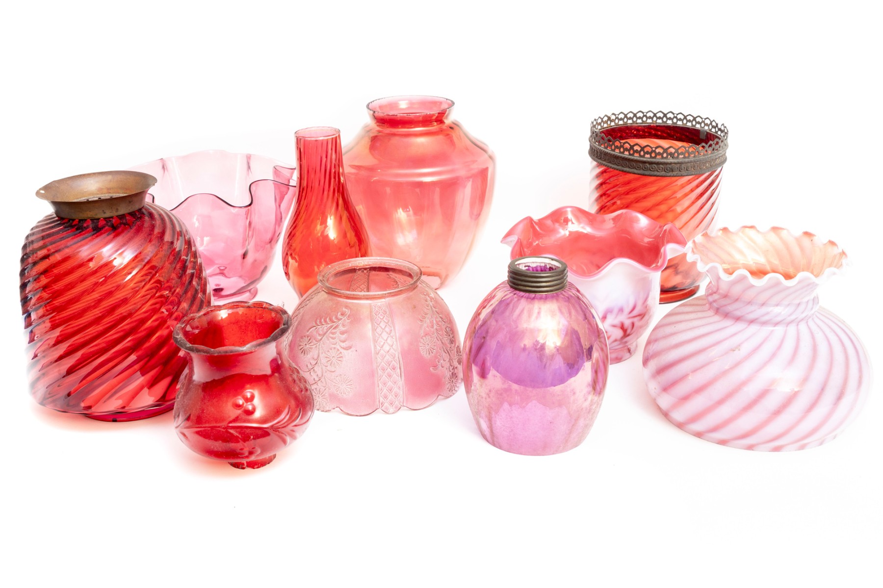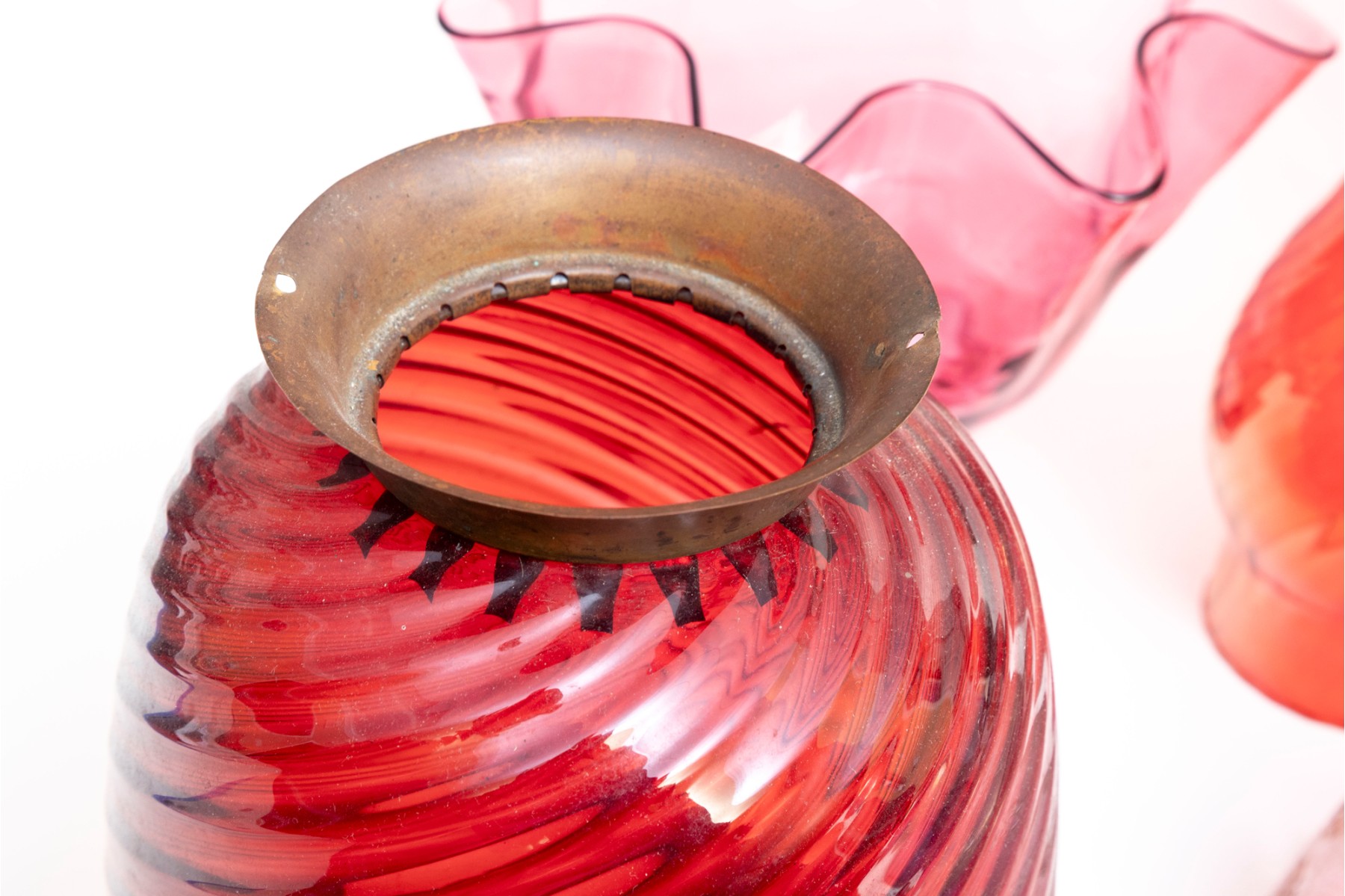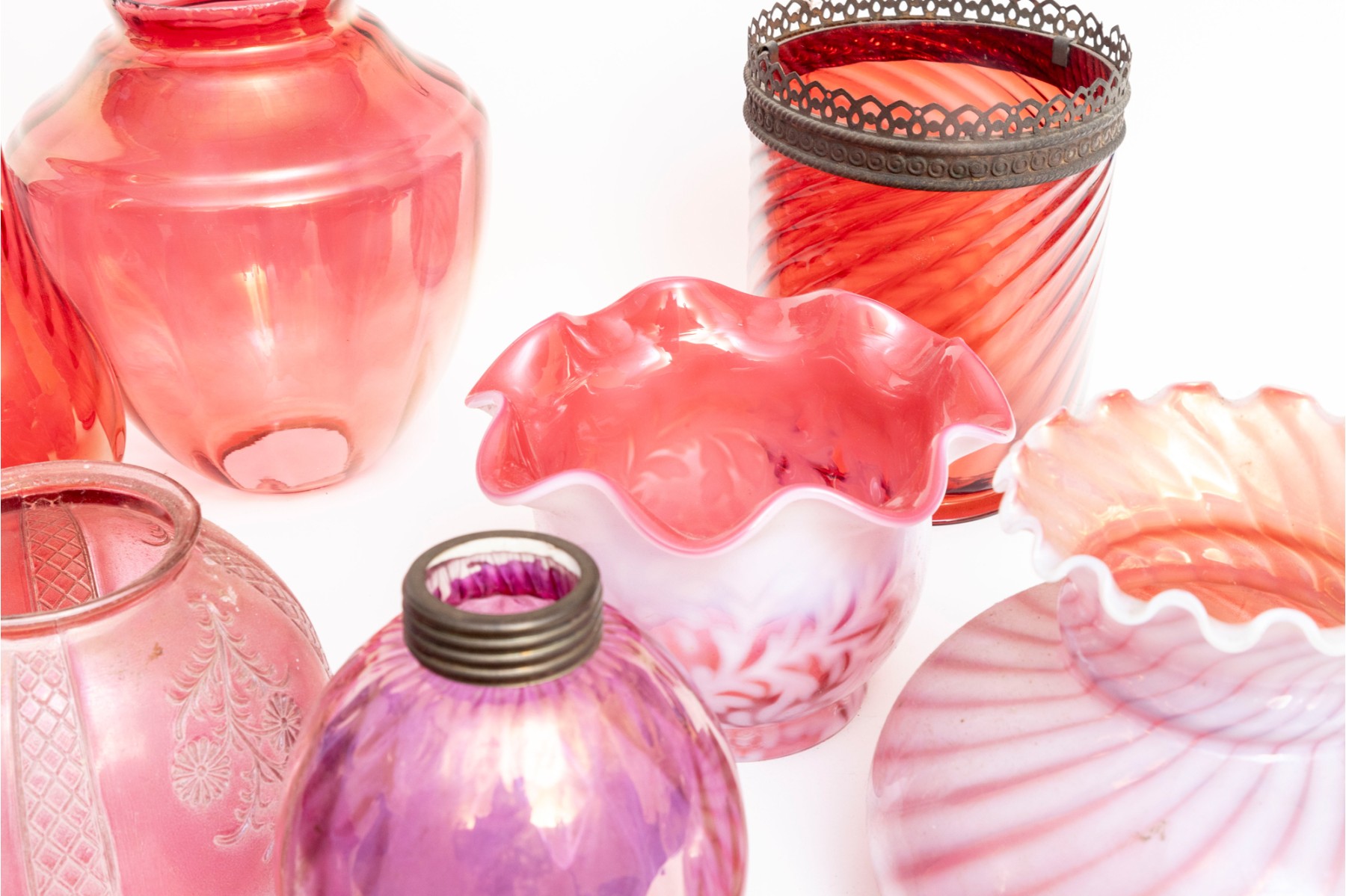 A collection of vintage cranberry glass shades including opalescent, dark red, pink, and white hues.
