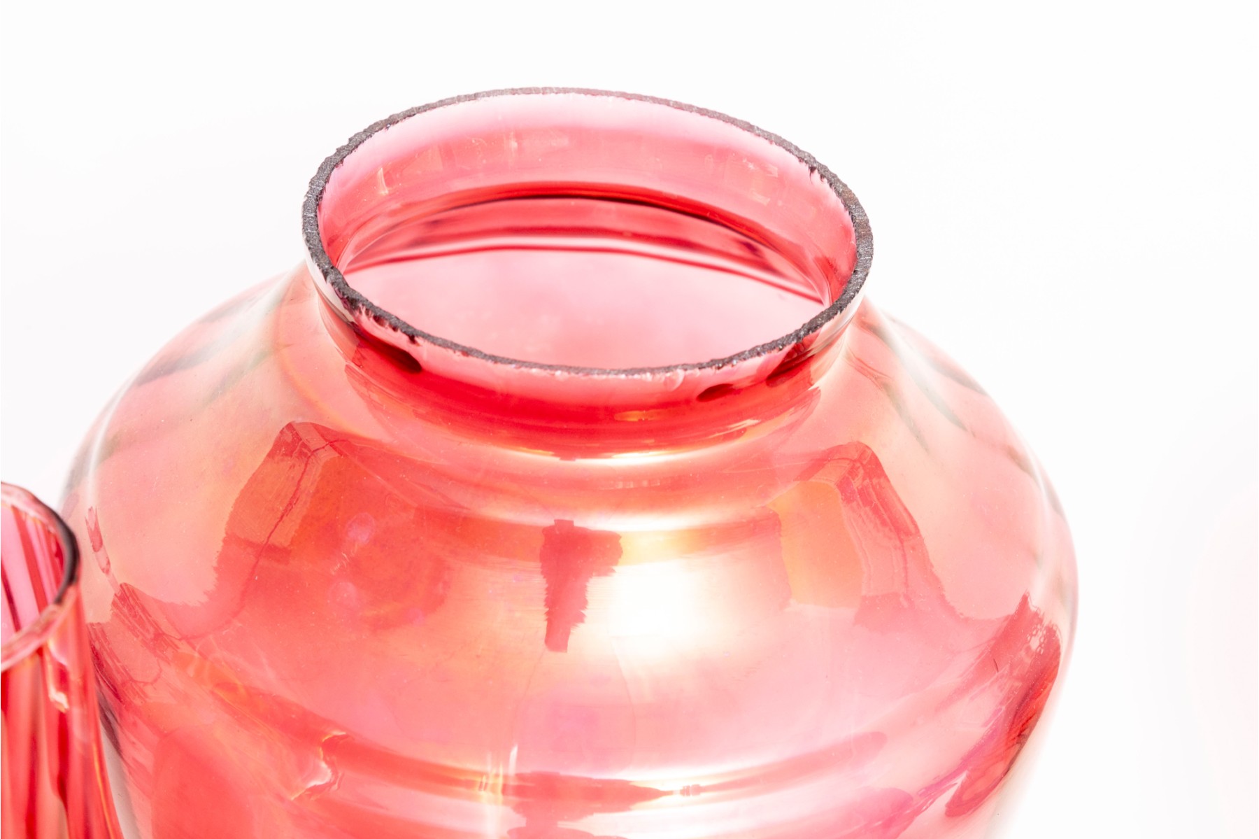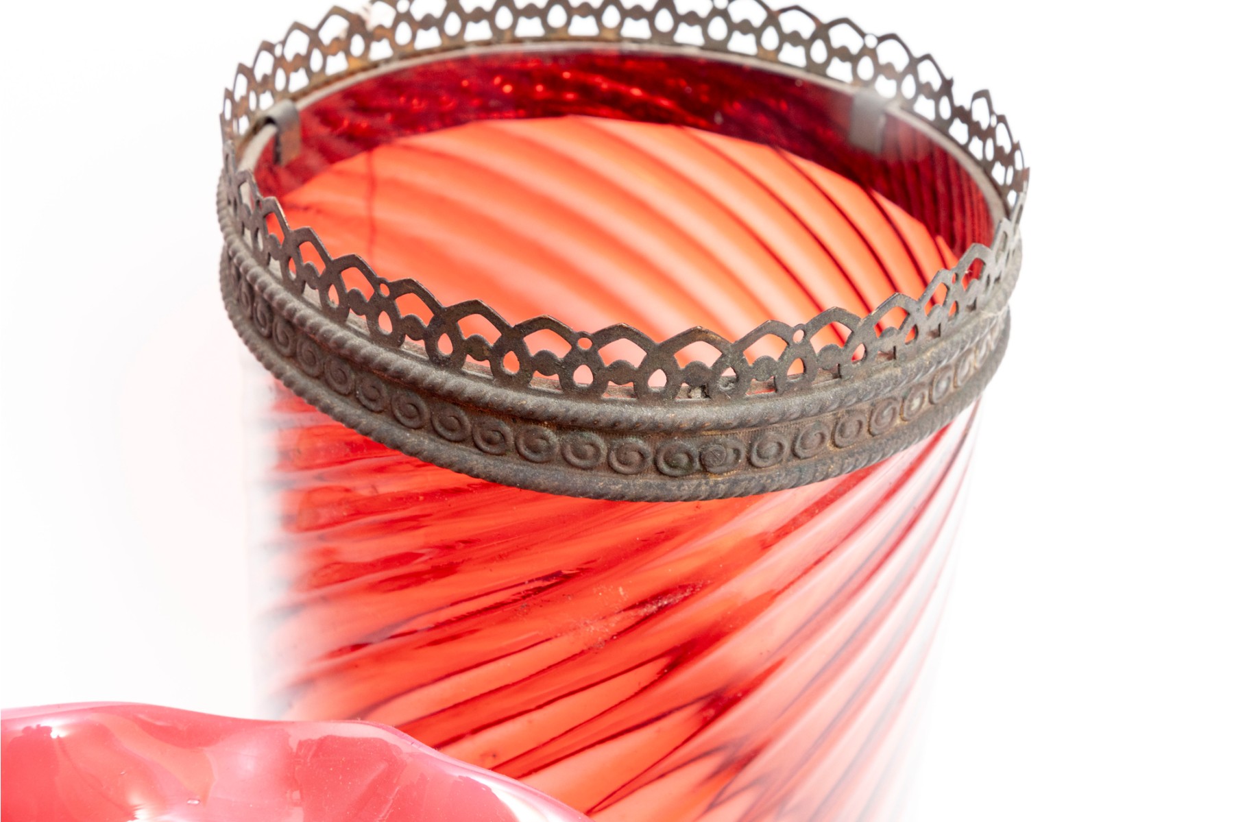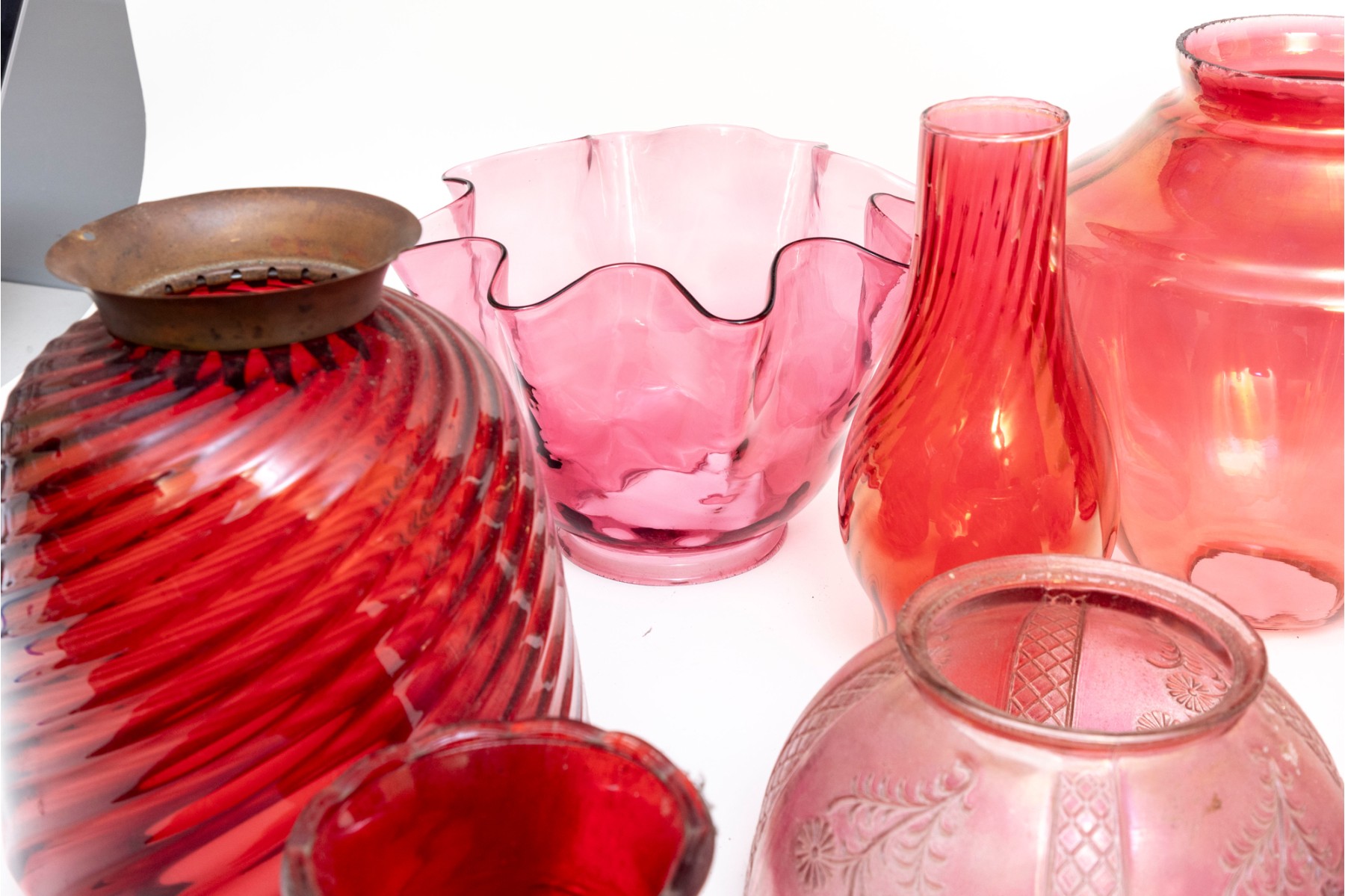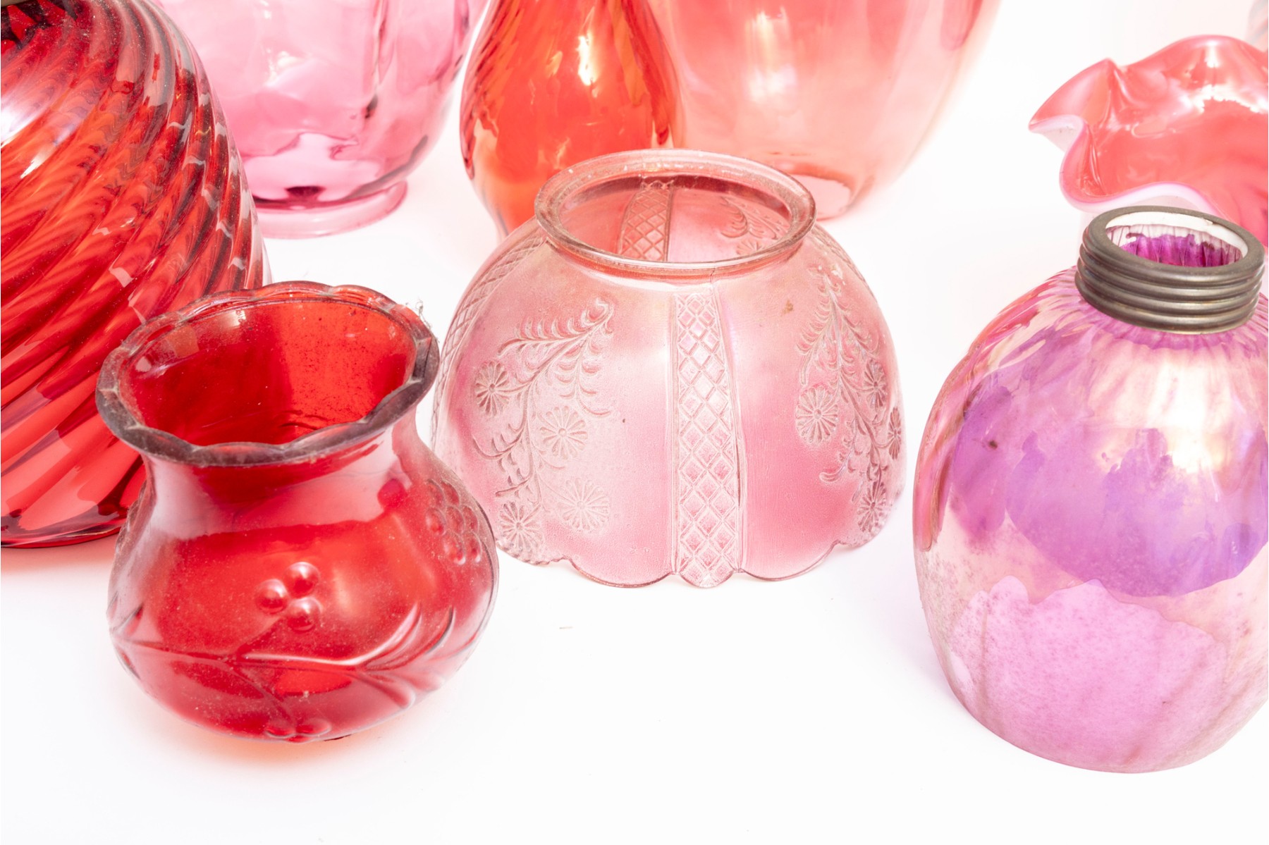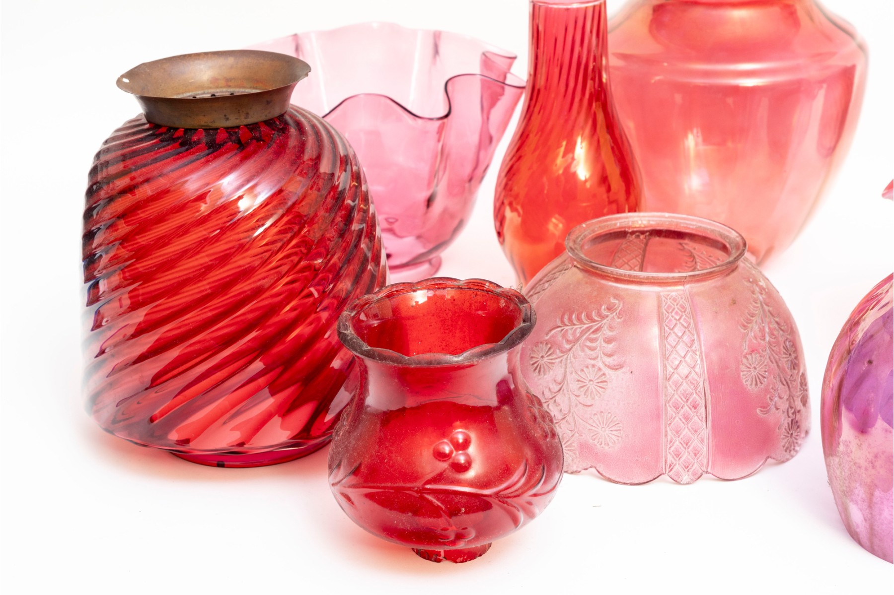 A collection of vintage cranberry glass shades including opalescent, dark red, pink, and white hues.
