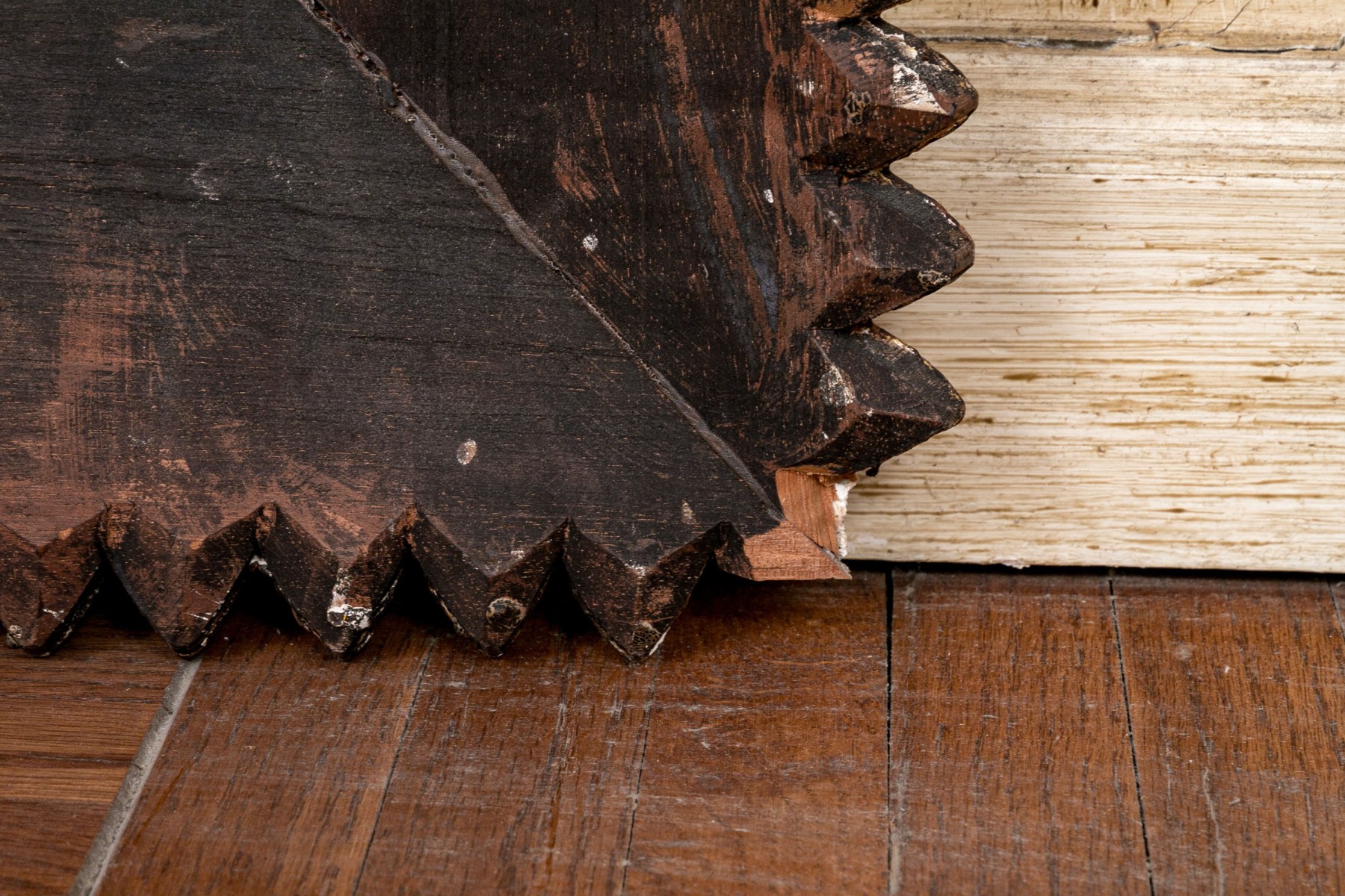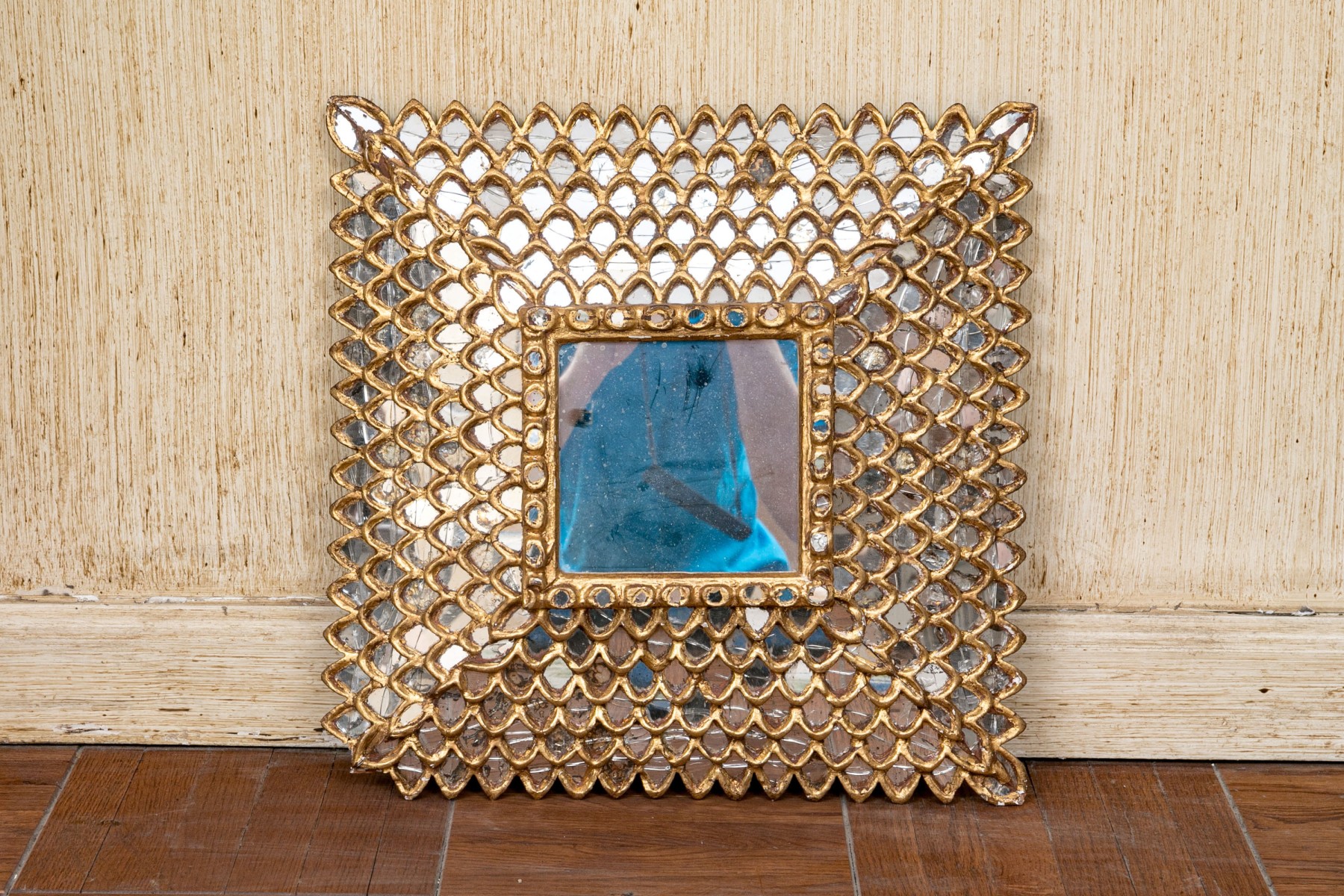 The wide carved wood frame with a raised gilt overall feather motif with inlaid mirrors. The center mirror framed with circular mirrors.