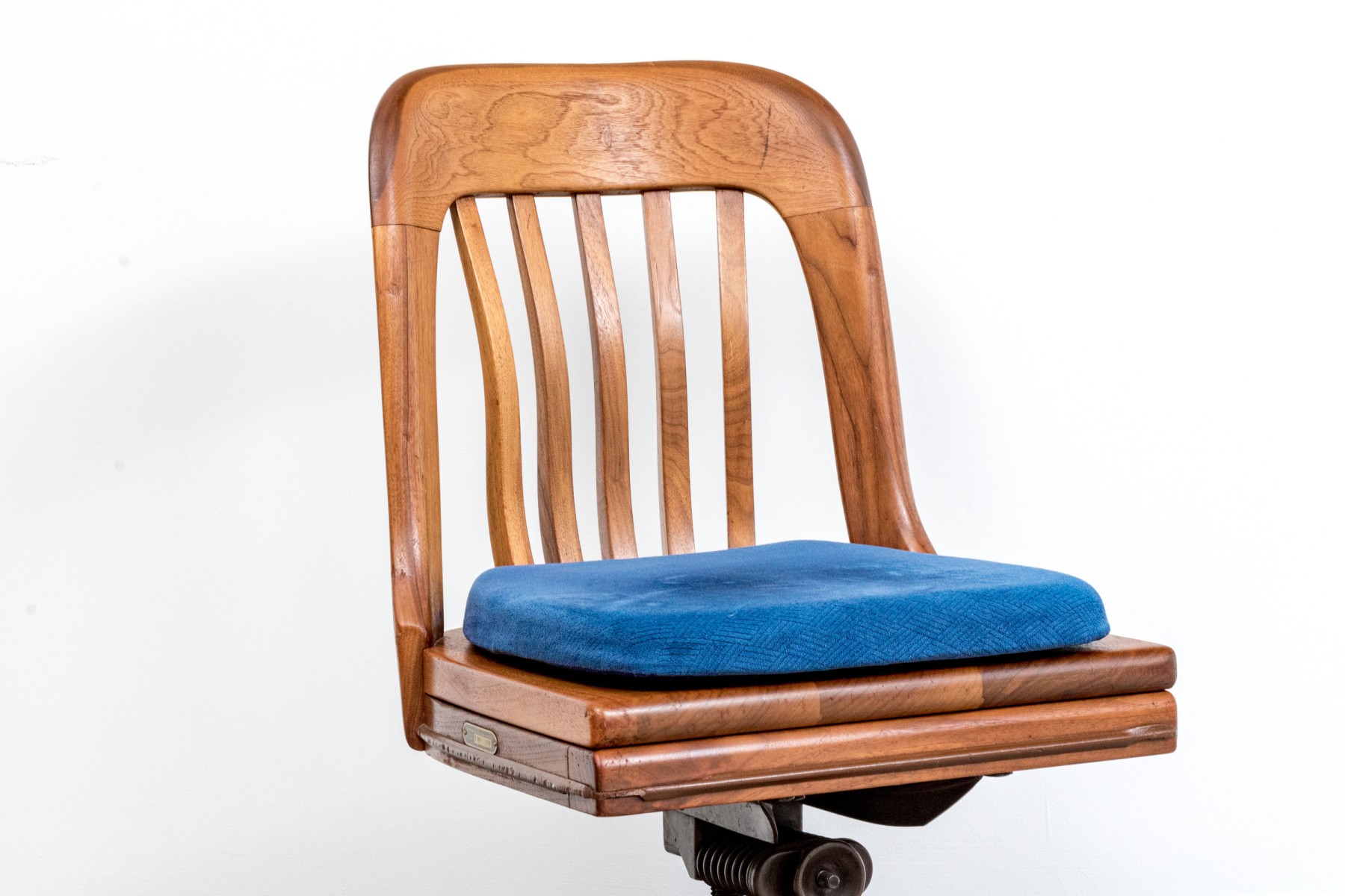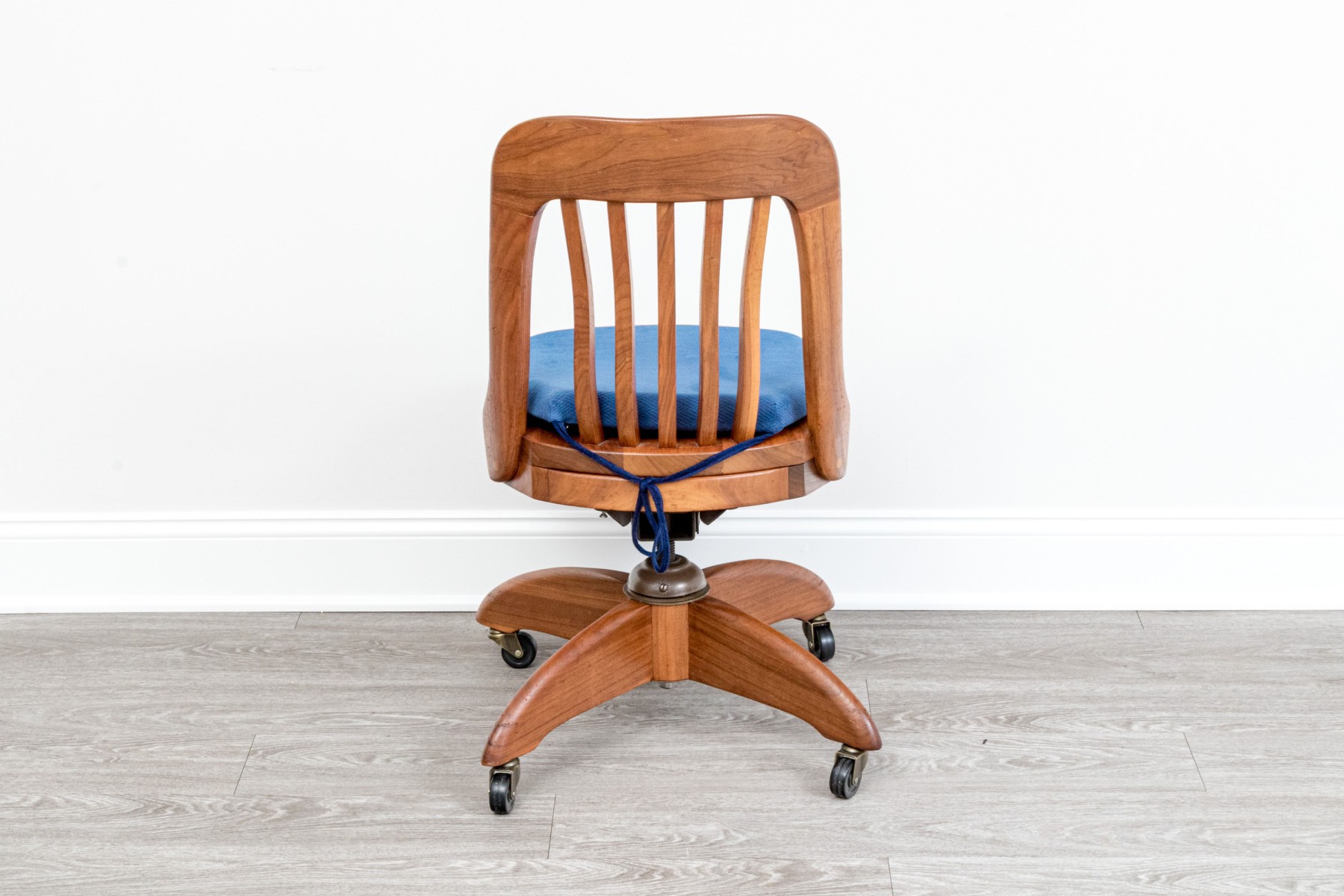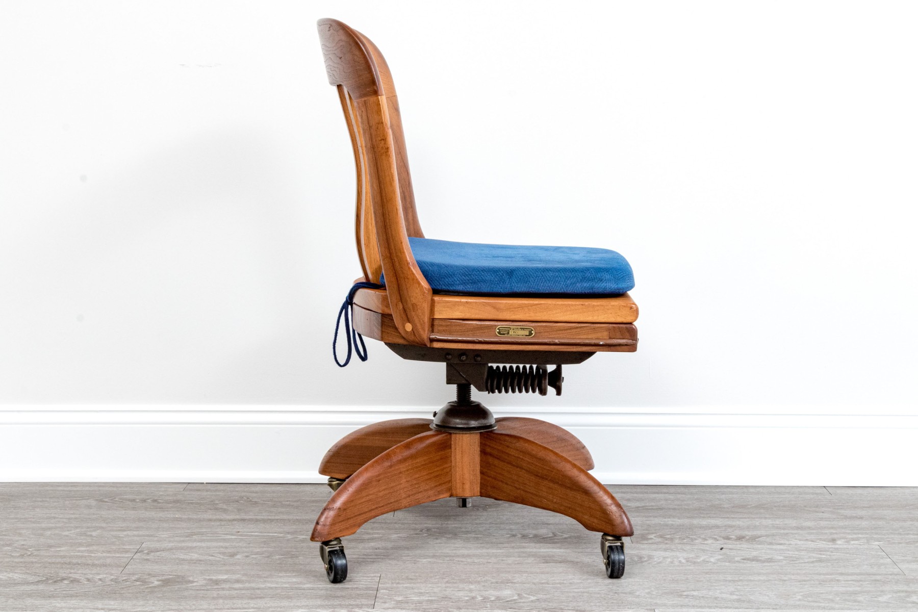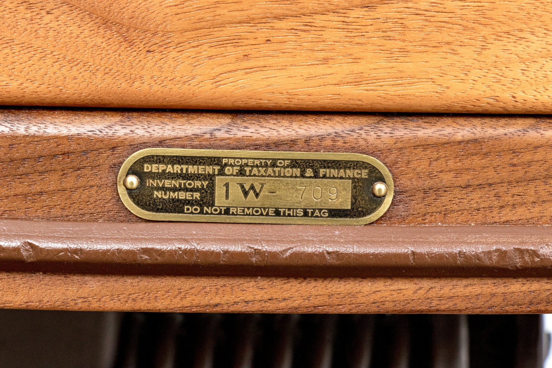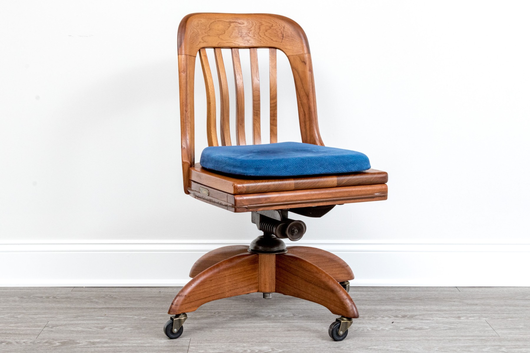 A handsome vintage oak swivel office chair in a warm-toned medium-light brown finish. Features a rounded top rail with a bent slat splat, leading to a squared seat topped with a blue cushion. The chair is supported by four-pronged legs over caster feet. A brass plaque label on the side reads "Property of Department of Taxation & Finance / Inventory Number 1W-709 / Do not remove."