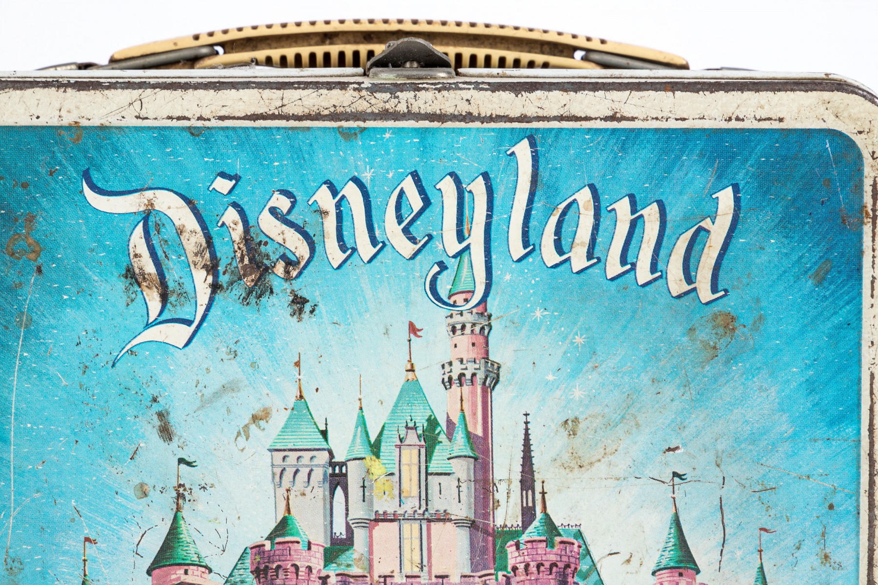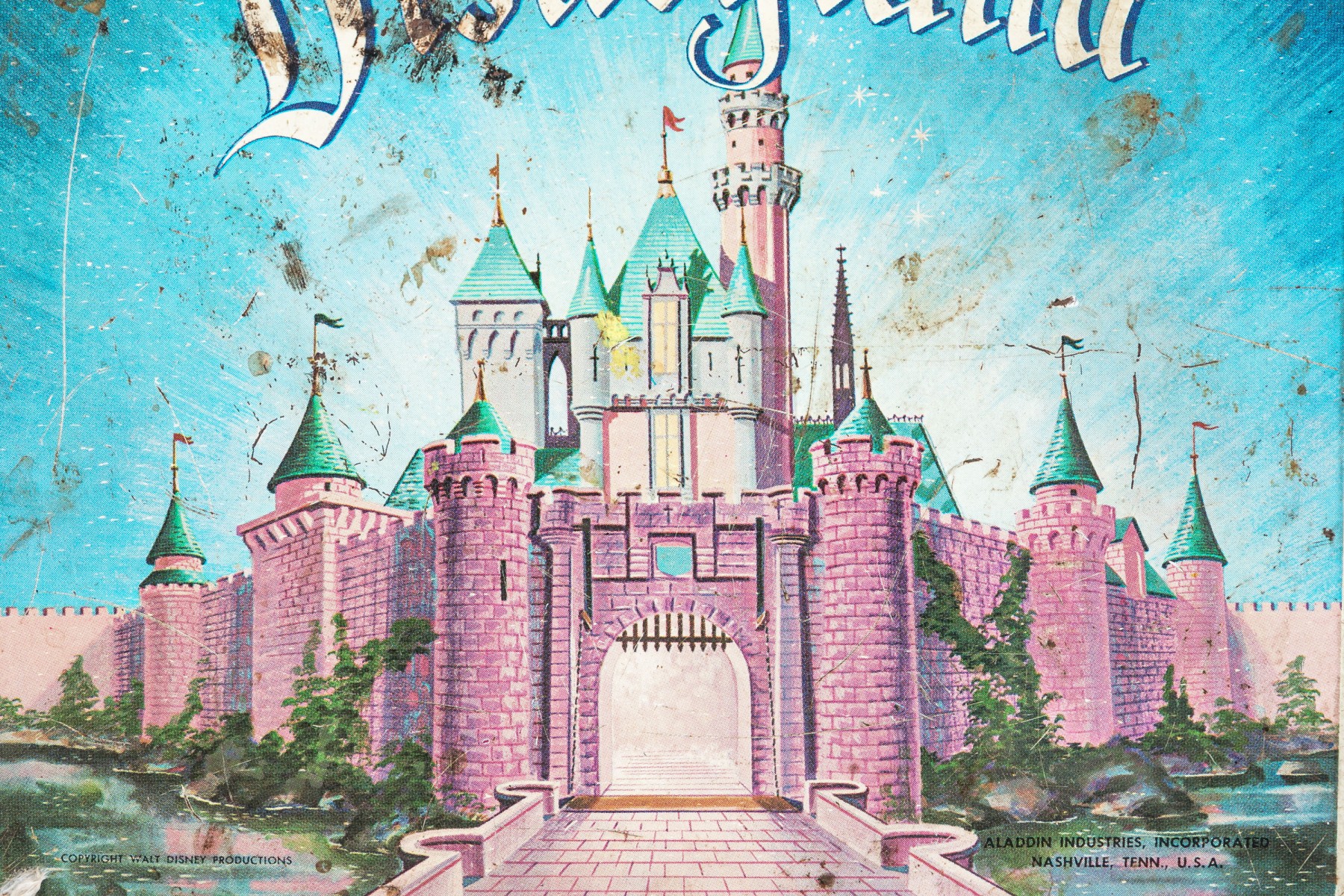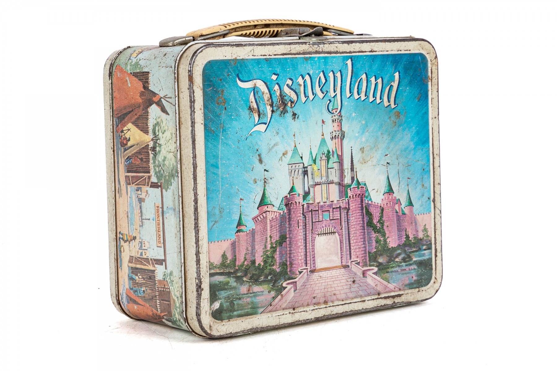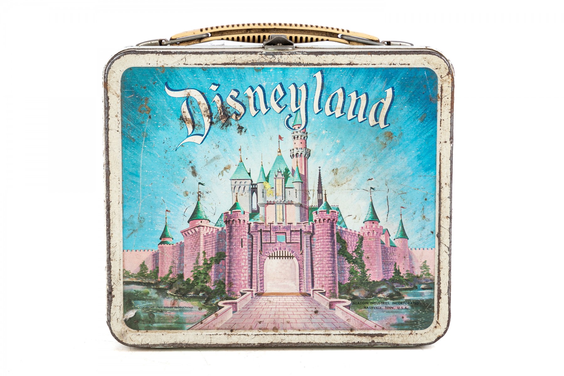 Vintage Disneyland tin litho lunch box with Disney castle on front. Copyright Aladdin Industries, Nashville, Tenn., USA. No thermos.