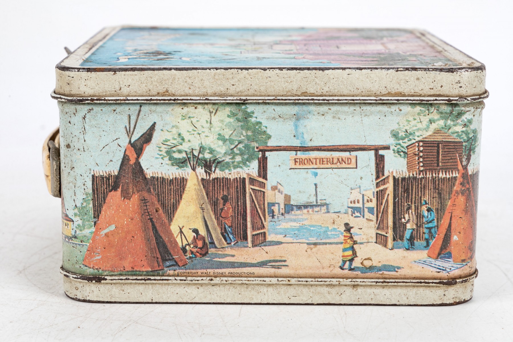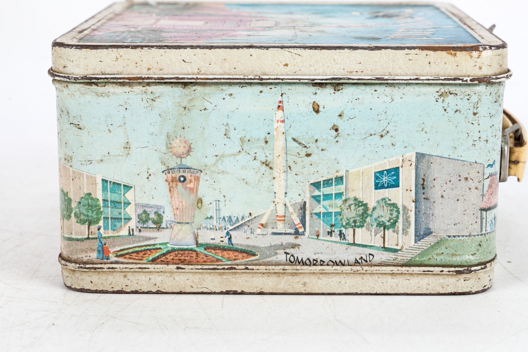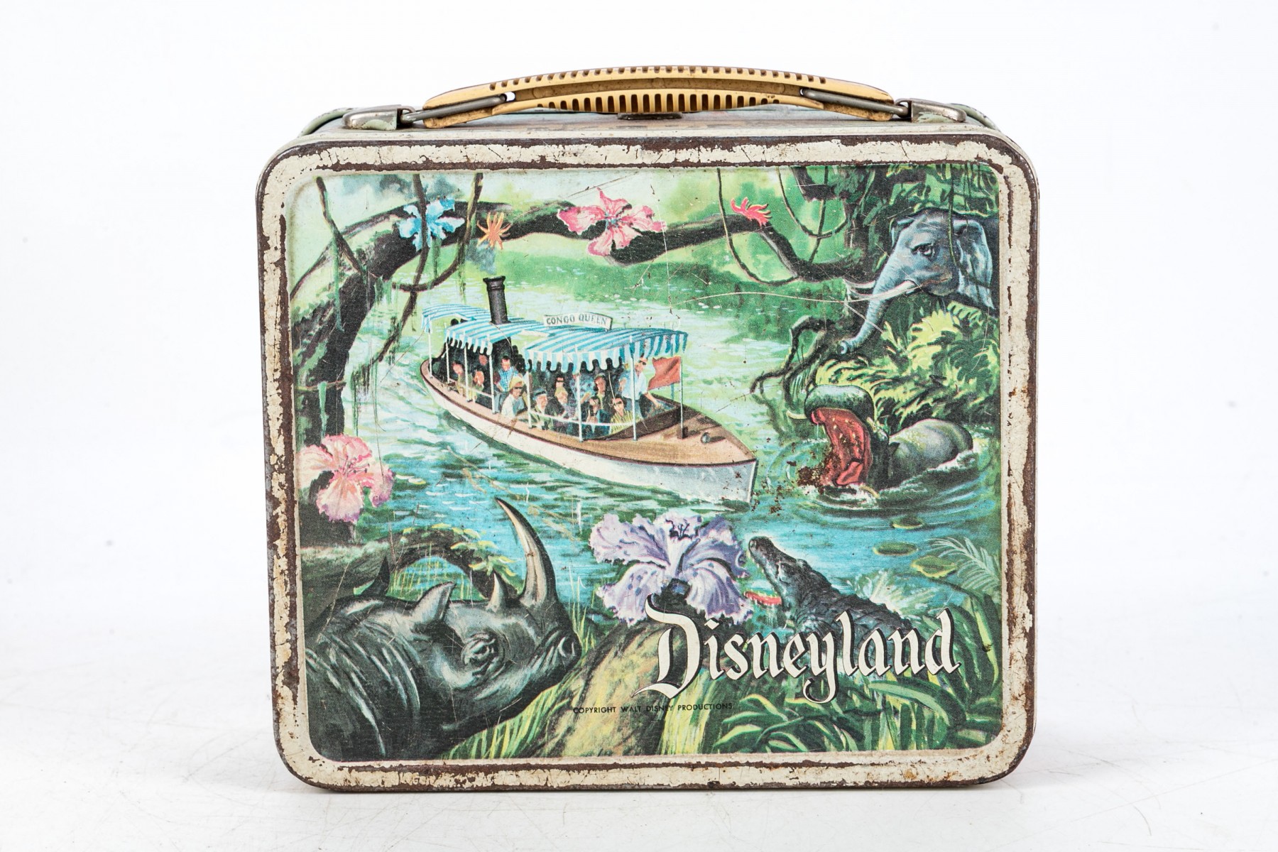 Vintage Disneyland tin litho lunch box with Disney castle on front. Copyright Aladdin Industries, Nashville, Tenn., USA. No thermos.