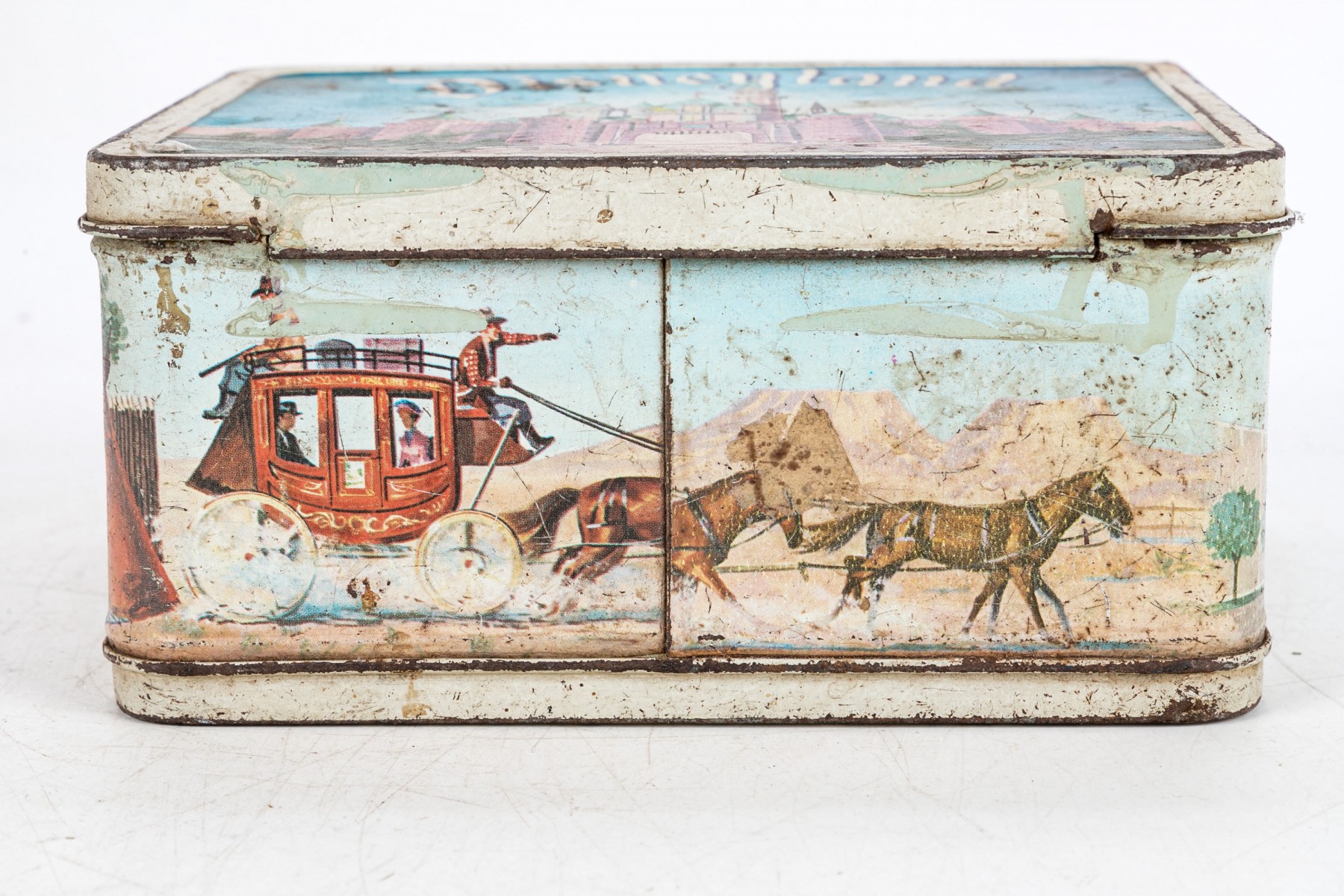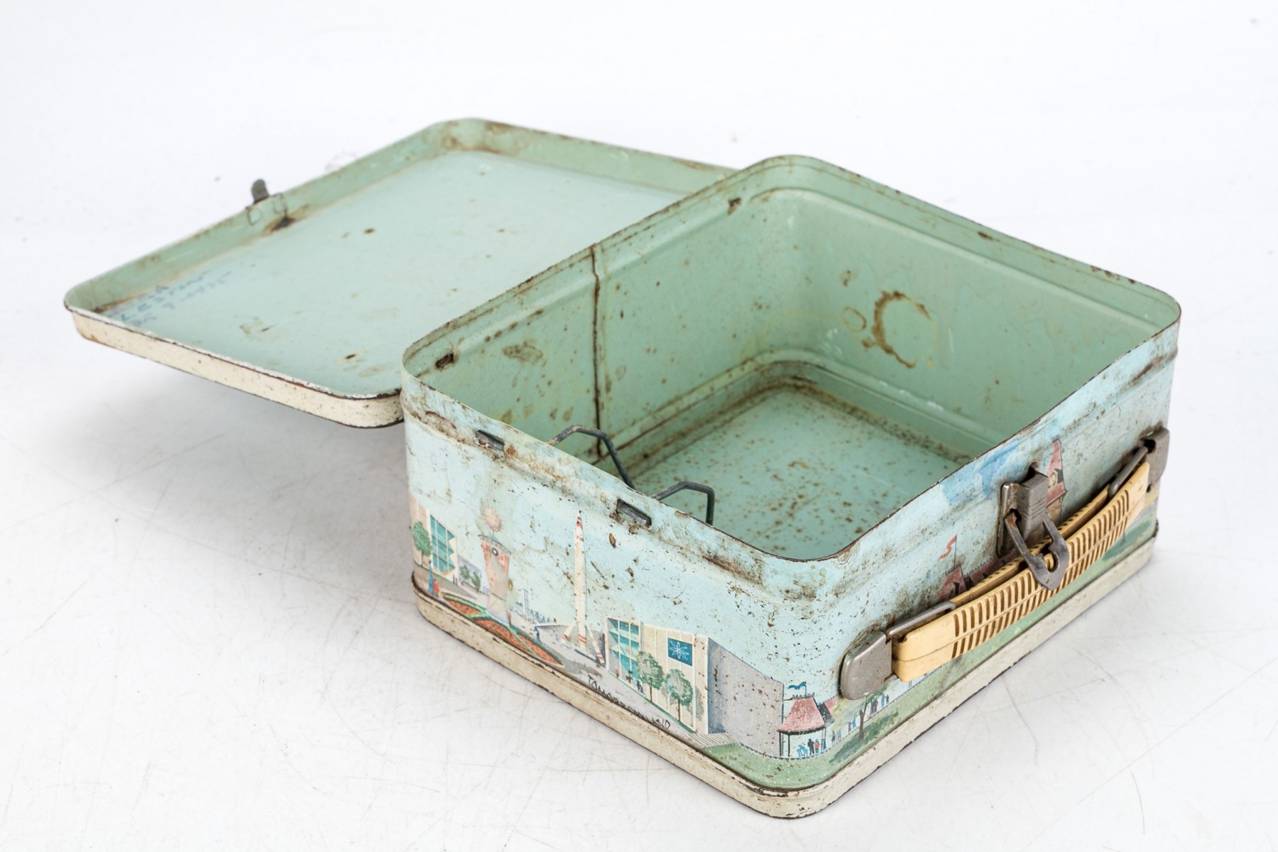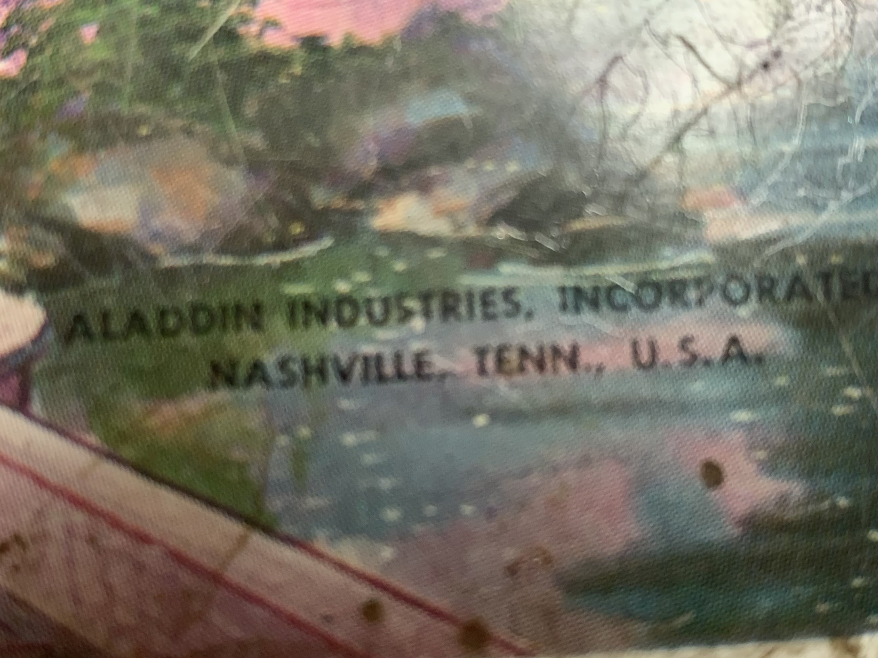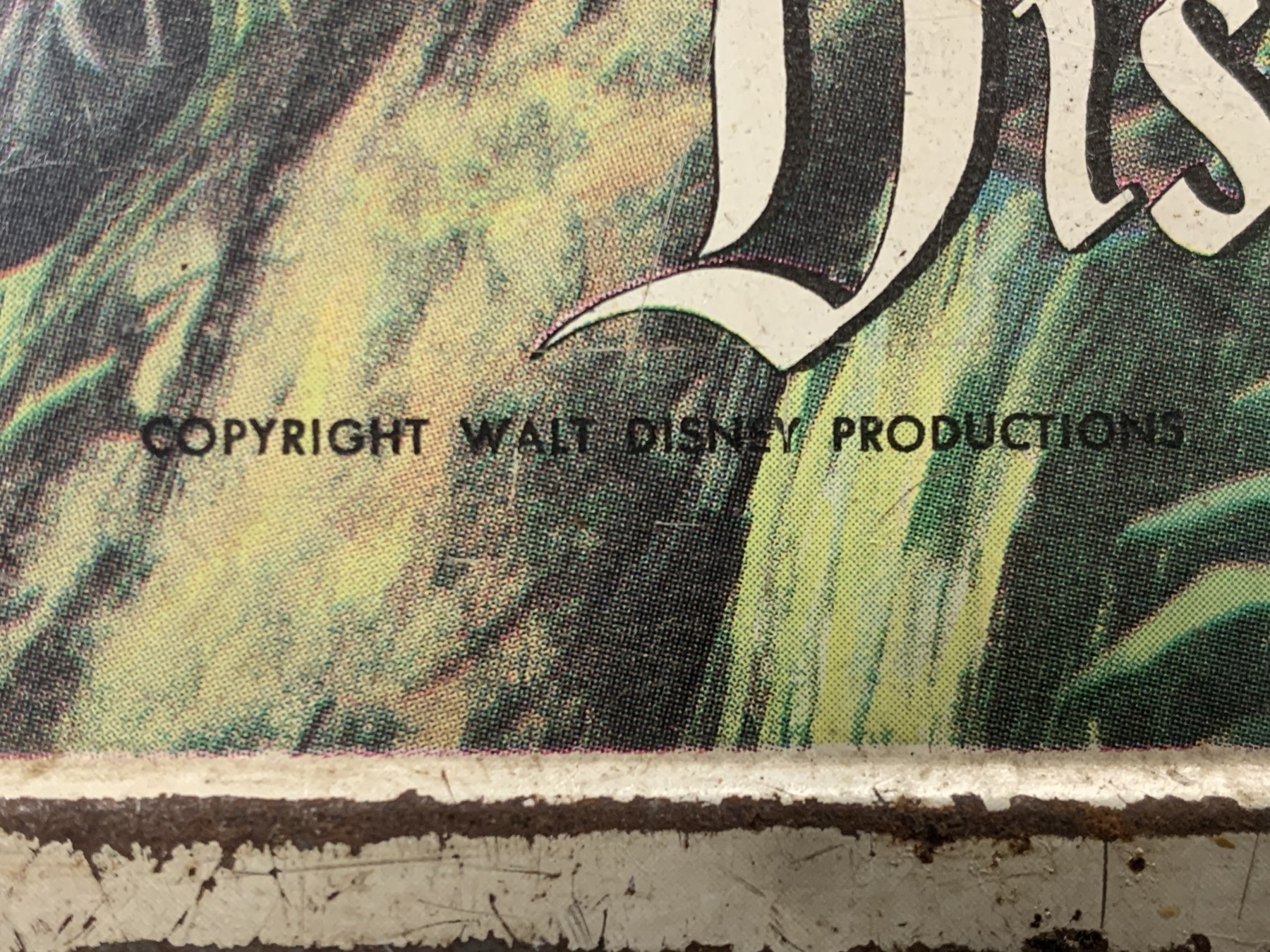 Vintage Disneyland tin litho lunch box with Disney castle on front. Copyright Aladdin Industries, Nashville, Tenn., USA. No thermos.