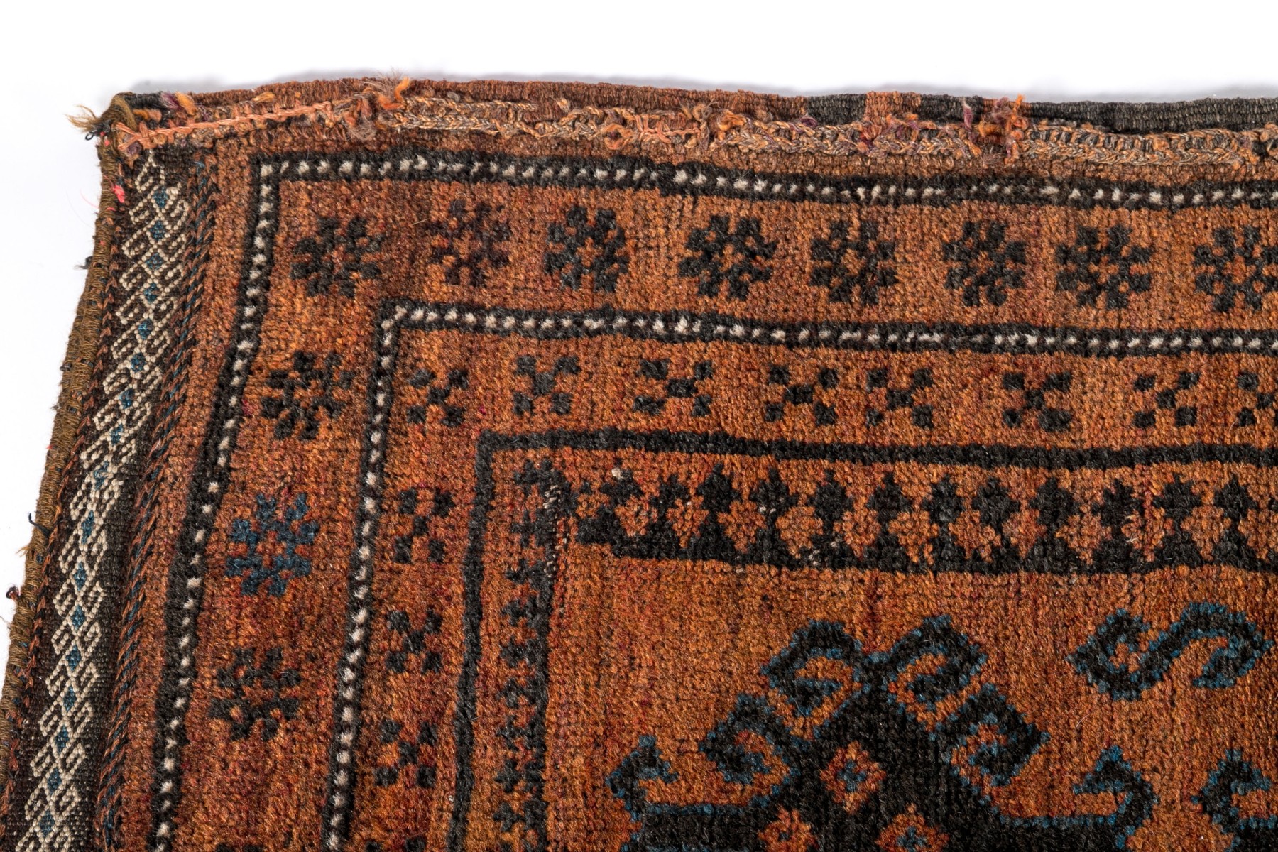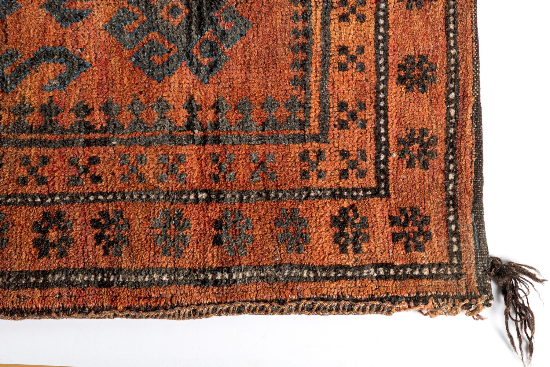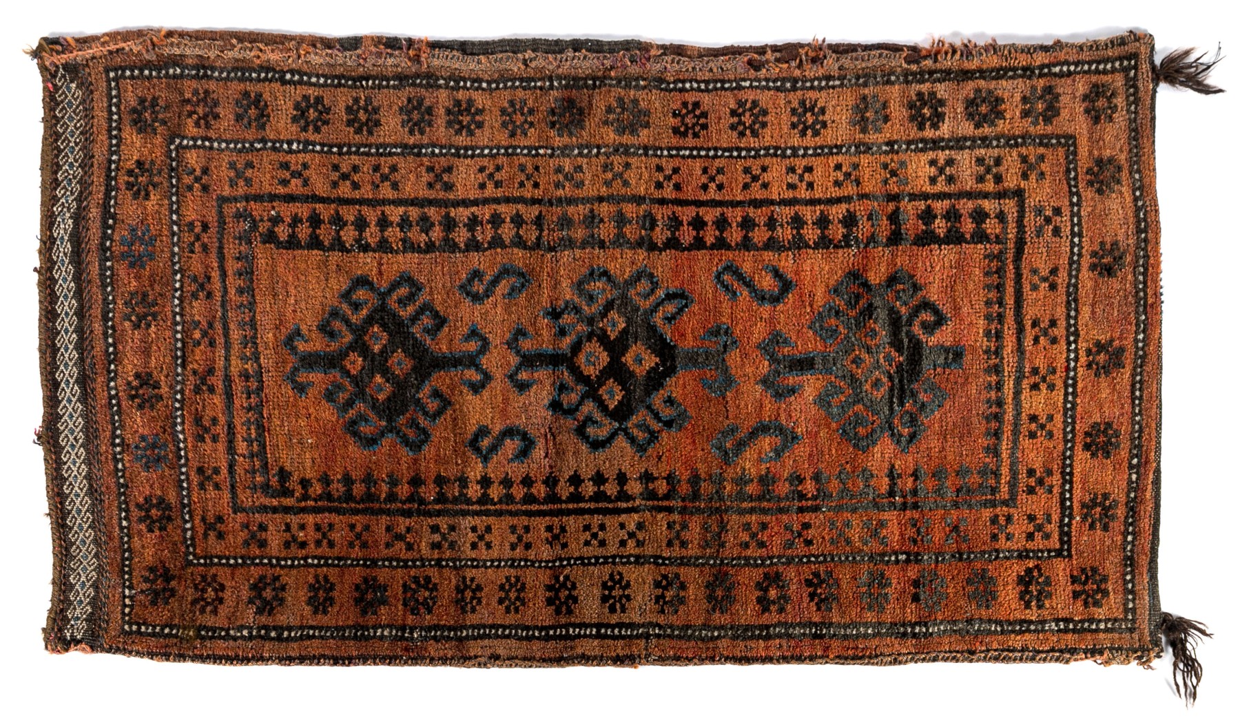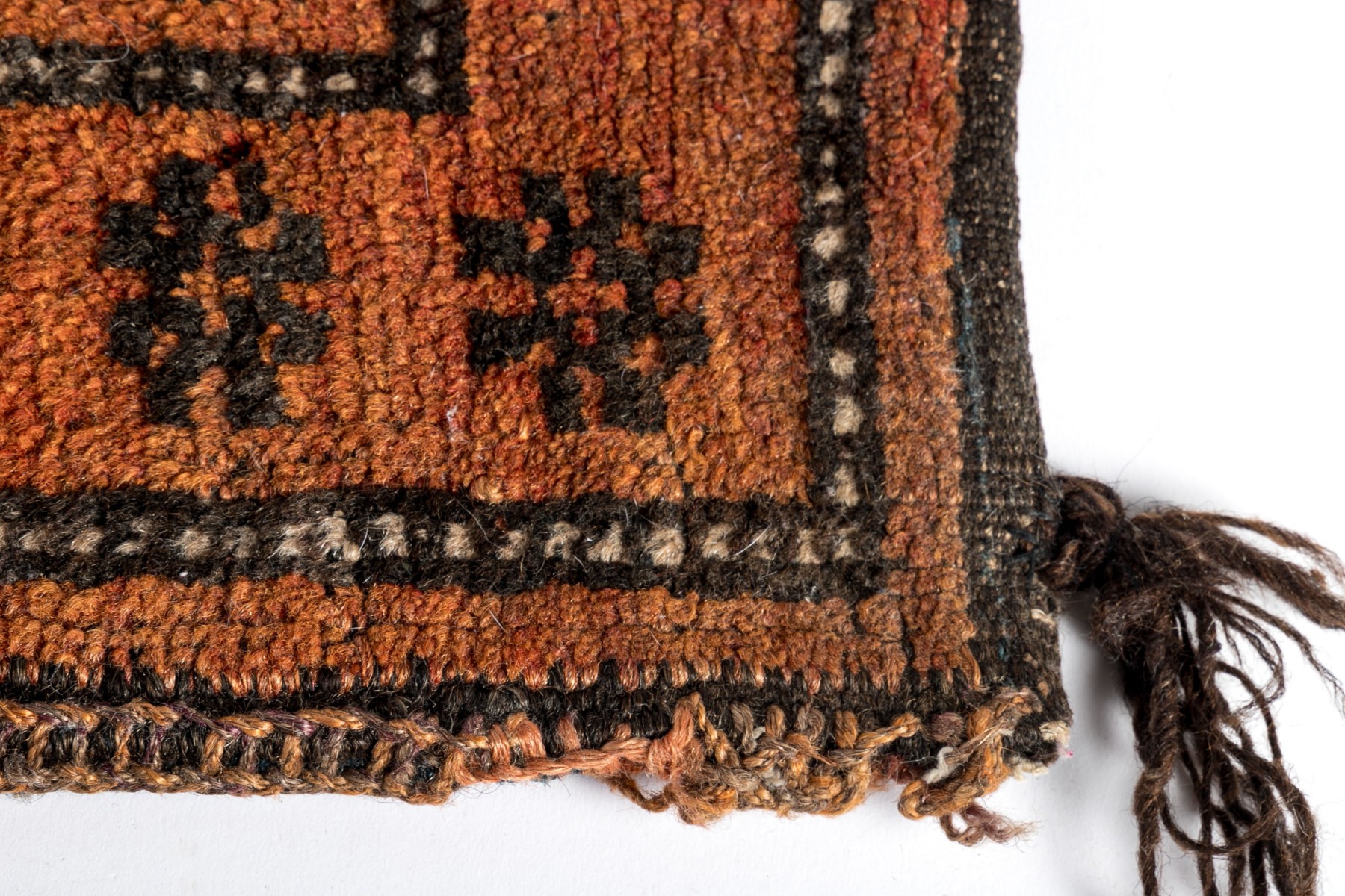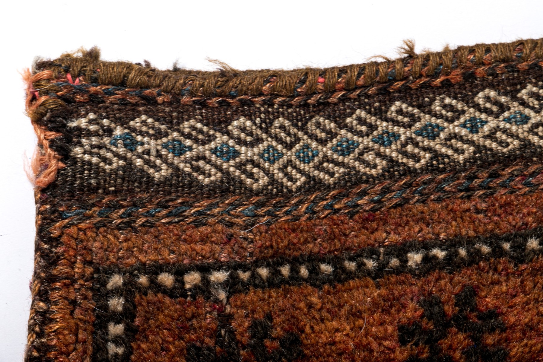 A fabulous vintage distressed wool scatter mat displaying beautiful rust-red and brown with geometric black and blue motifs and white stippled borders. The mat is sewn together with a striped backing in complimenting hues, with one short side left open for potential use as a sack or pillow case.