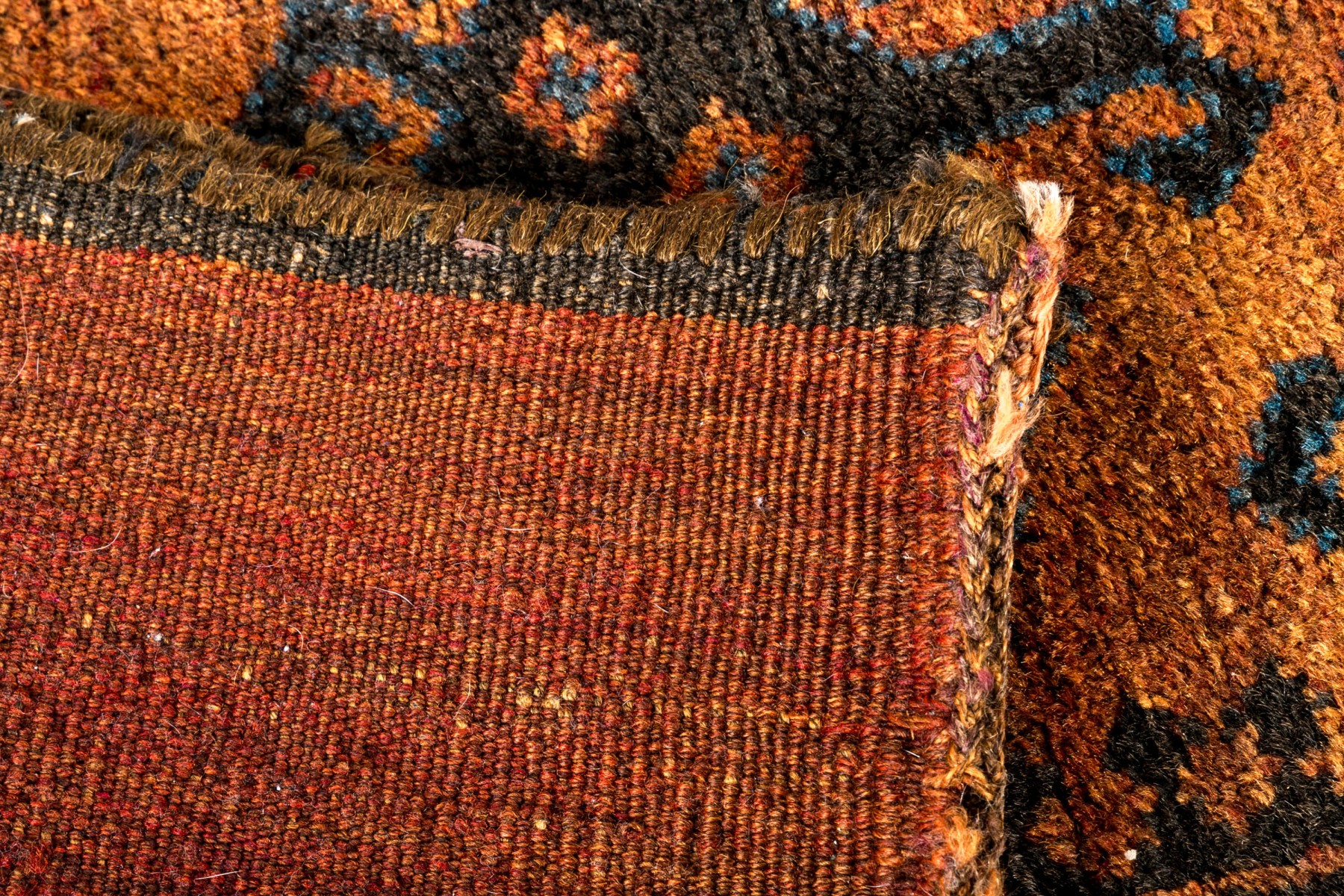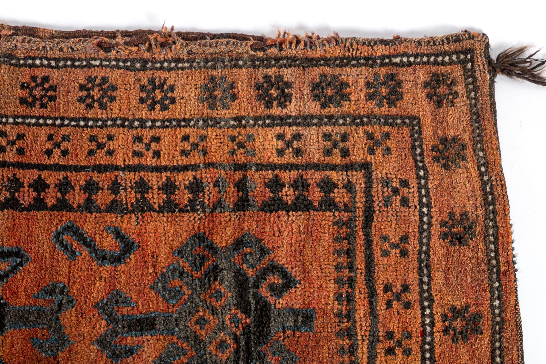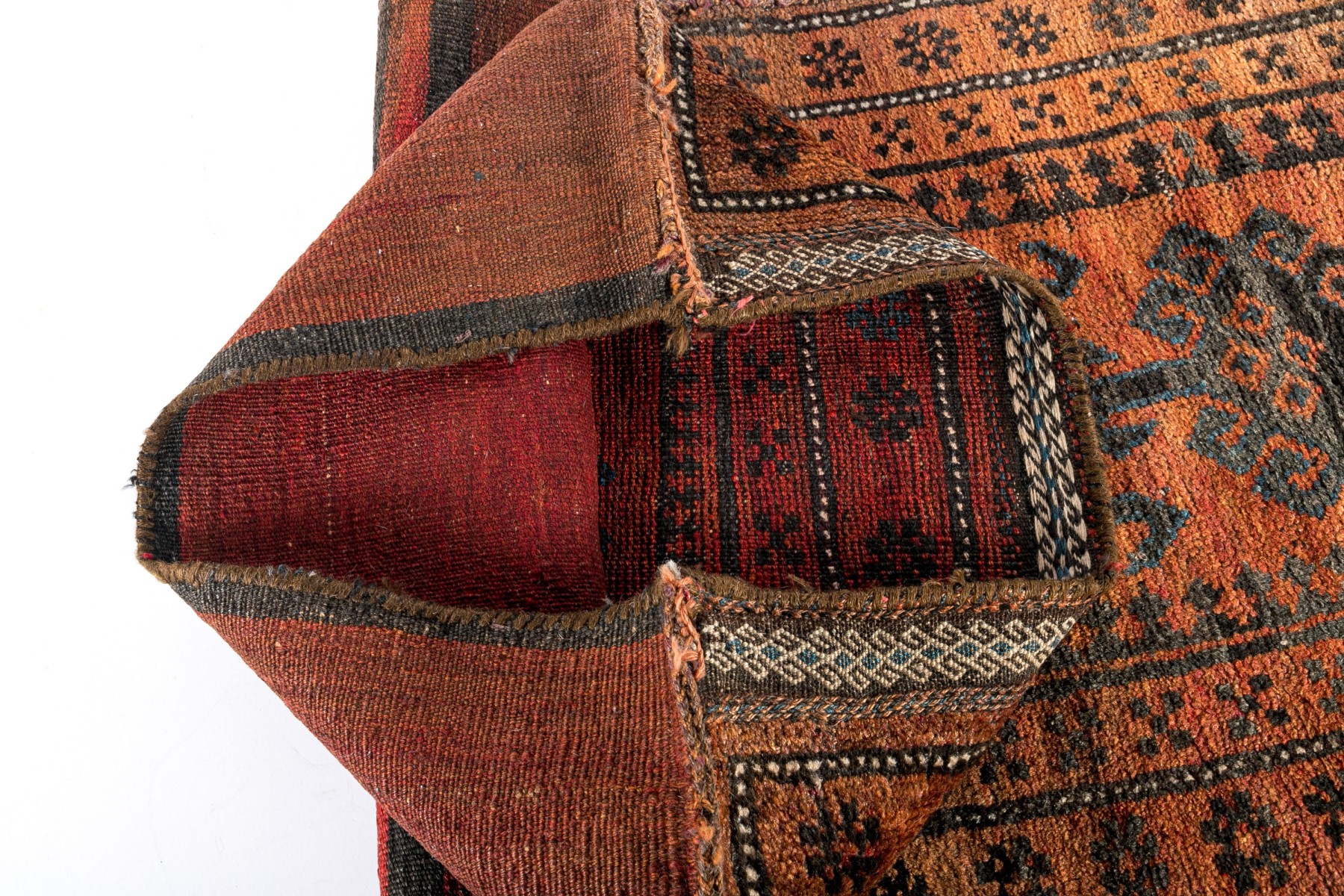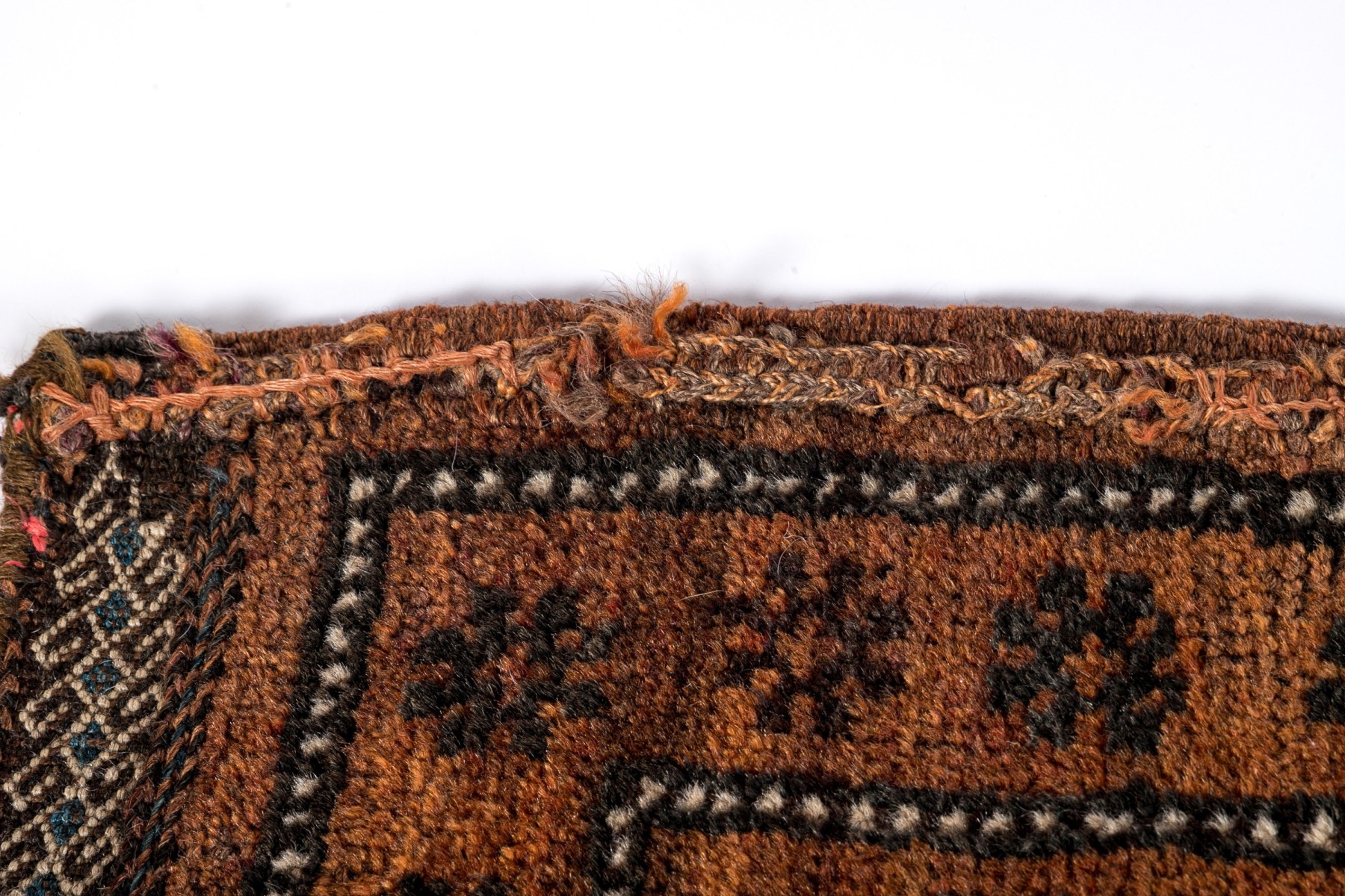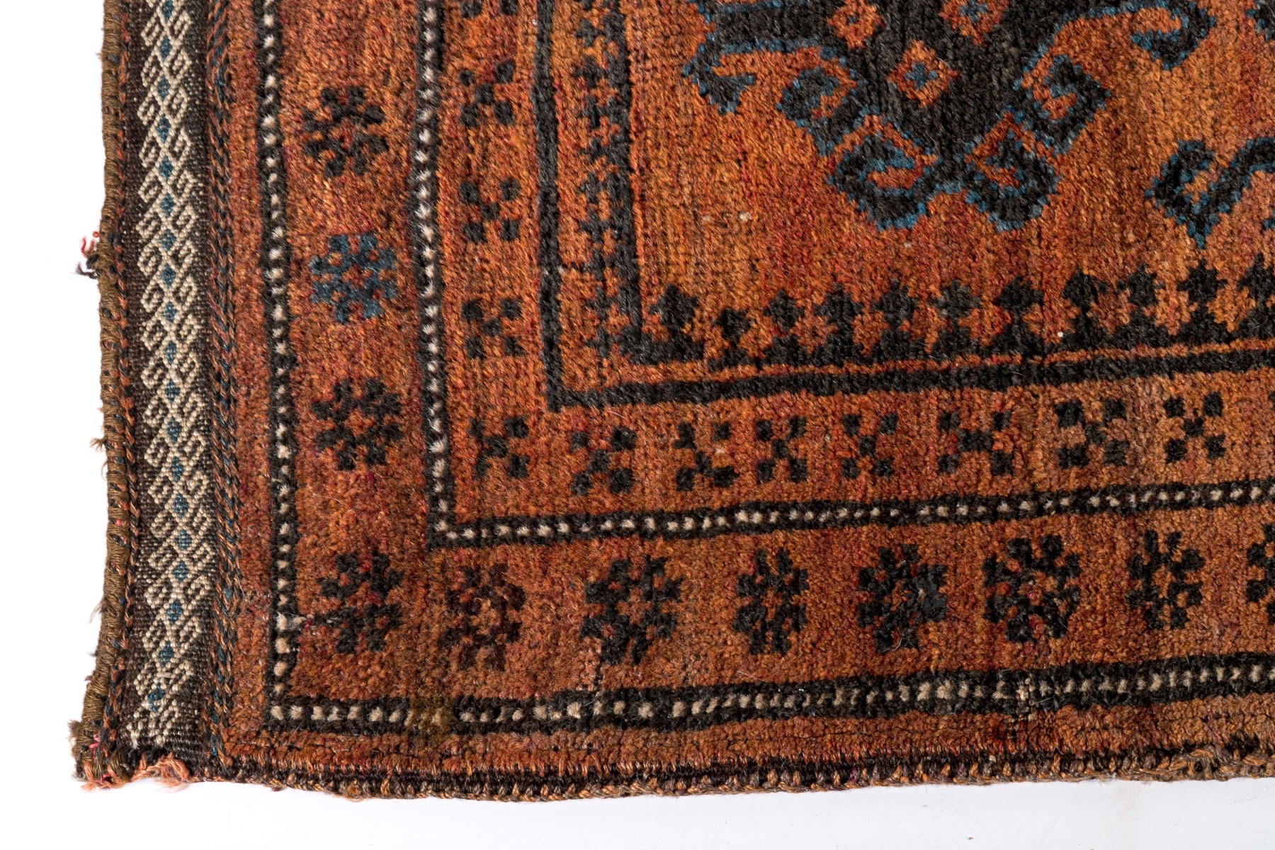 A fabulous vintage distressed wool scatter mat displaying beautiful rust-red and brown with geometric black and blue motifs and white stippled borders. The mat is sewn together with a striped backing in complimenting hues, with one short side left open for potential use as a sack or pillow case.
