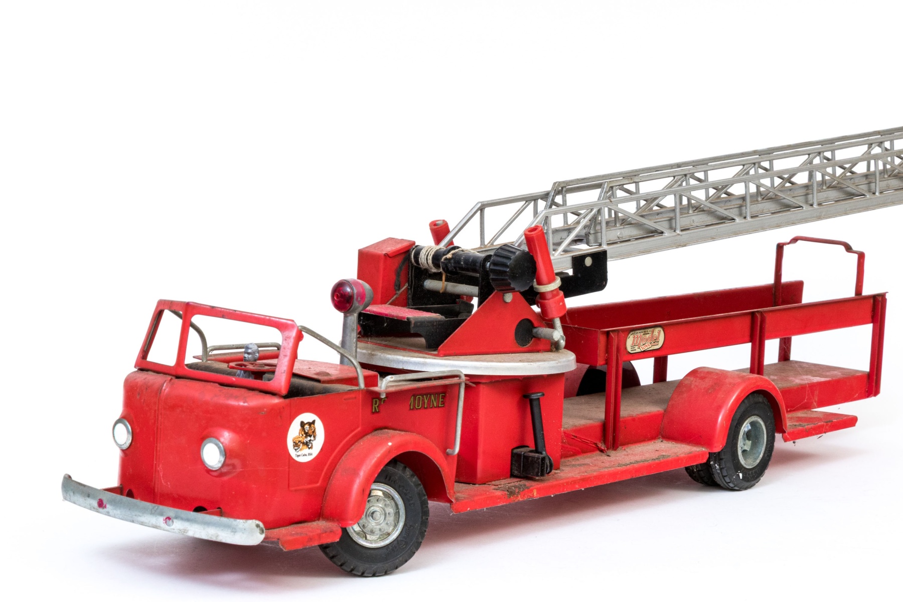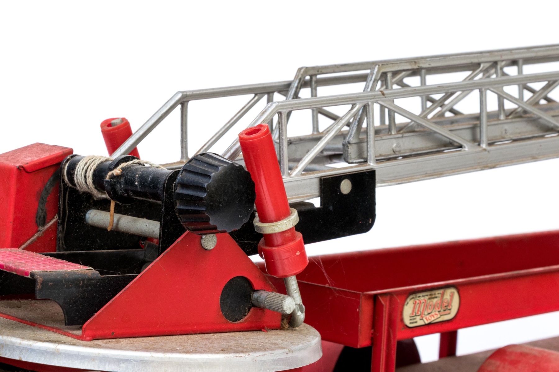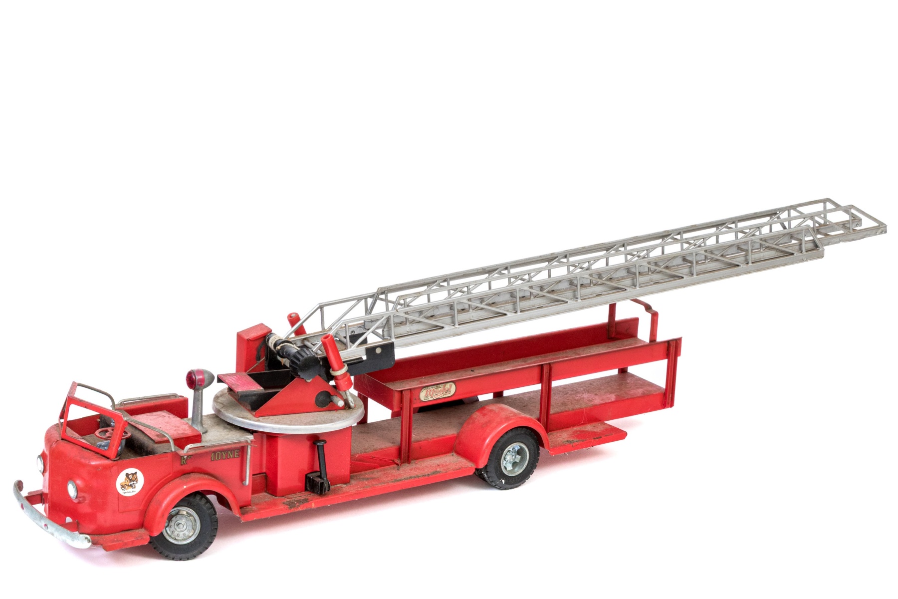A charming vintage Doepke Toys cast metal fire engine model with its classic ladder and four wheels, labeled on side.