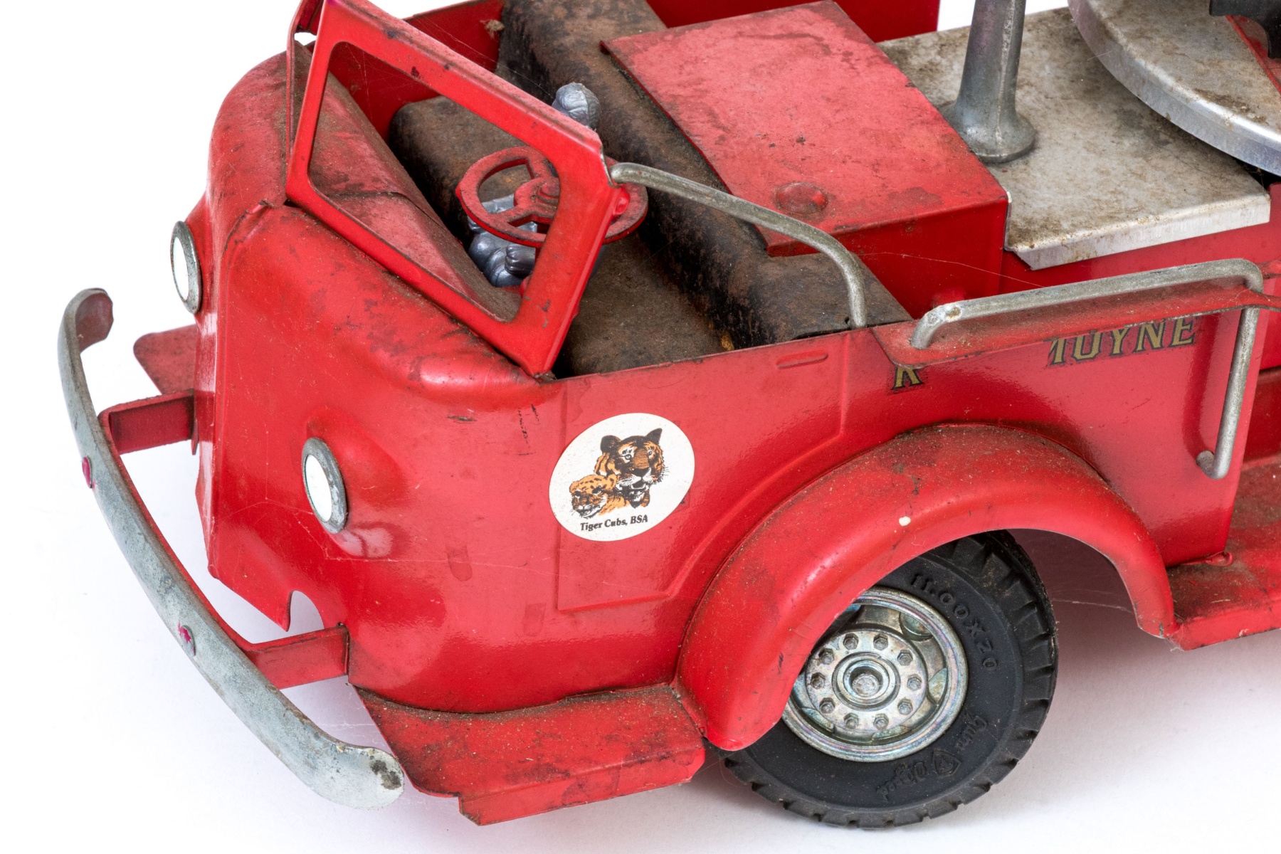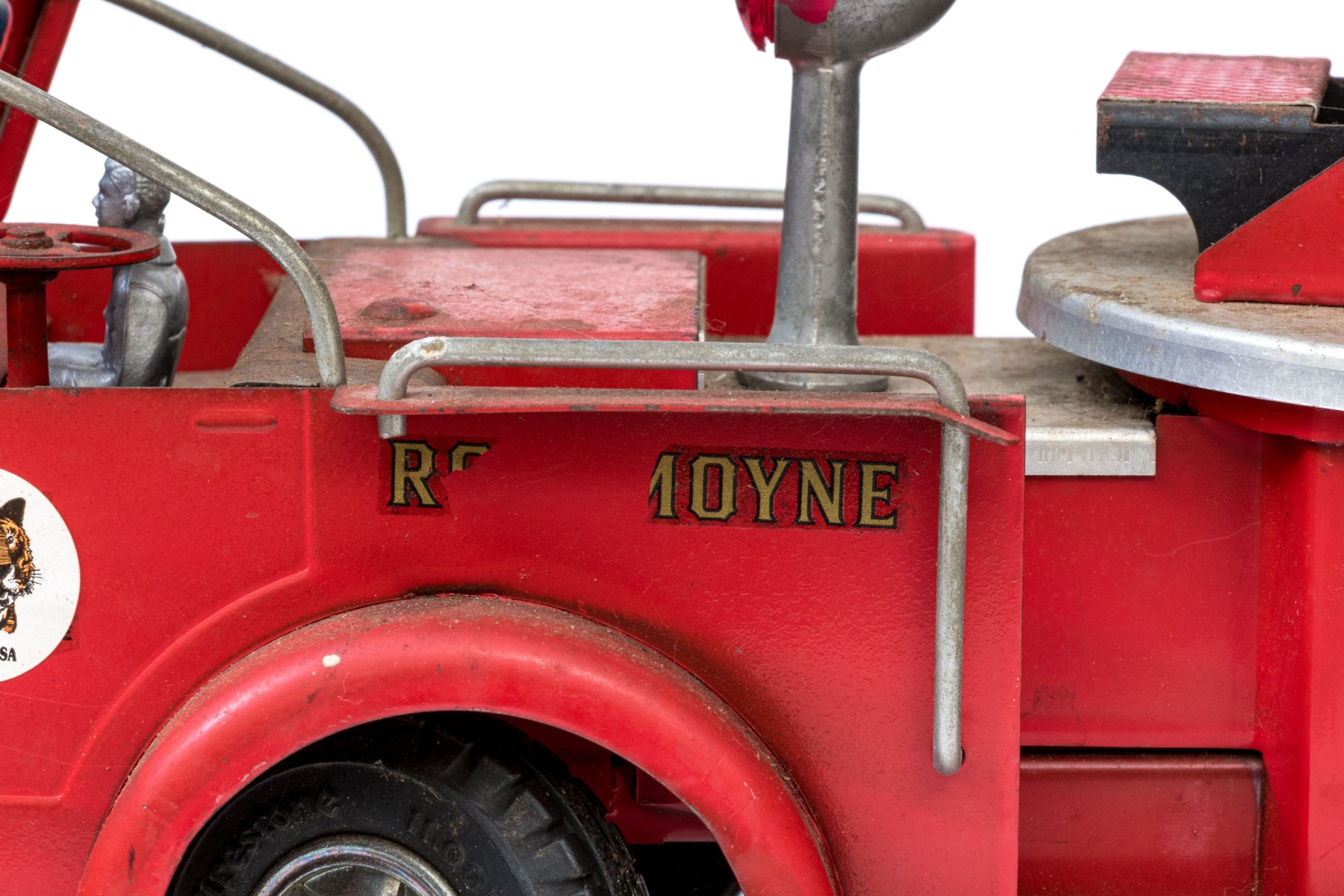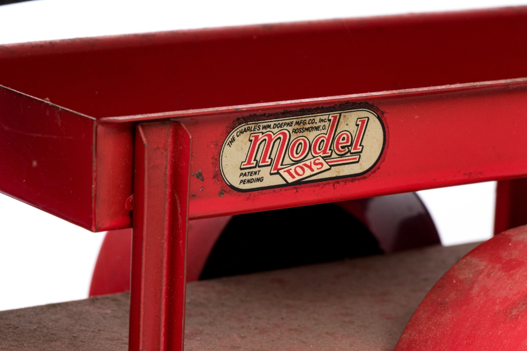 A charming vintage Doepke Toys cast metal fire engine model with its classic ladder and four wheels, labeled on side.