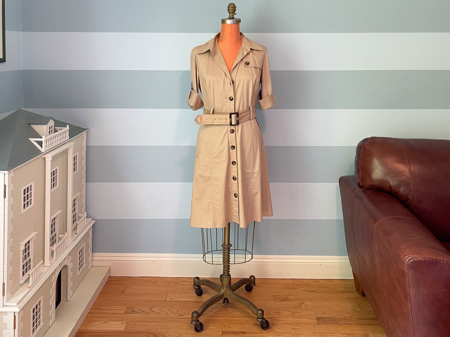 Presents well overall. Khaki trench dress not included. Wear including some staining and loose brass fittings with some evidence of oxidation and wear associated with age and use but despite the dress form is stable and presents well.