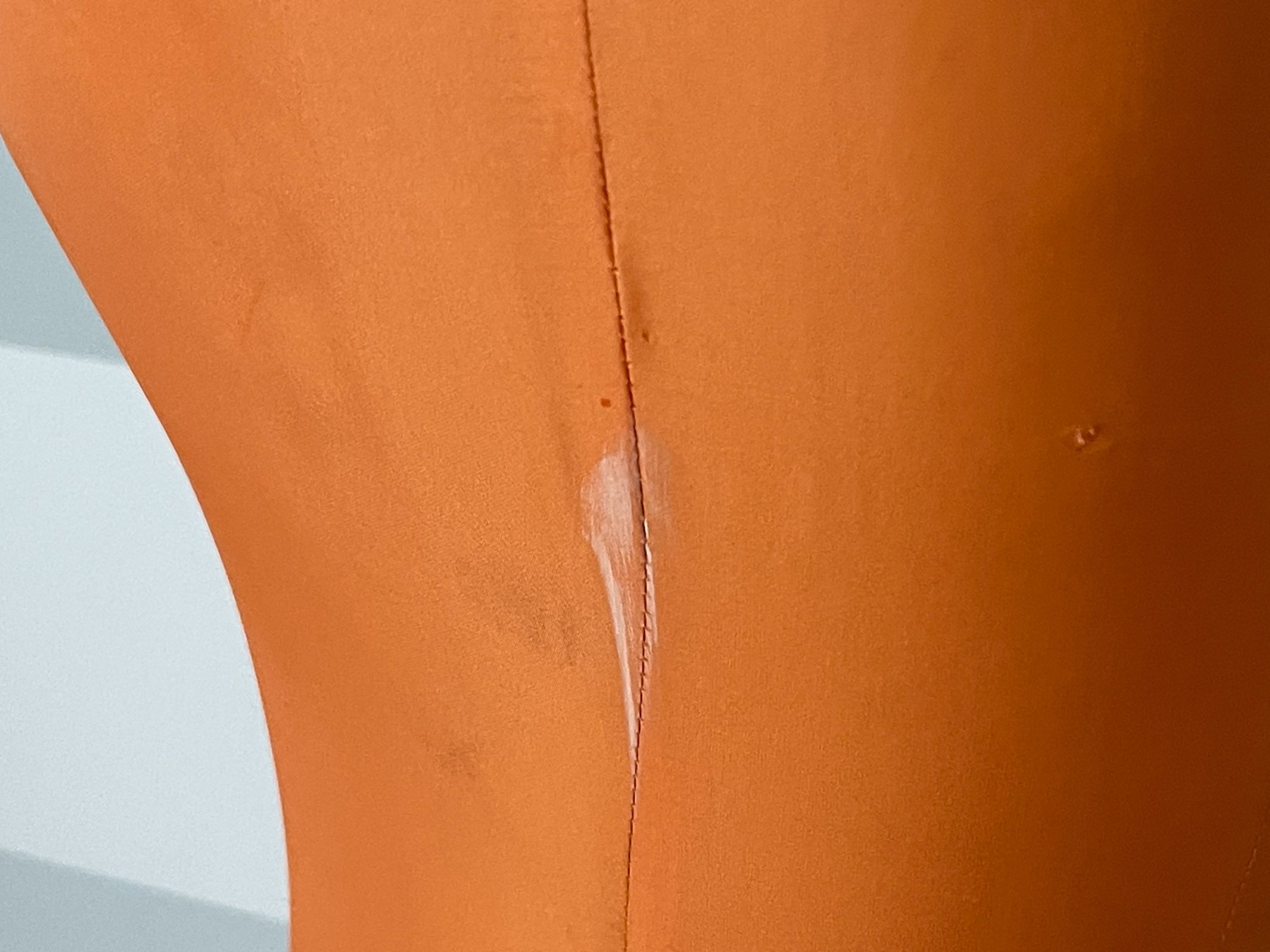 Wire frame with four casters and gilt finished frame with orange fabric body.