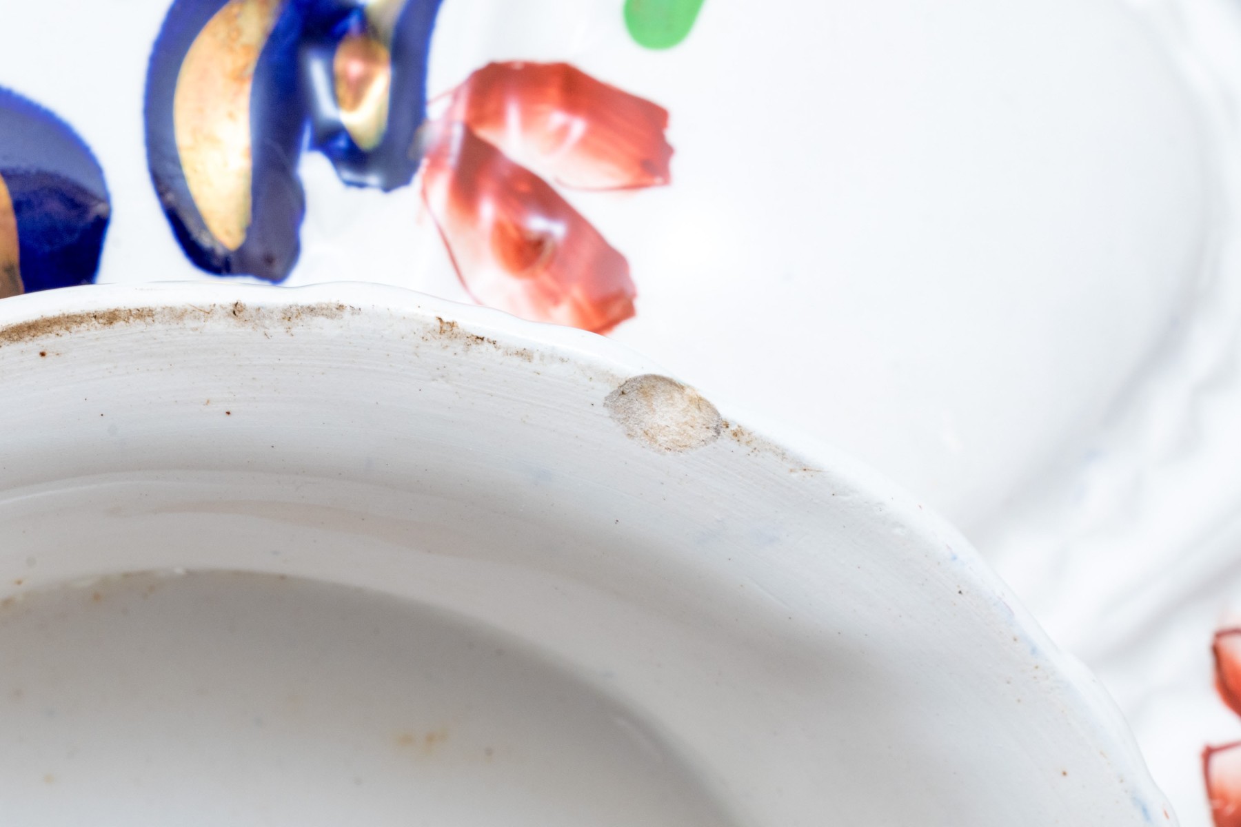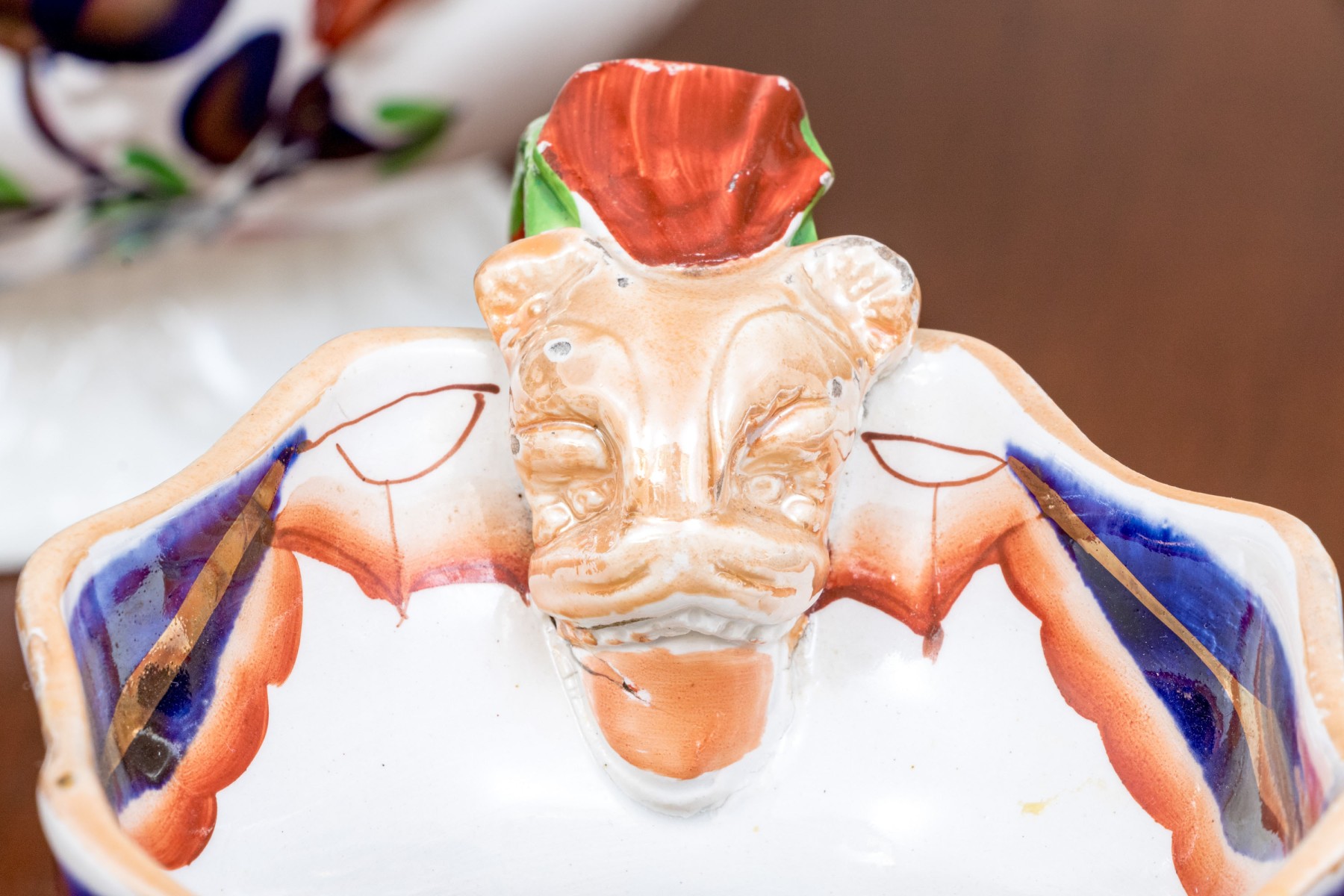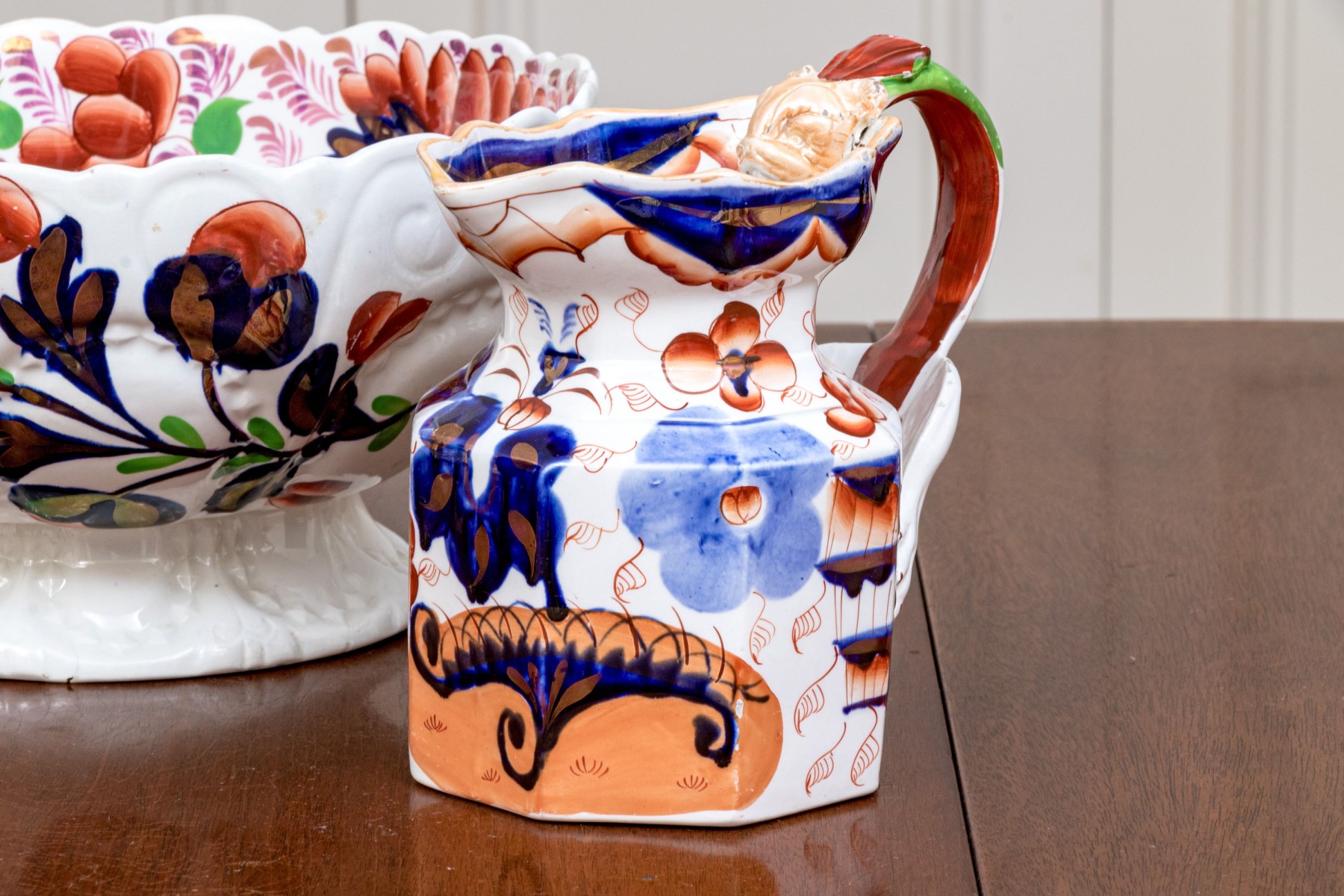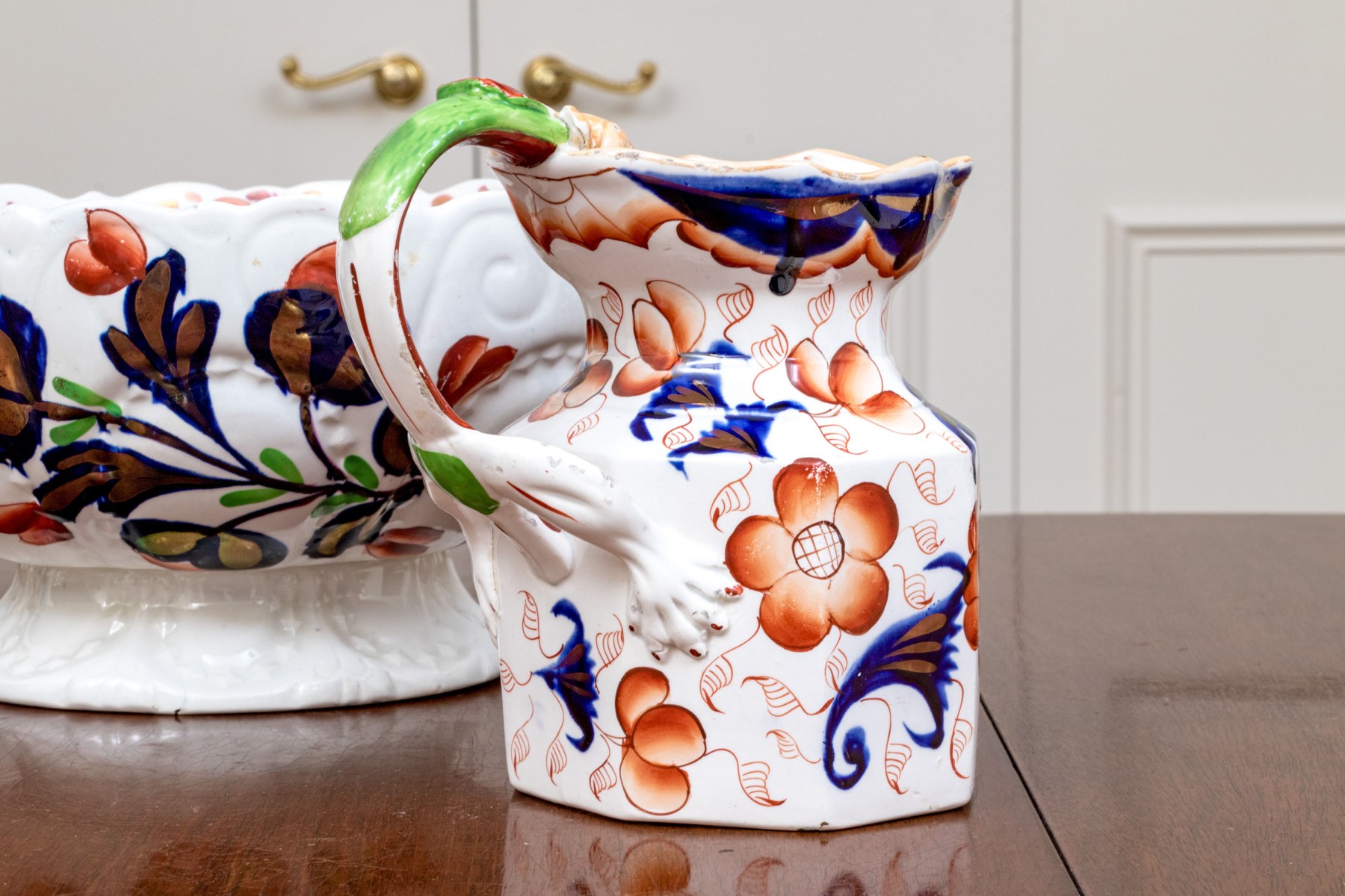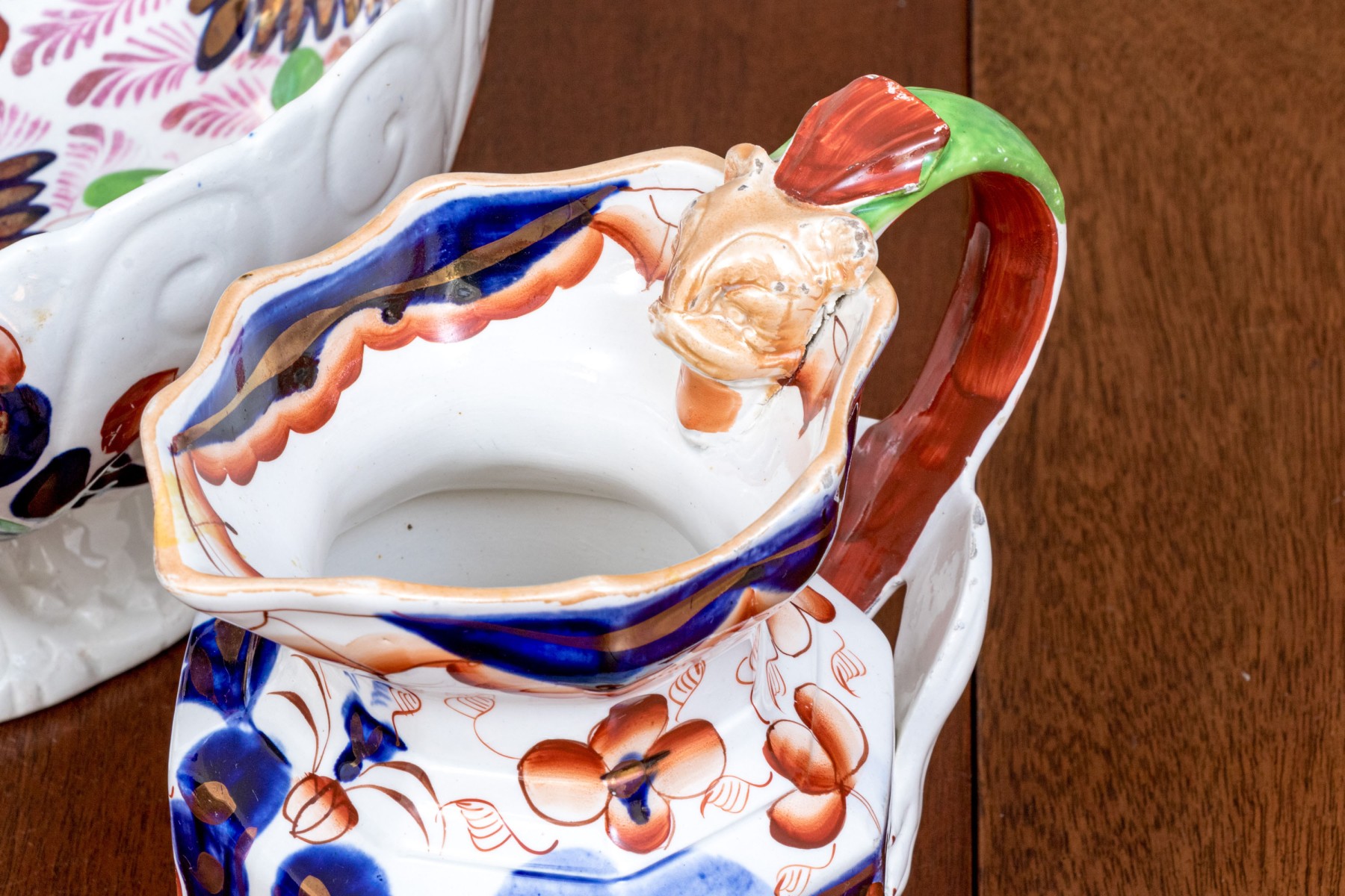 The handle of the water pitcher with chips and losses to where the head connects but overall both presents well. Please review the photos as they are part of the condition report.