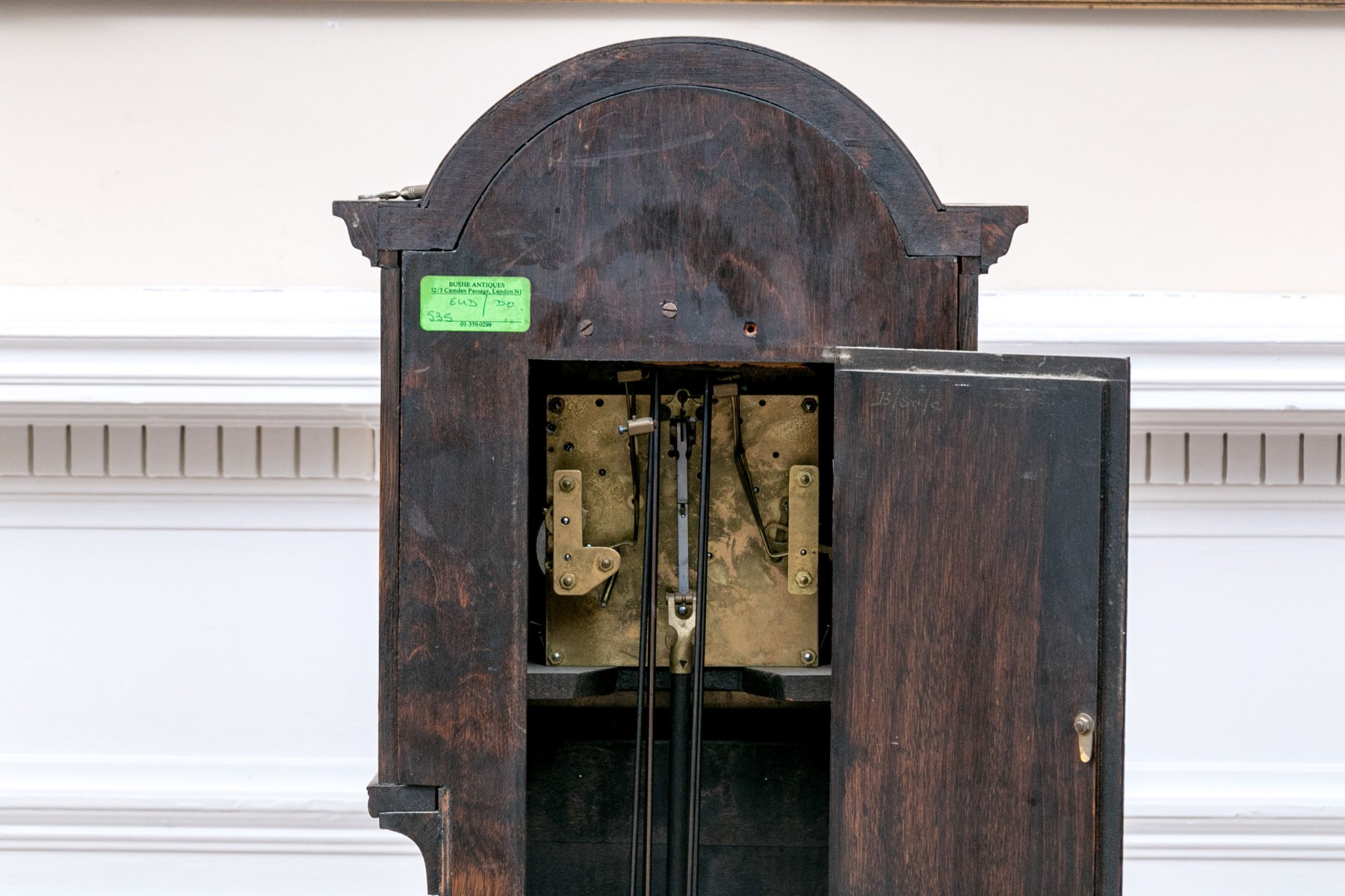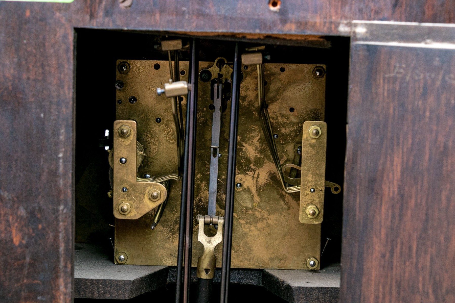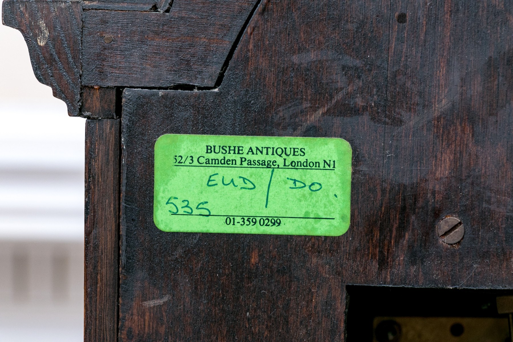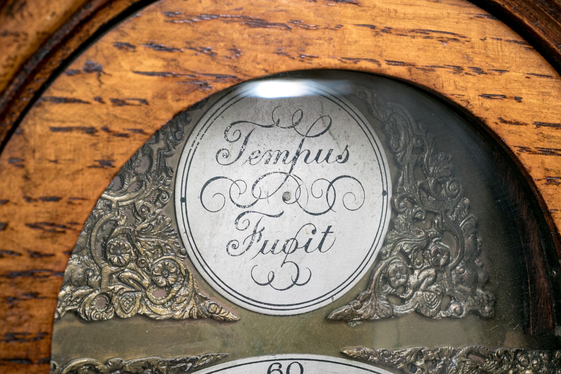 George III style brass repousse face. With mechanical chime movement. Spring driven movement. Label from London on back.