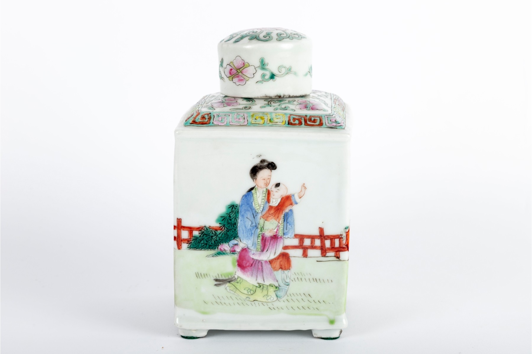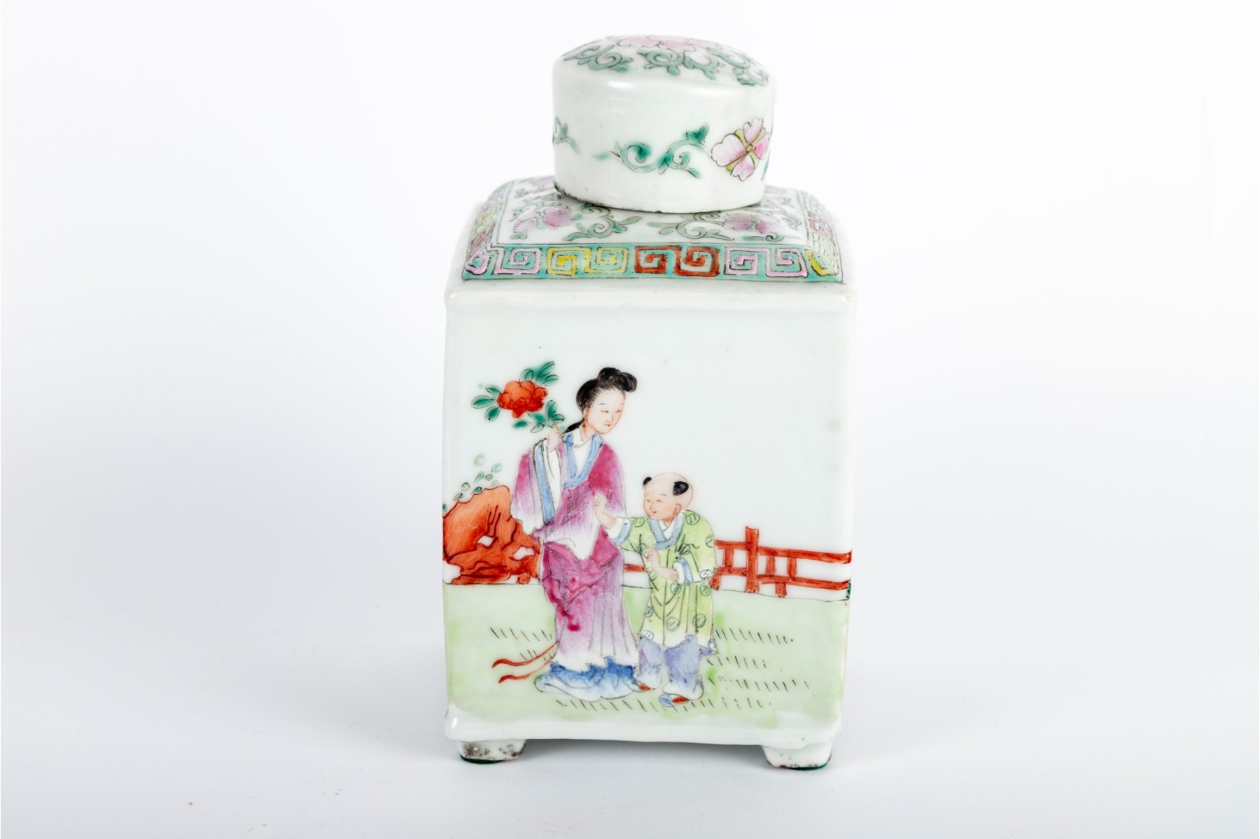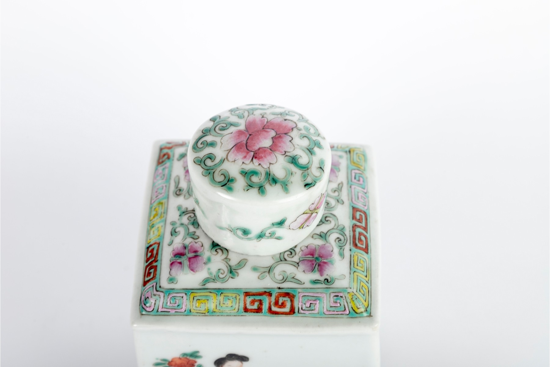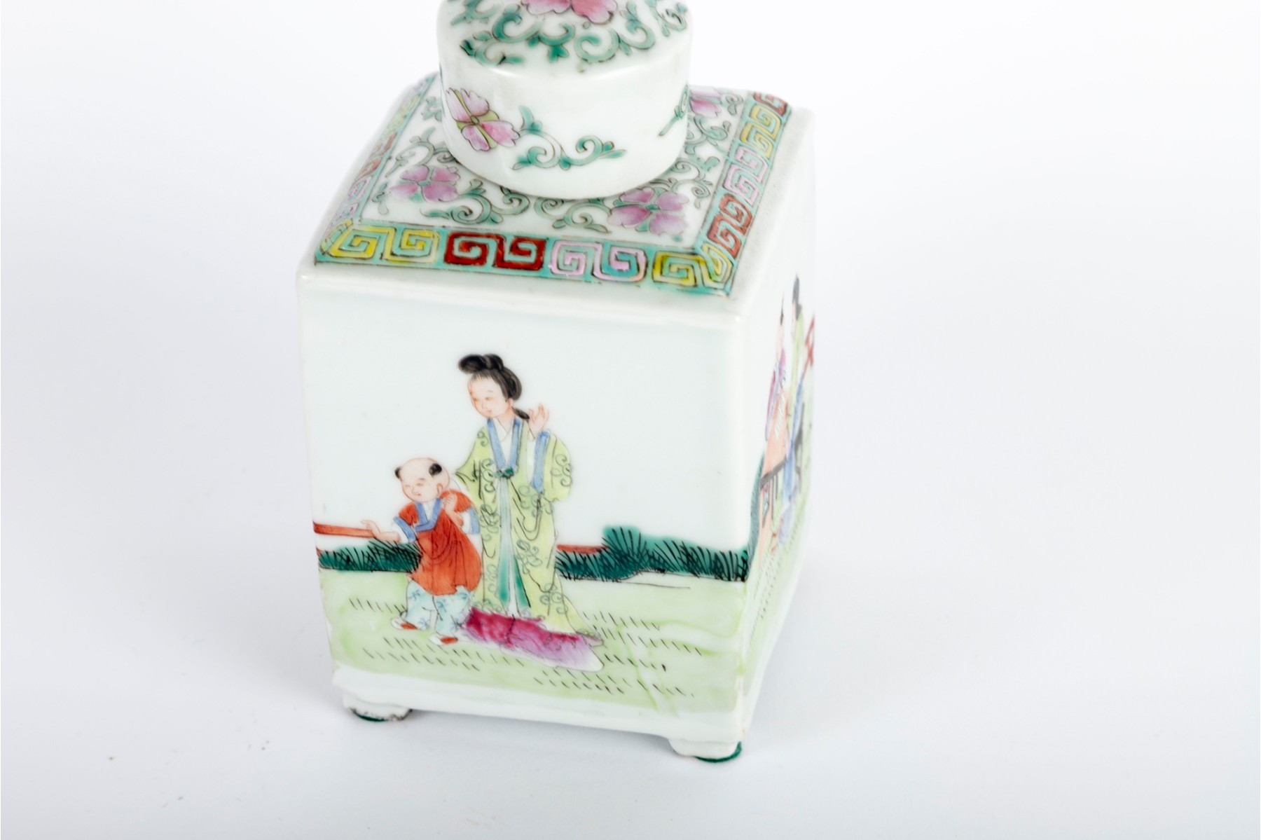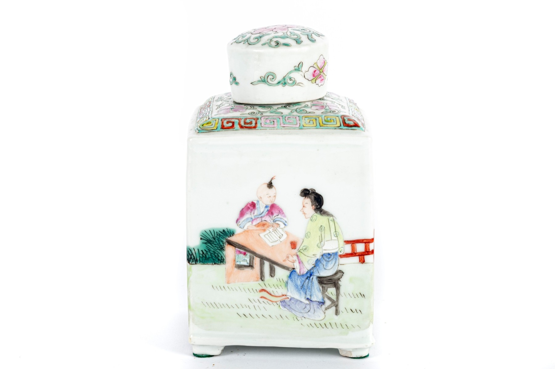 Square porcelain tea caddy decorated in the Famille Rose palette, featuring hand-painted figures in an outdoor scene with intricate geometric borders and floral accents on the lid.